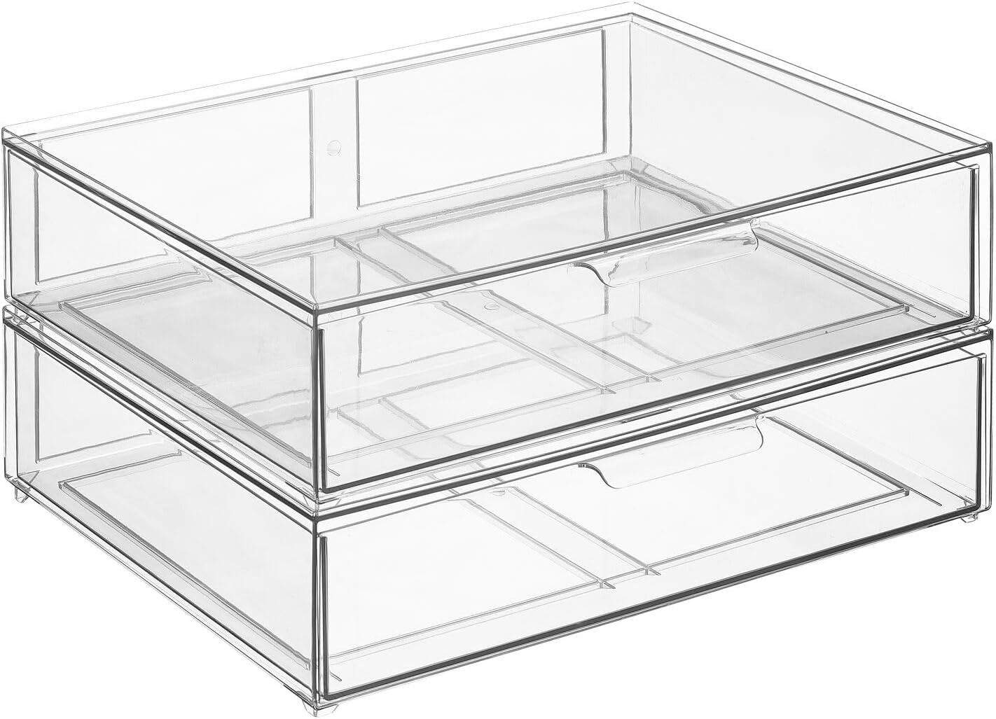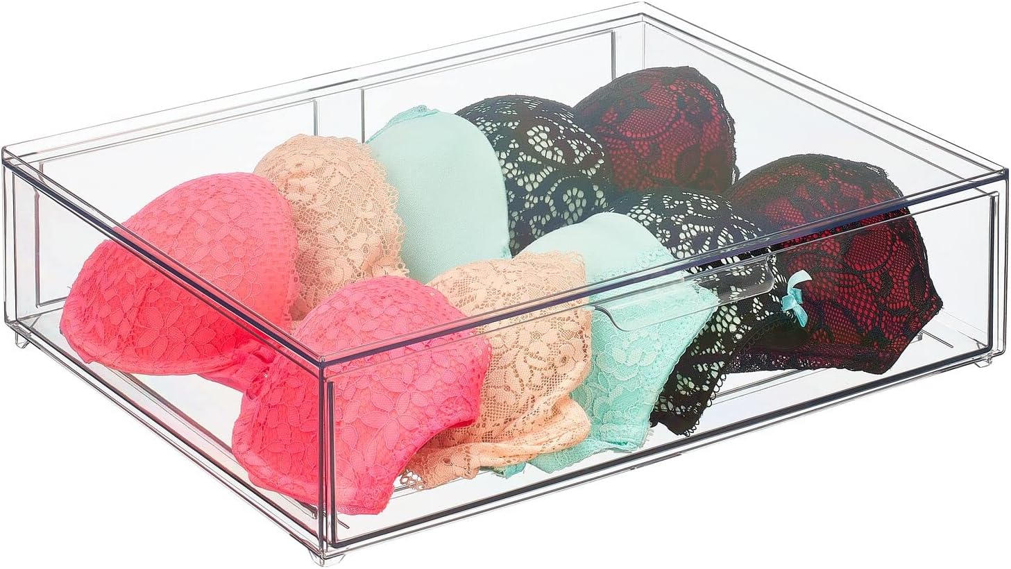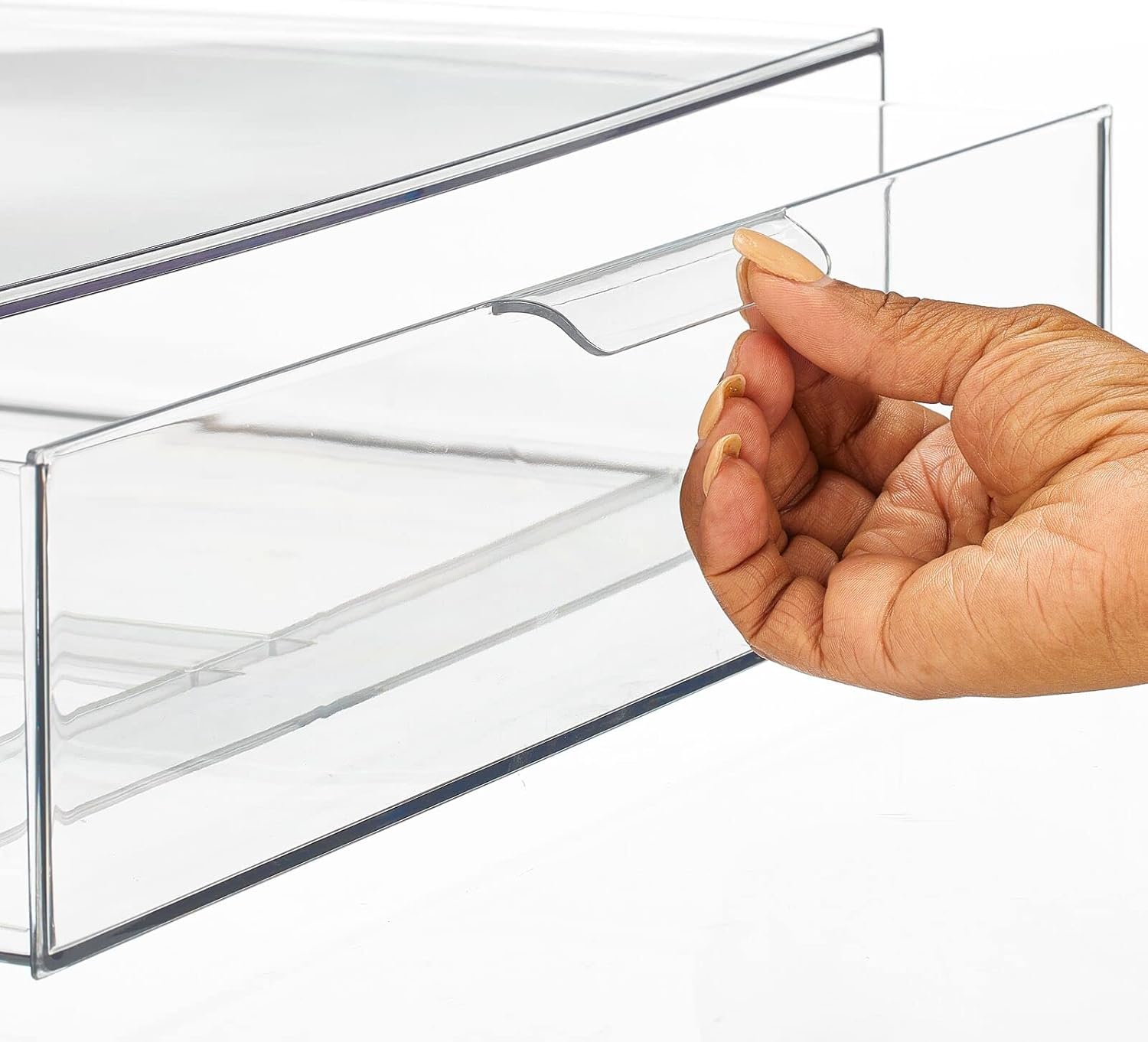 mDesign Wide Plastic Stackable Closet Storage Organizer Bins with Front Pull Out Drawer for Cabinet, Desk, Shelf, Cupboard, Vanity or Dresser Organization - Lumiere Collection - 4 Pack - Clear
