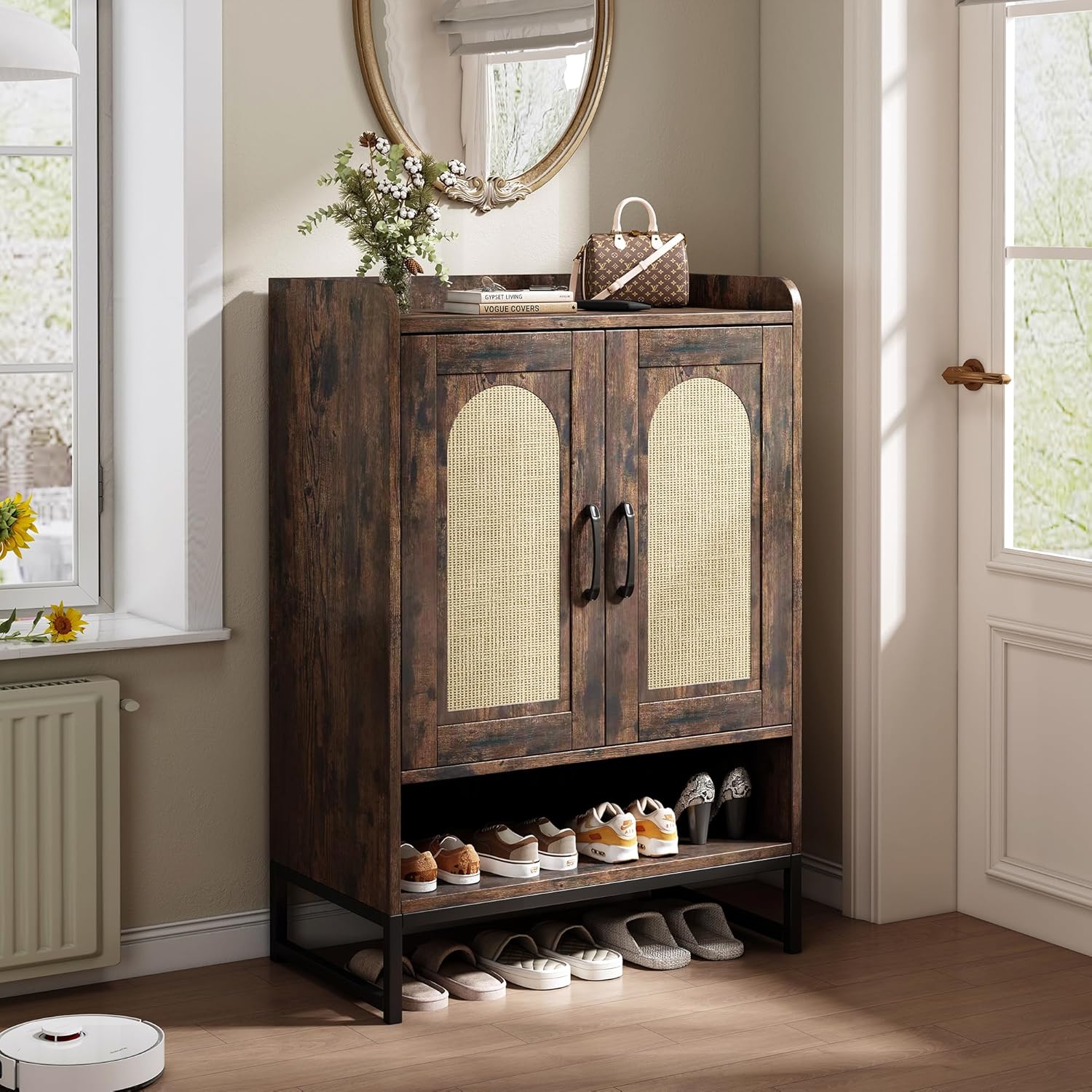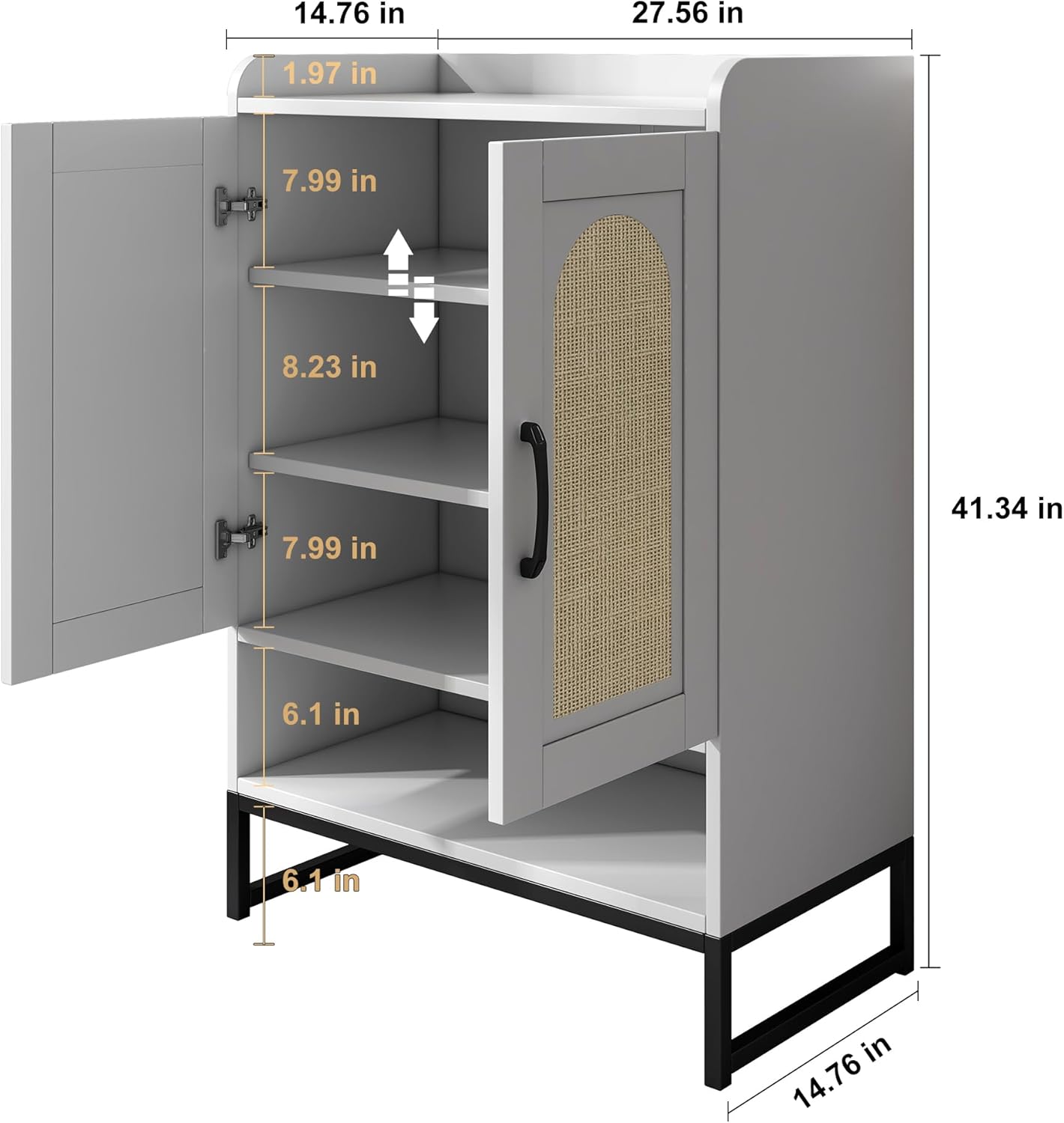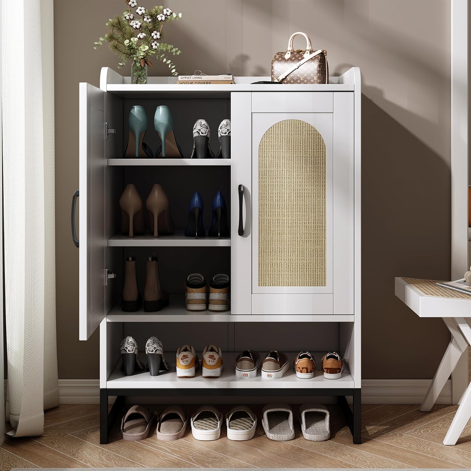 Shoe Cabinet Storage for Entryway, Wooden Shoe Cabinet with 2 Rattan Doors and Adjustable Shelves, Tall Shoe Rack Cabinet for Hallway, Living Room, Modern (White)