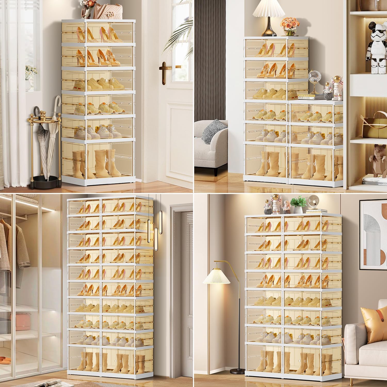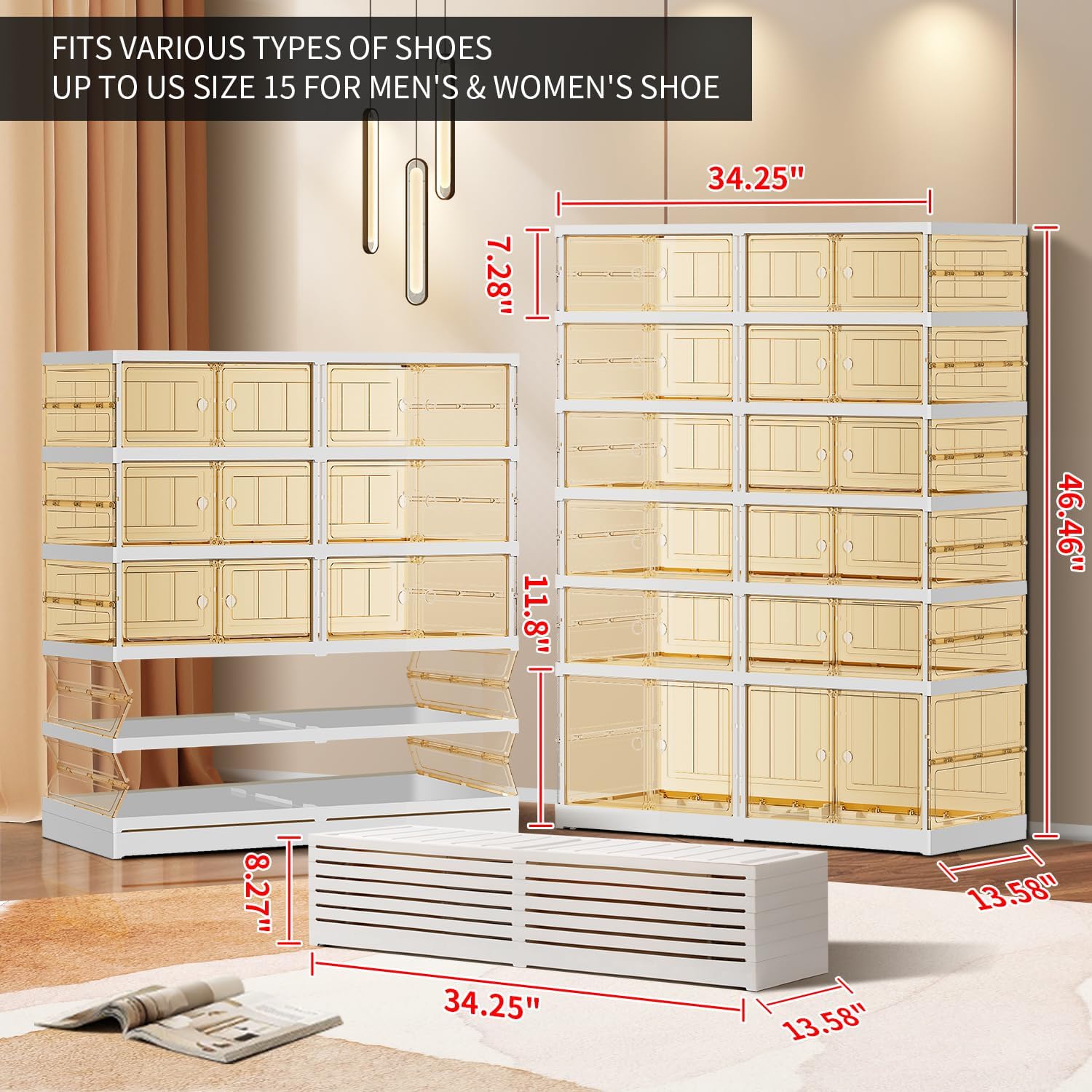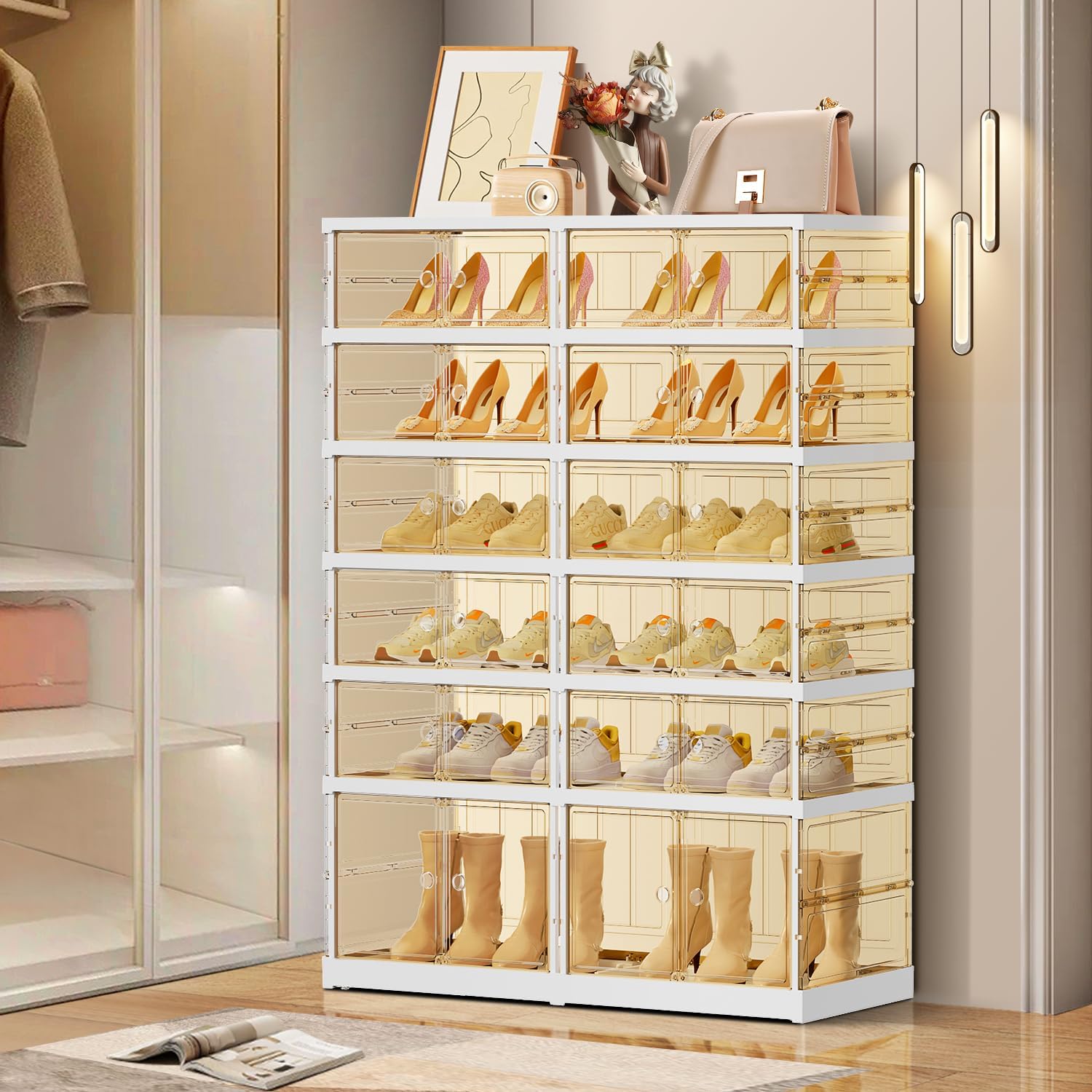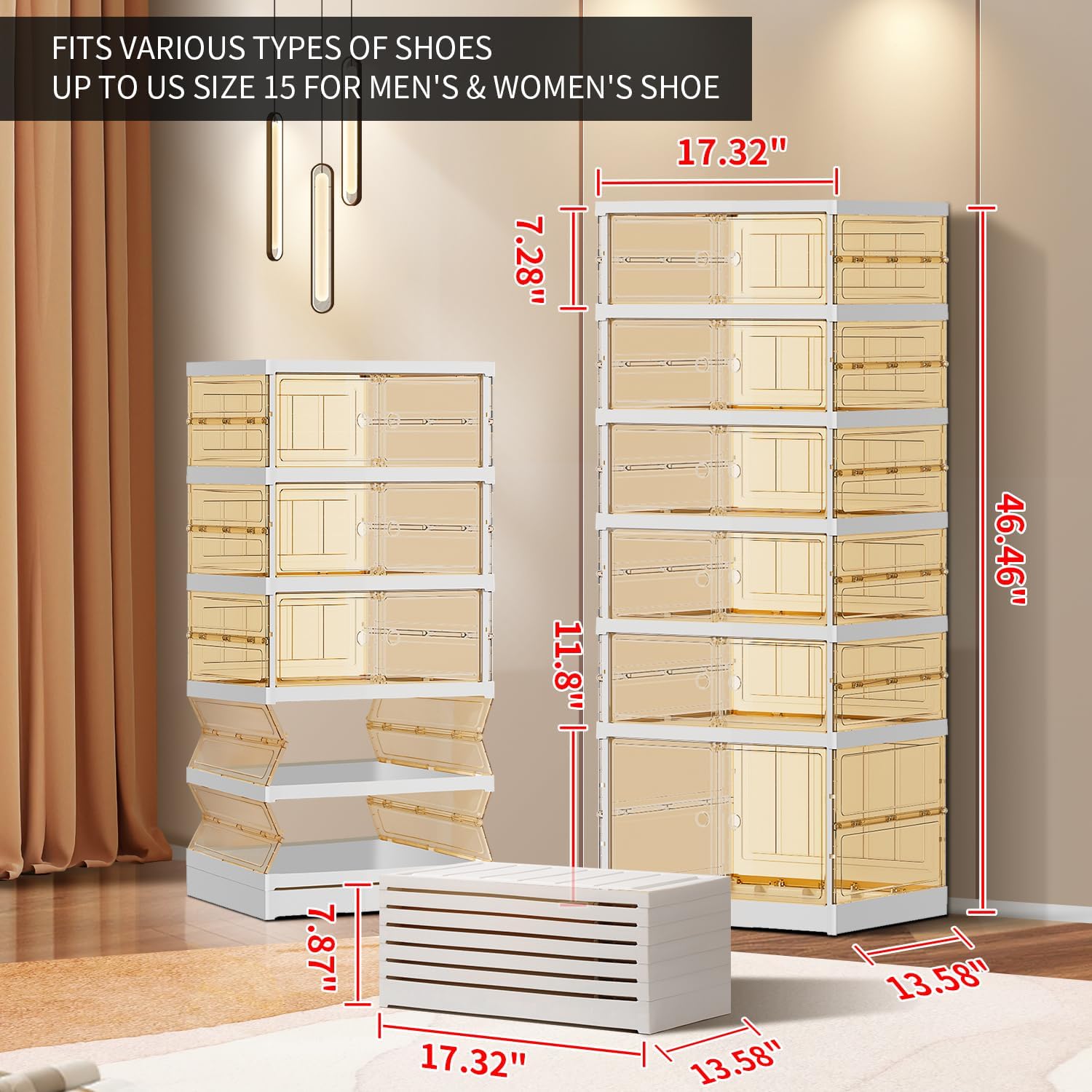 6 Tiers 12-24 Pairs Foldable Shoe Boxes Large Plastic Shoe Storage Rack Collapsible Shoe Organizer for Closet Tall Shoe Shelf Clear Stackable Shoes Cabinet with Doors entryway