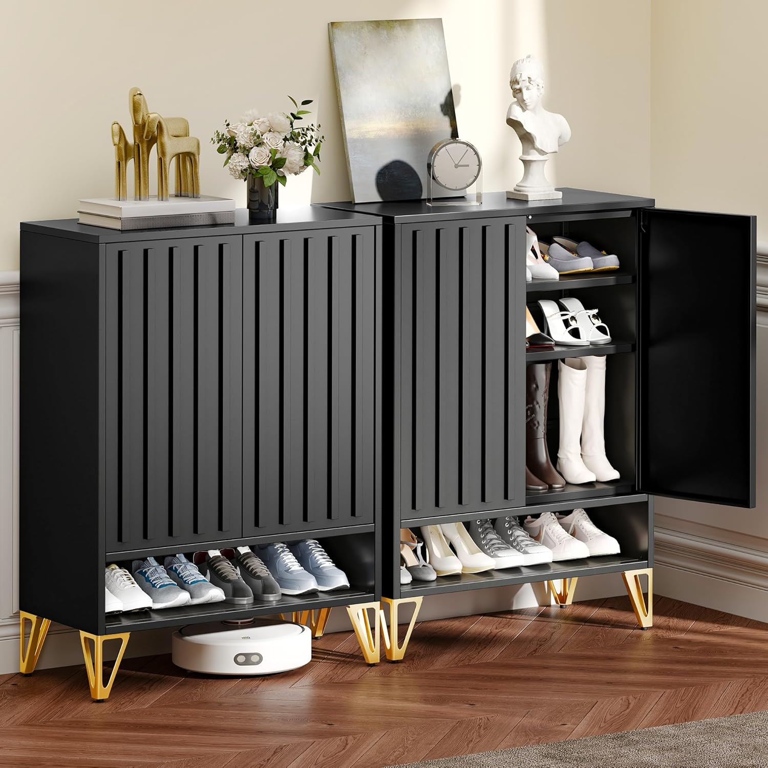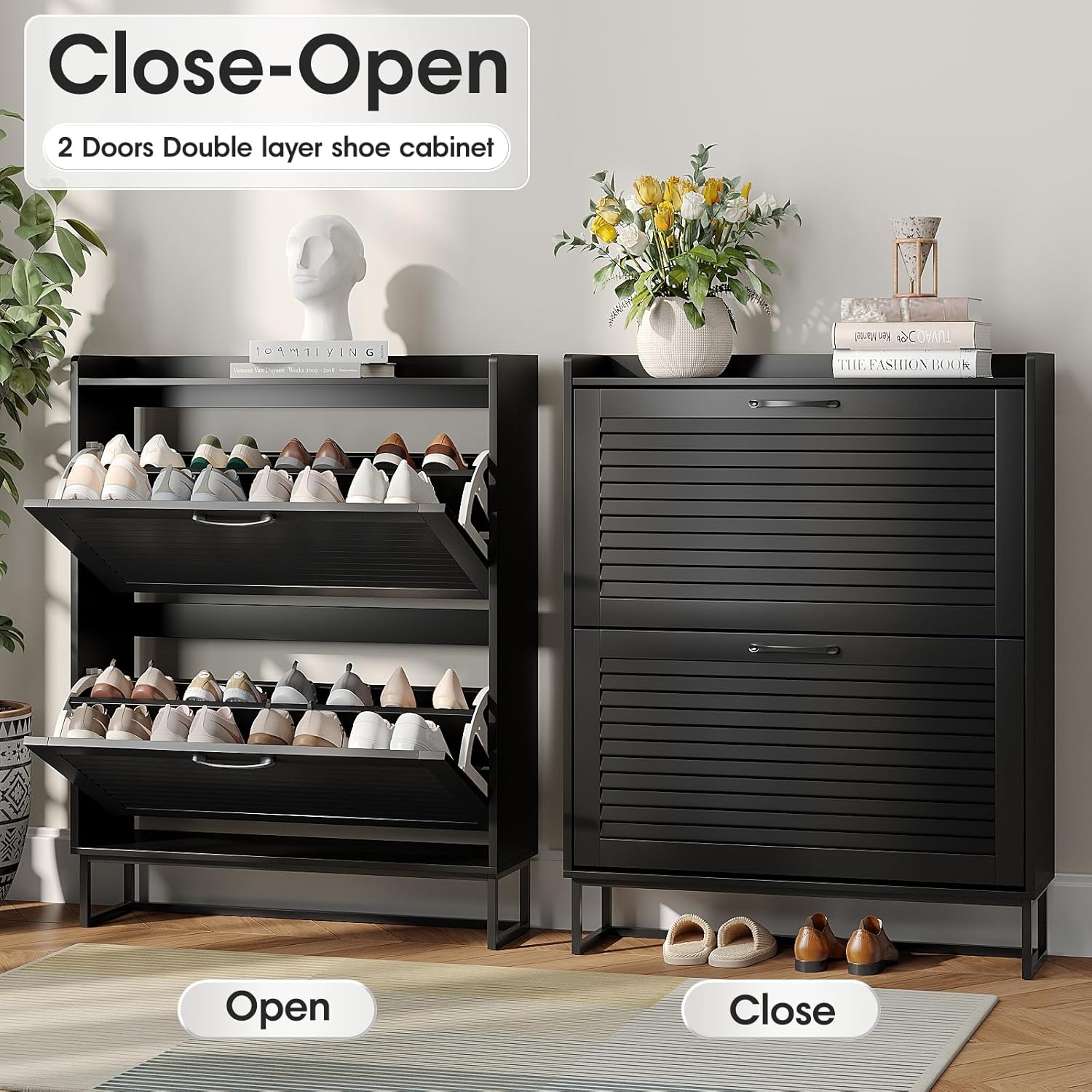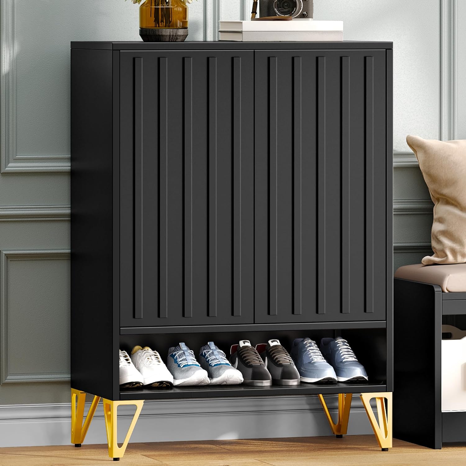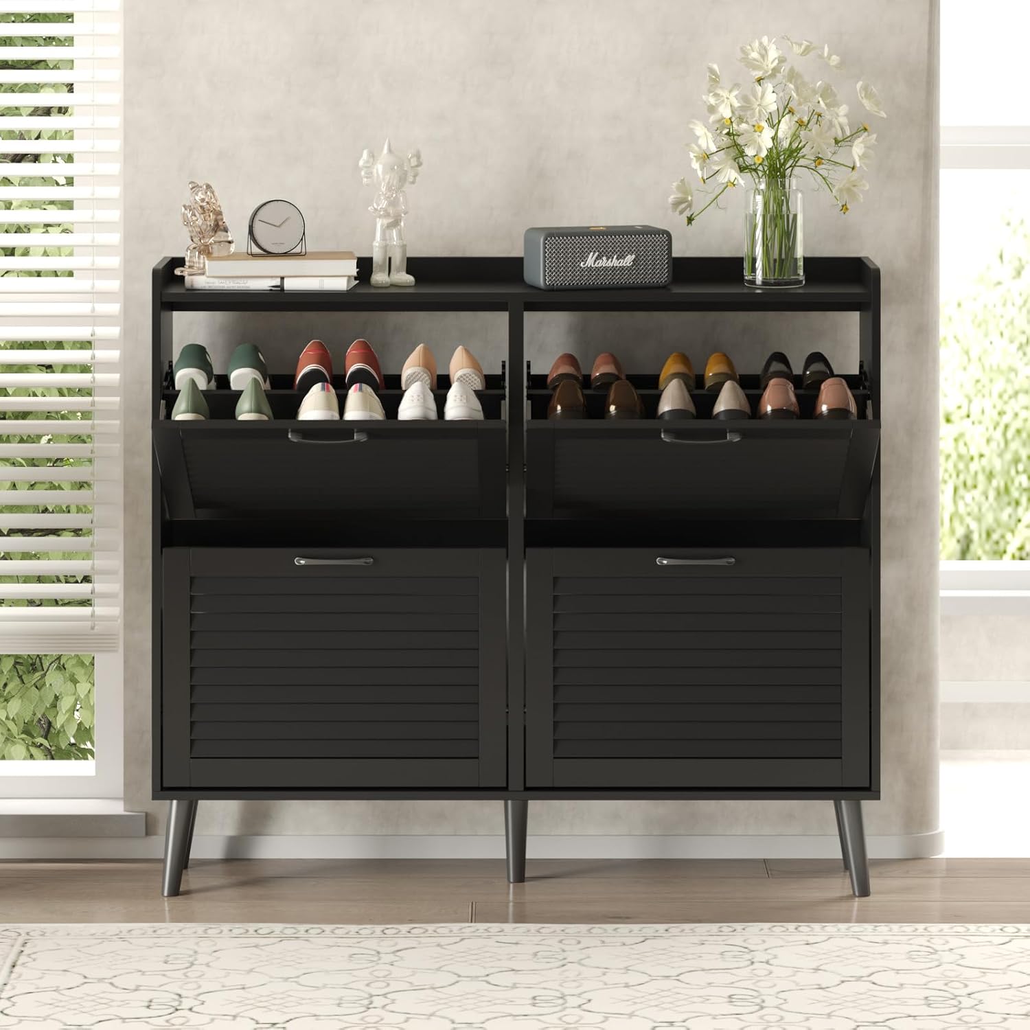 Maupvit Shoe Storage Cabinet with 2 Flip Louvered Doors, Freestanding Organizer with Metal Legs, Shoe Cabinet for Entryway, Narrow Shoe Rack Cabinet, Black