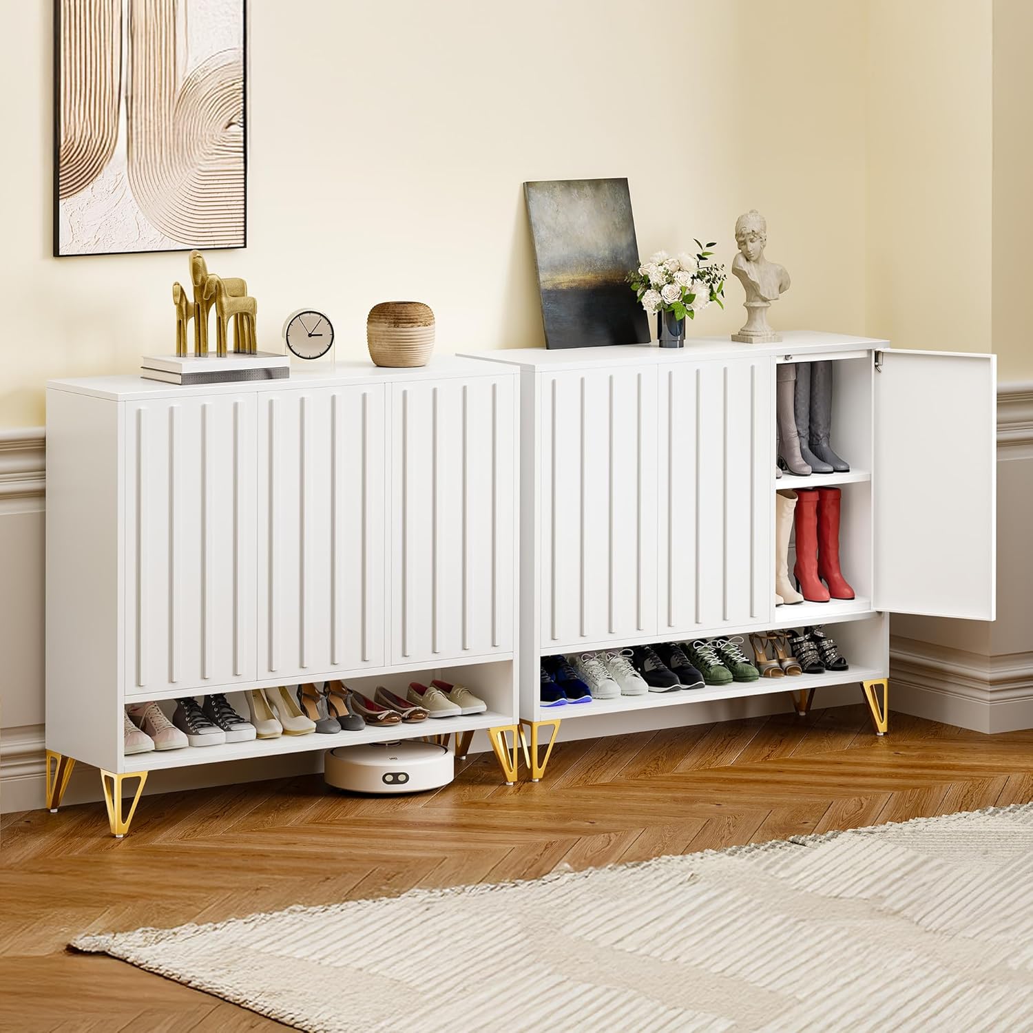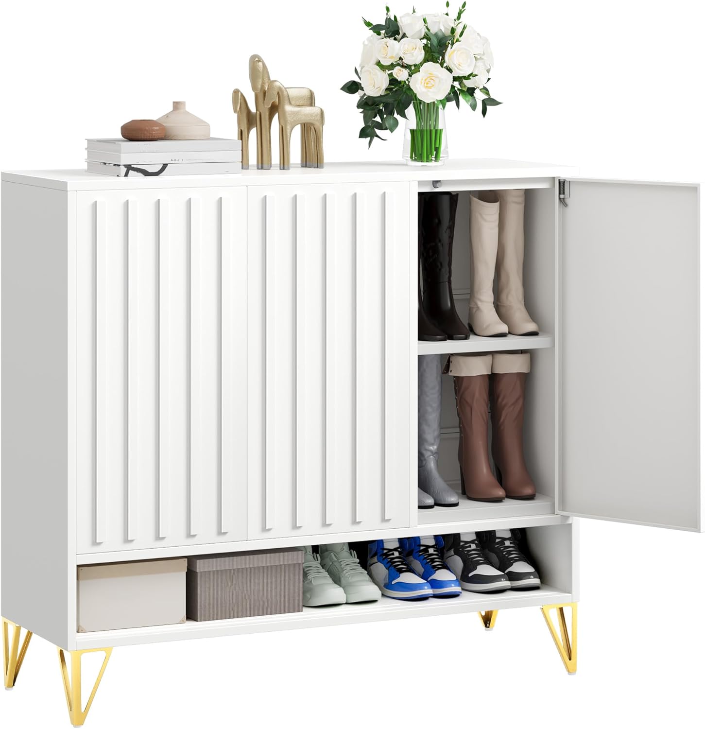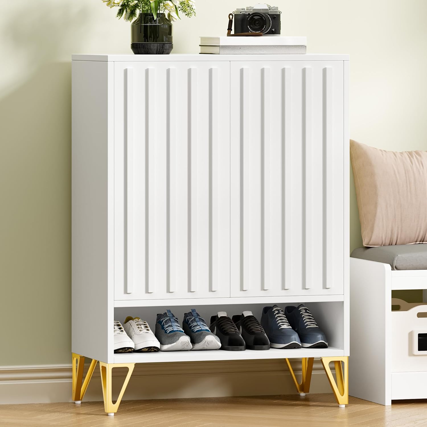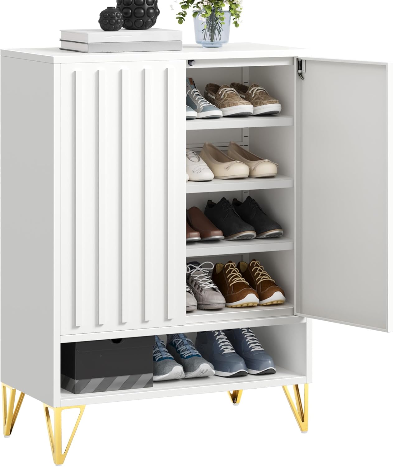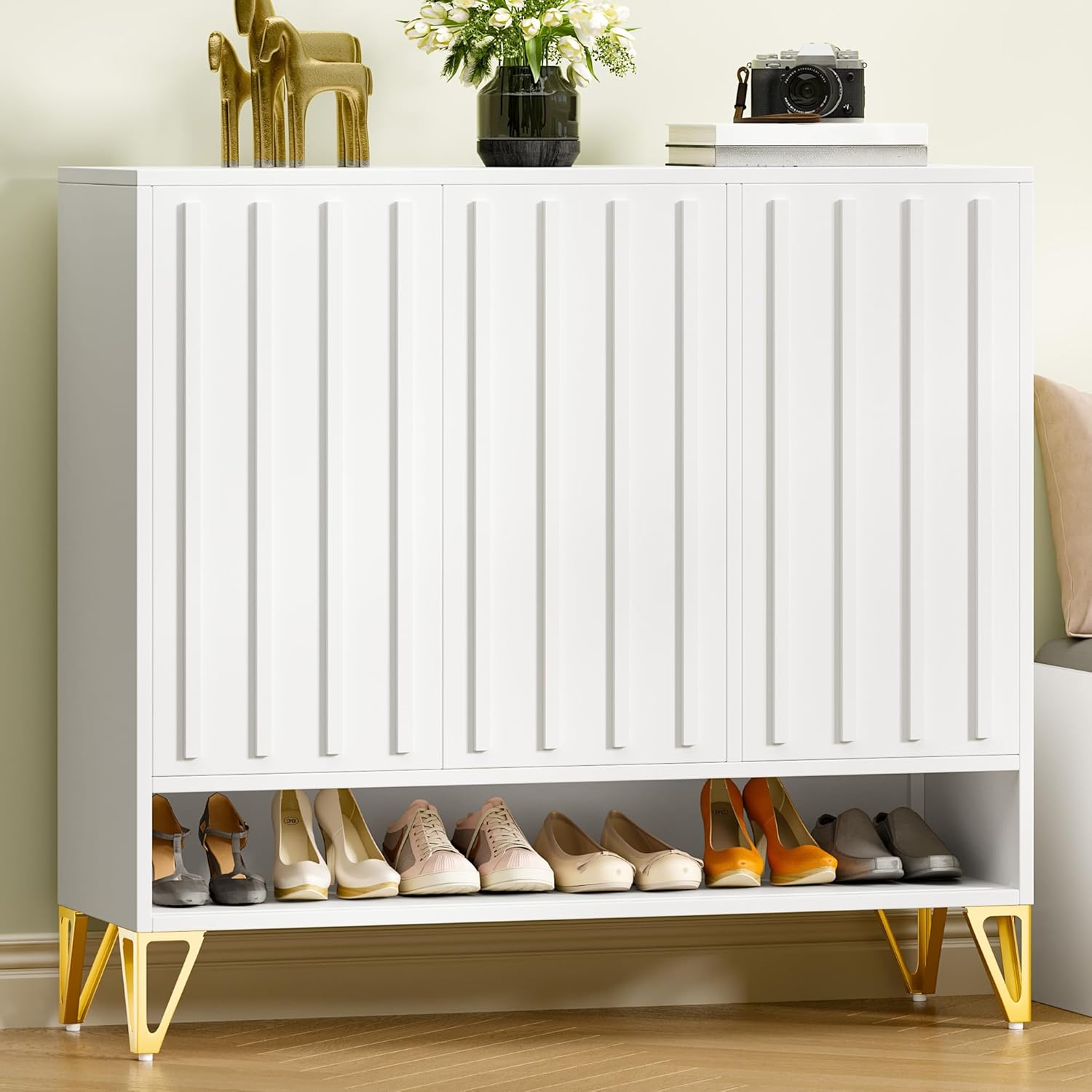 YITAHOME Shoe Storage Cabinet with Adjustable Shelves, 5-Tier Steel Shoe Cabinets with 3 Doors, Modern Fluted Free Standing Shoe Organizer, Shoe Rack Cabinet for Entryways, Hallways, Living Room,White