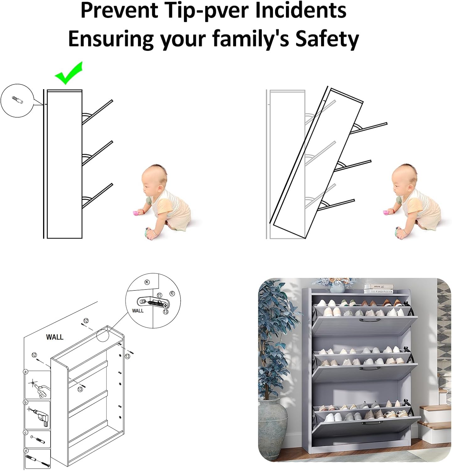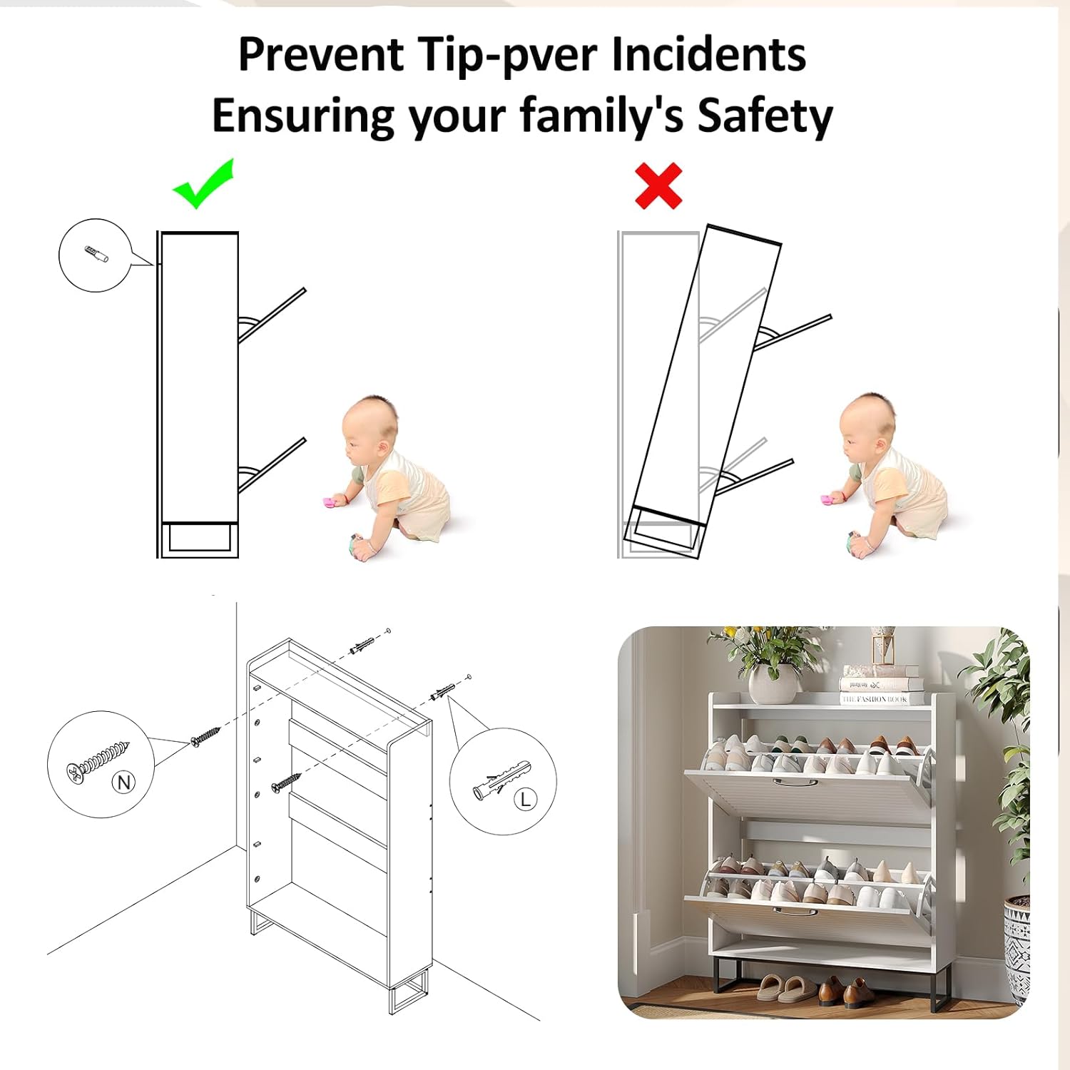 Rattan Shoe Cabinet, Shoe Cabinets with 3 Flip Drawers, Free Standing Narrow Shoe Storage Organizer with Adjustable Shelves, Shoe Rack Cabinet for Entryway, Fence on Top, Whit