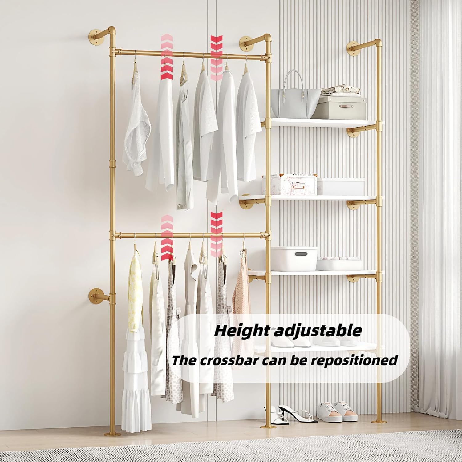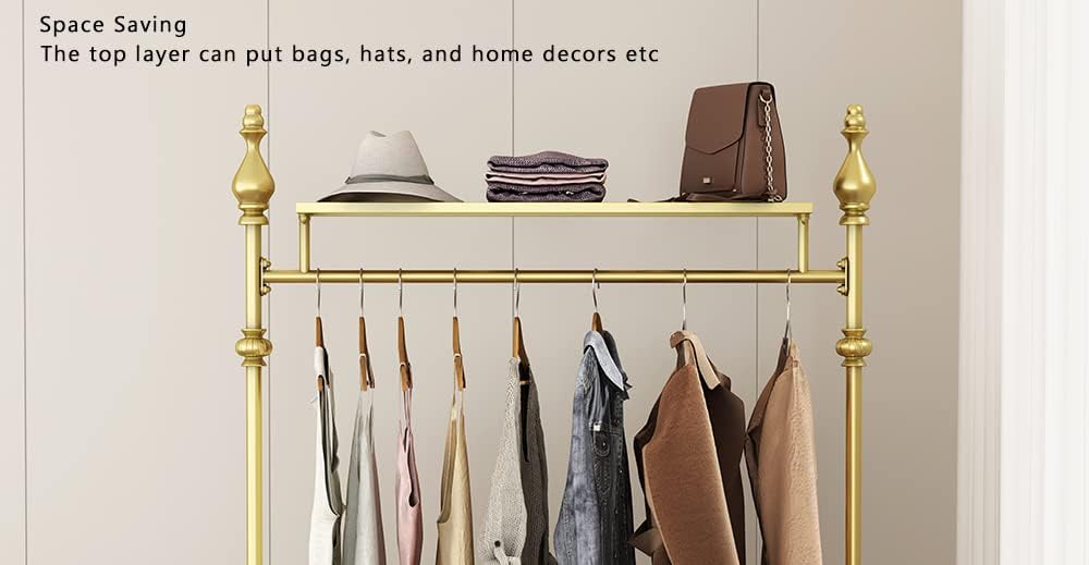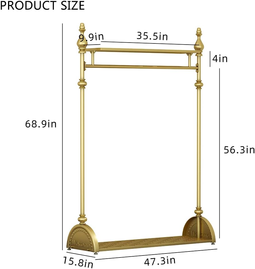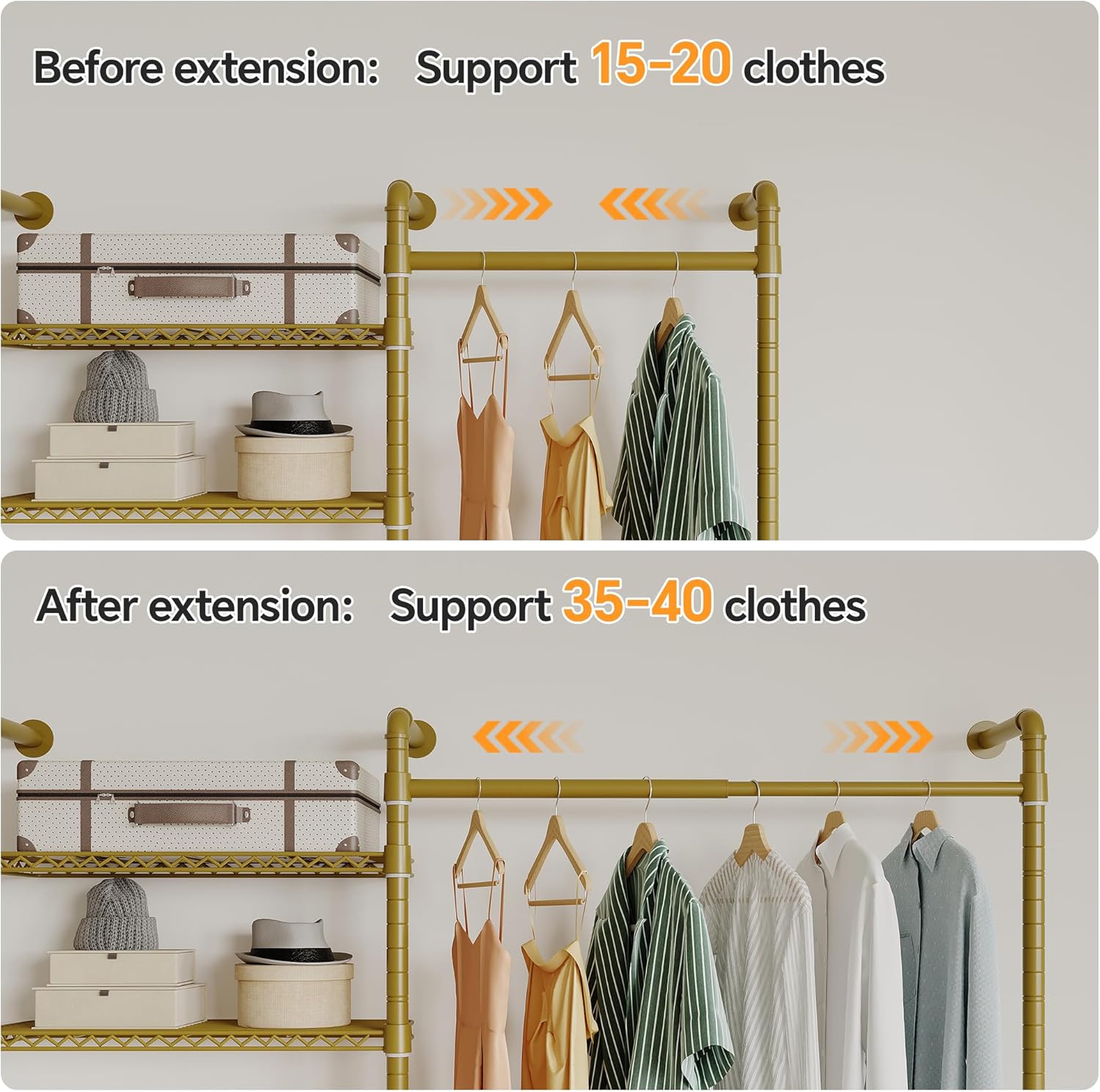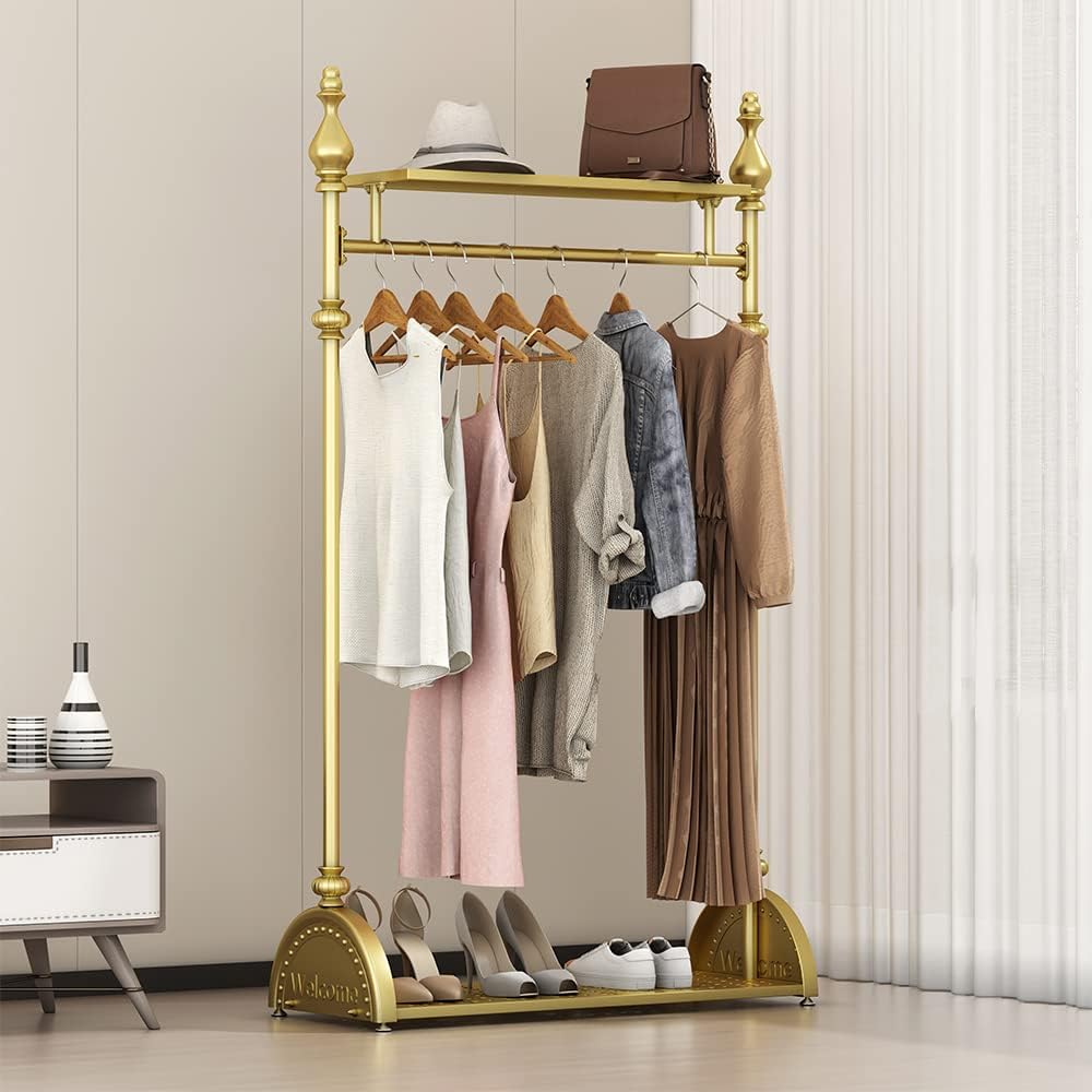 Clothing Rack Gold, Industrial Clothes Rack for hanging Clothes with Double Shelves Freestanding Multi-functional Heavy Duty Garment Rack, Metal Movable Coat Rack for Organizing Clothes Shoes