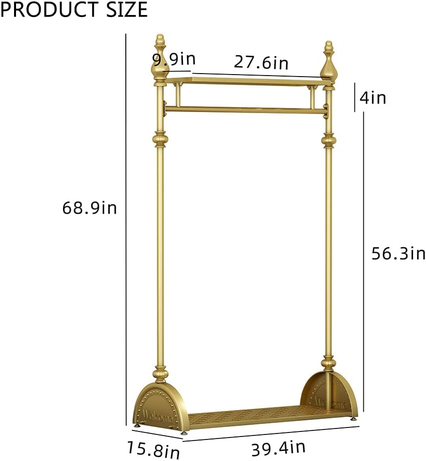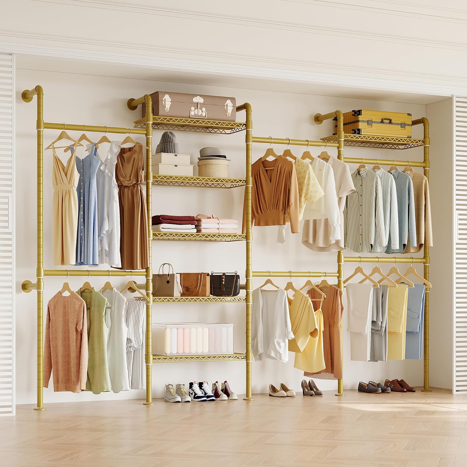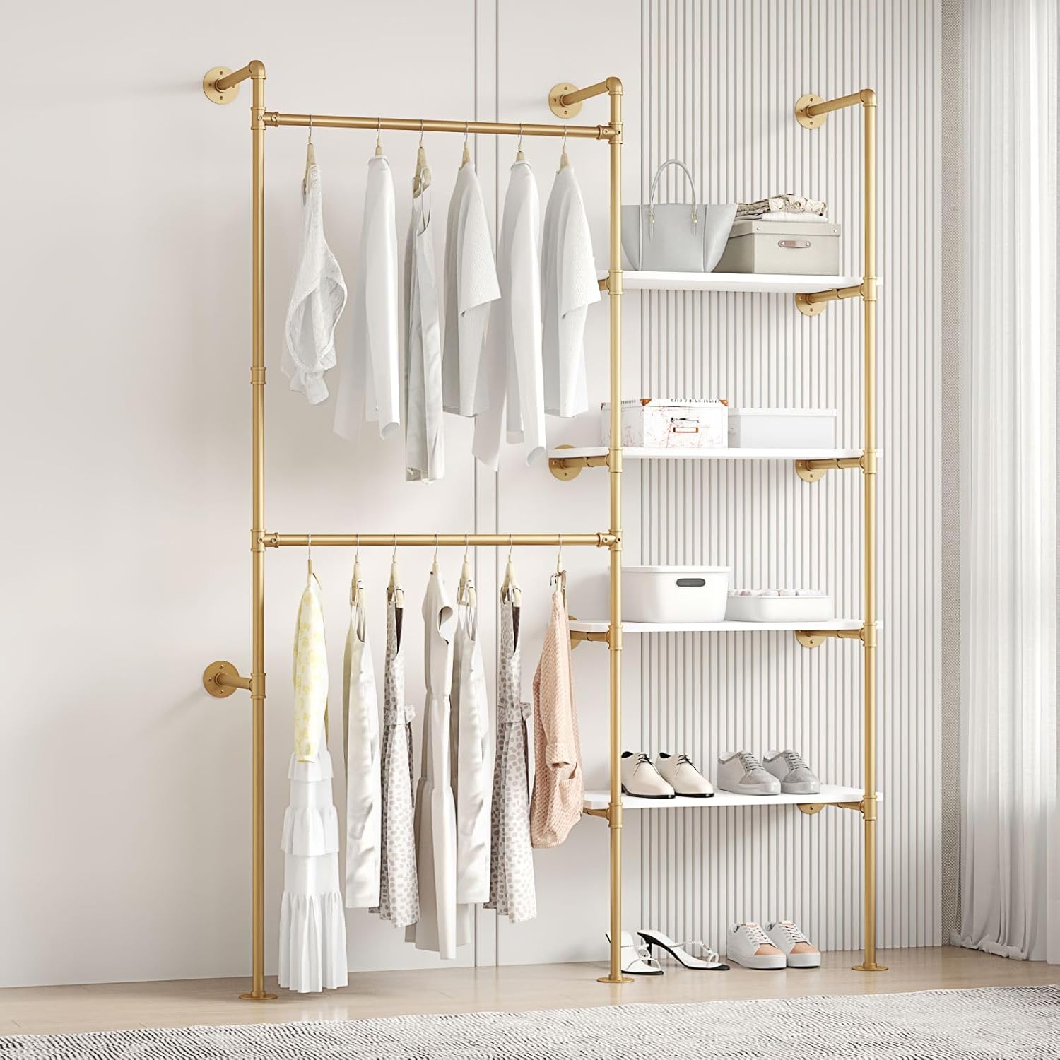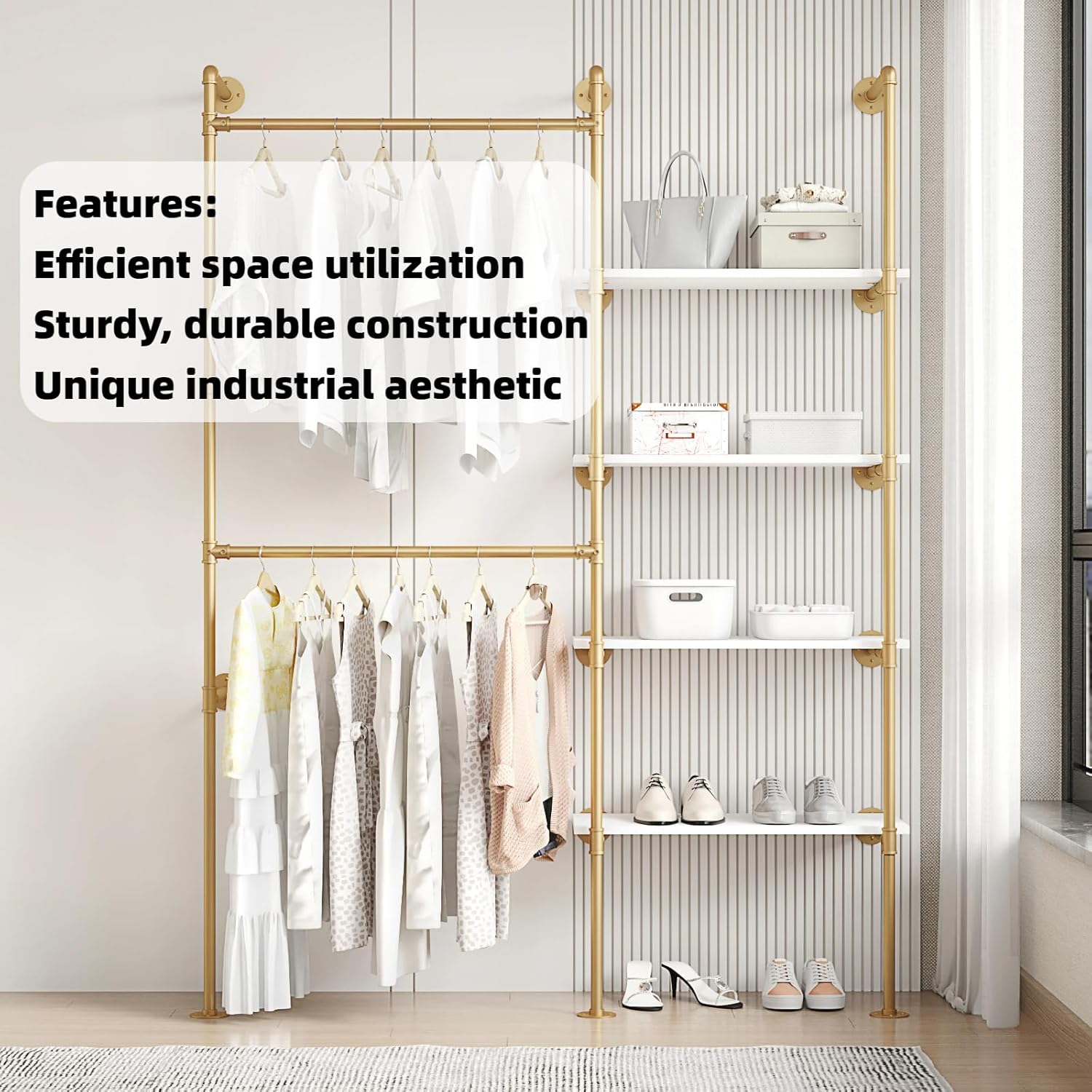 Clothing Rack Gold, Industrial Clothes Rack for hanging Clothes with Double Shelves Freestanding Multi-functional Heavy Duty Garment Rack, Metal Movable Coat Rack for Organizing Clothes Shoes
