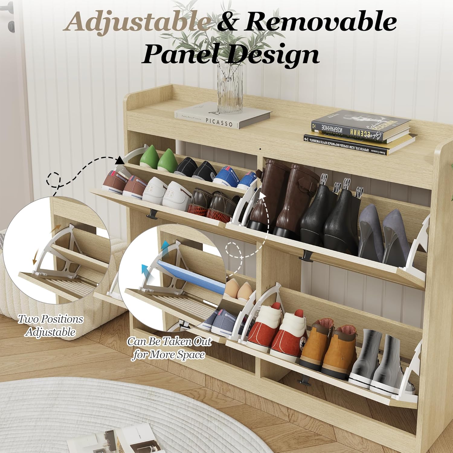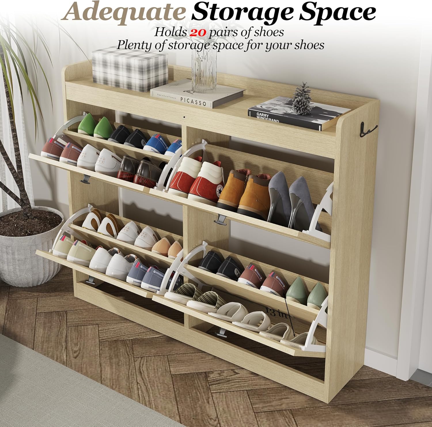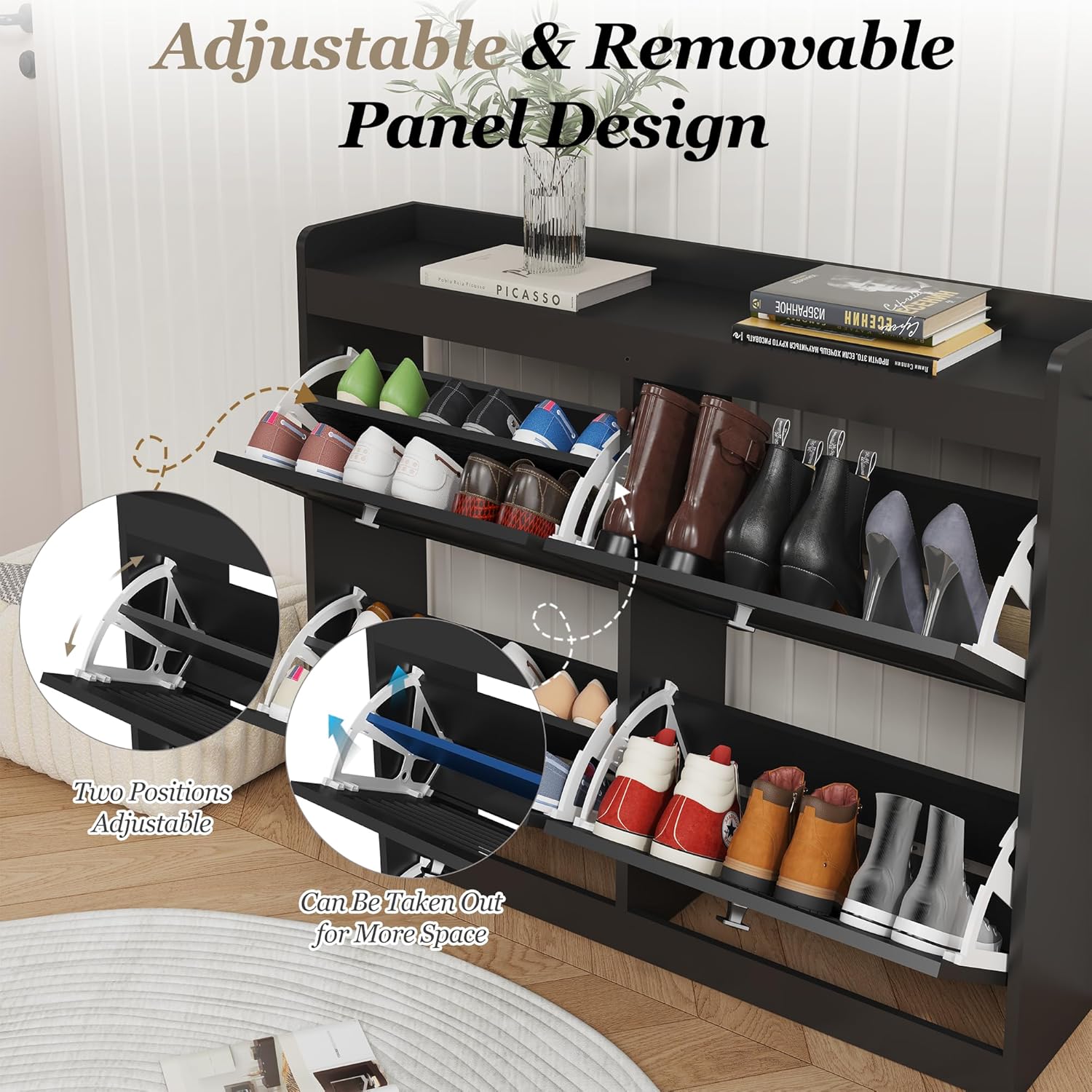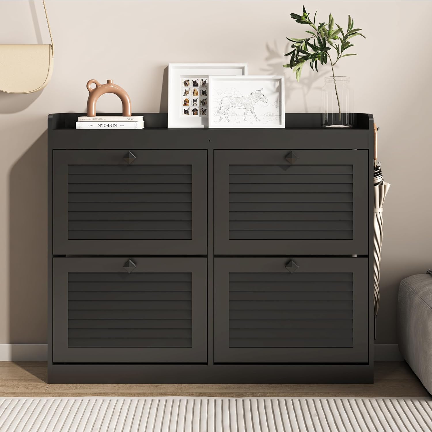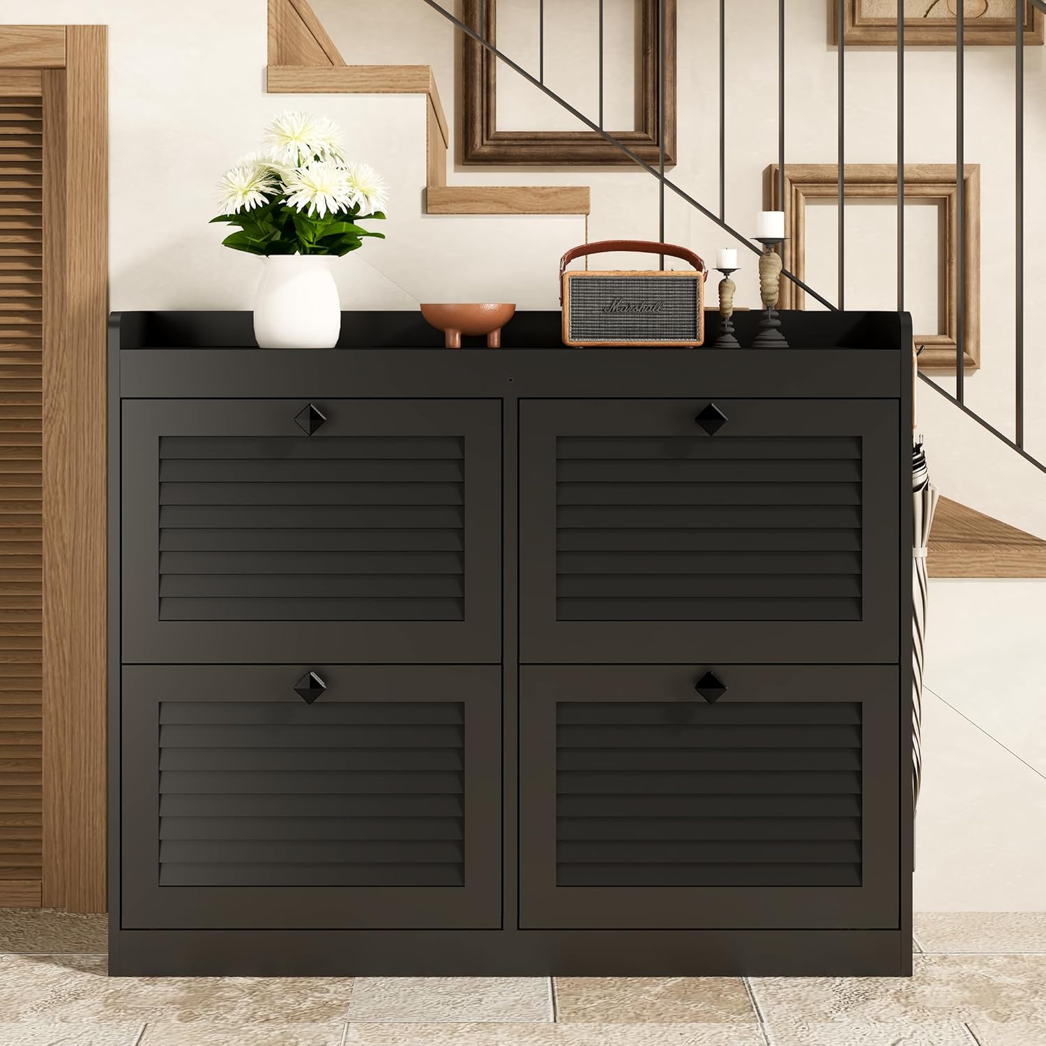 GarveeHome Large Shoe Cabinet with 4 Flip Drawers, Wooden Shoe Cabinet Storage with Adjustable Shelf for Entryway, Freestanding Hidden Shoe Organizer for Hallway, Bedroom, Living Room, Black