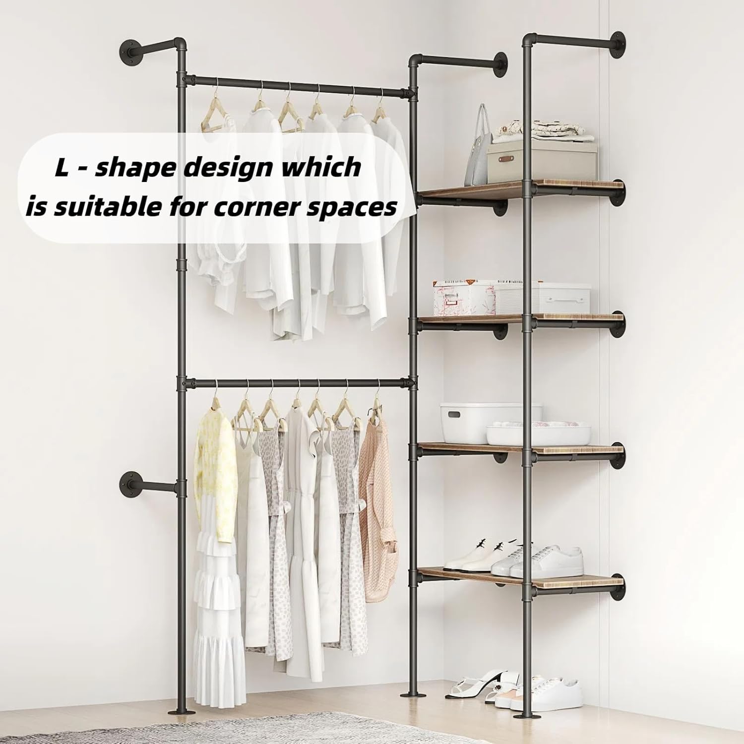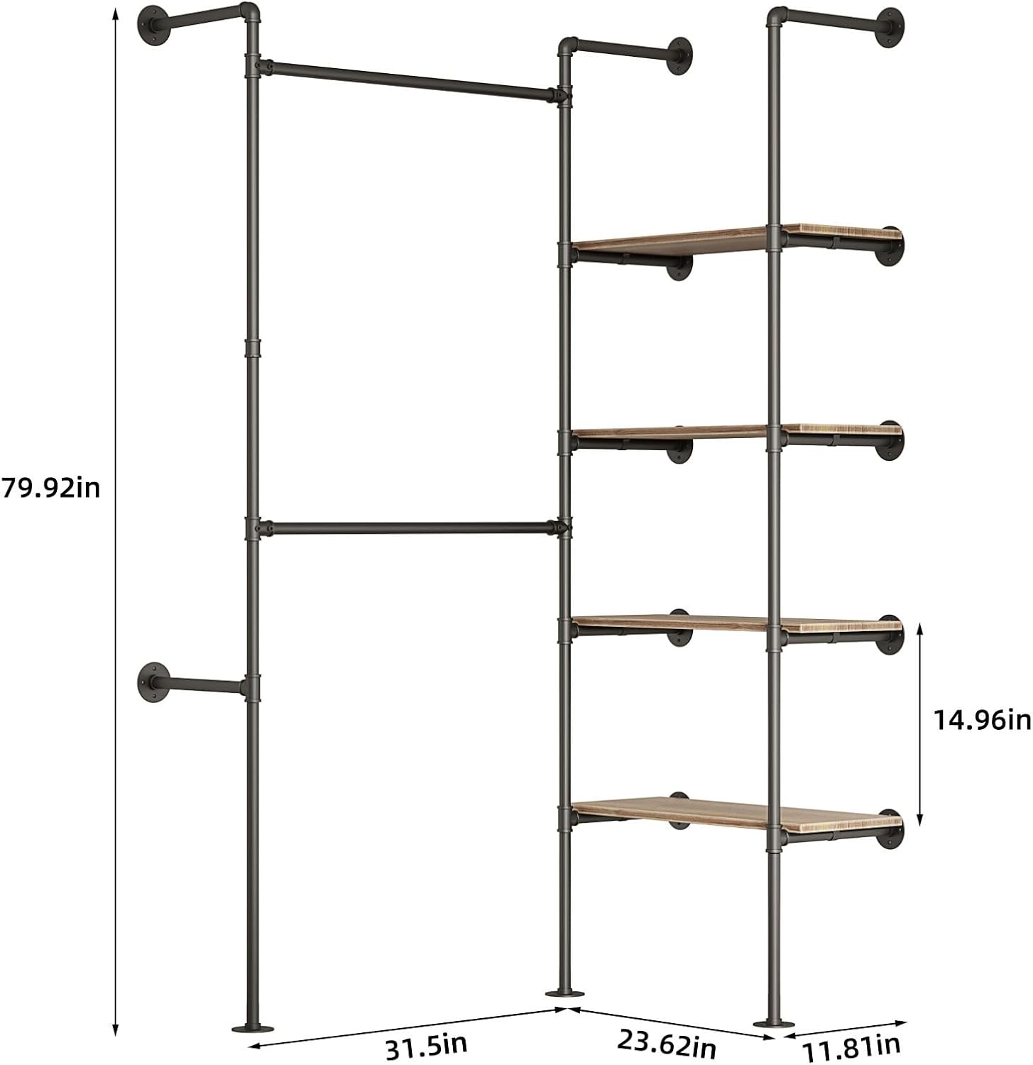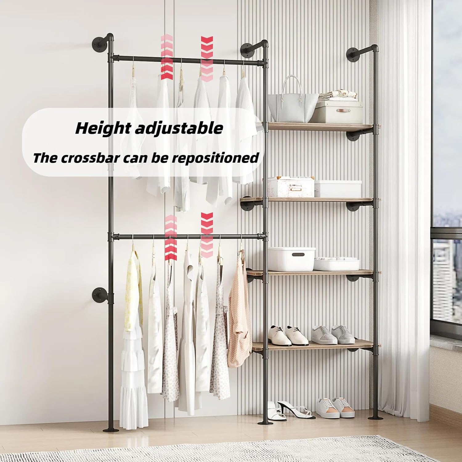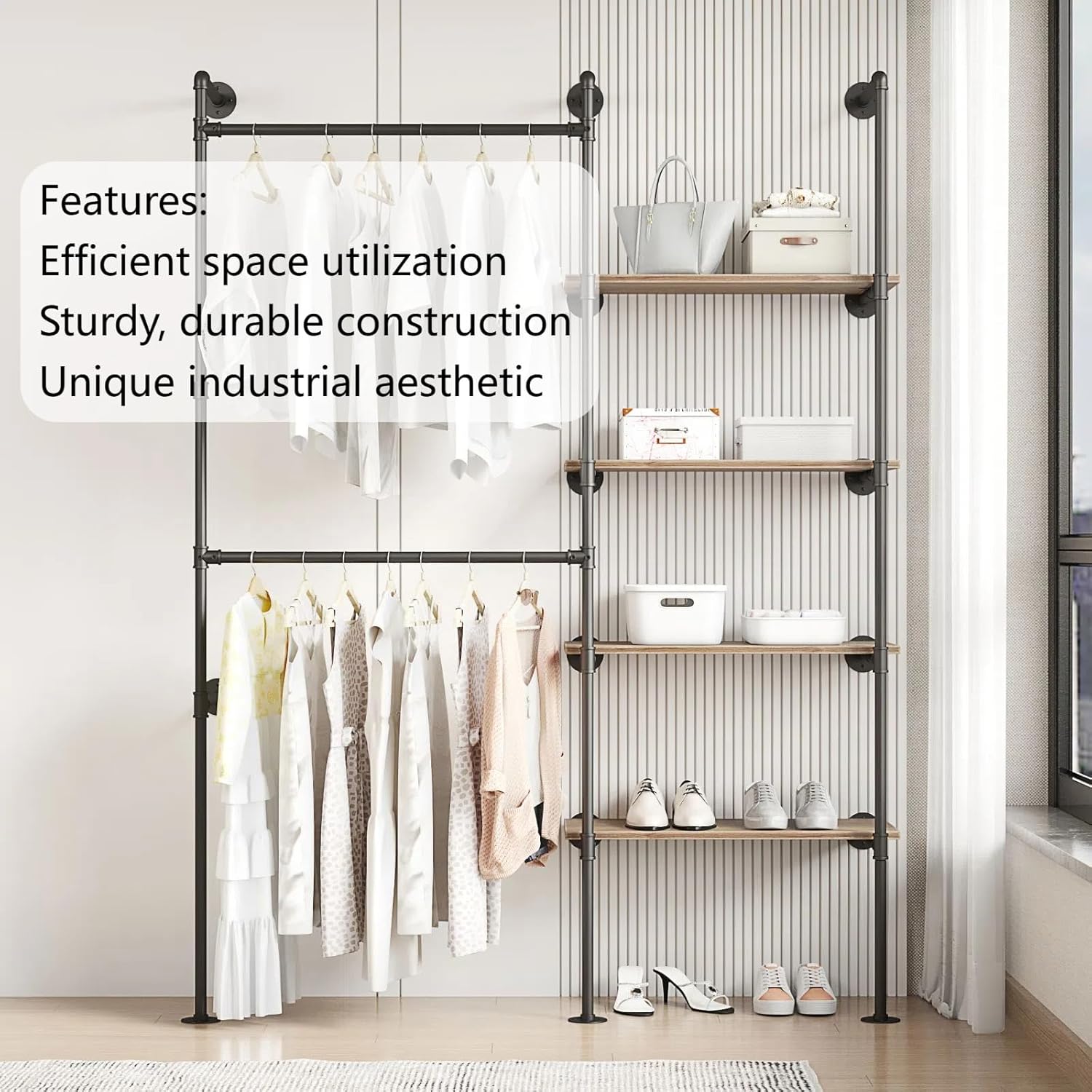 W4 Industrial Pipe Clothing Rack Wall Mounted Closet System Expandable Clothes Rack for Hanging Clothes, Heavy Duty Garment Rack Adjustable for Walk in Closet, Black