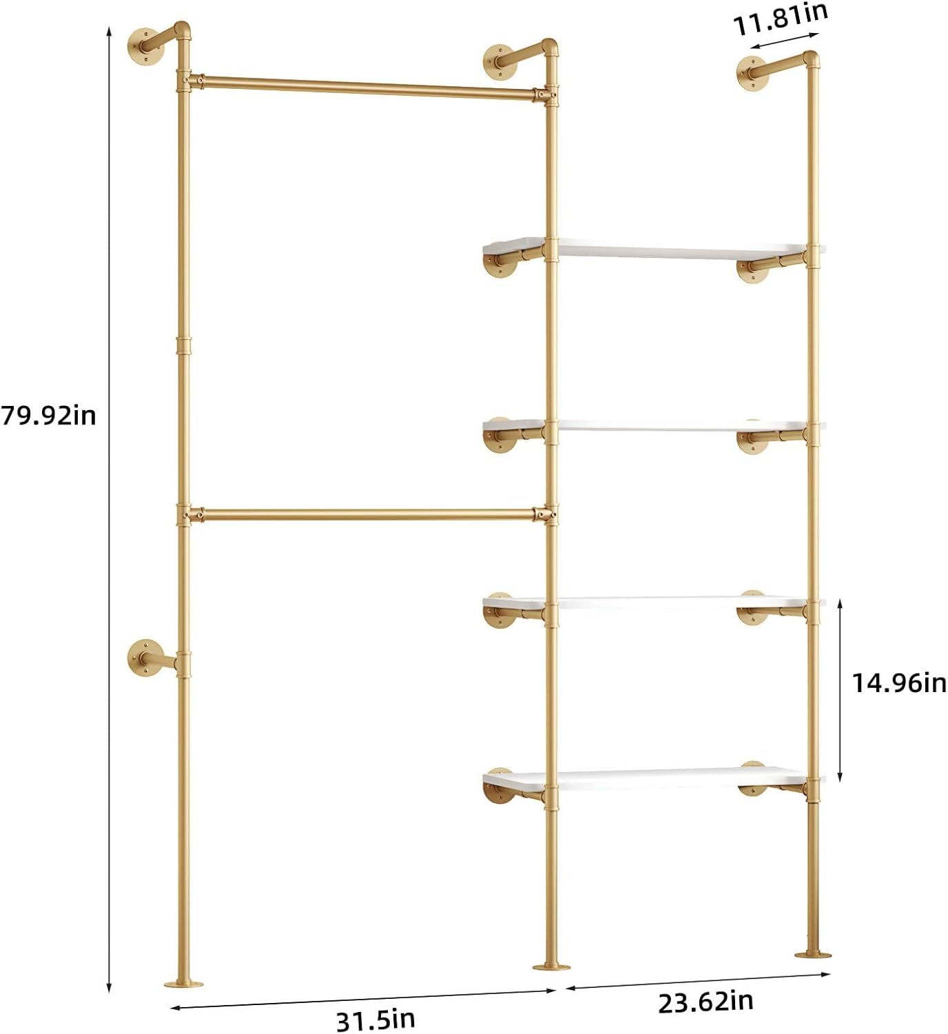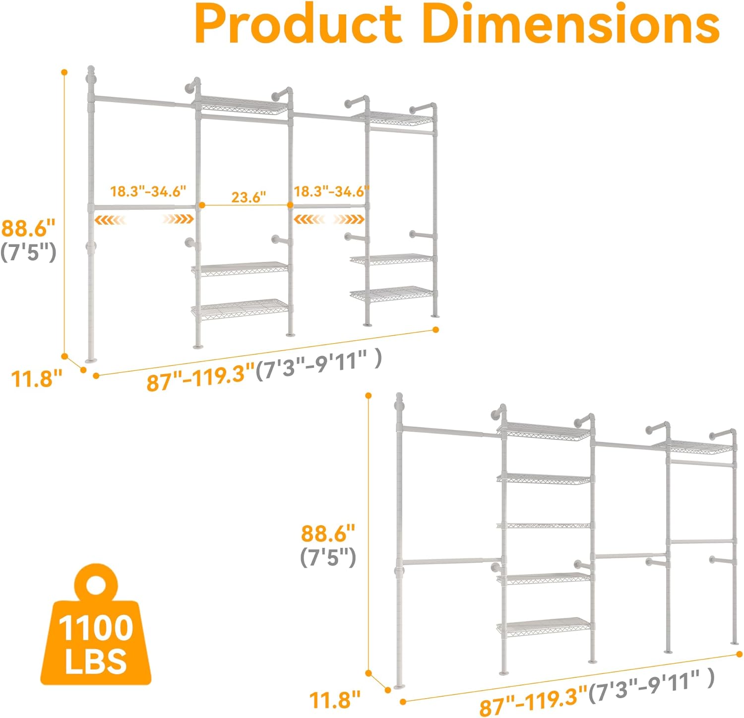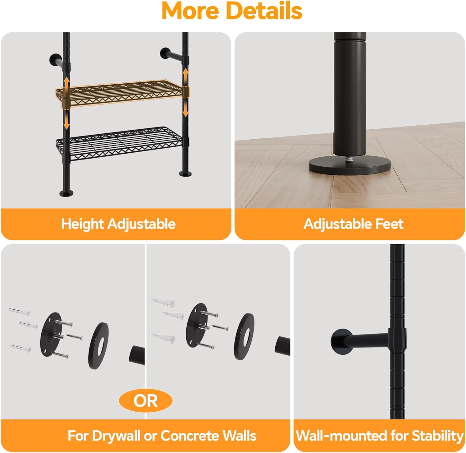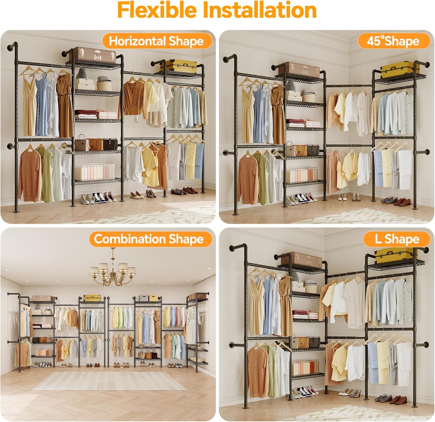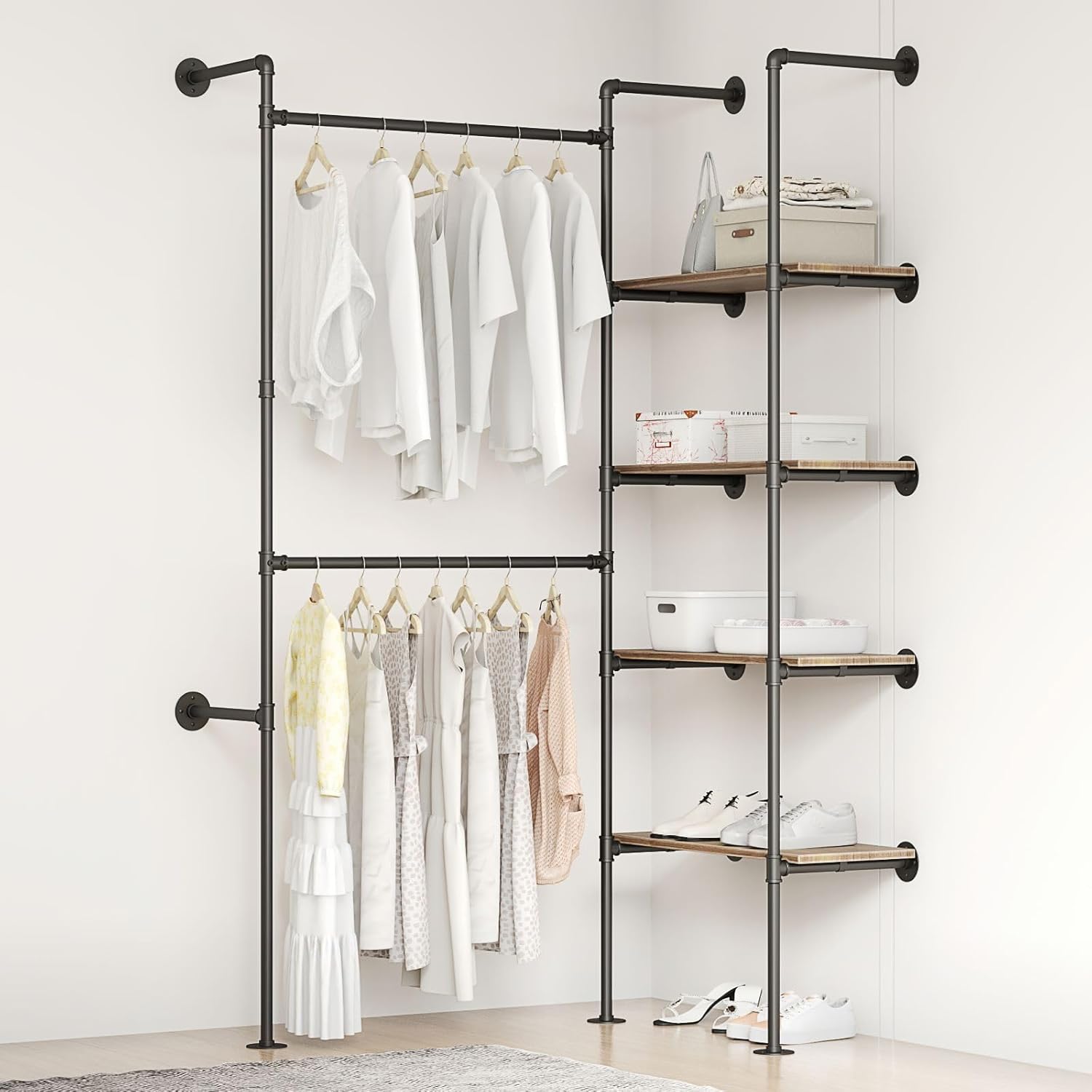 W4 Industrial Pipe Clothing Rack Wall Mounted Closet System Expandable Clothes Rack for Hanging Clothes, Heavy Duty Garment Rack Adjustable for Walk in Closet, Black