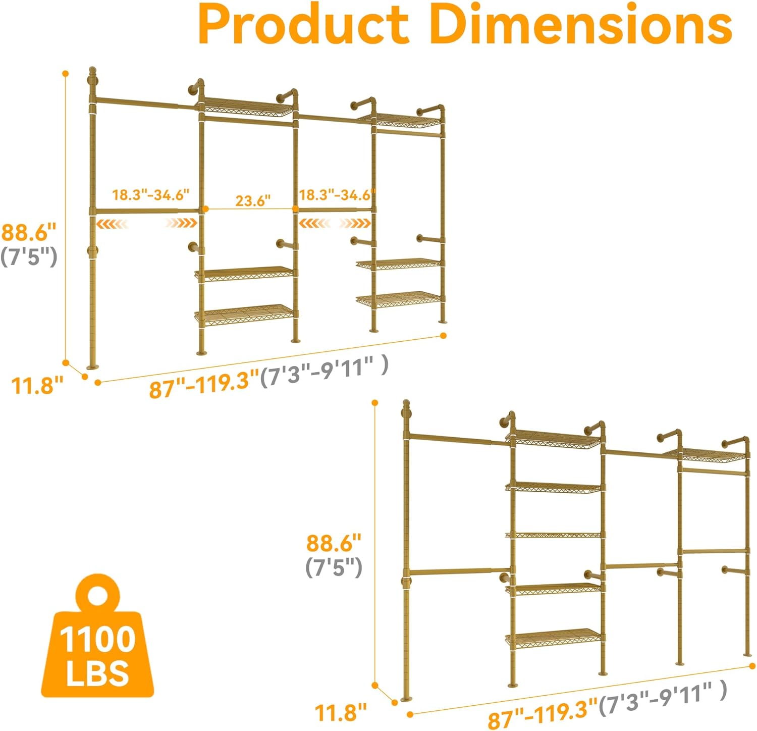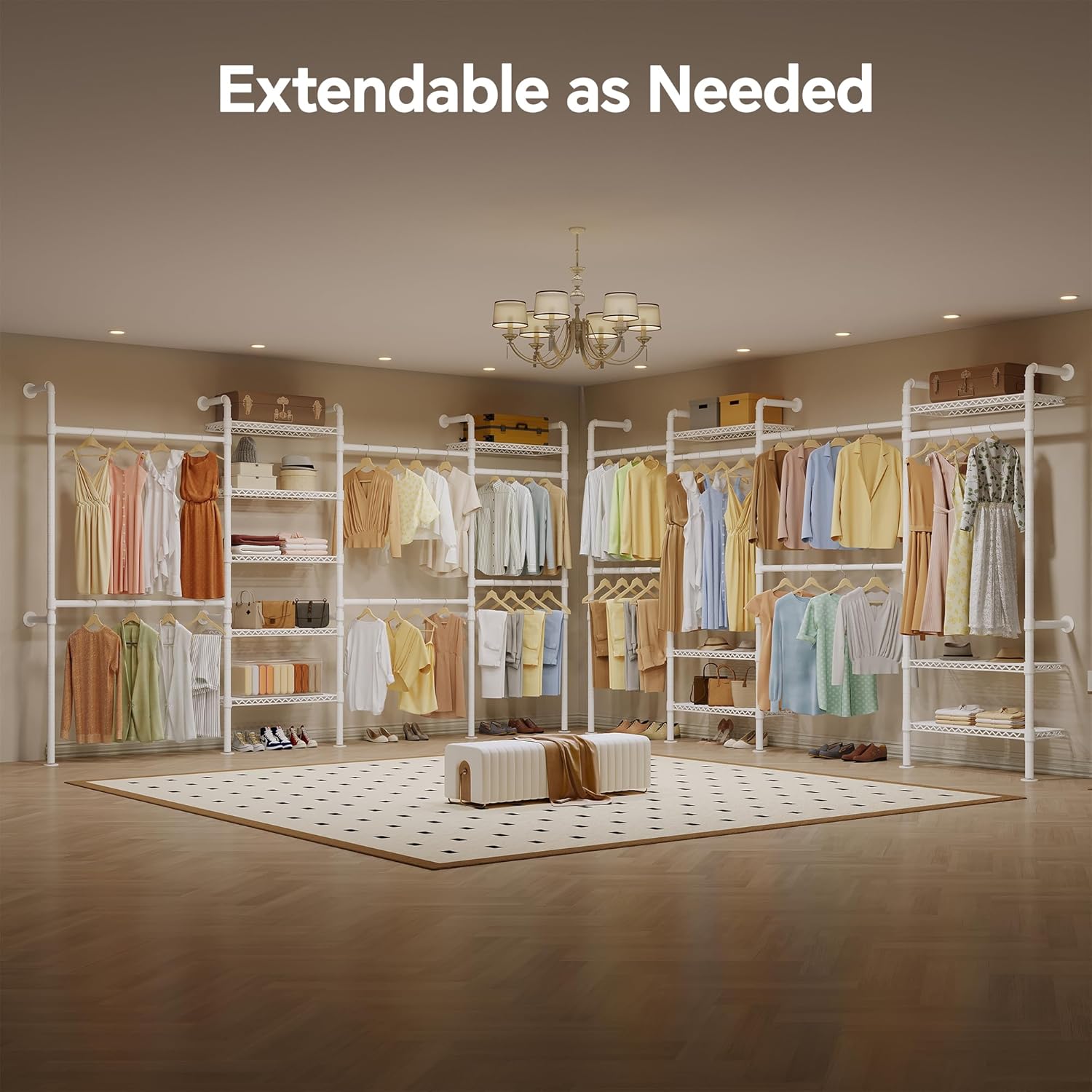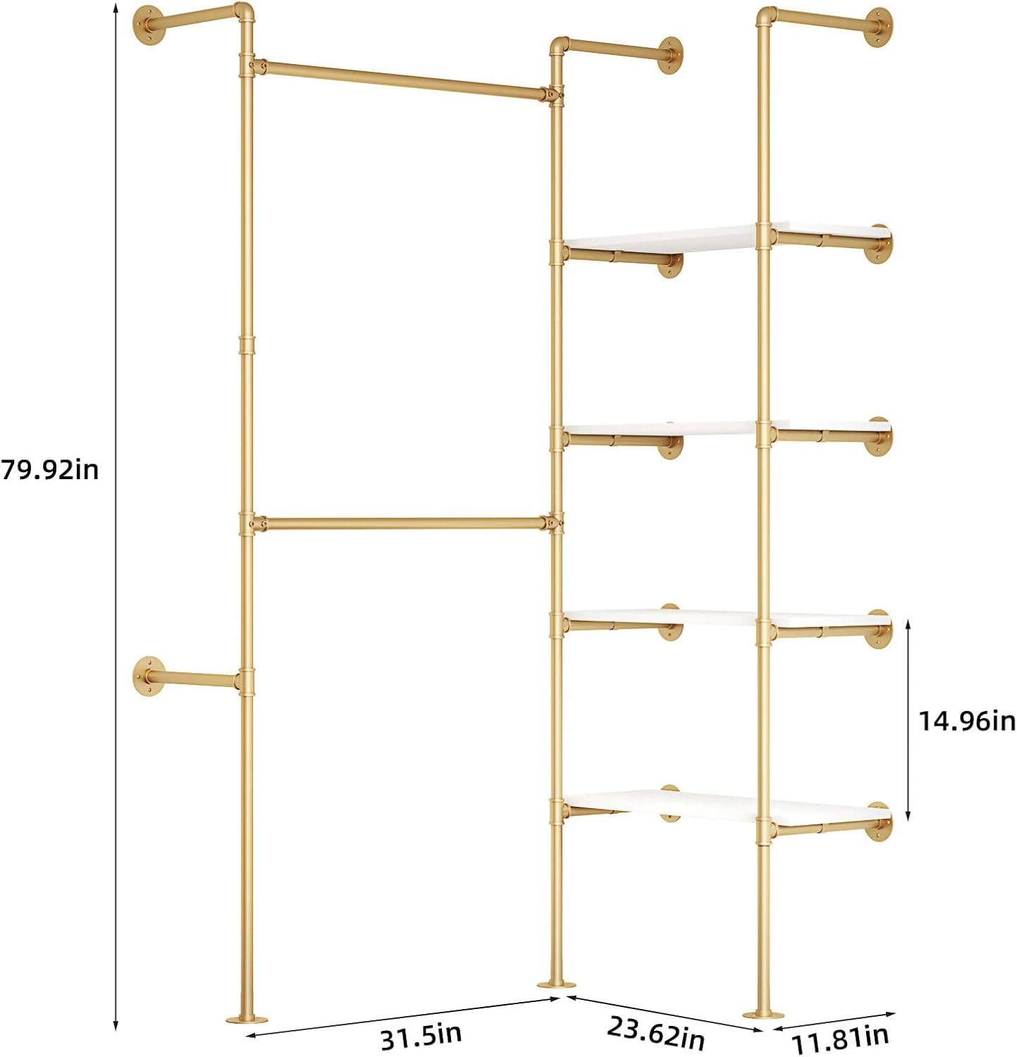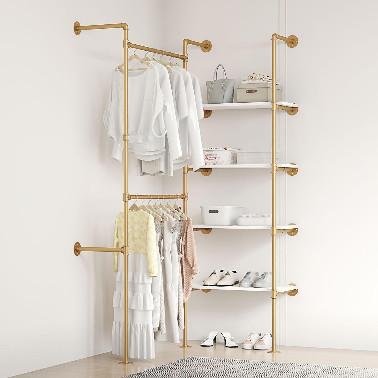 W4 Industrial Pipe Clothing Rack Wall Mounted Closet System Expandable Clothes Rack for Hanging Clothes, Heavy Duty Garment Rack Adjustable for Walk in Closet, Black