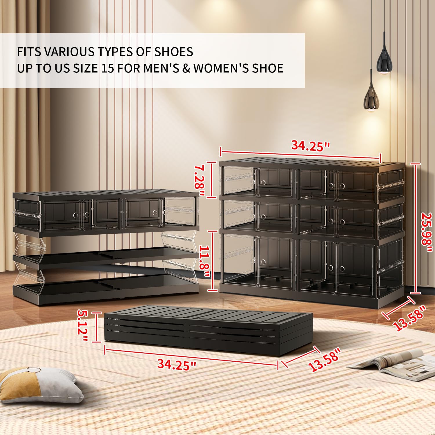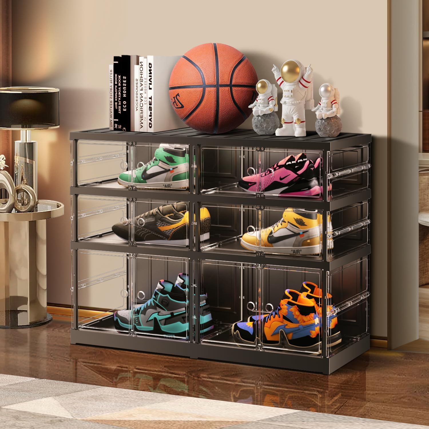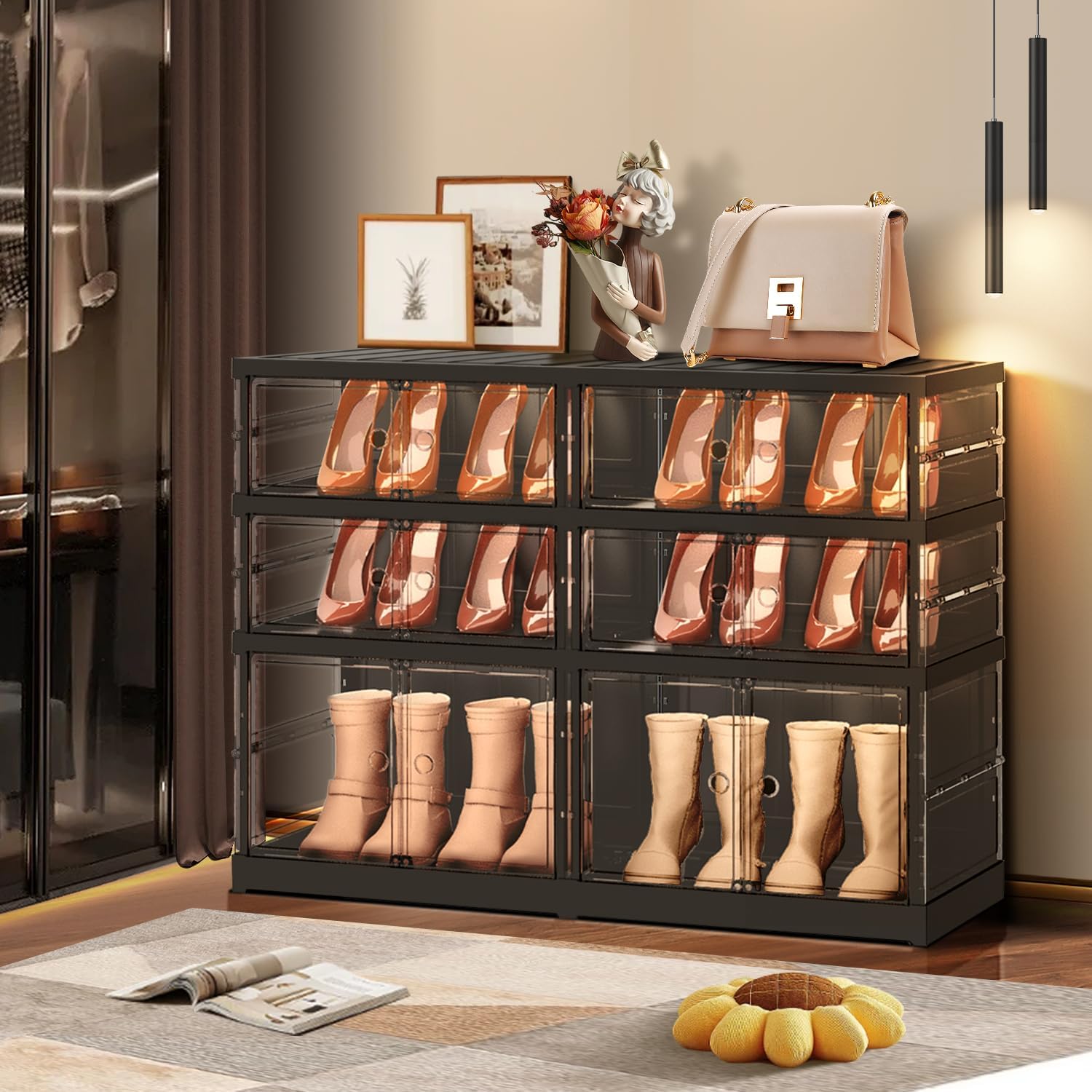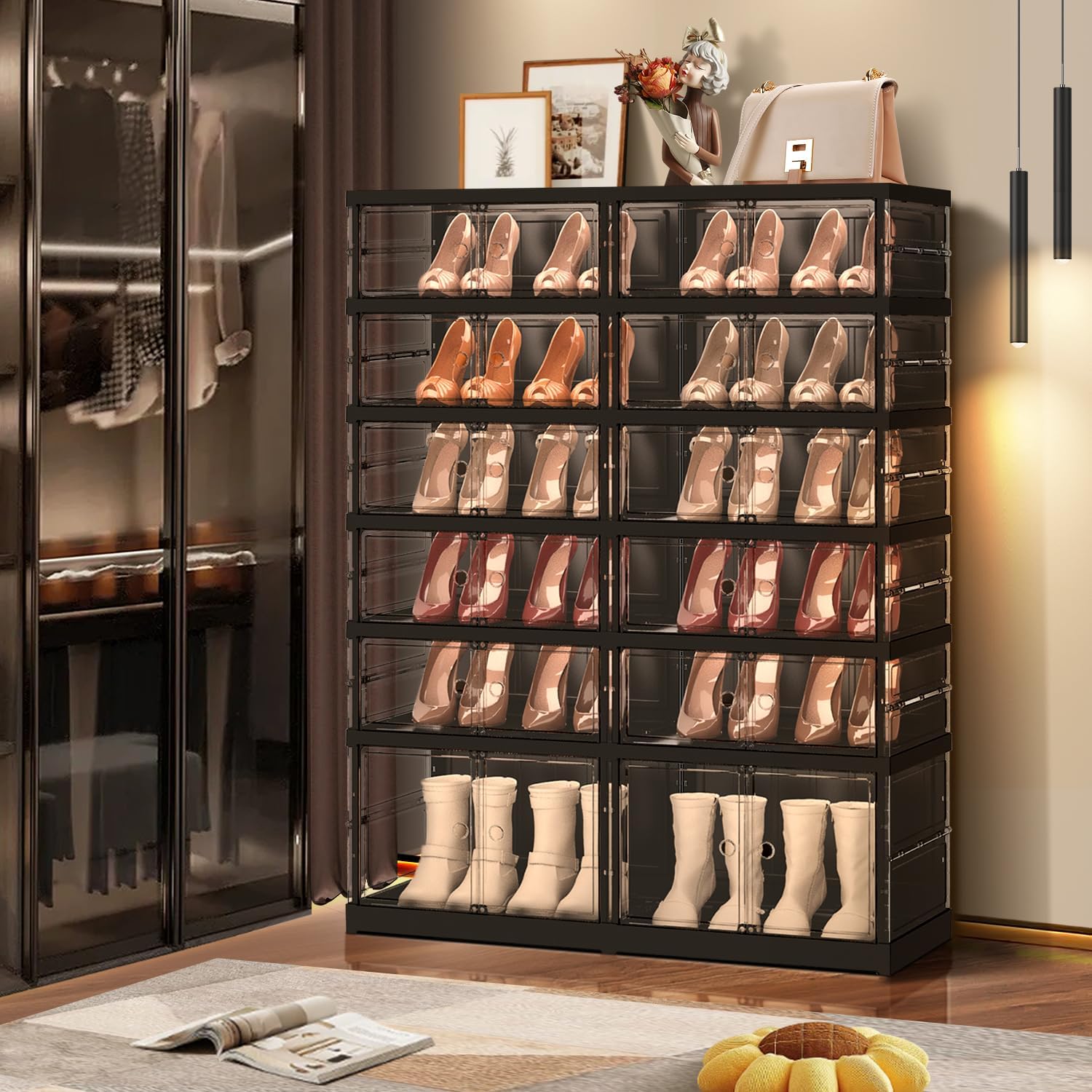 6 Tiers 12-24 Pairs Foldable Shoe Rack for Closet Plastic Stackable Shoe Boxes for Garage Collapsible Shoes Shelf with Doors Storage Organizer Cabinet Quick Assembly,Black