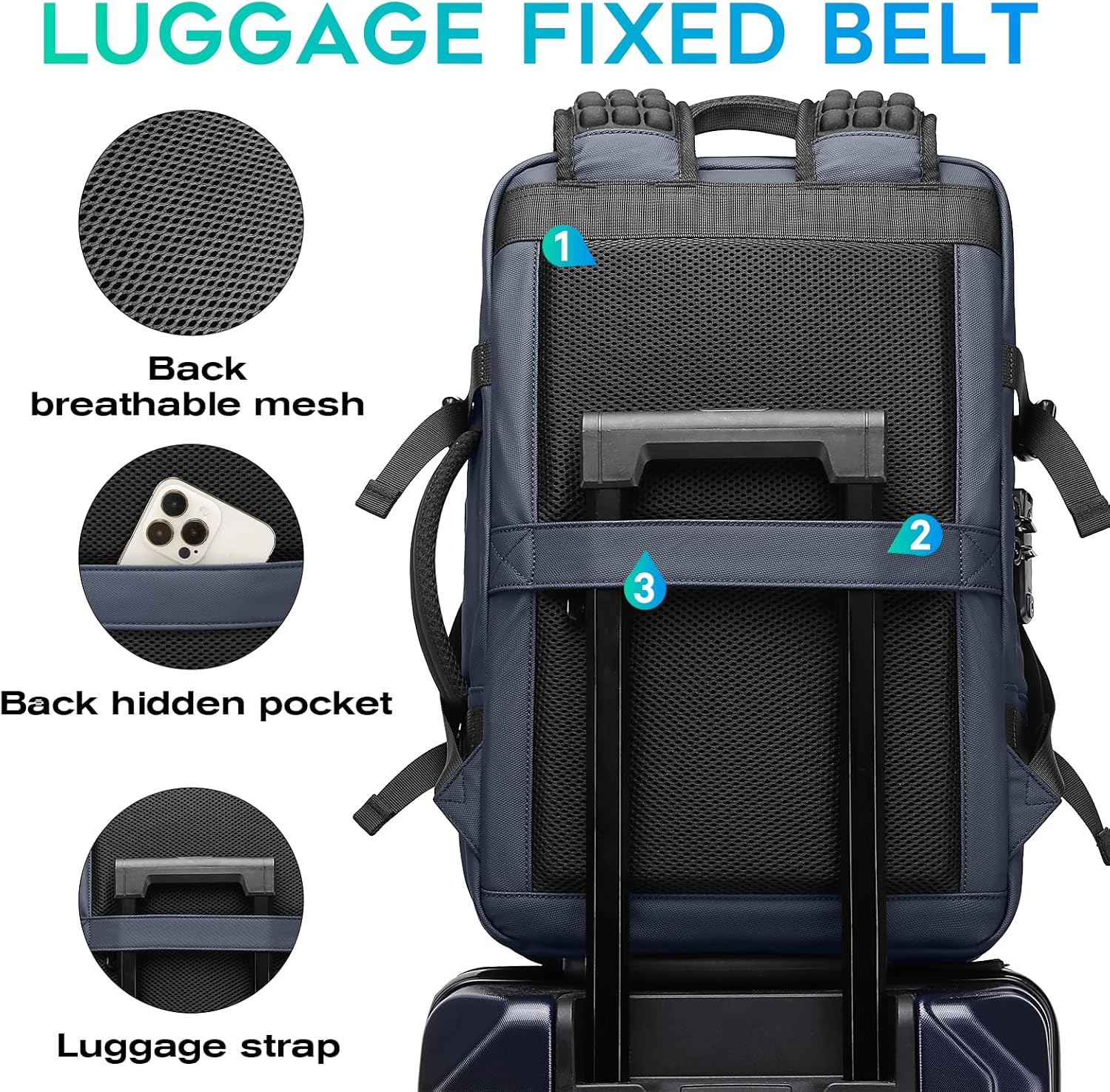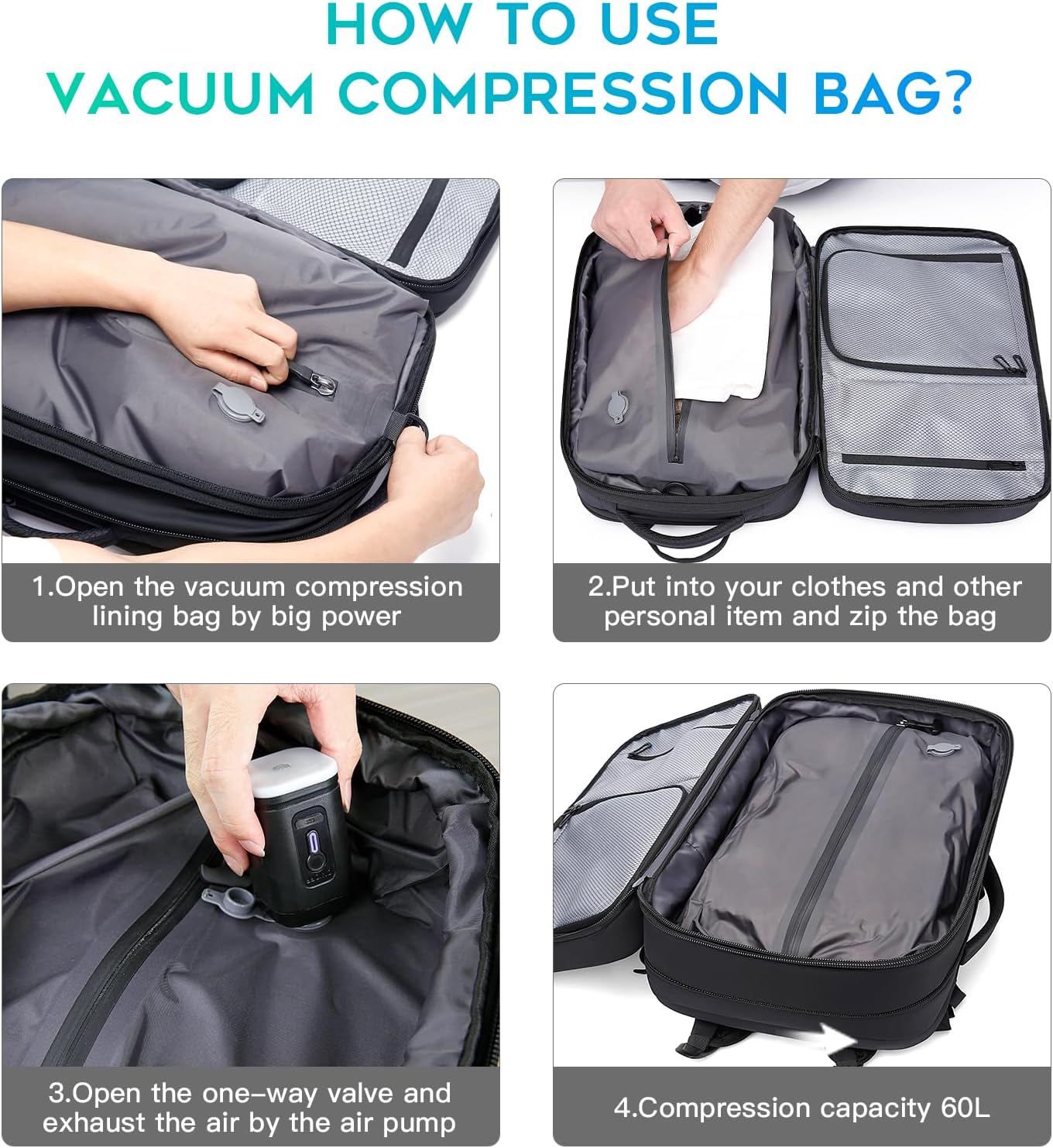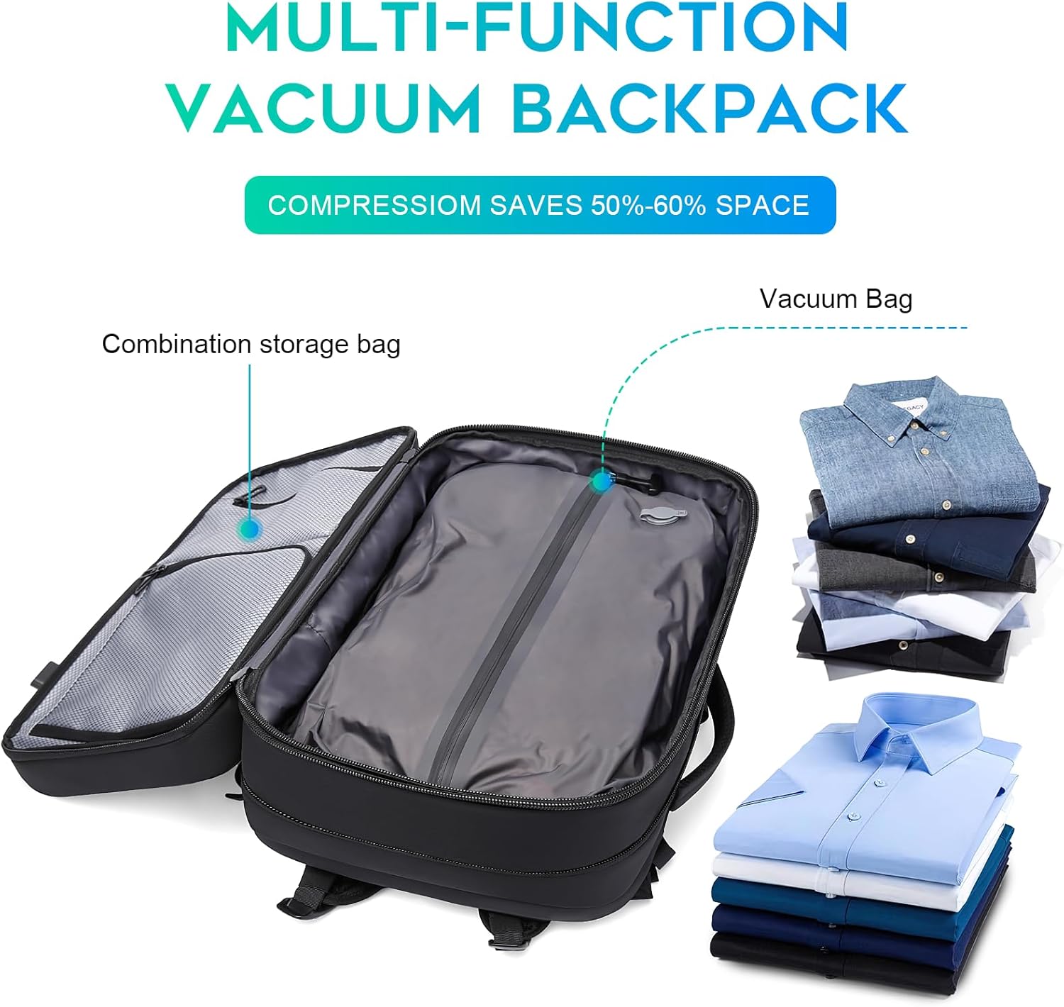 Vacuum Seal Travel Backpack, 60L Expandable Integrated Air Compression Button Water Resistant TSA Lock, Airback Cabin Suitcase, Vacpack Backpack Black.