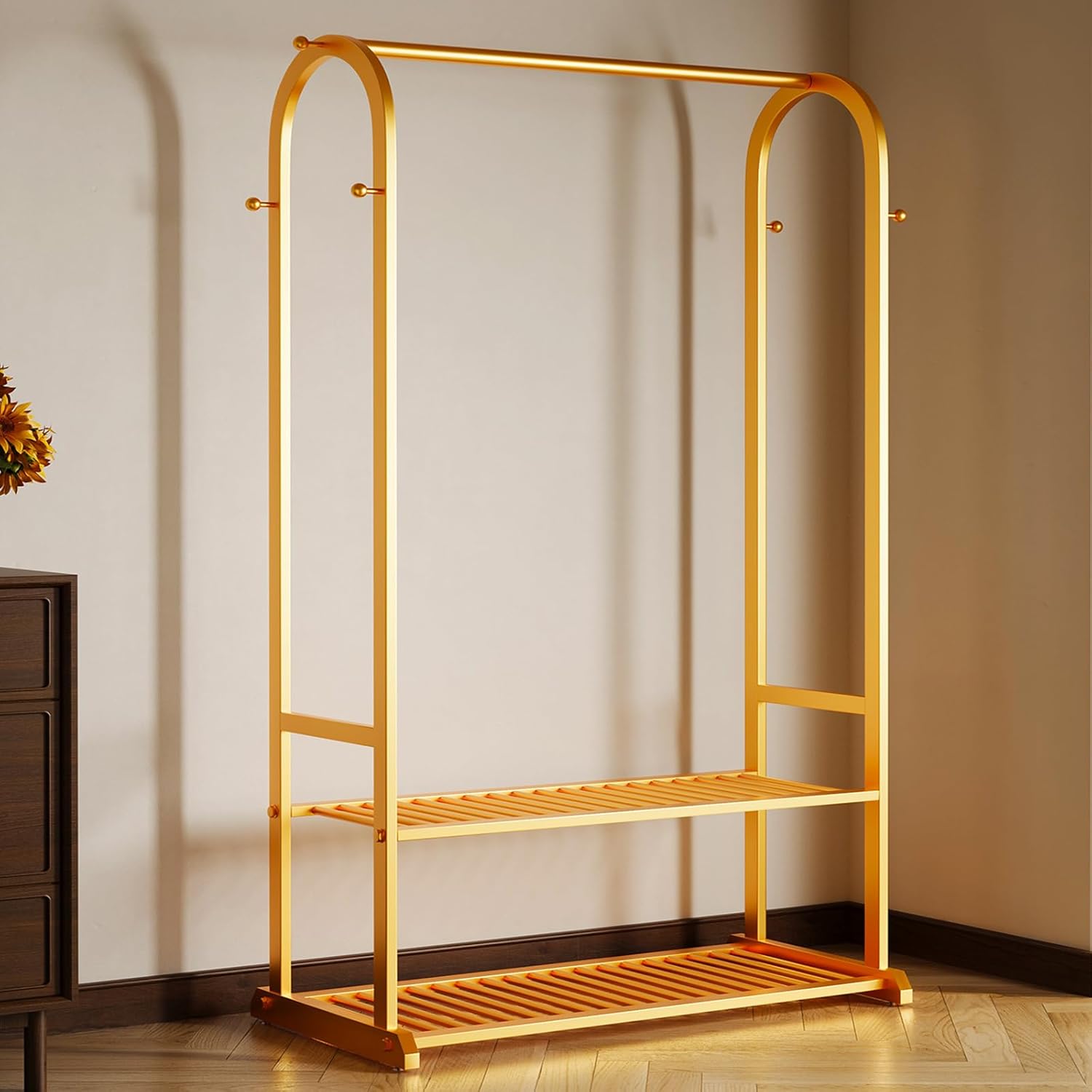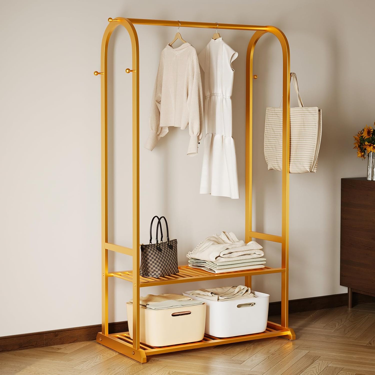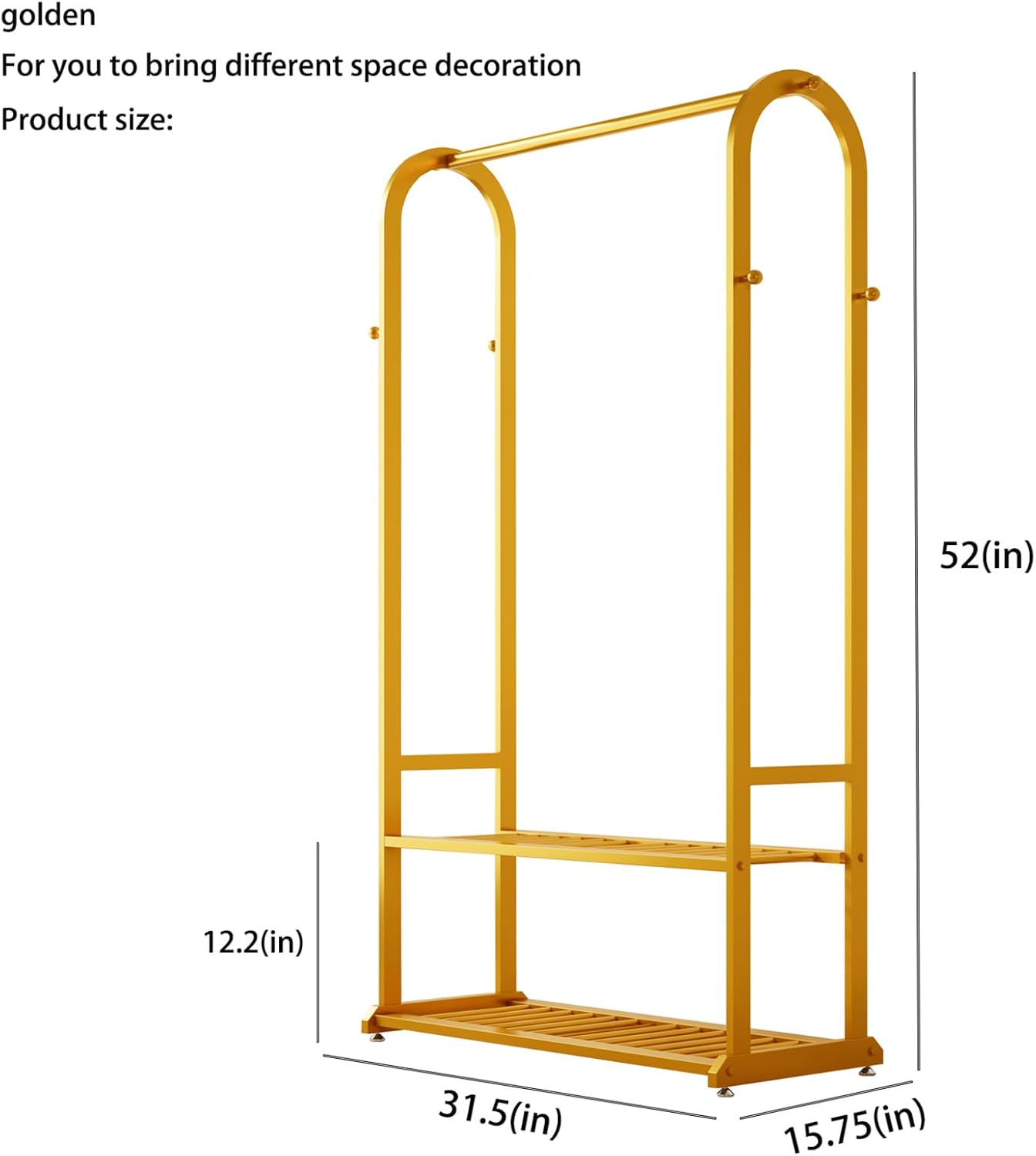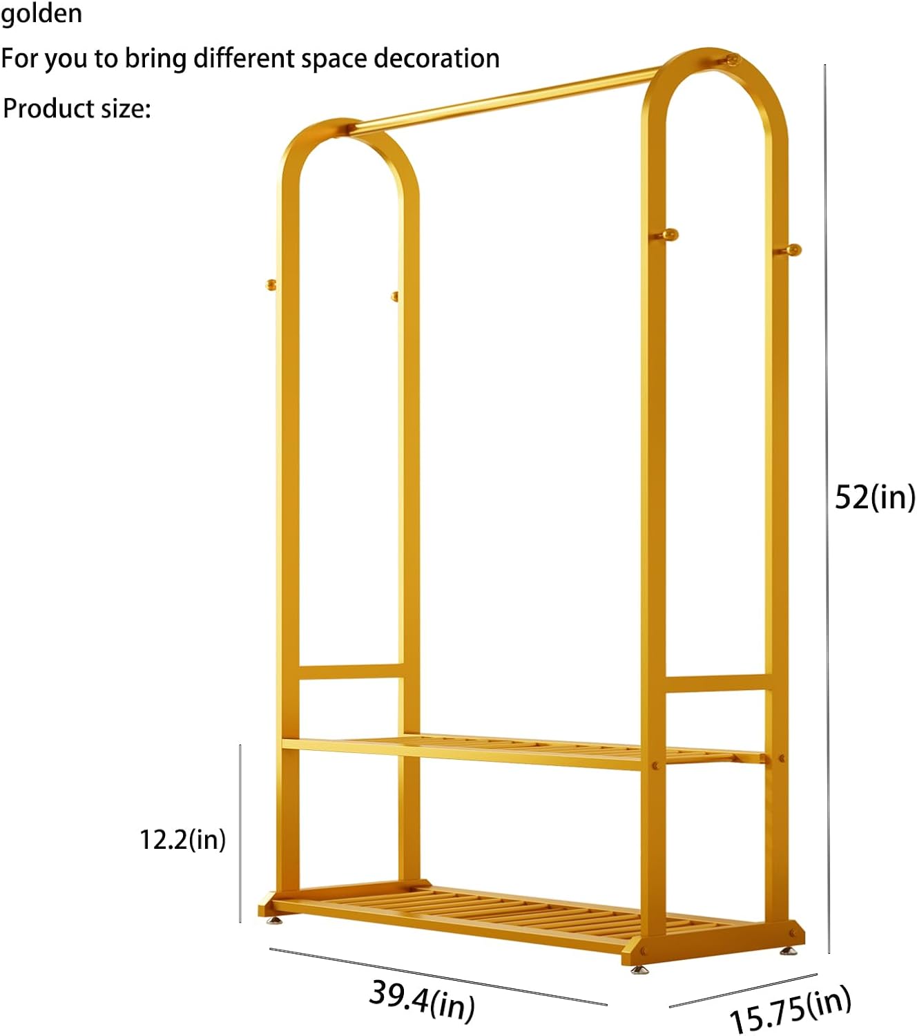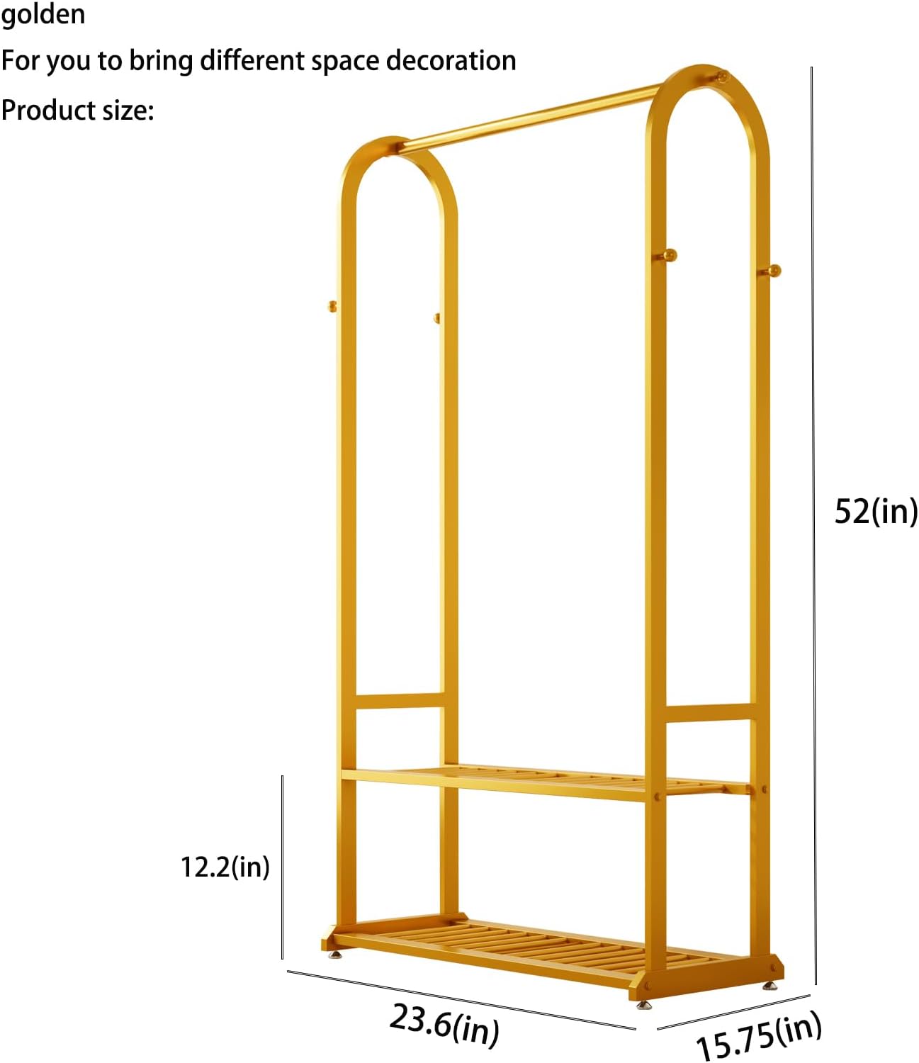 Sturdy heavy duty clothes rack,Gold clothing rack with bottom shelves and 6 side hooks,Metal garment rack for hanging clothes