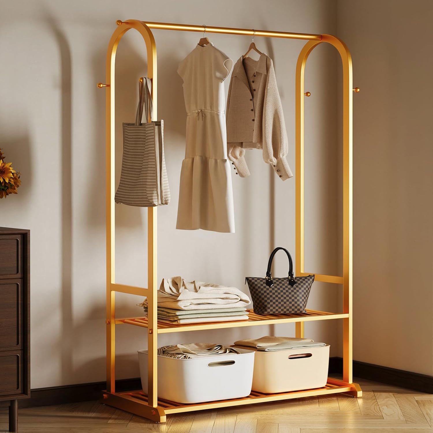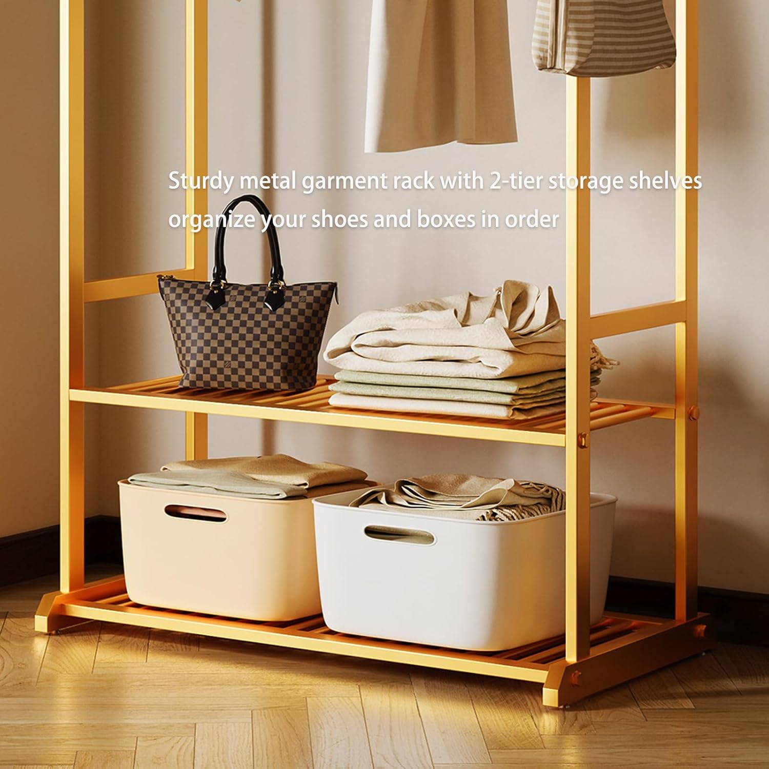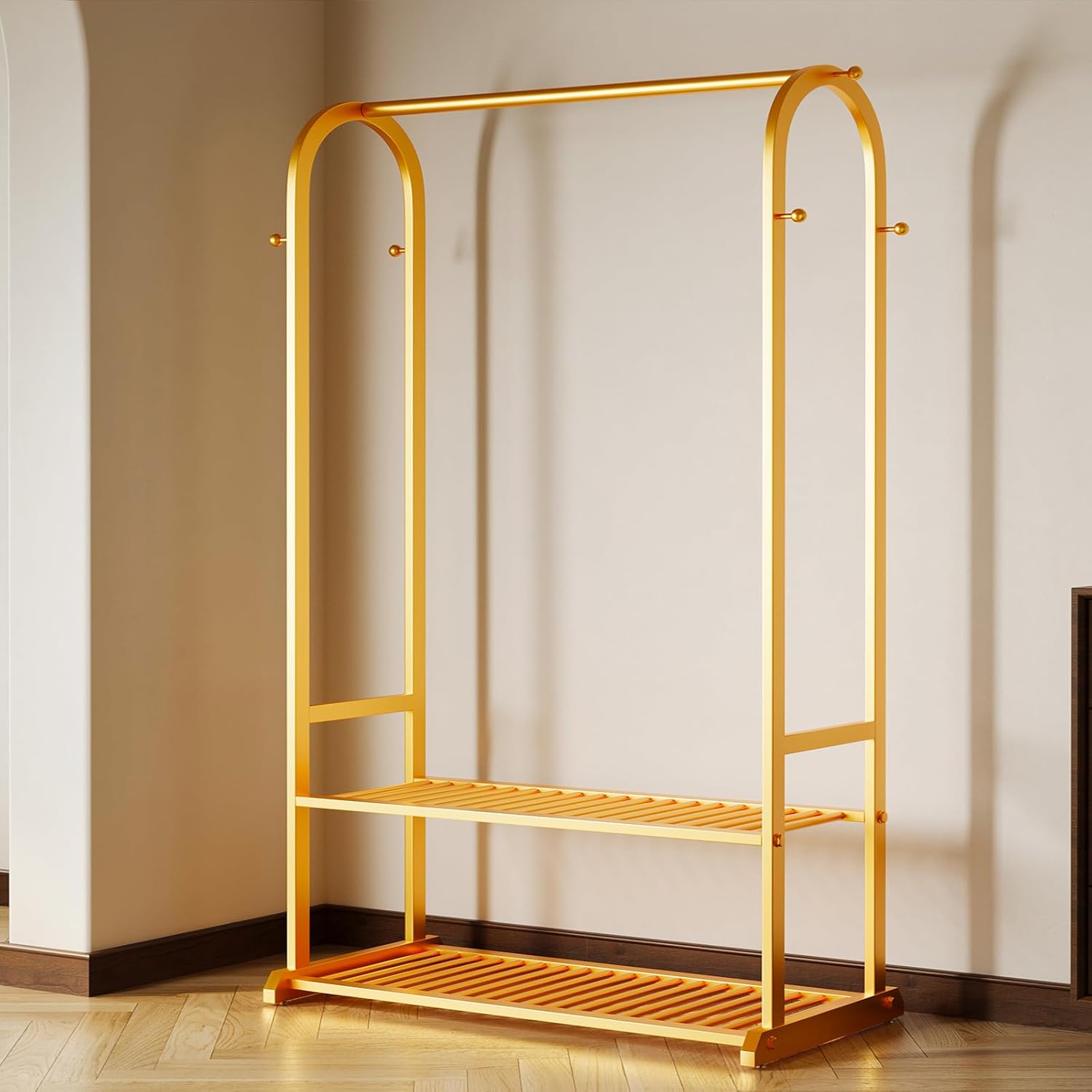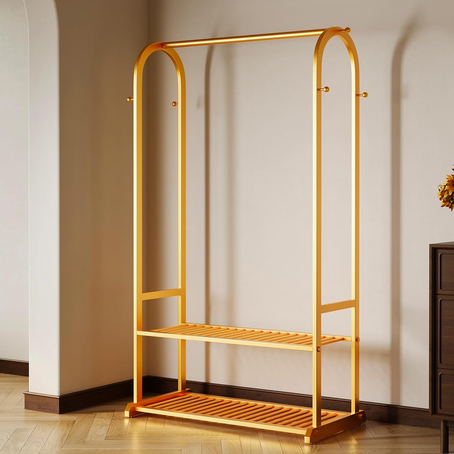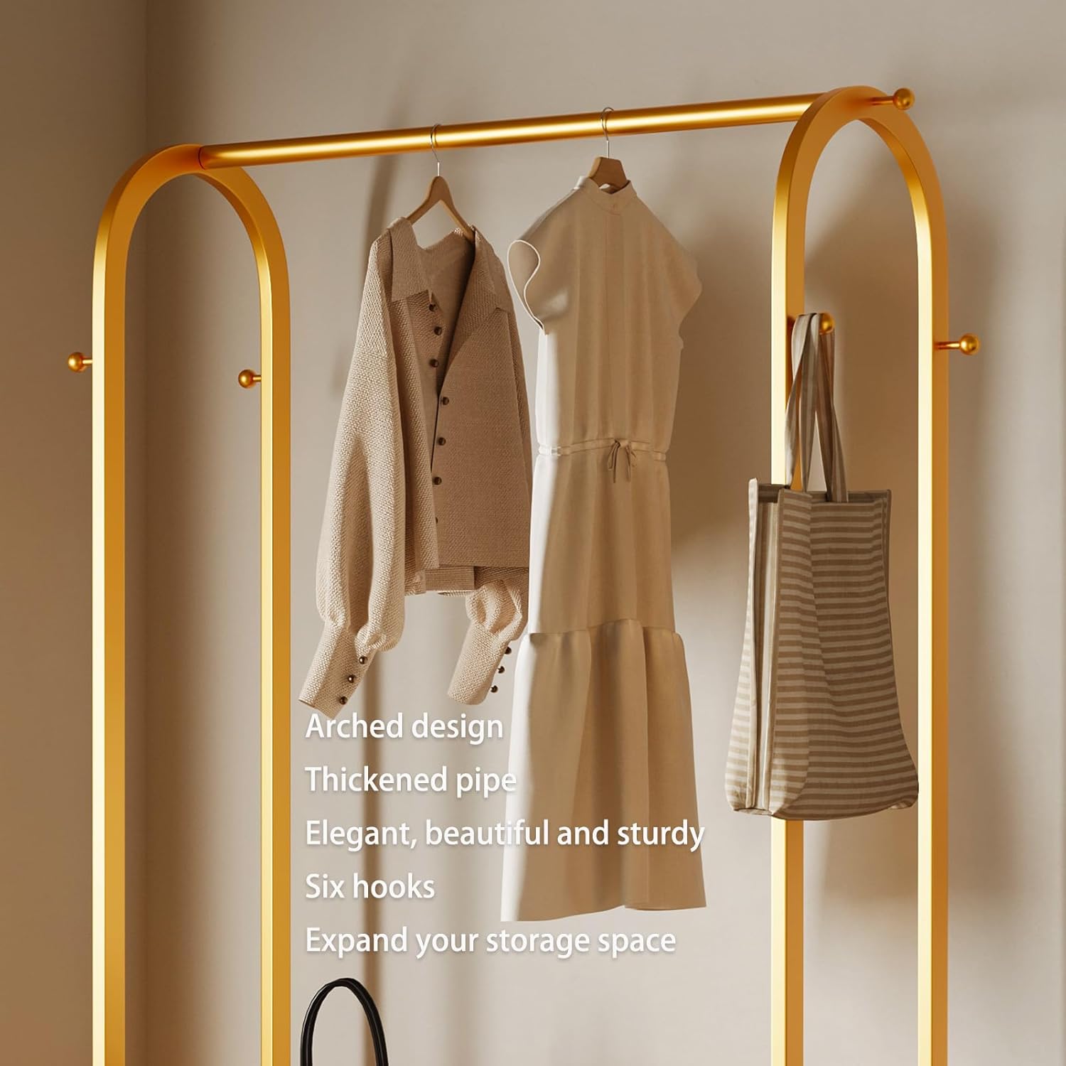 Sturdy heavy duty clothes rack,Gold clothing rack with bottom shelves and 6 side hooks,Metal garment rack for hanging clothes