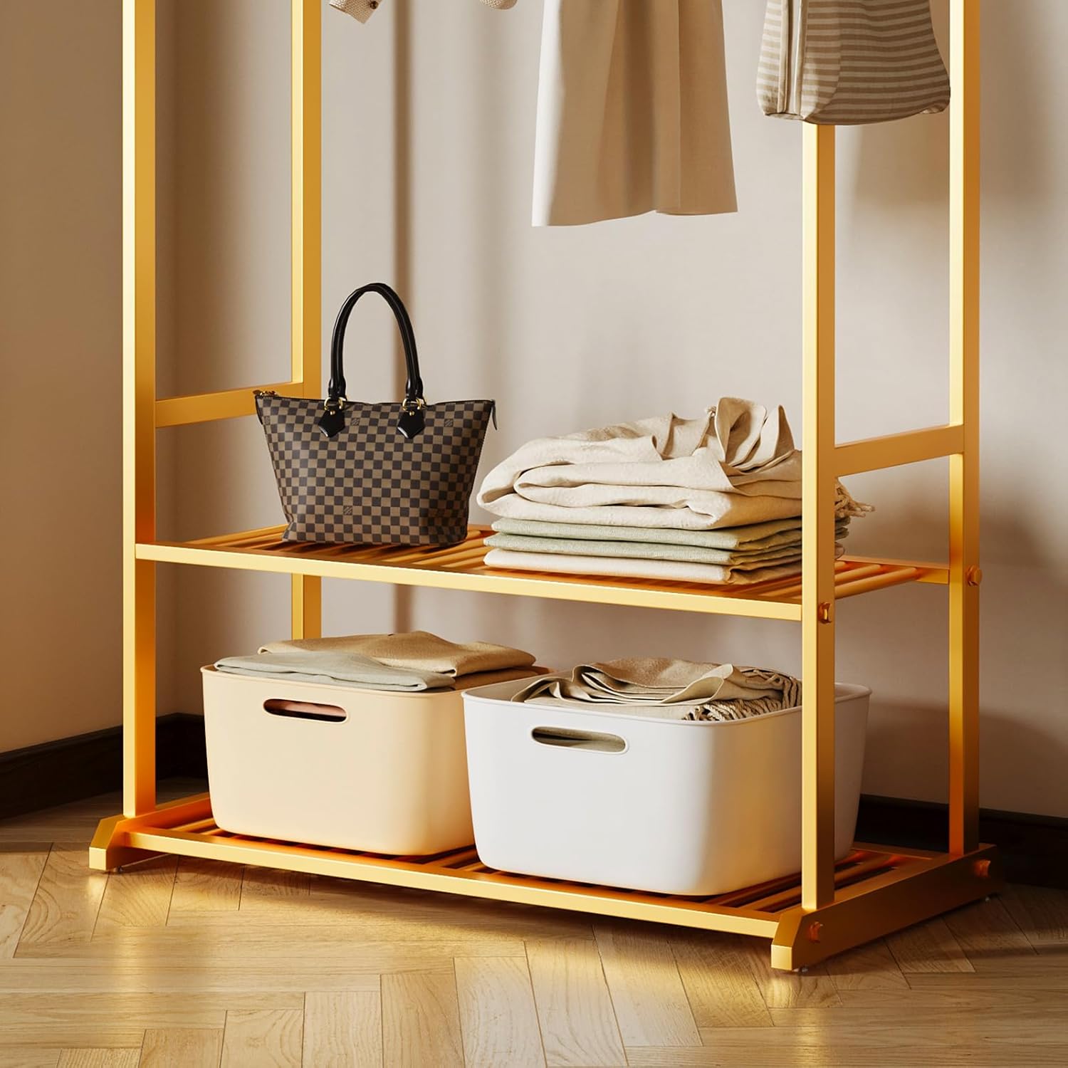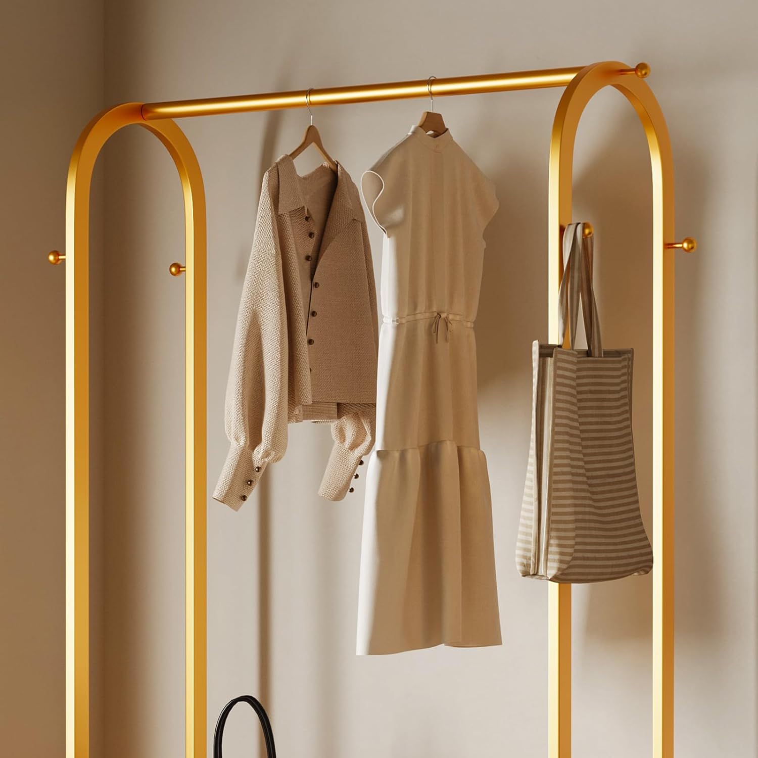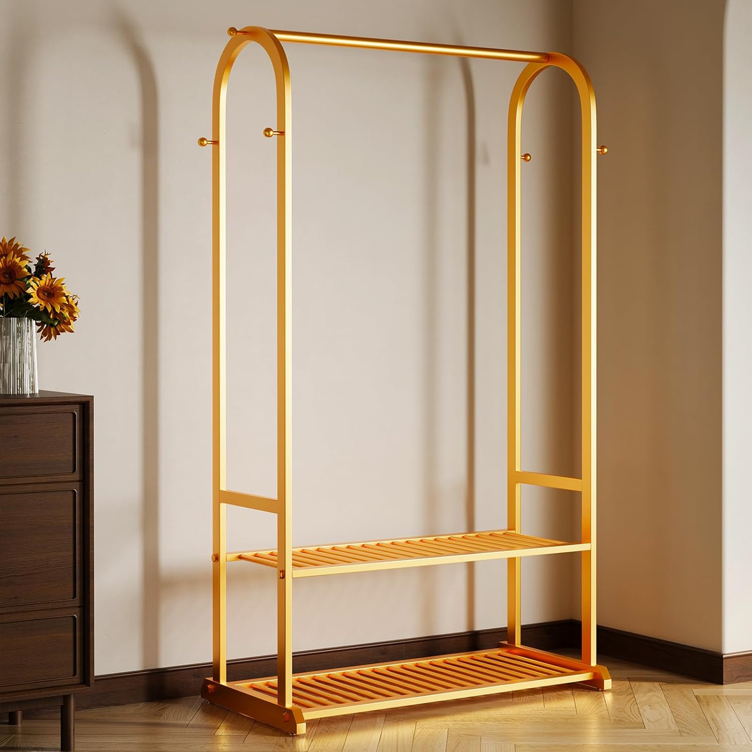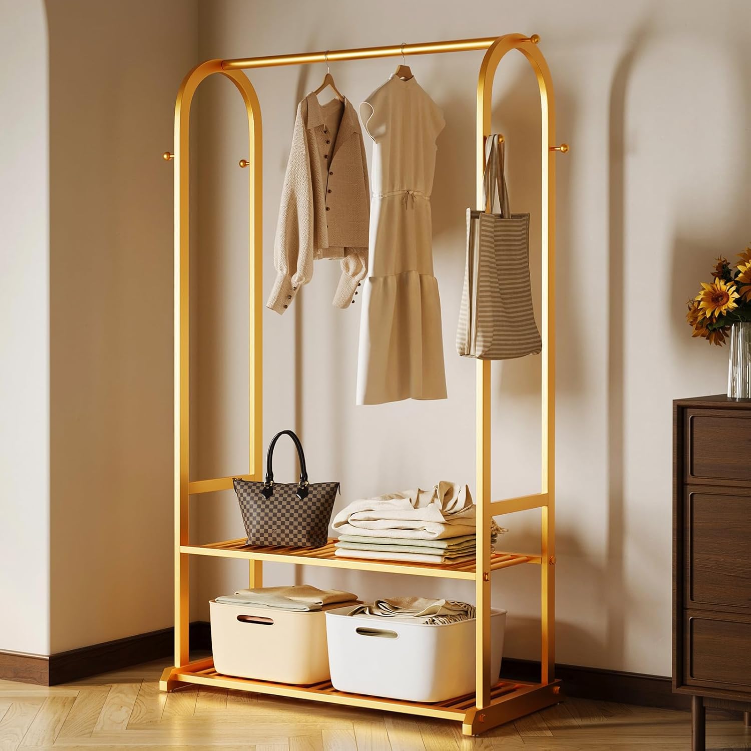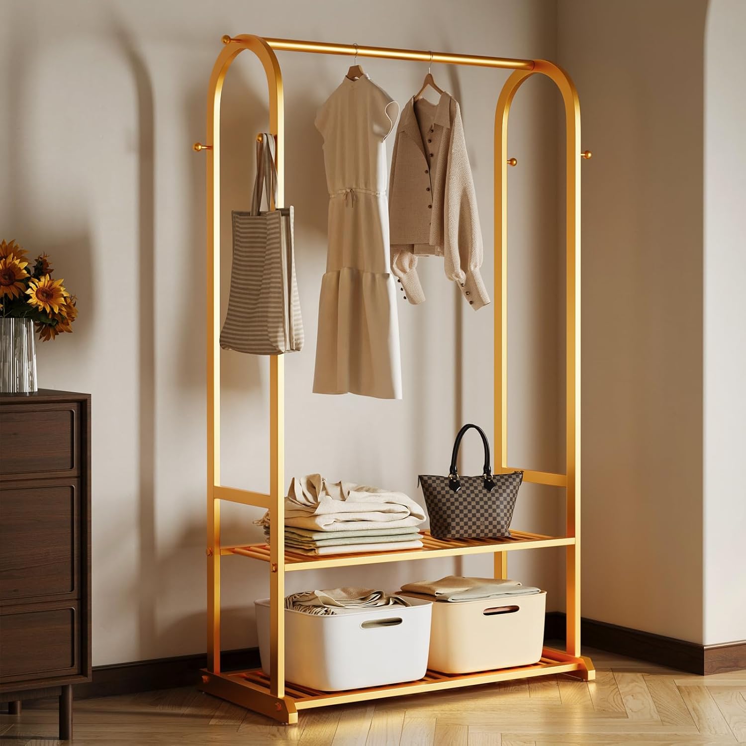 Sturdy heavy duty clothes rack,Gold clothing rack with bottom shelves and 6 side hooks,Metal garment rack for hanging clothes