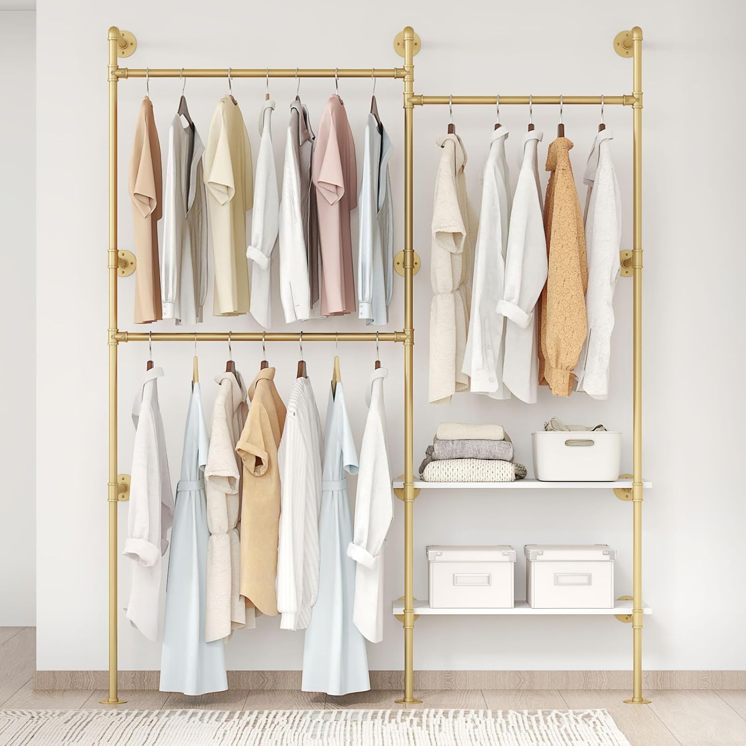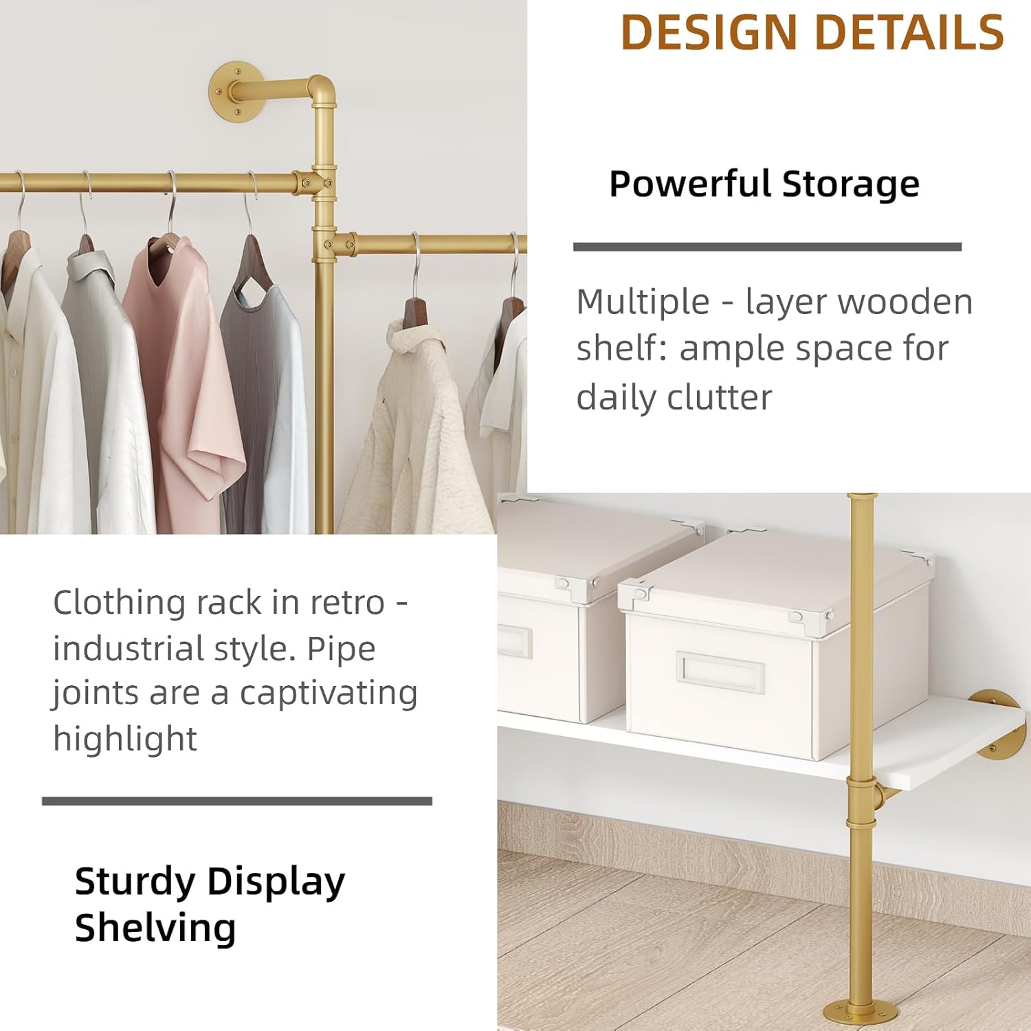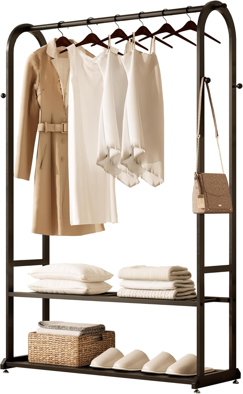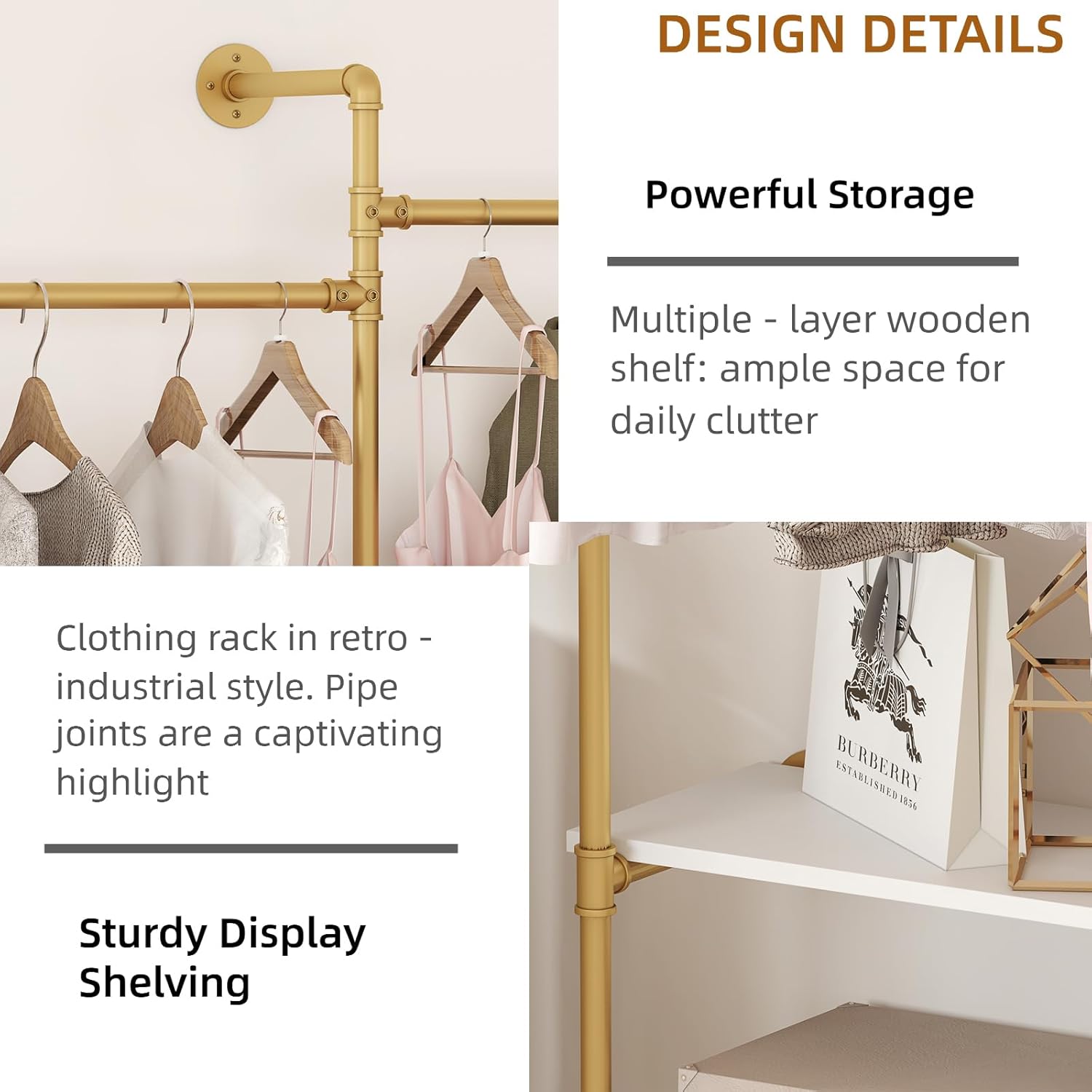 Sturdy heavy duty clothes rack,Gold clothing rack with bottom shelves and 6 side hooks,Metal garment rack for hanging clothes
