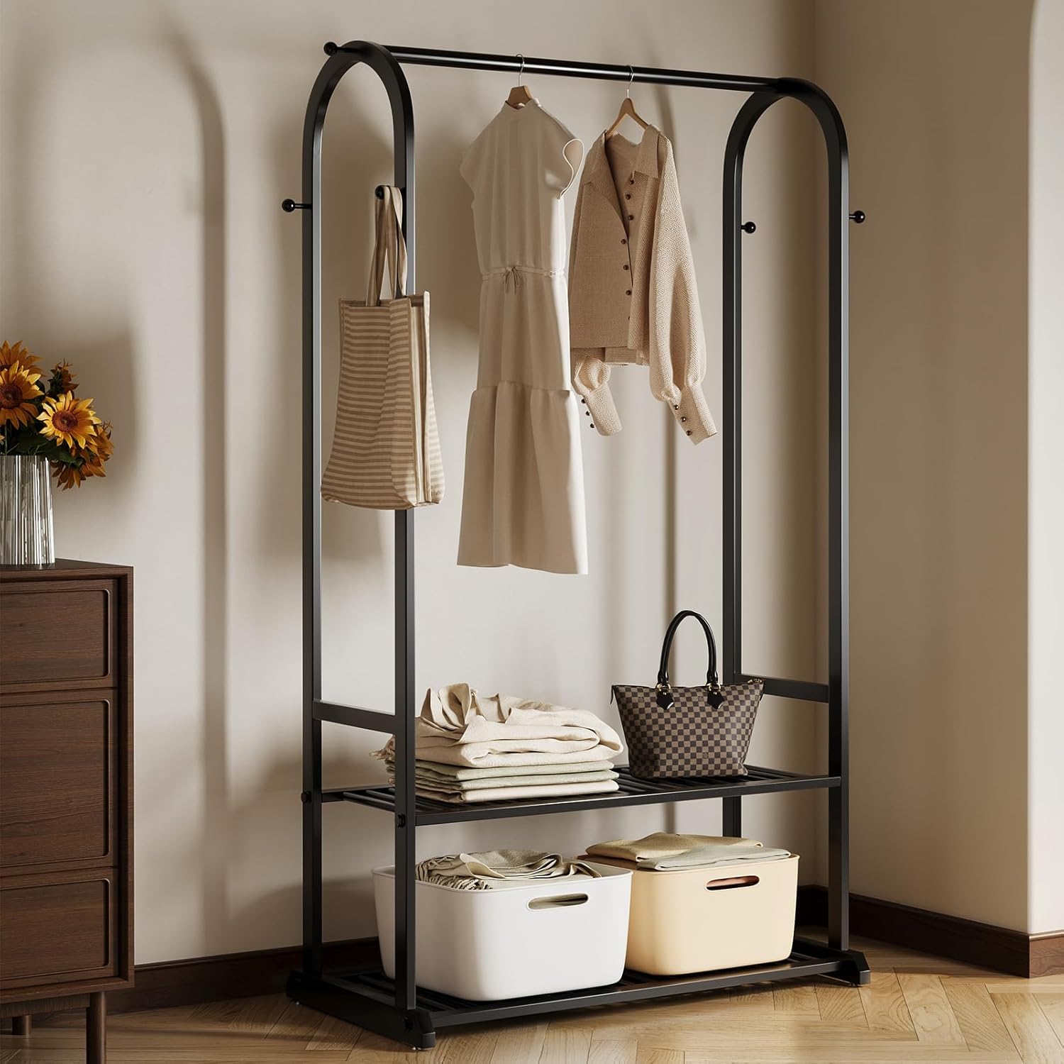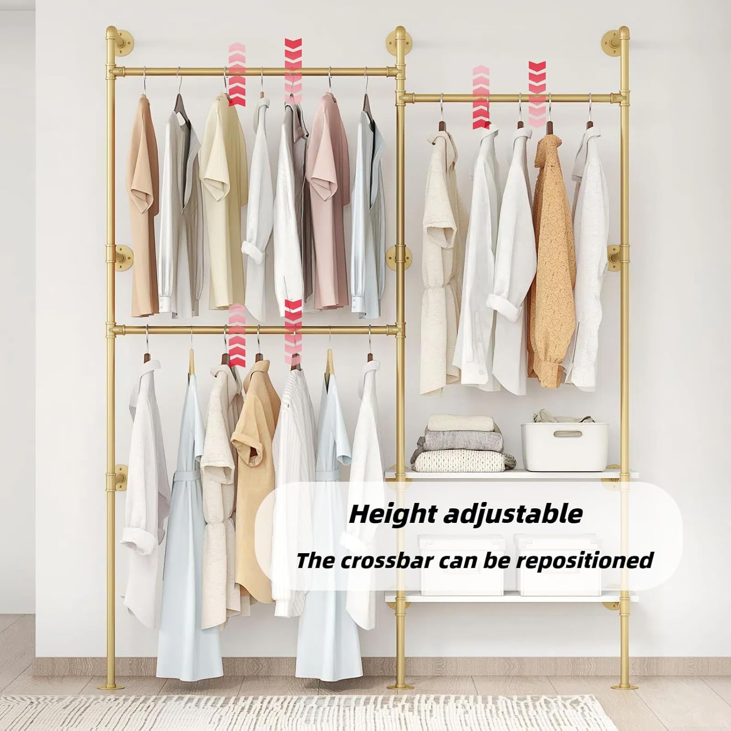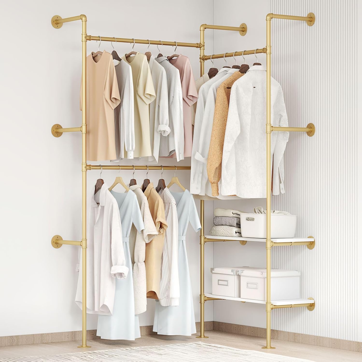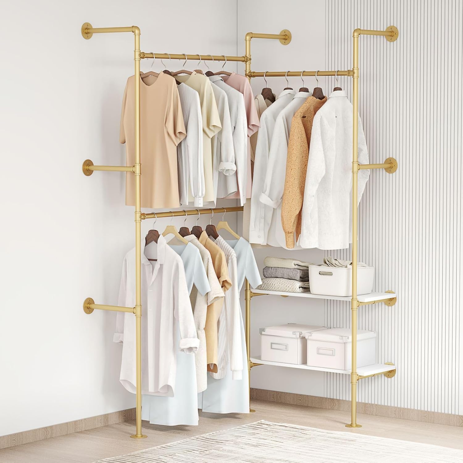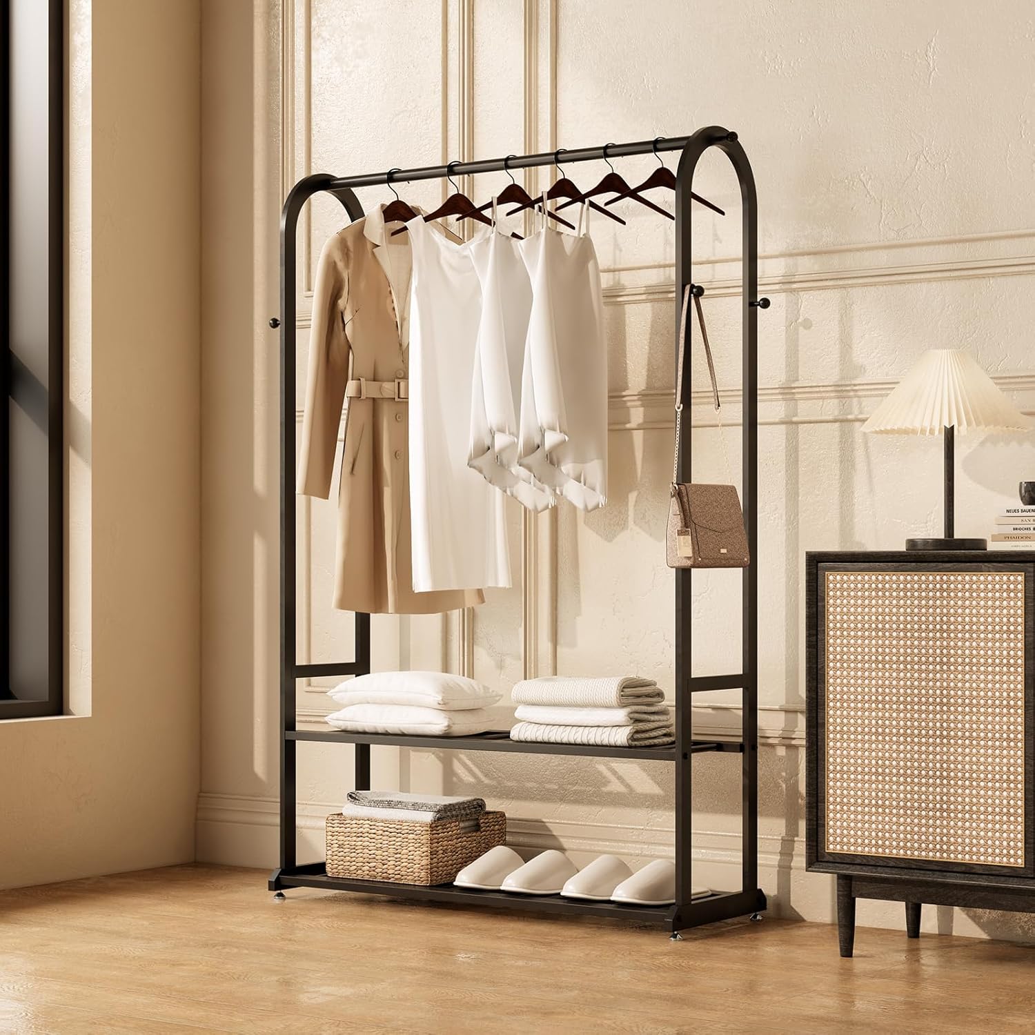 Sturdy heavy duty clothes rack,Gold clothing rack with bottom shelves and 6 side hooks,Metal garment rack for hanging clothes
