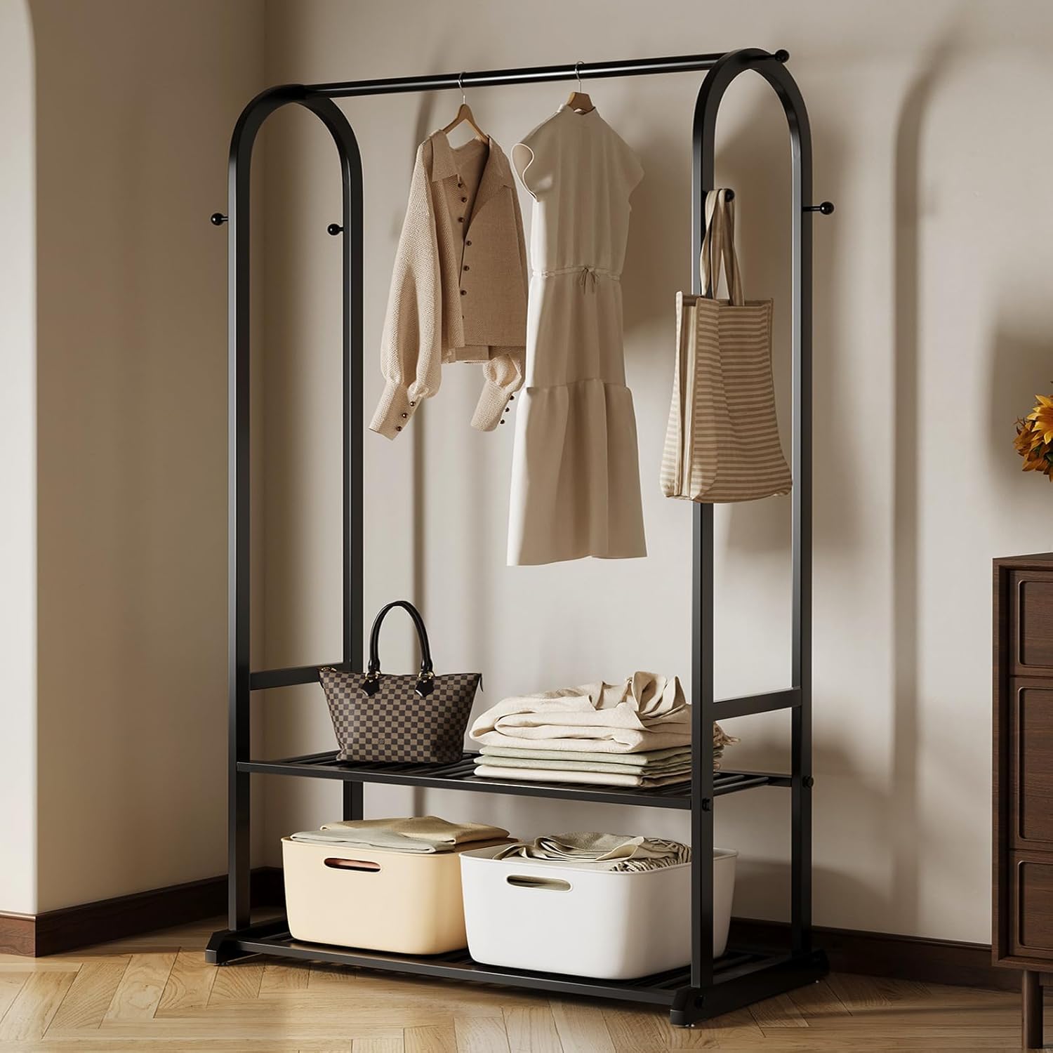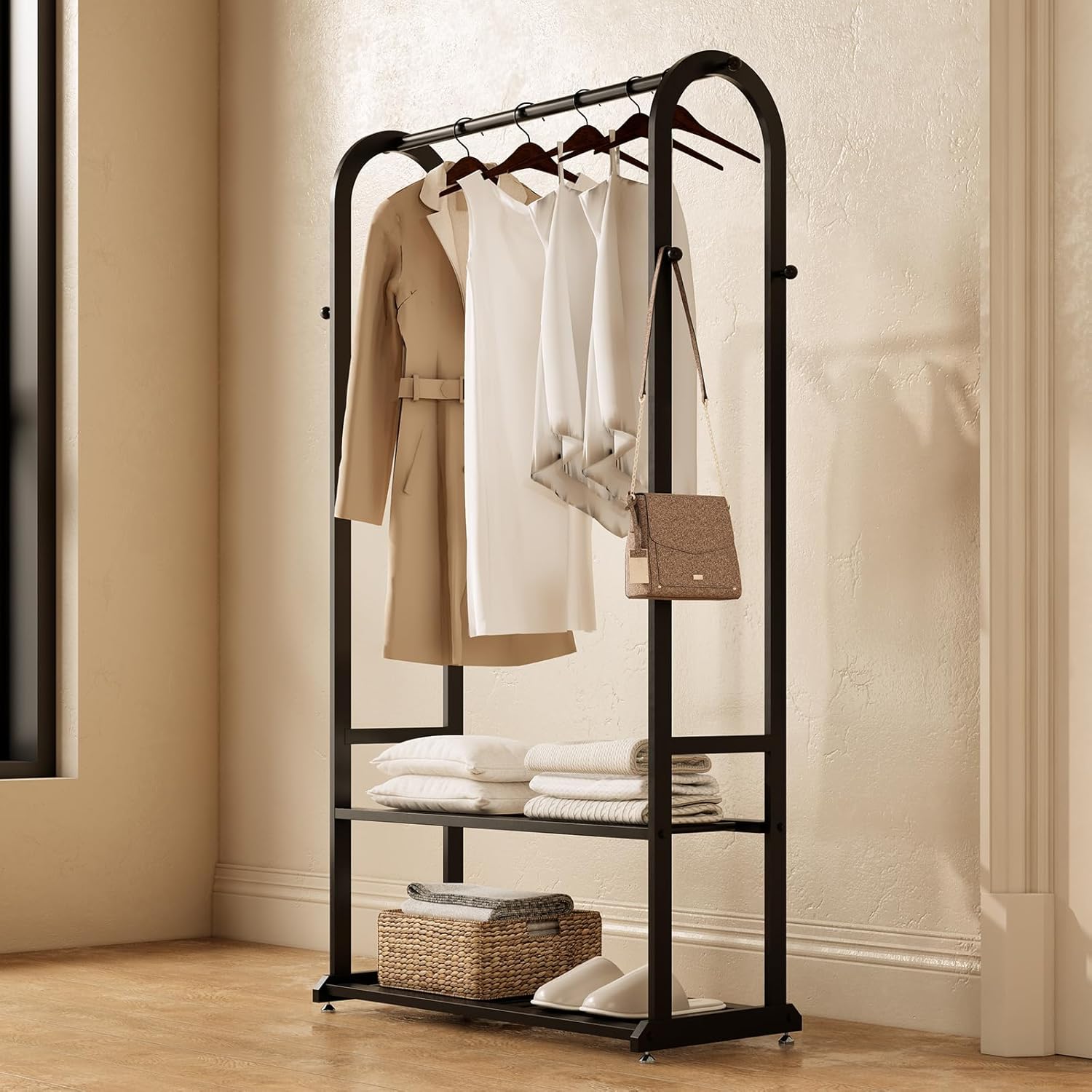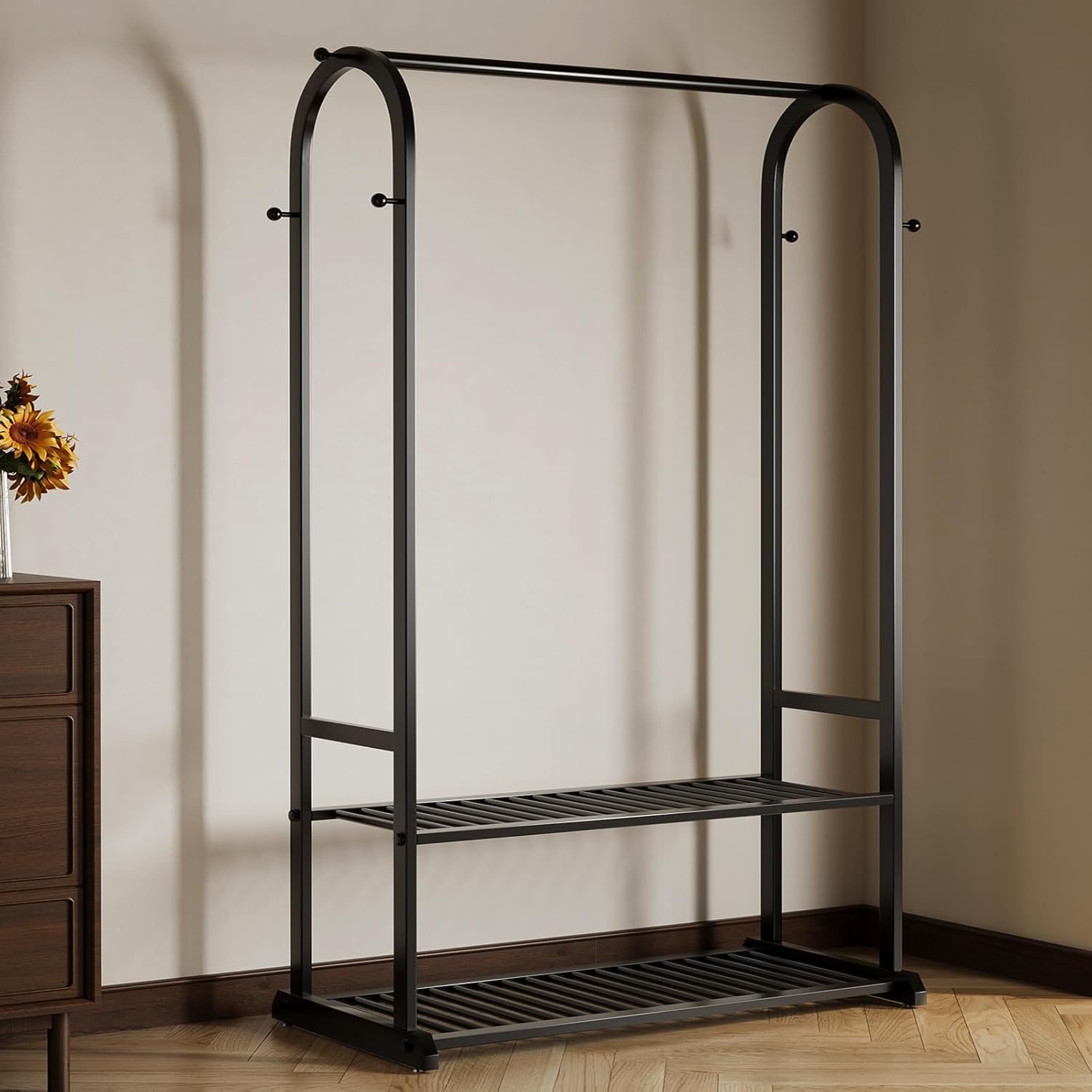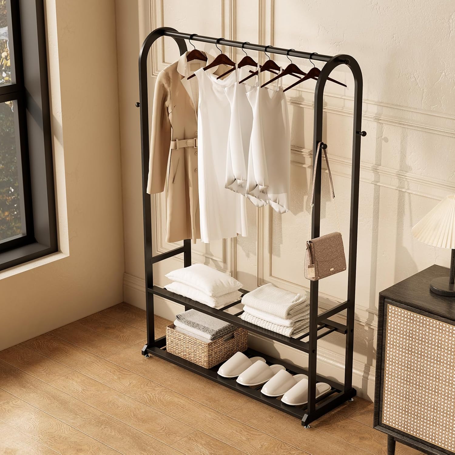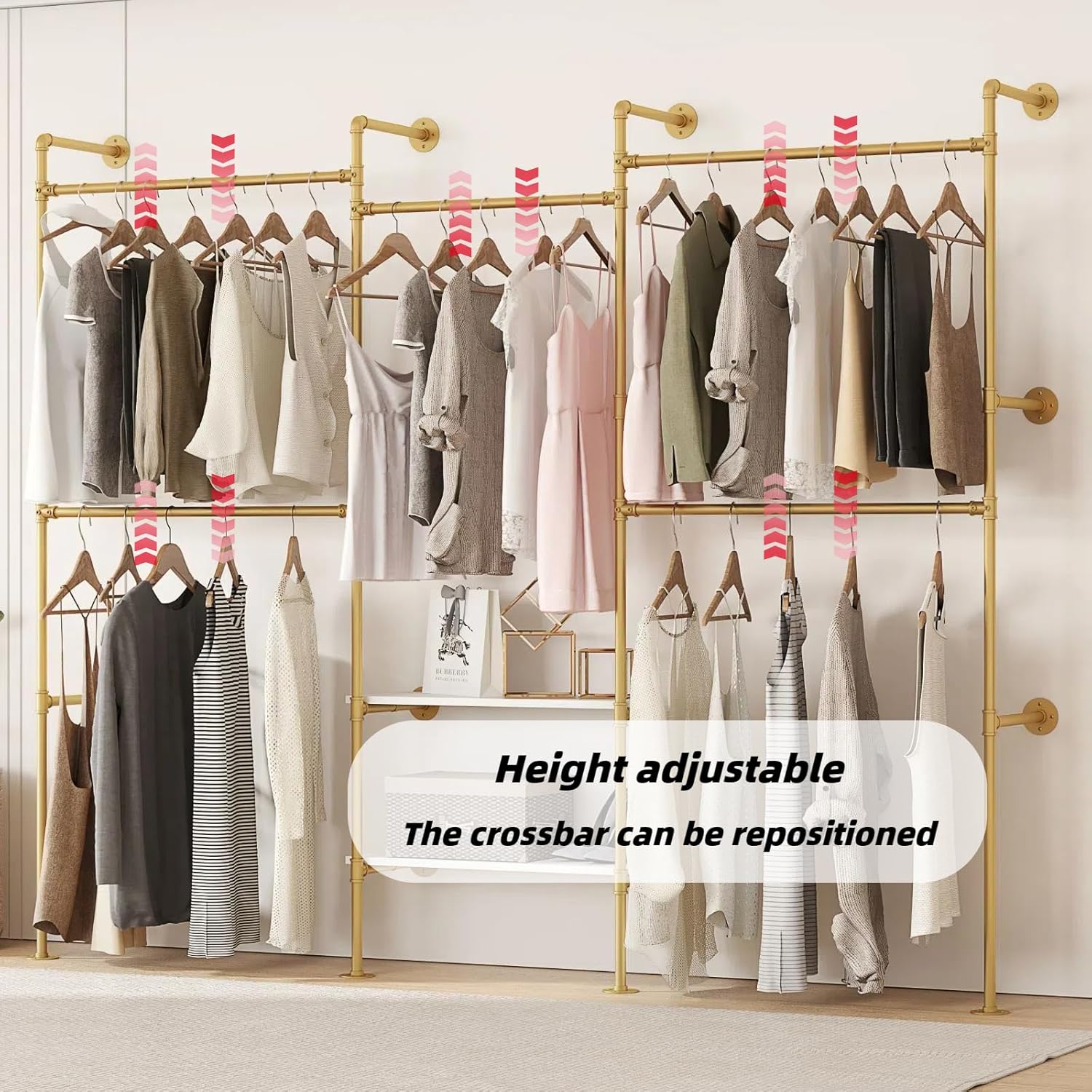 Sturdy heavy duty clothes rack,Gold clothing rack with bottom shelves and 6 side hooks,Metal garment rack for hanging clothes