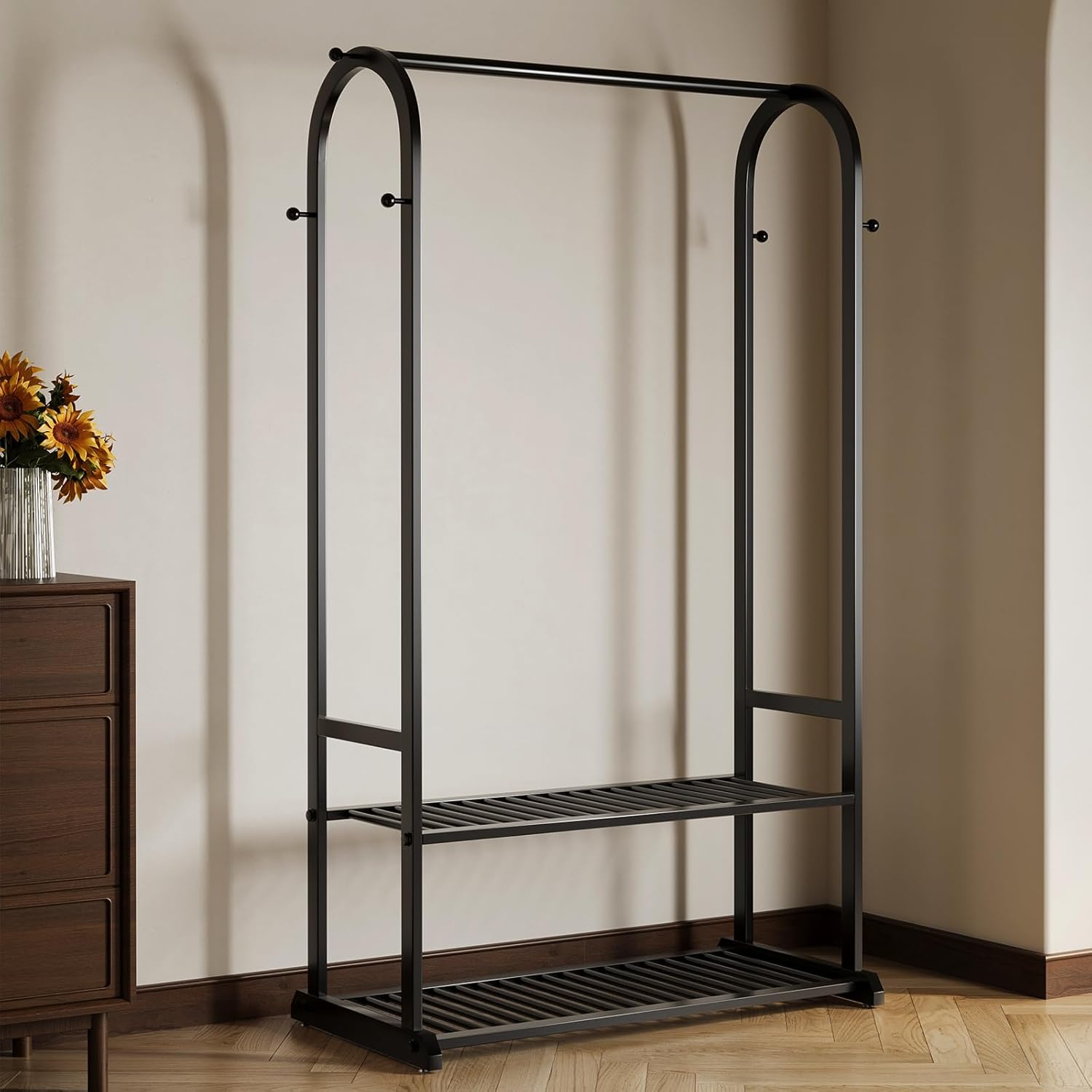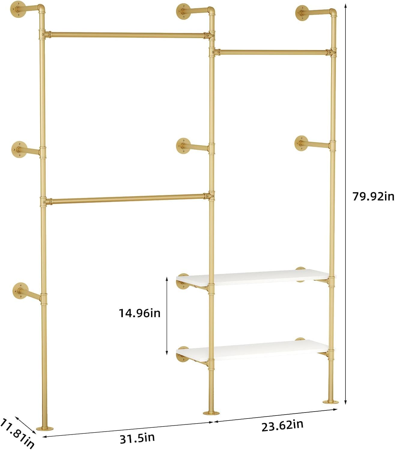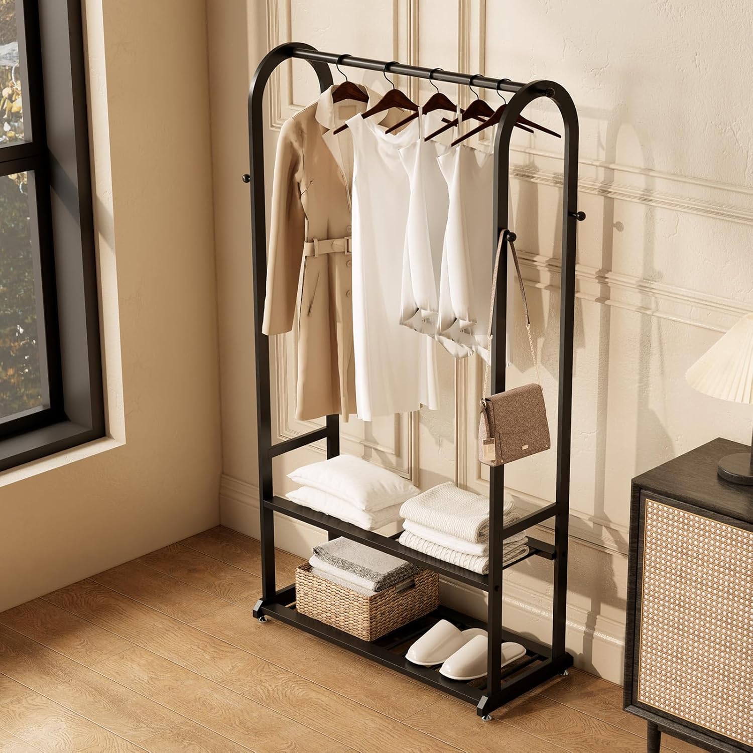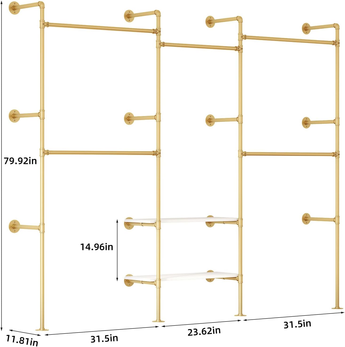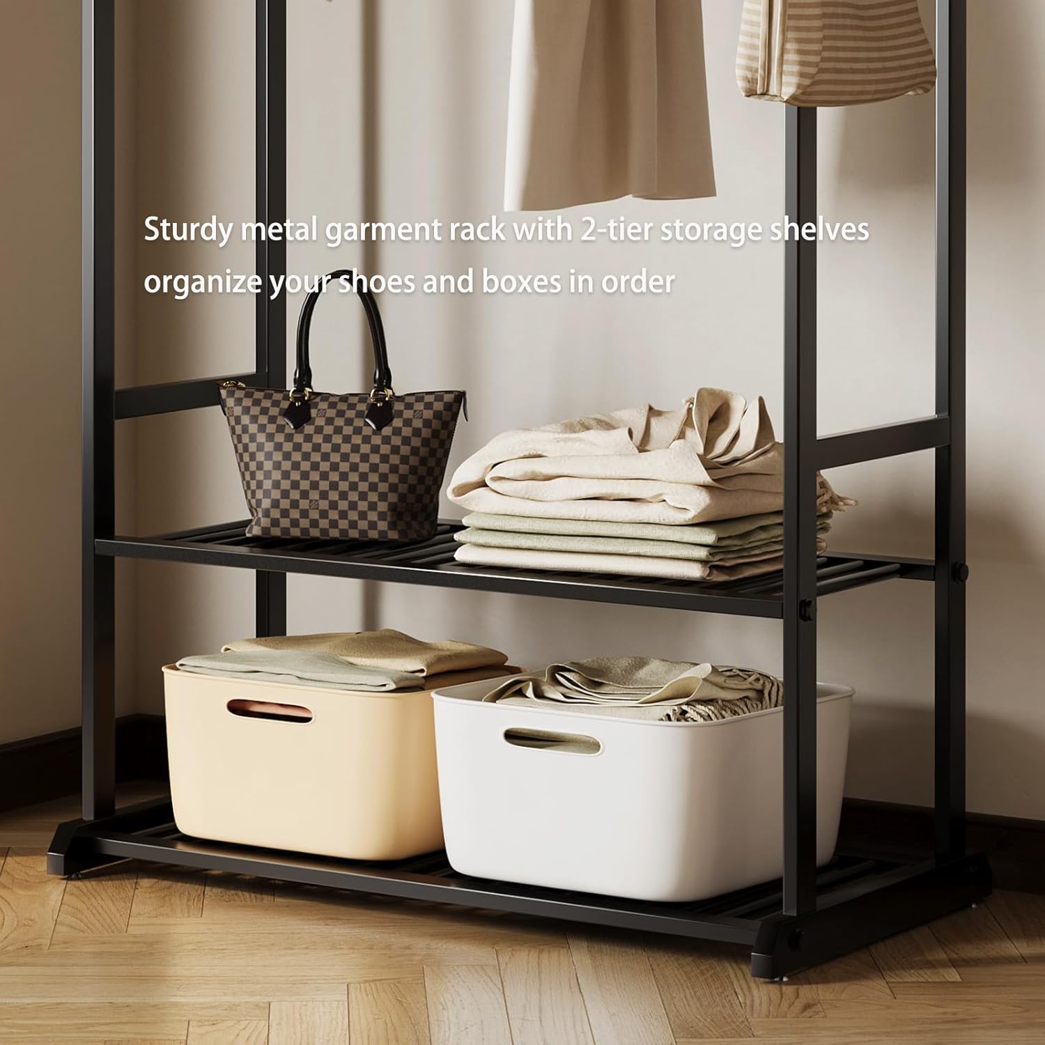 Sturdy heavy duty clothes rack,Gold clothing rack with bottom shelves and 6 side hooks,Metal garment rack for hanging clothes