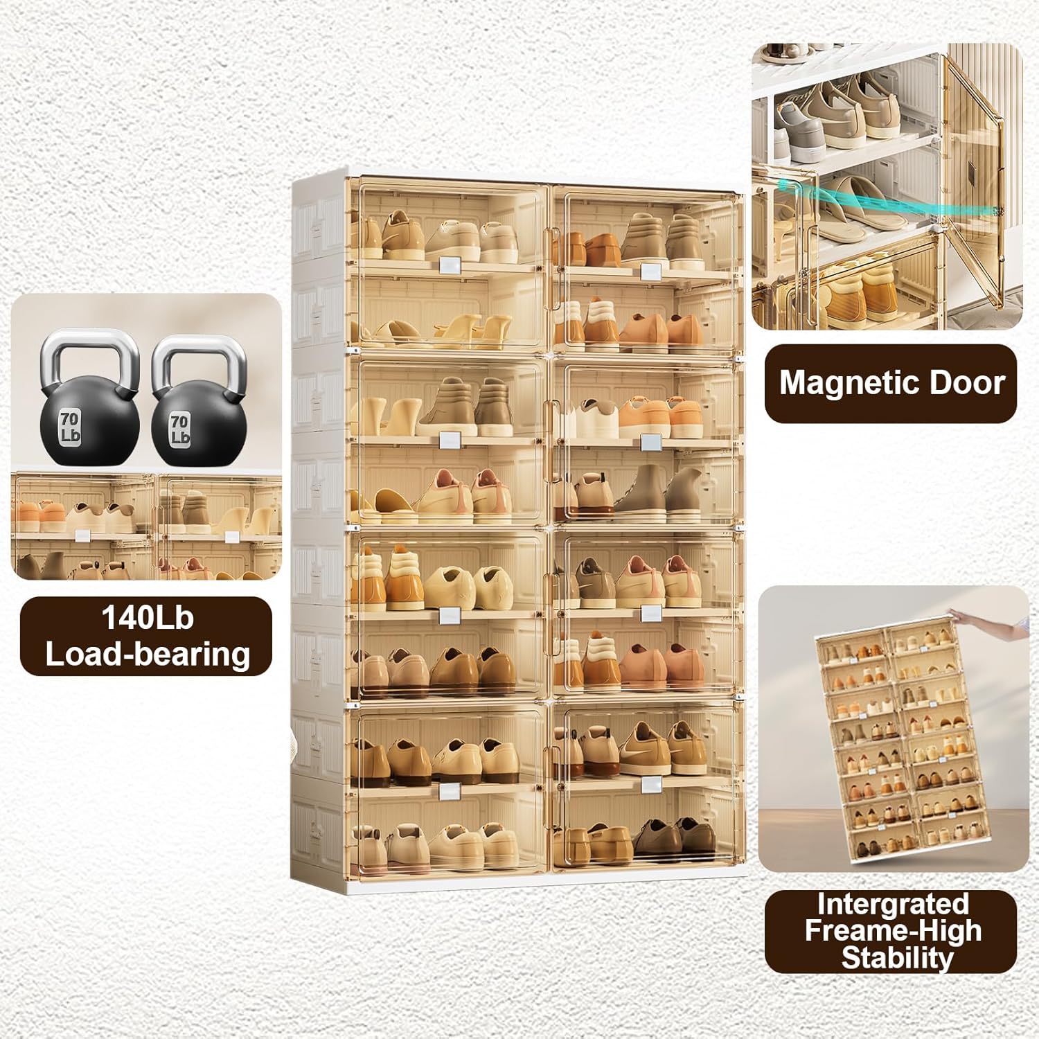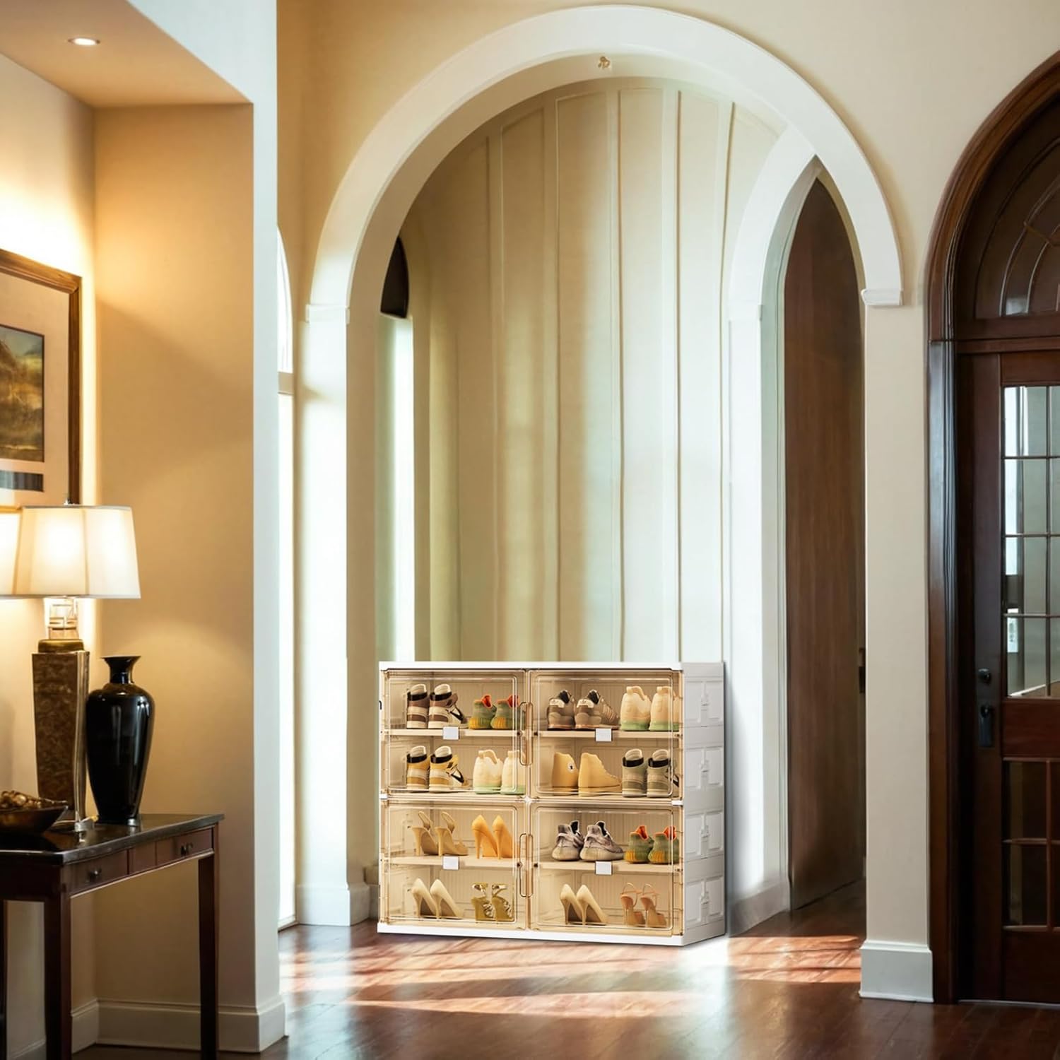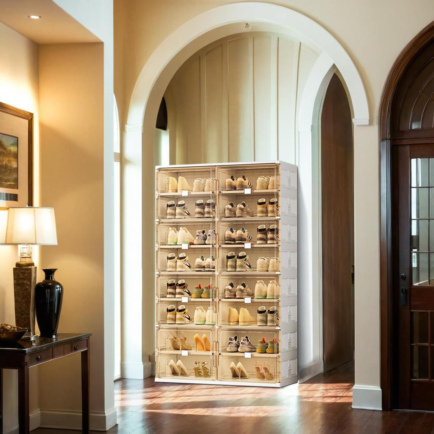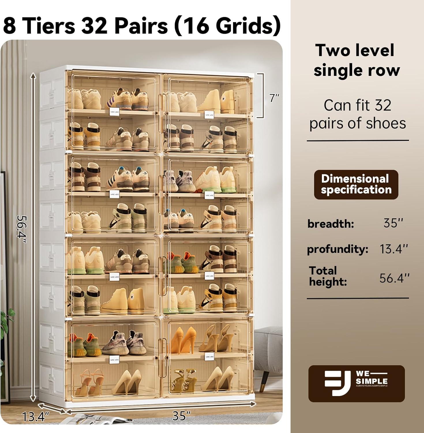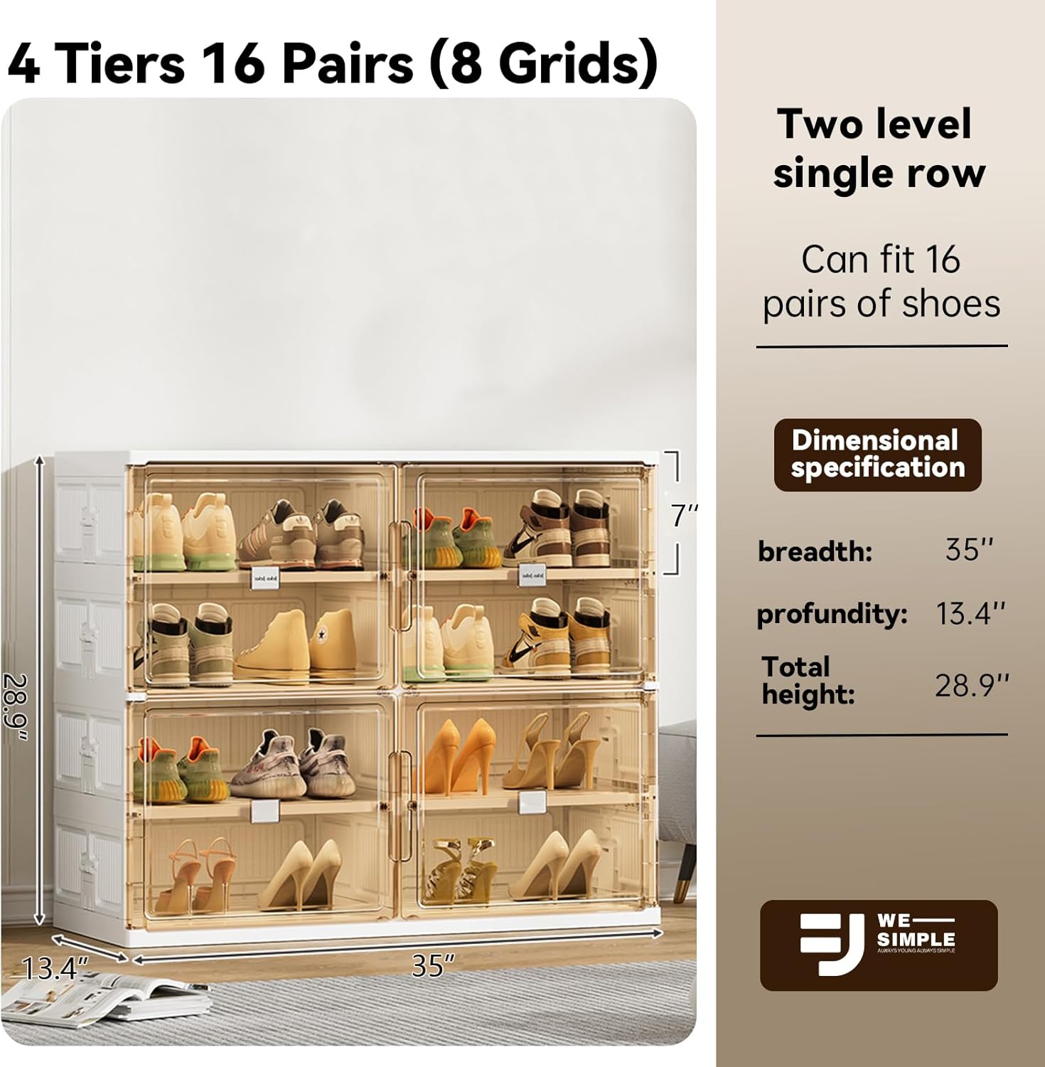 16 Pairs Shoes Storage Cabinet of 3-Step Fast Installation,Plastic Shoe Box with Clear Magnetic Door for Display, Shoe Organizer for Sneaker, Sandals, Heels (2 Row, 4 Tier)