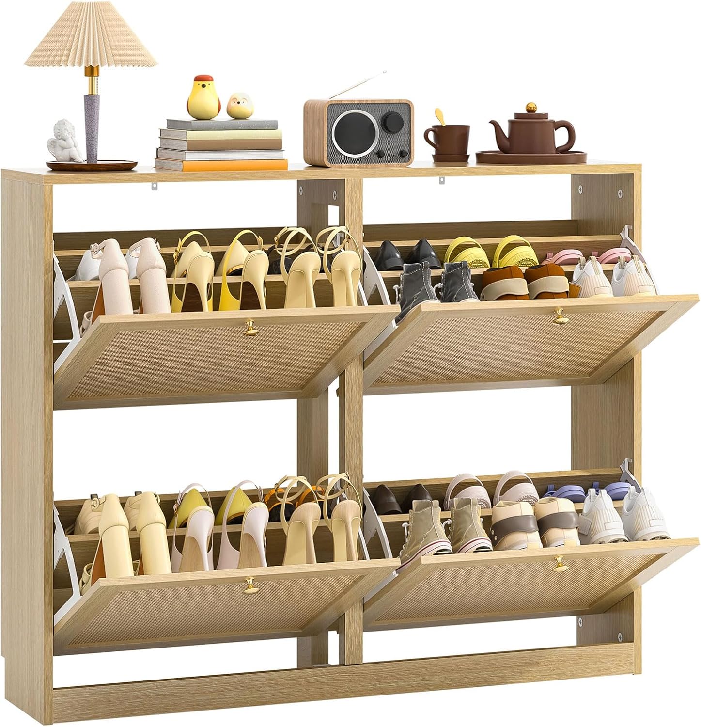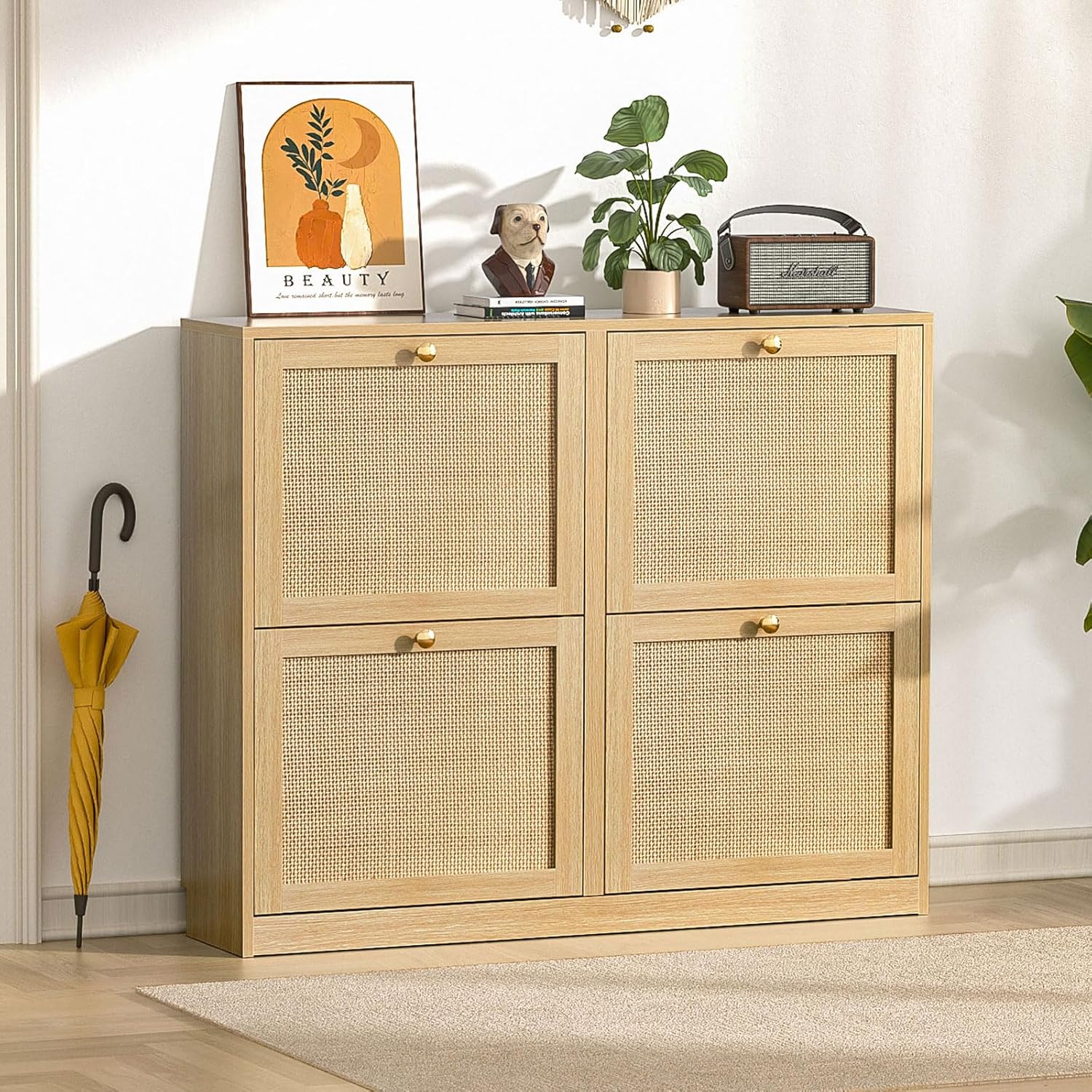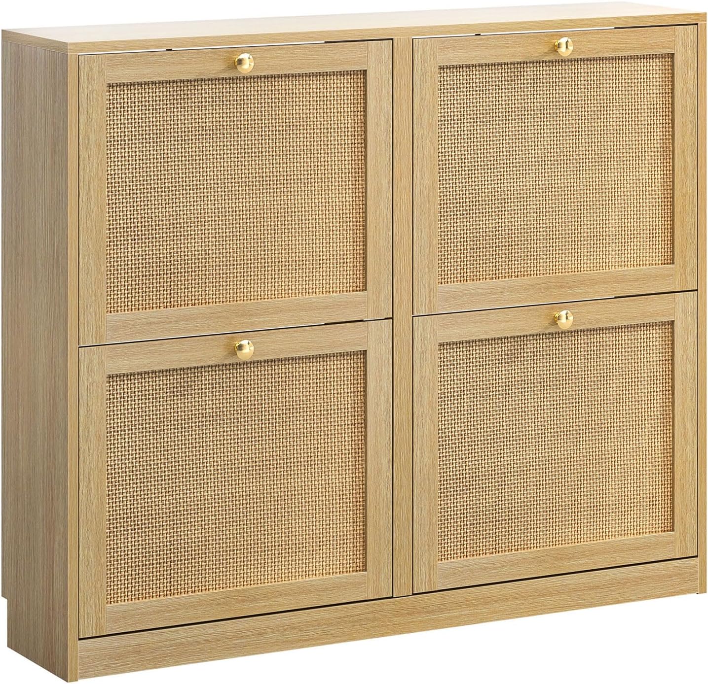 Rattan Shoe Cabinet Storage with 4 Flip Drawers, Slim Shoe Organizer with Adjustable Shelf, Freestanding Hidden Shoe Cabinet for Entryway Hallway, Wood Color