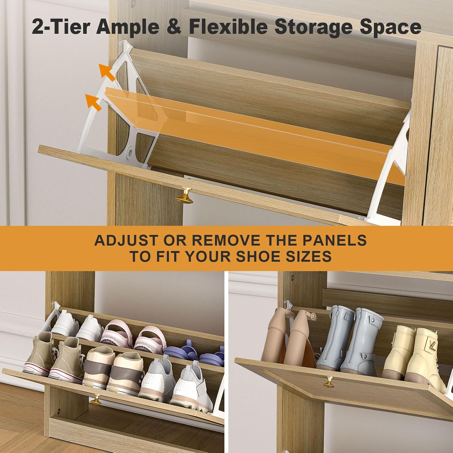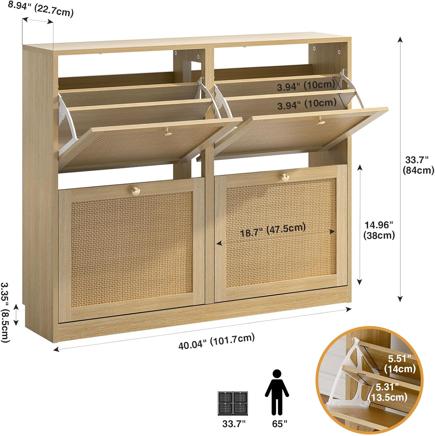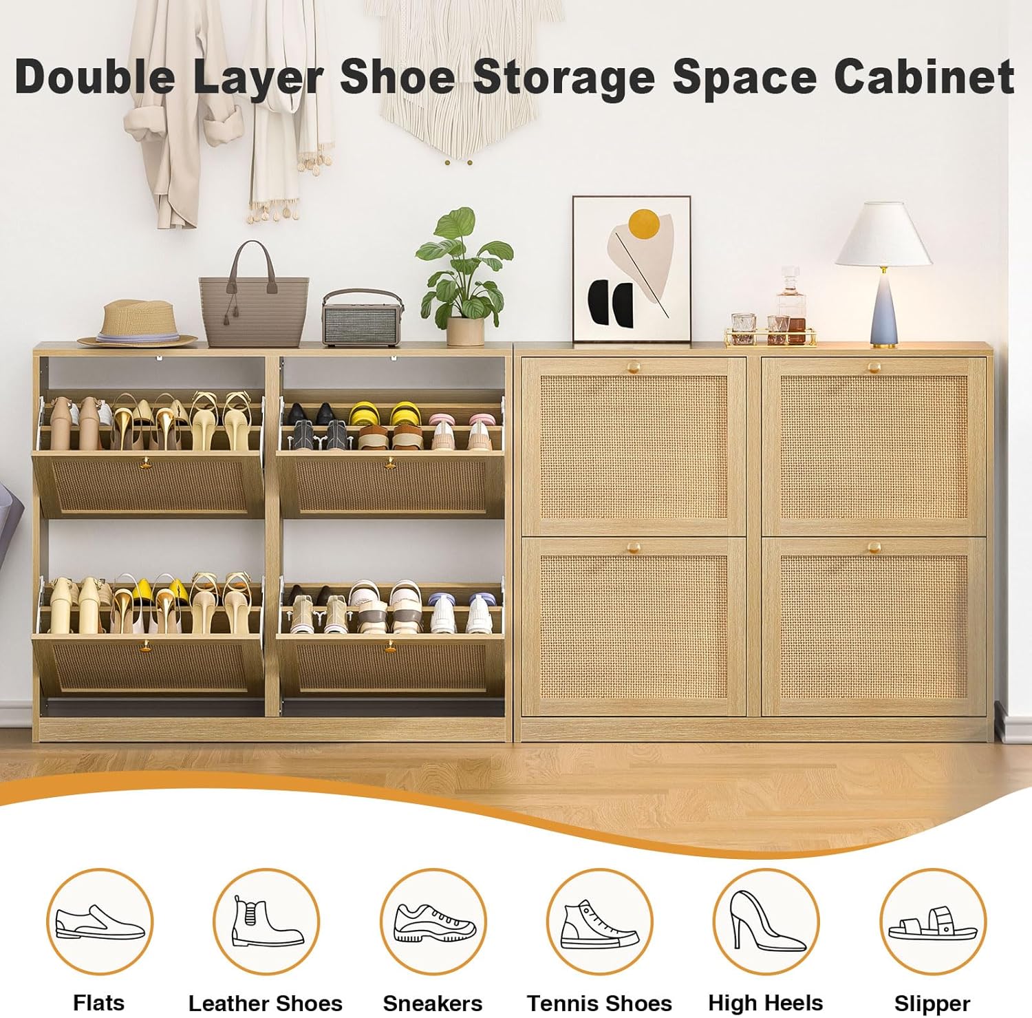 Rattan Shoe Cabinet Storage with 4 Flip Drawers, Slim Shoe Organizer with Adjustable Shelf, Freestanding Hidden Shoe Cabinet for Entryway Hallway, Wood Color