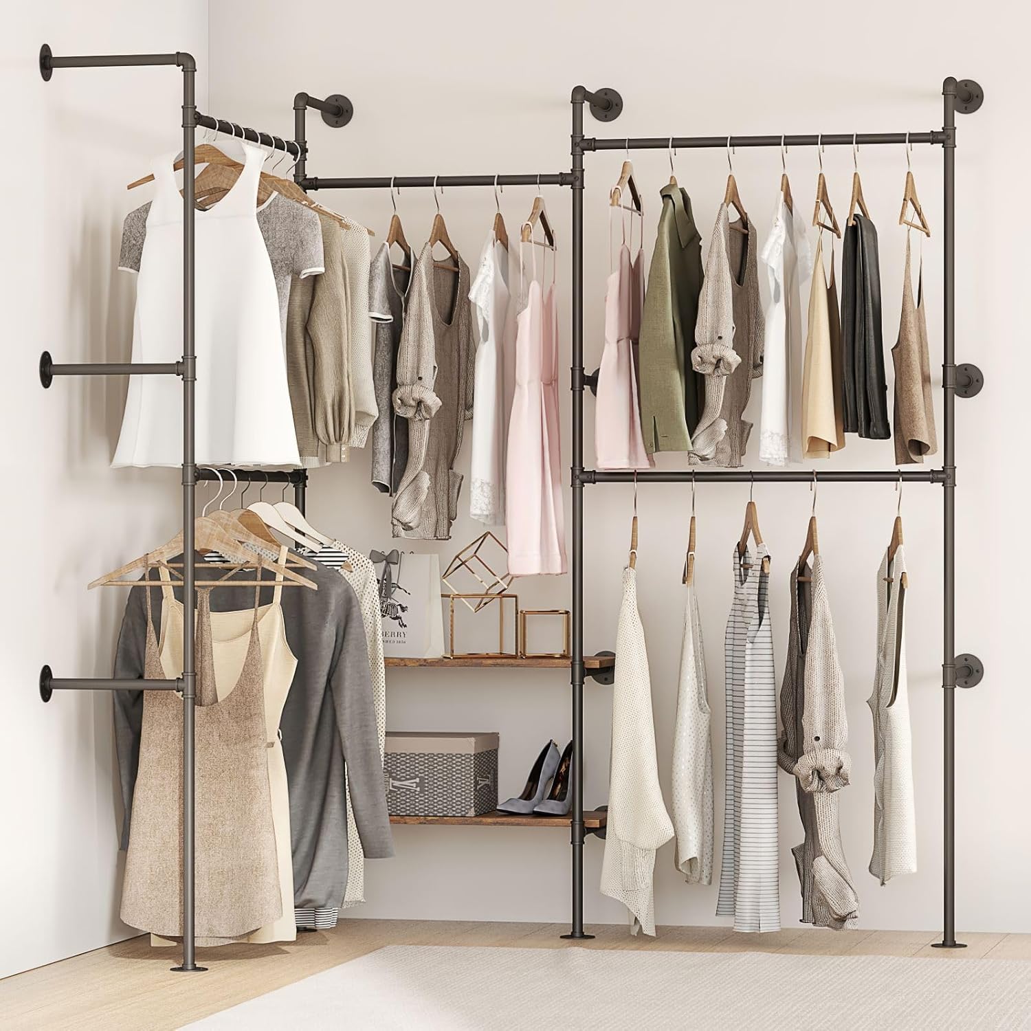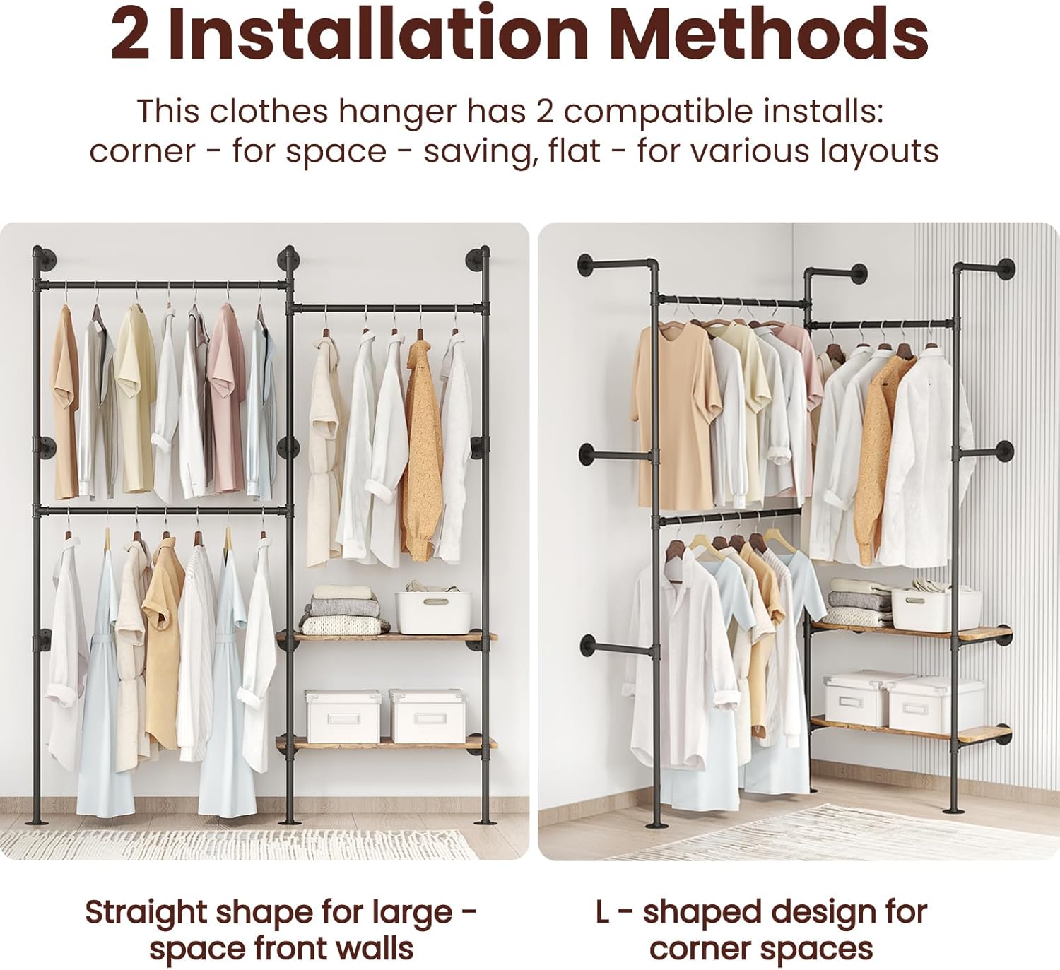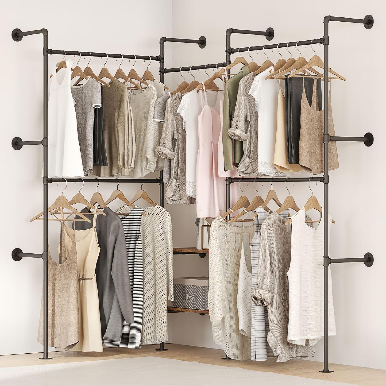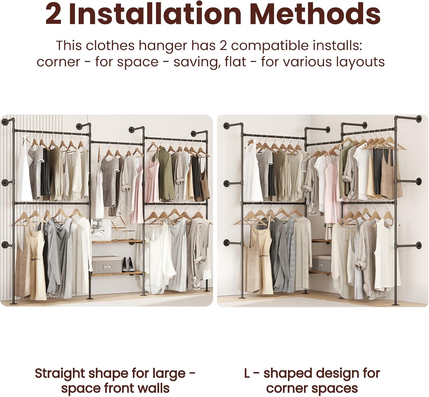 Industrial Pipe Clothes Rack,Wall Mounted Closet Wardrobe Rack, Corner L Shaped Walk-in Closet System, 2 Installation Methods (Black, 80" H x 86" W)
