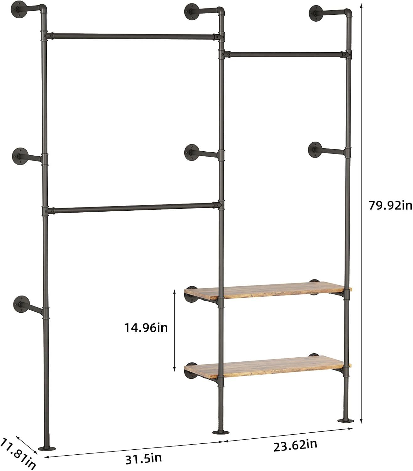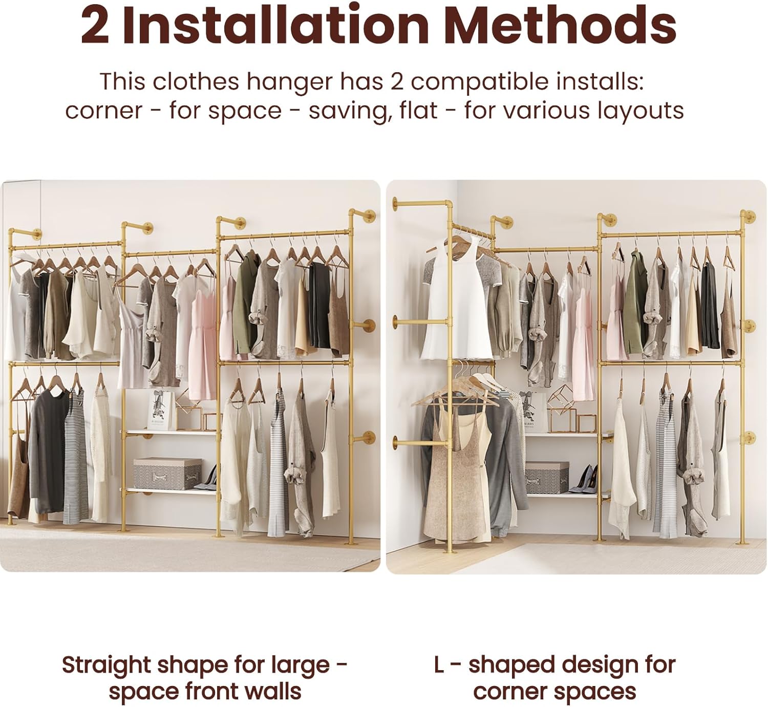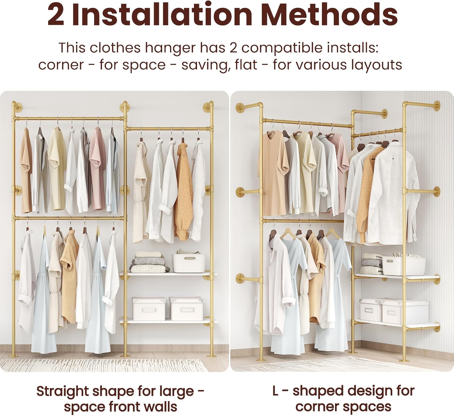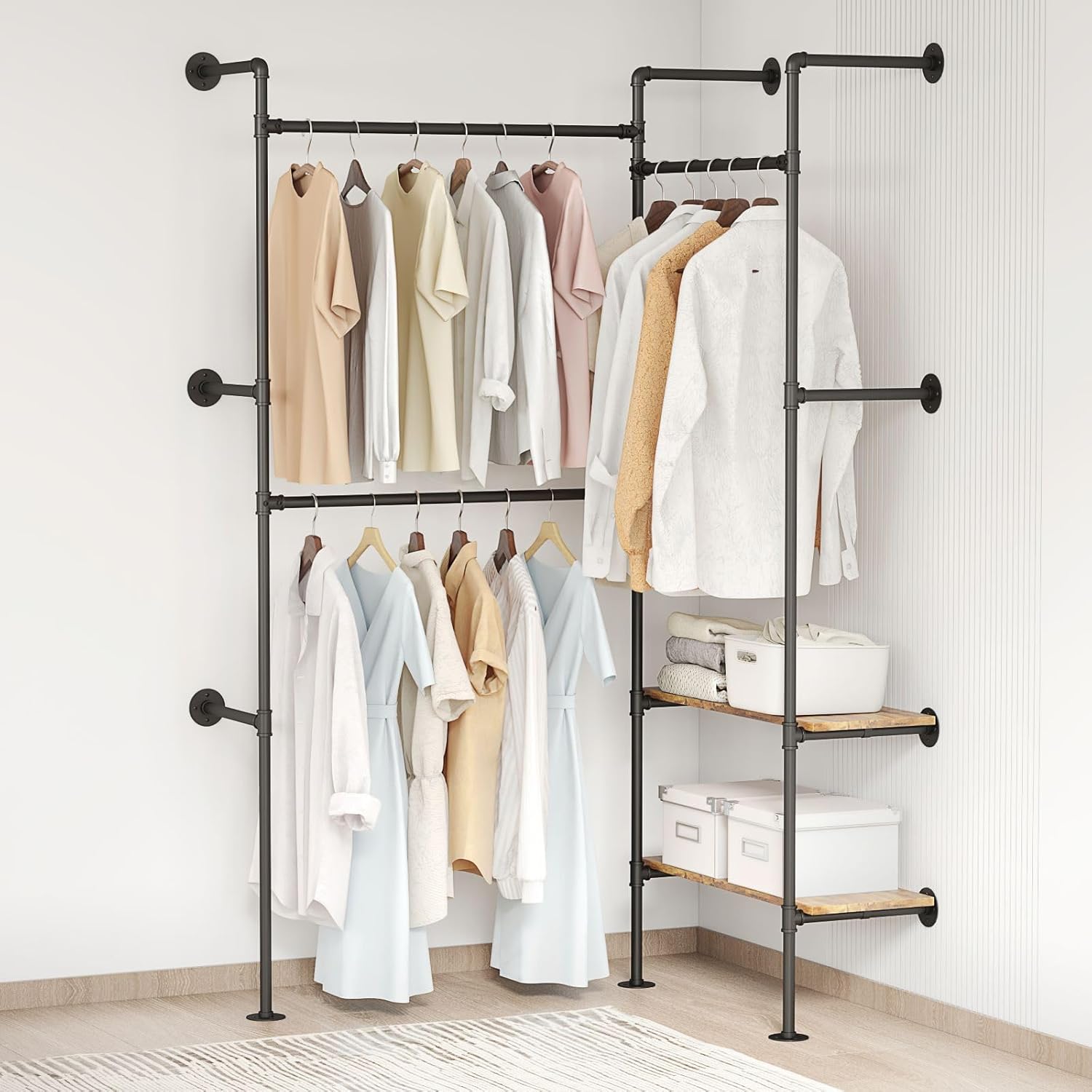 Industrial Pipe Clothes Rack,Wall Mounted Closet Wardrobe Rack, Corner L Shaped Walk-in Closet System, 2 Installation Methods (Black, 80" H x 86" W)