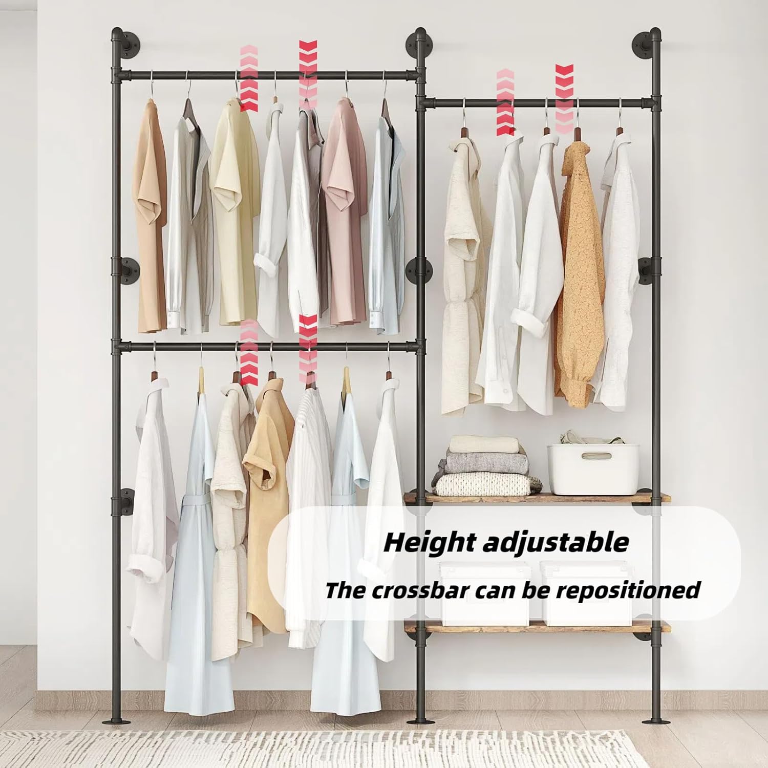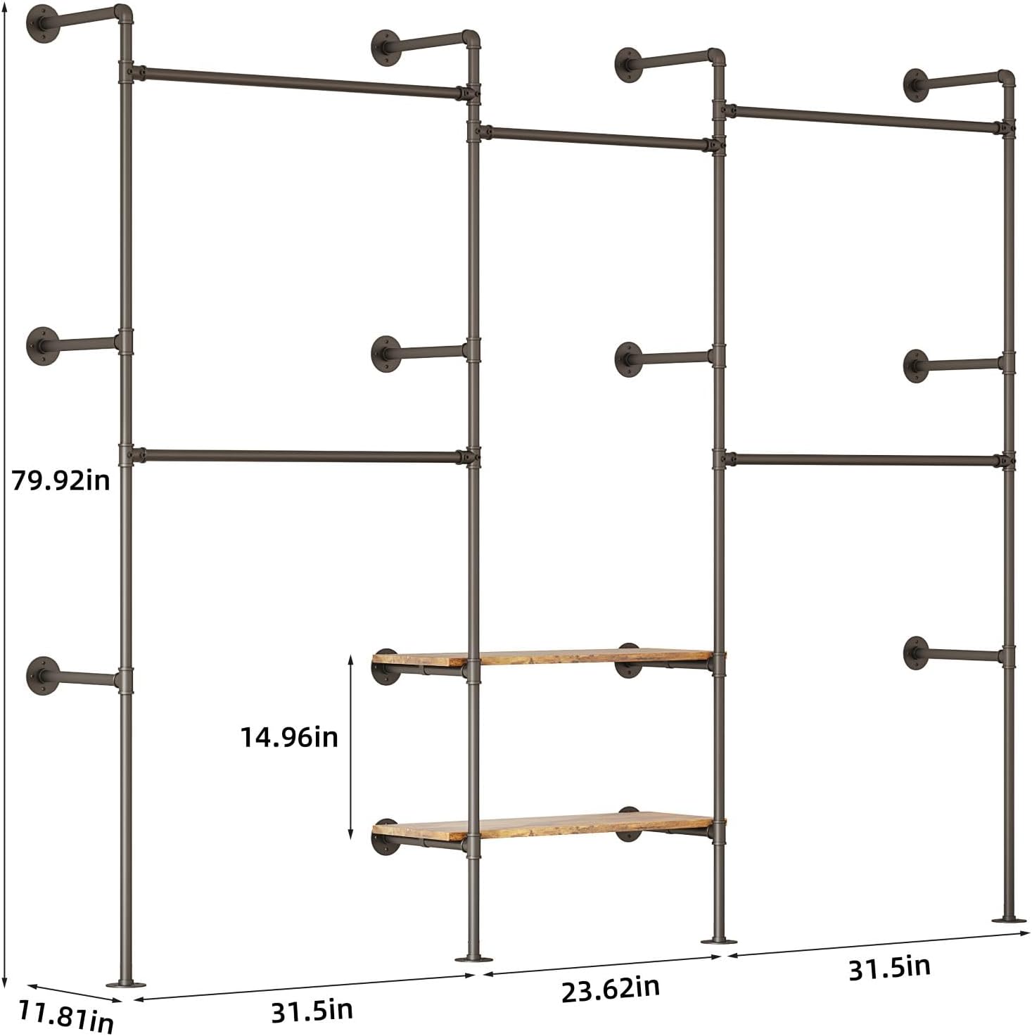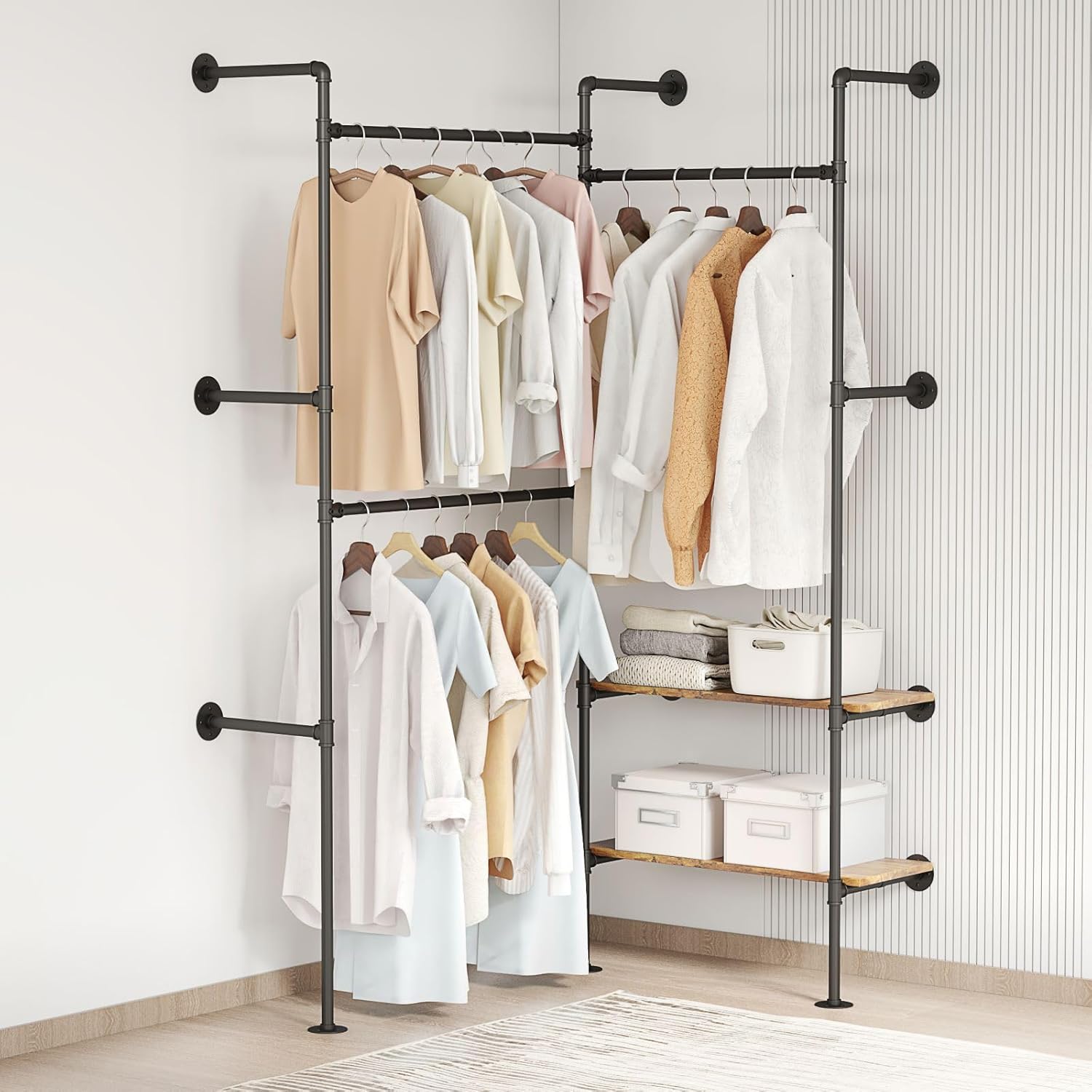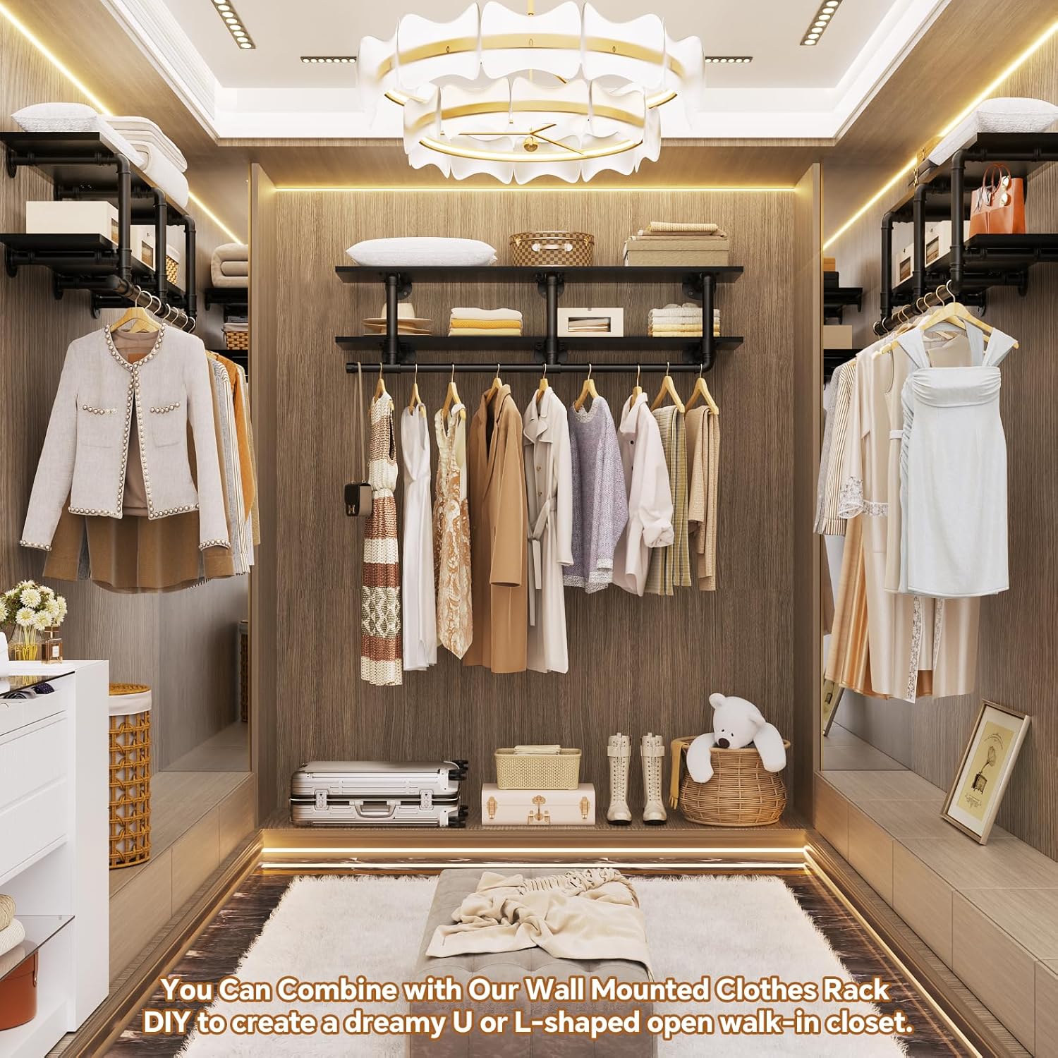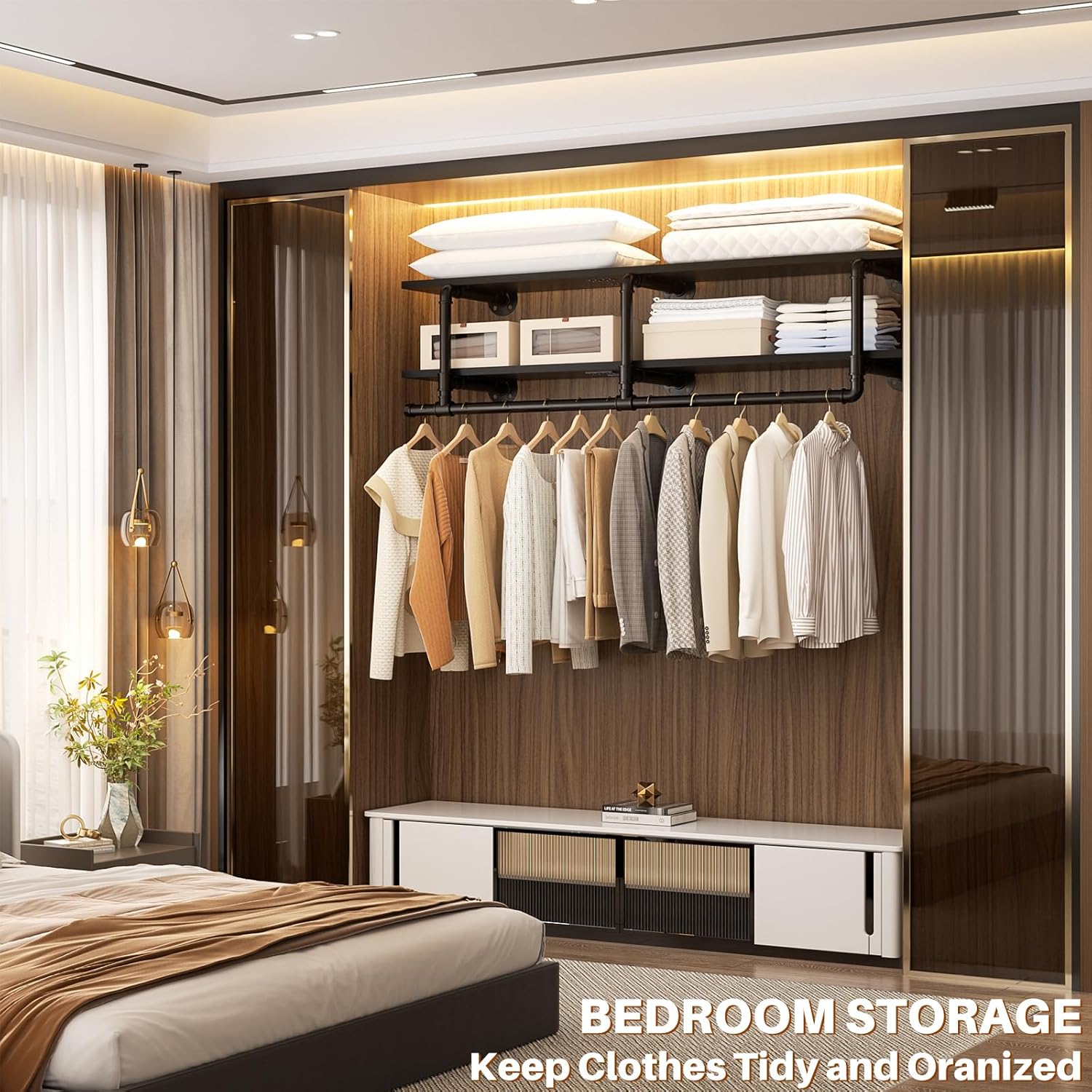Industrial Pipe Clothes Rack,Wall Mounted Closet Wardrobe Rack, Corner L Shaped Walk-in Closet System, 2 Installation Methods (Black, 80" H x 86" W)