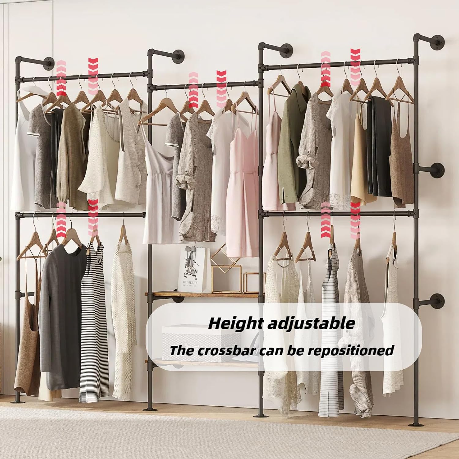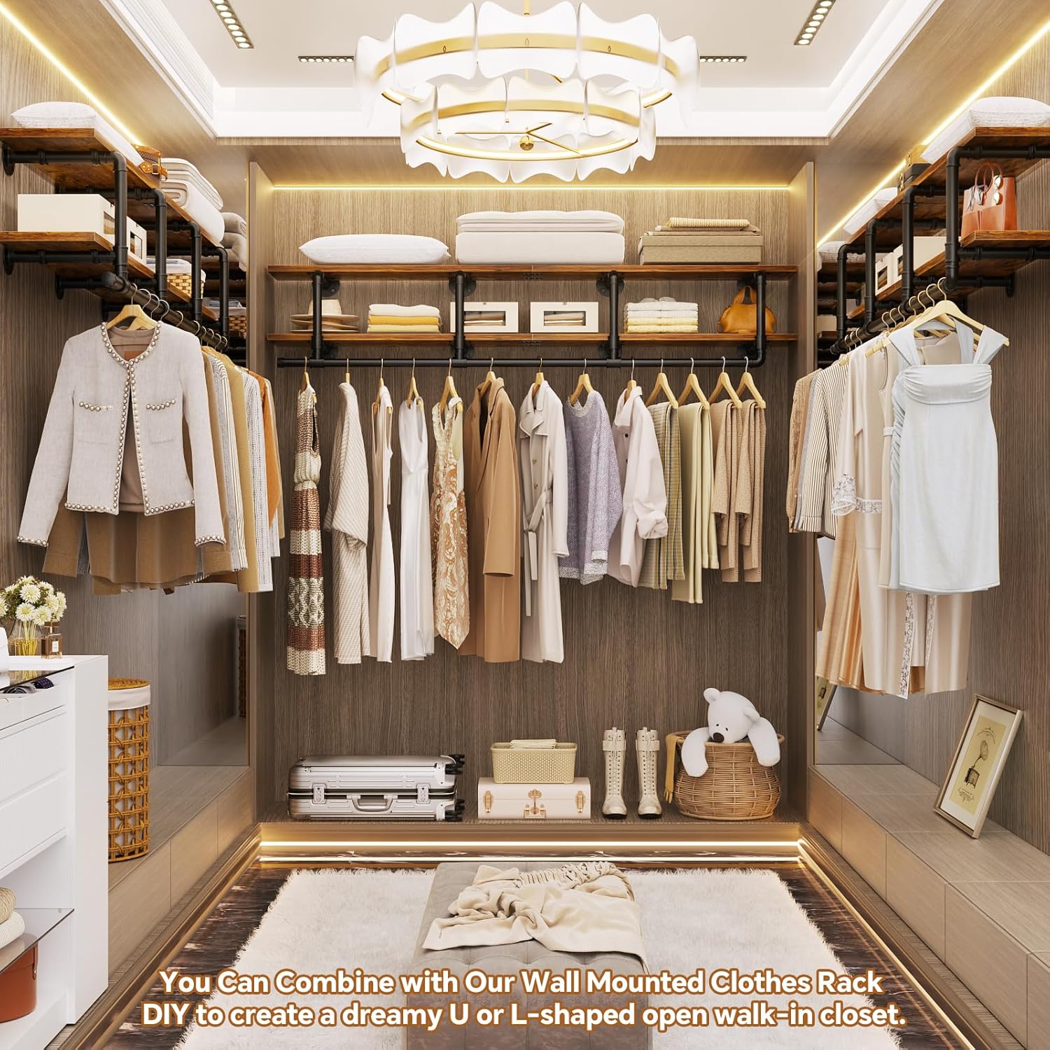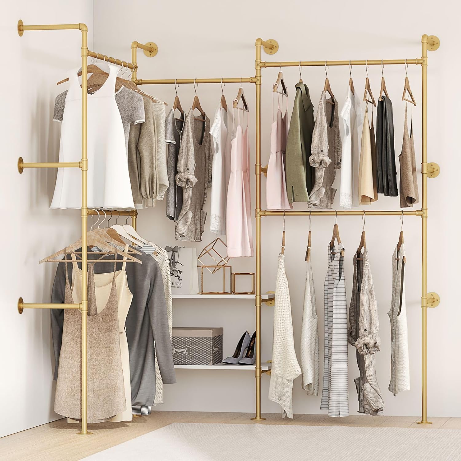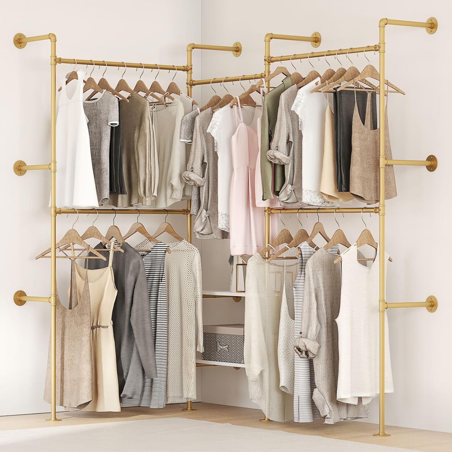 Industrial Pipe Clothes Rack,Wall Mounted Closet Wardrobe Rack, Corner L Shaped Walk-in Closet System, 2 Installation Methods (Black, 80" H x 86" W)