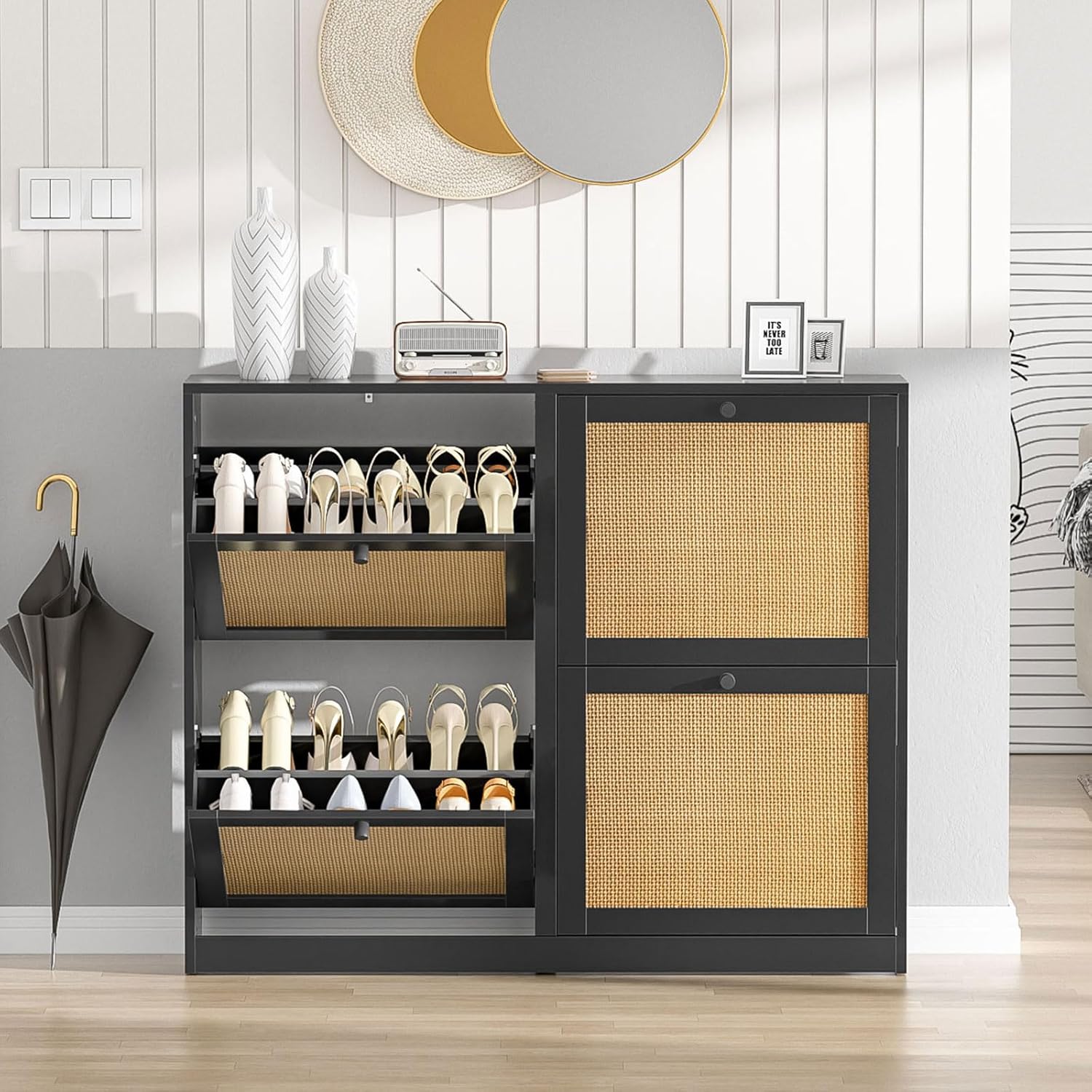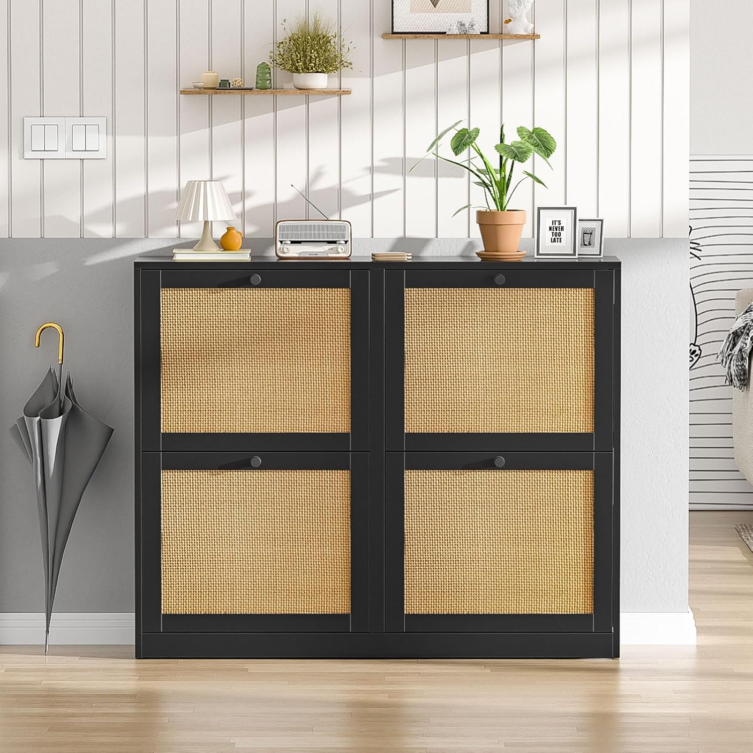Rattan Shoe Cabinet Storage with 4 Flip Drawers, Slim Shoe Organizer with Adjustable Shelf, Freestanding Hidden Shoe Cabinet for Entryway Hallway, Black