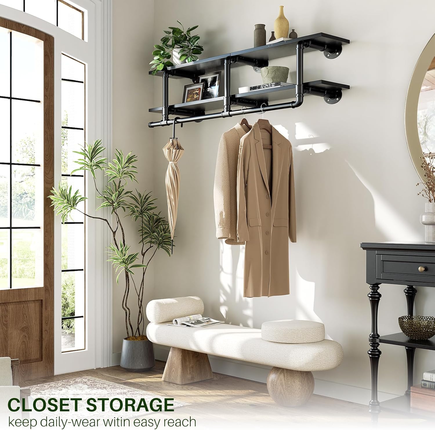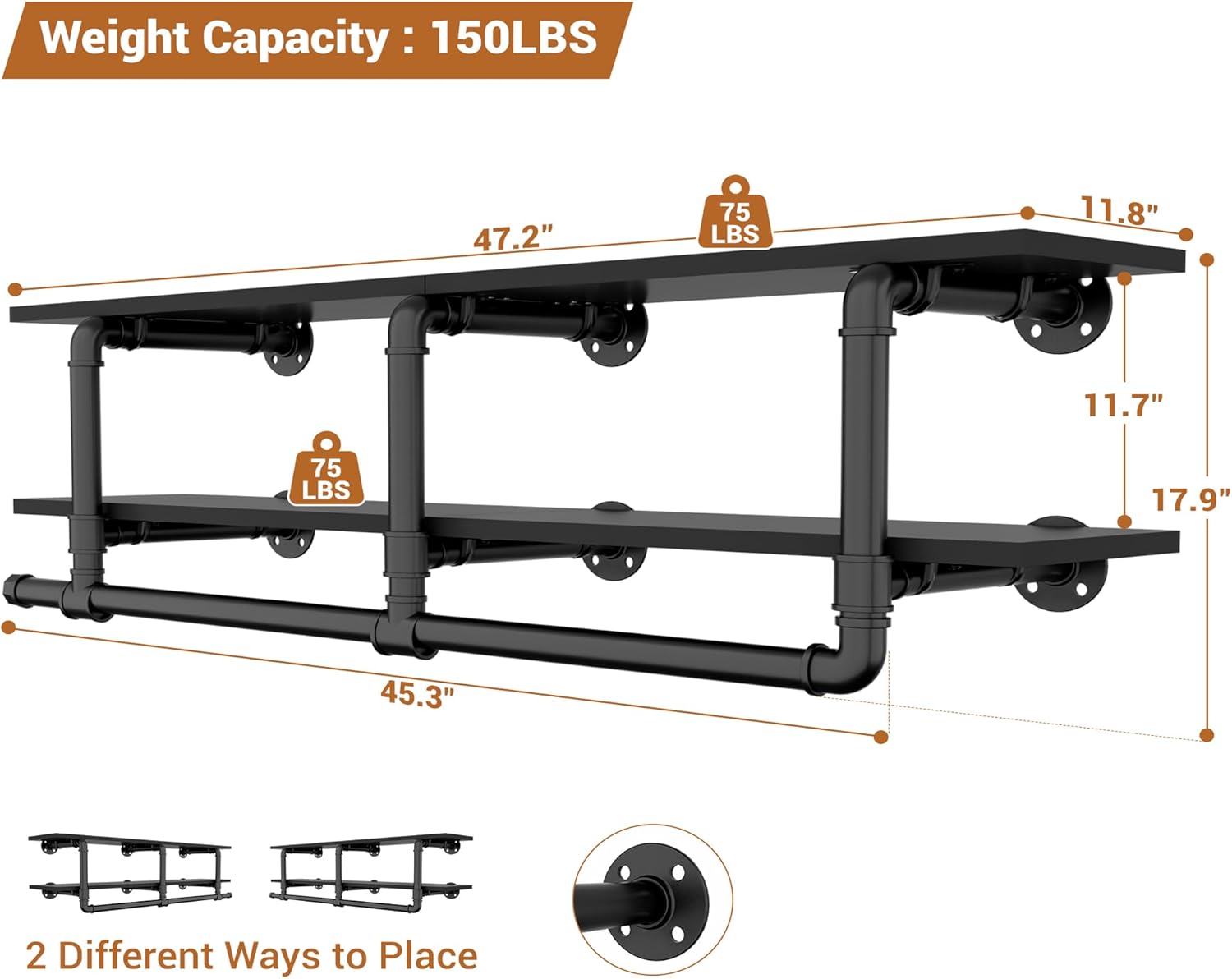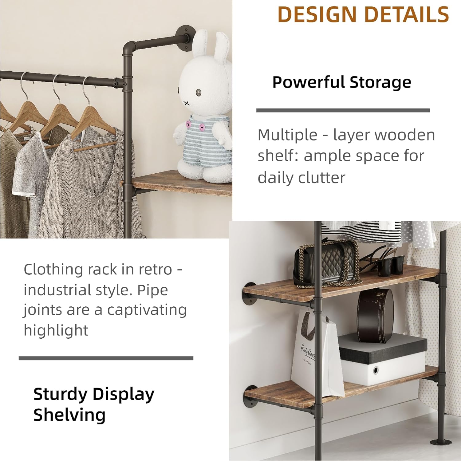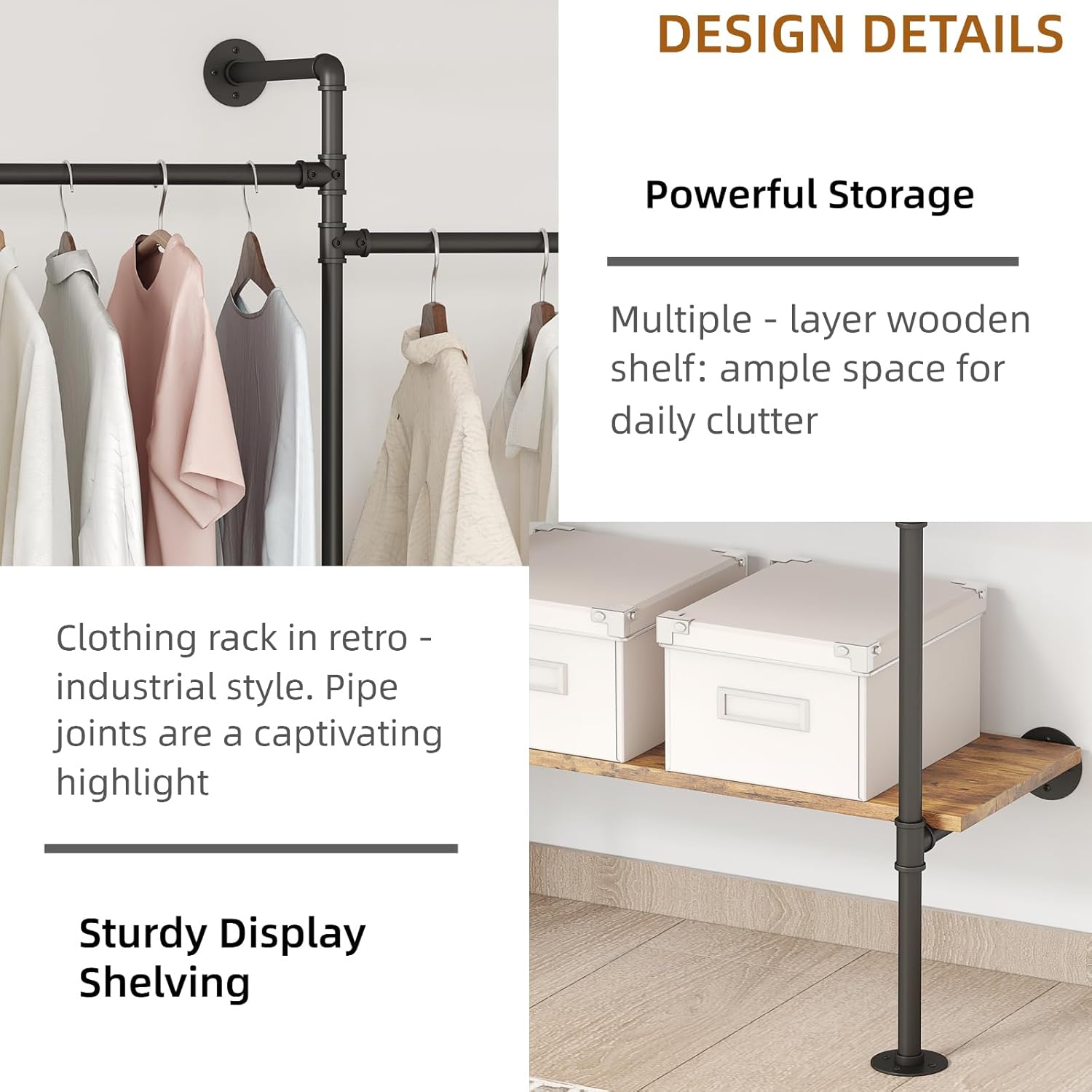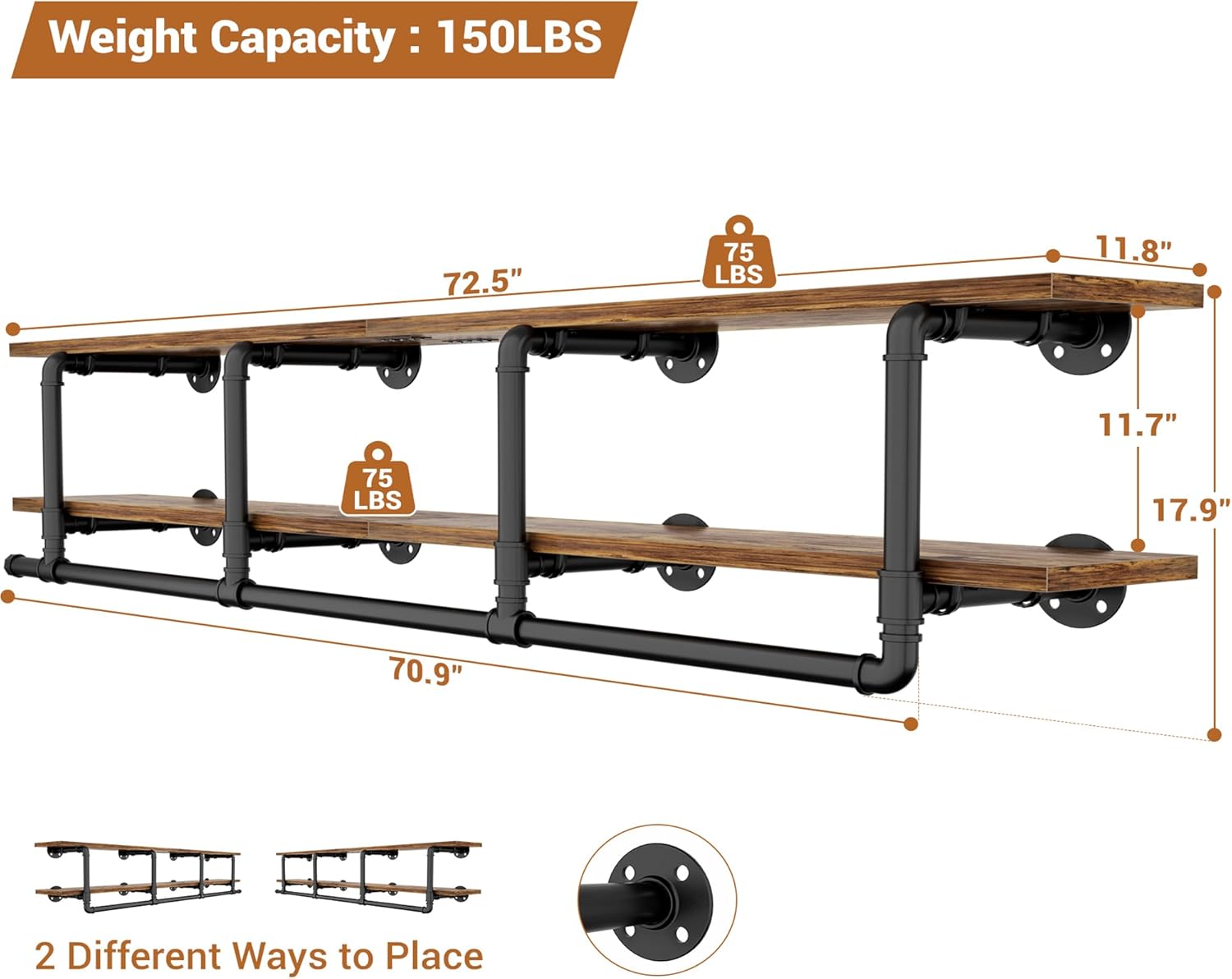 Aheaplus Industrial Pipe Clothes Rack with Top Shelf, 73In Space-Saving Wall Mounted Clothing Rack, 2 Tiers Heavy Duty Pipe Clothing Shelves with Hanging Rod for Laundry Room, Closet, Rustic Brown