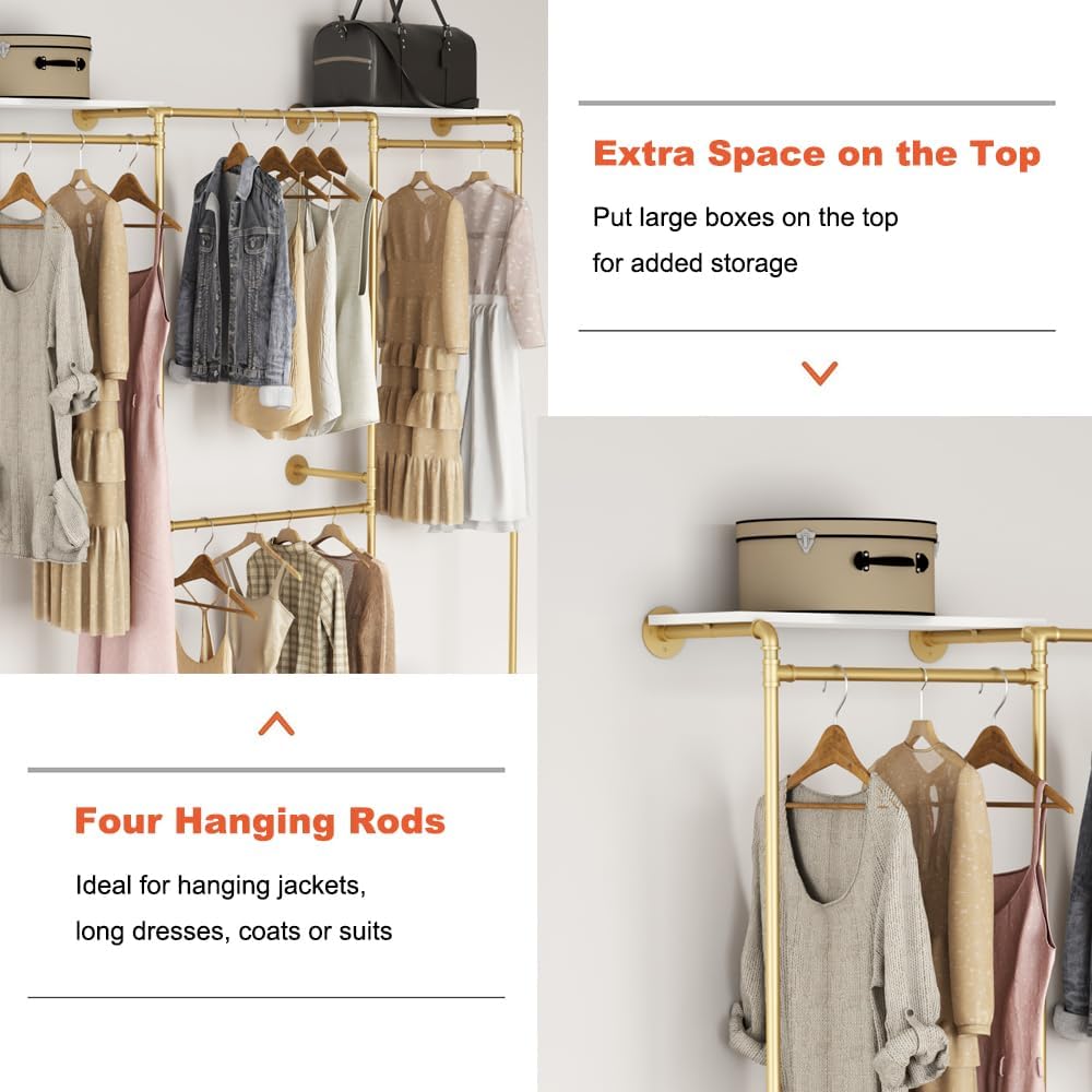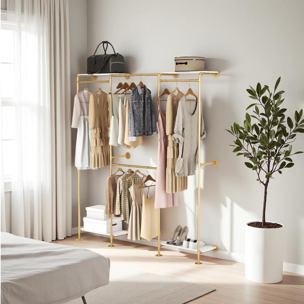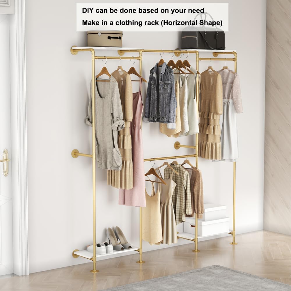 Sturdy heavy duty clothes rack,gold clothing rack with bottom shelves and 6 side hooks,Metal garment rack for hanging clothes for Bedroom