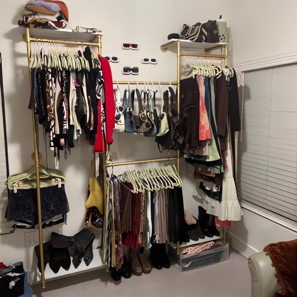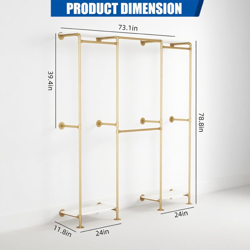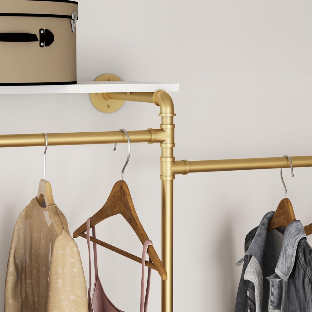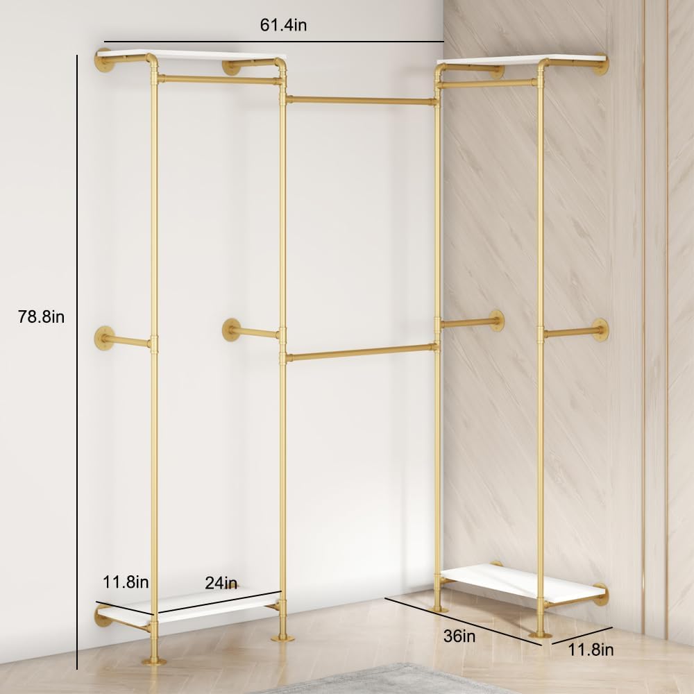 Sturdy heavy duty clothes rack,gold clothing rack with bottom shelves and 6 side hooks,Metal garment rack for hanging clothes for Bedroom