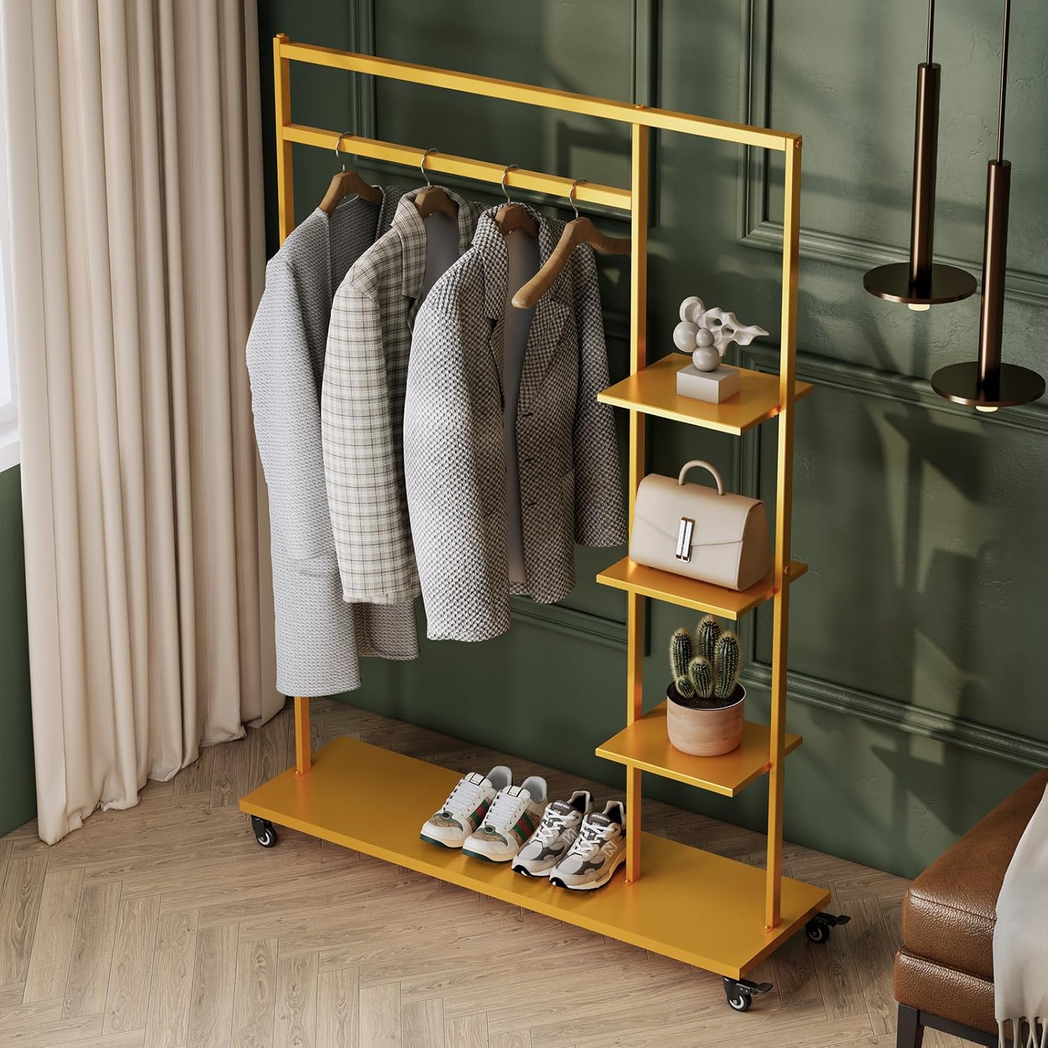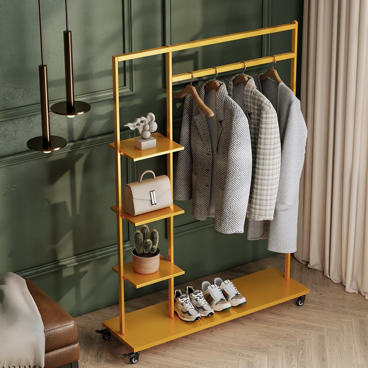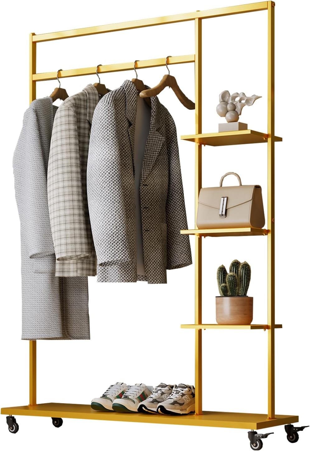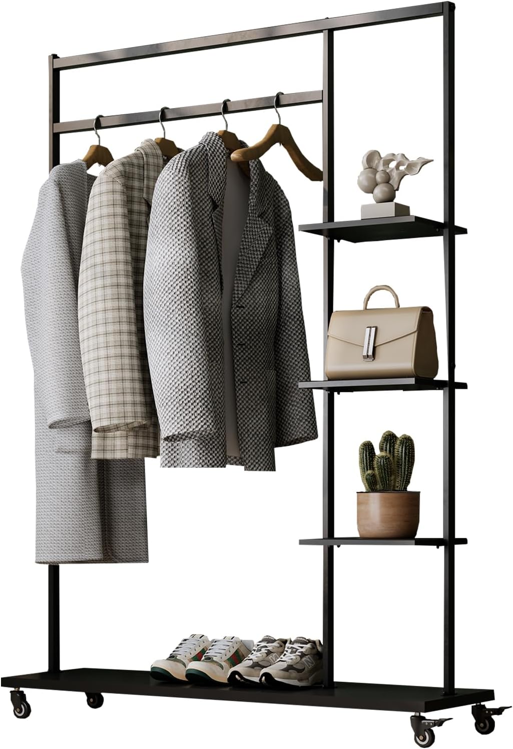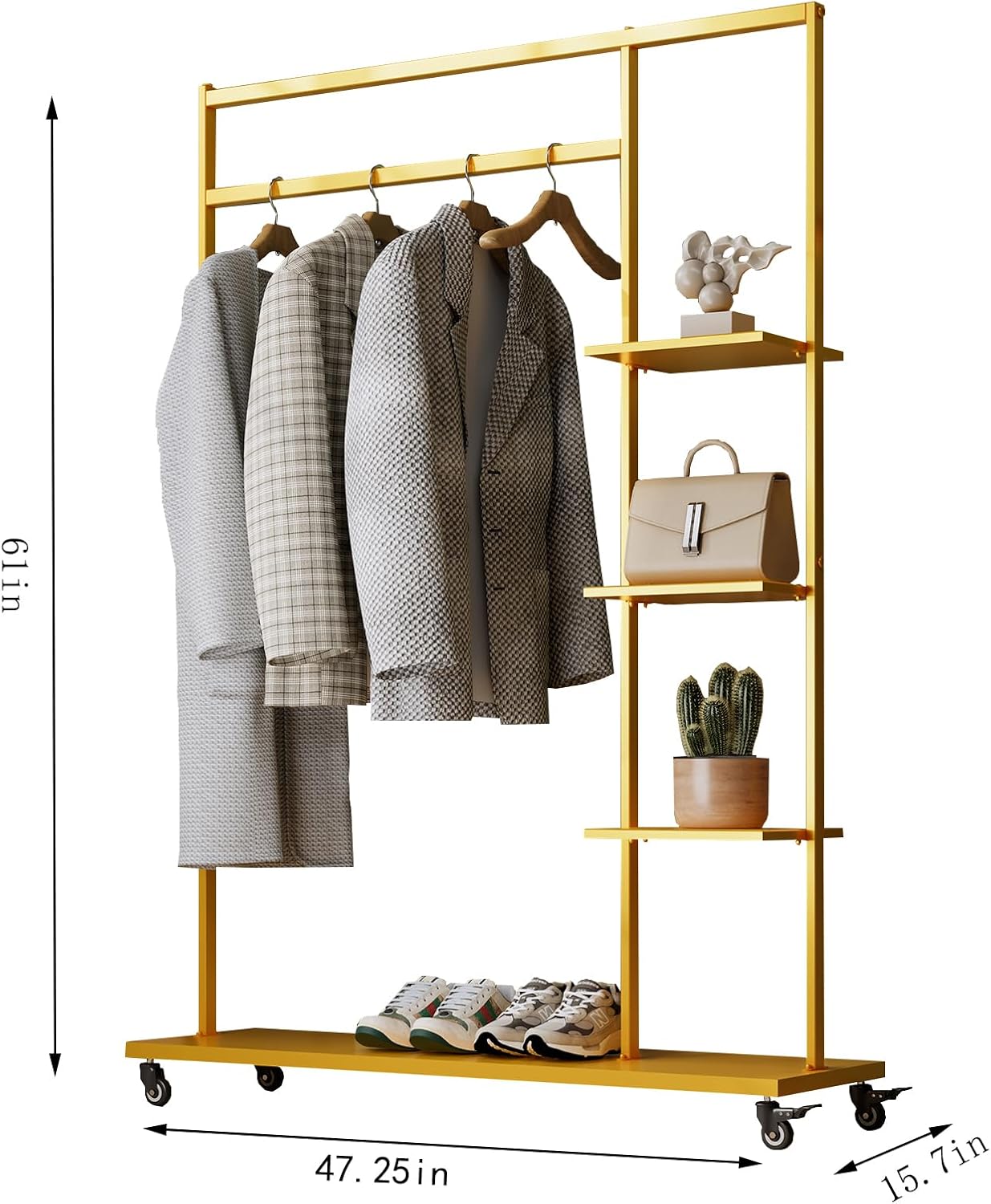 Clothing rack with shelves,Heavy Duty clothes rack with wheels,Rolling Garment Rack for hanging clothes with 4 flank Shelves,Metal Closets wardrobe rack for Bedroom/Boutique/Cloakroom