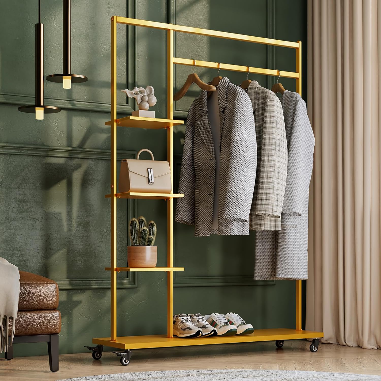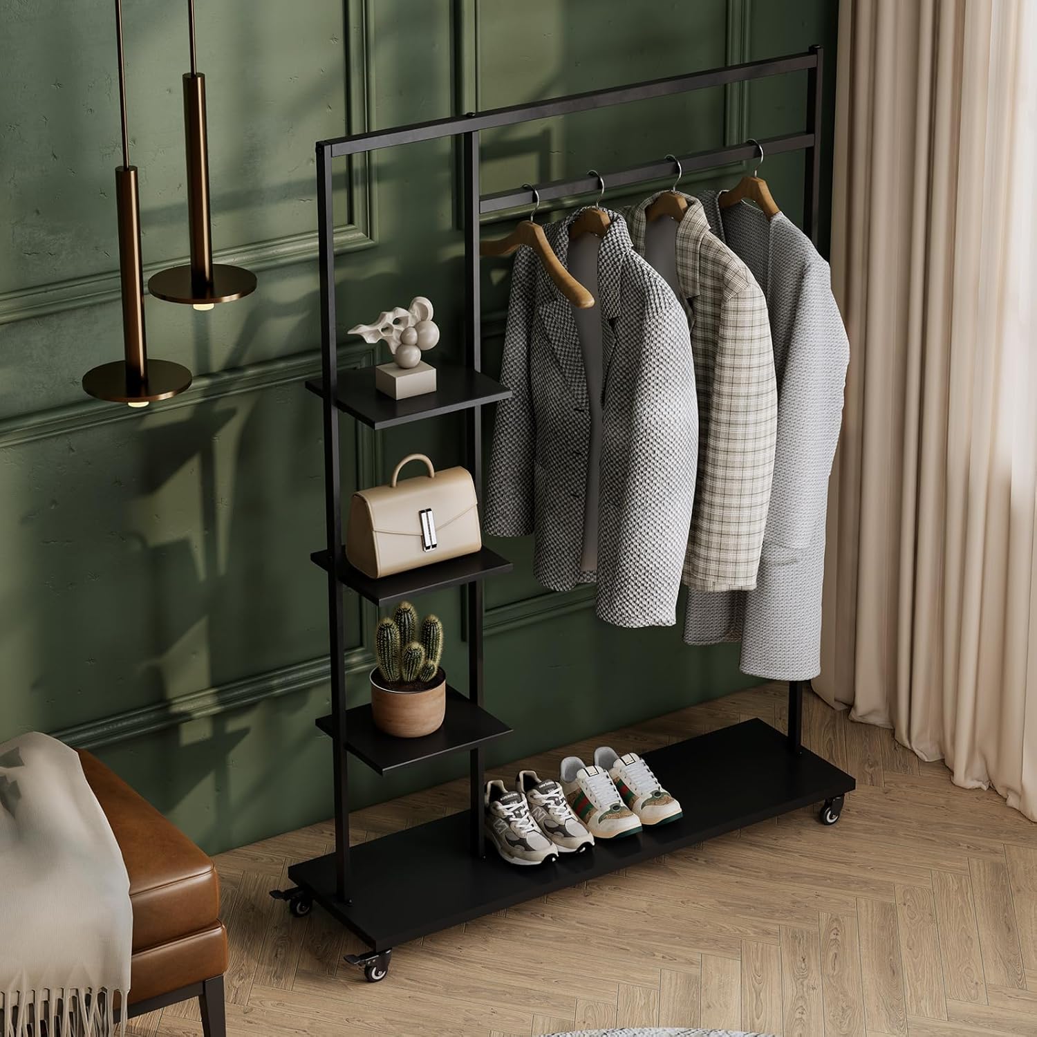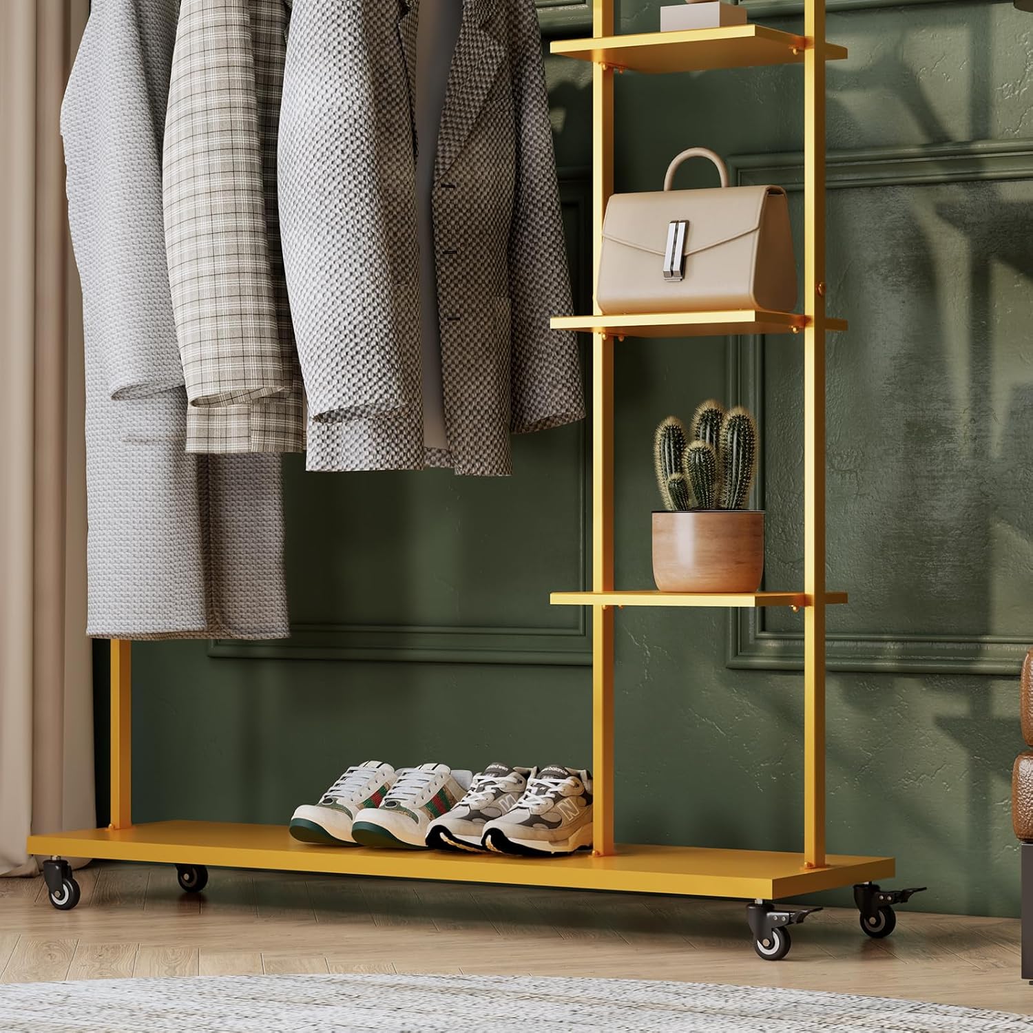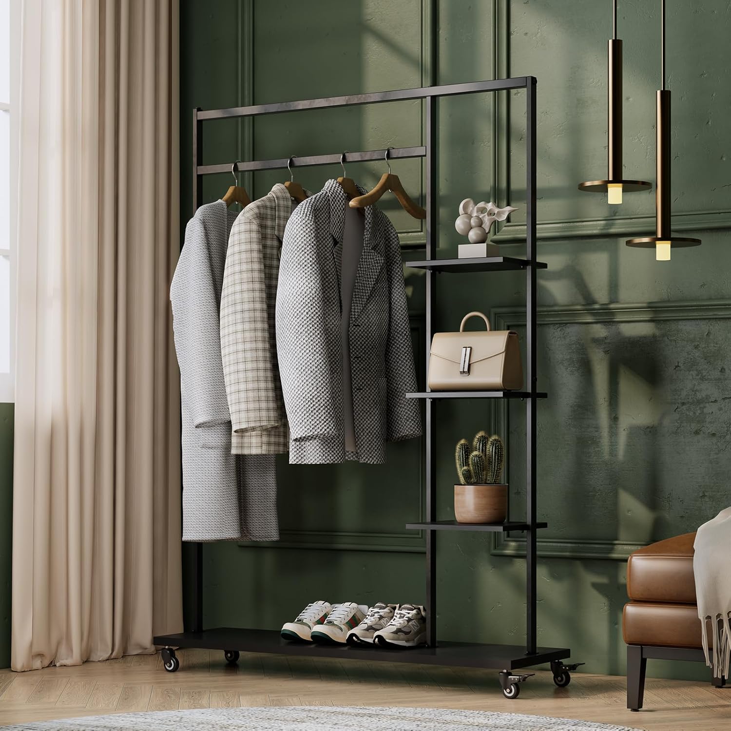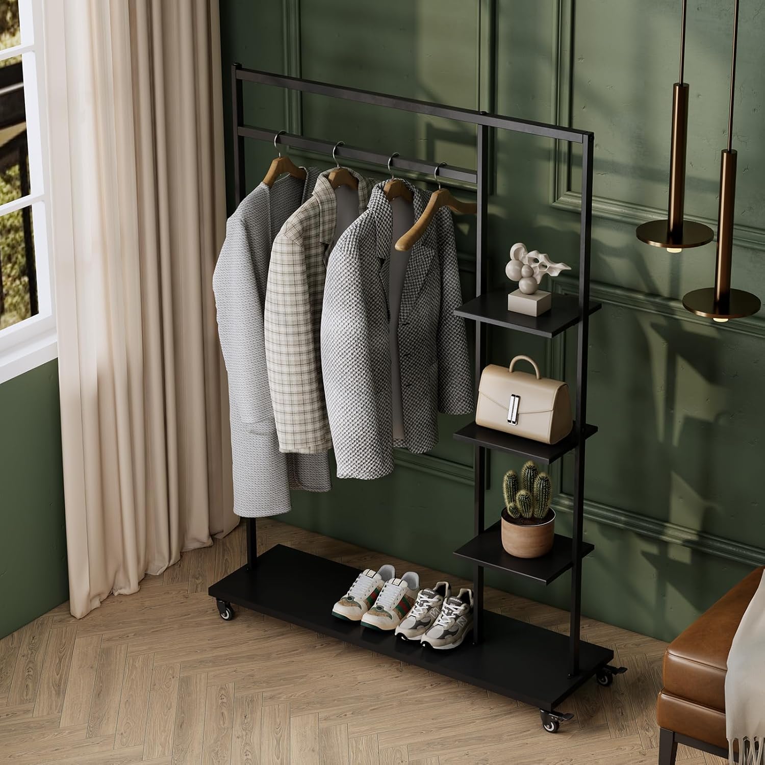 Clothing rack with shelves,Heavy Duty clothes rack with wheels,Rolling Garment Rack for hanging clothes with 4 flank Shelves,Metal Closets wardrobe rack for Bedroom/Boutique/Cloakroom
