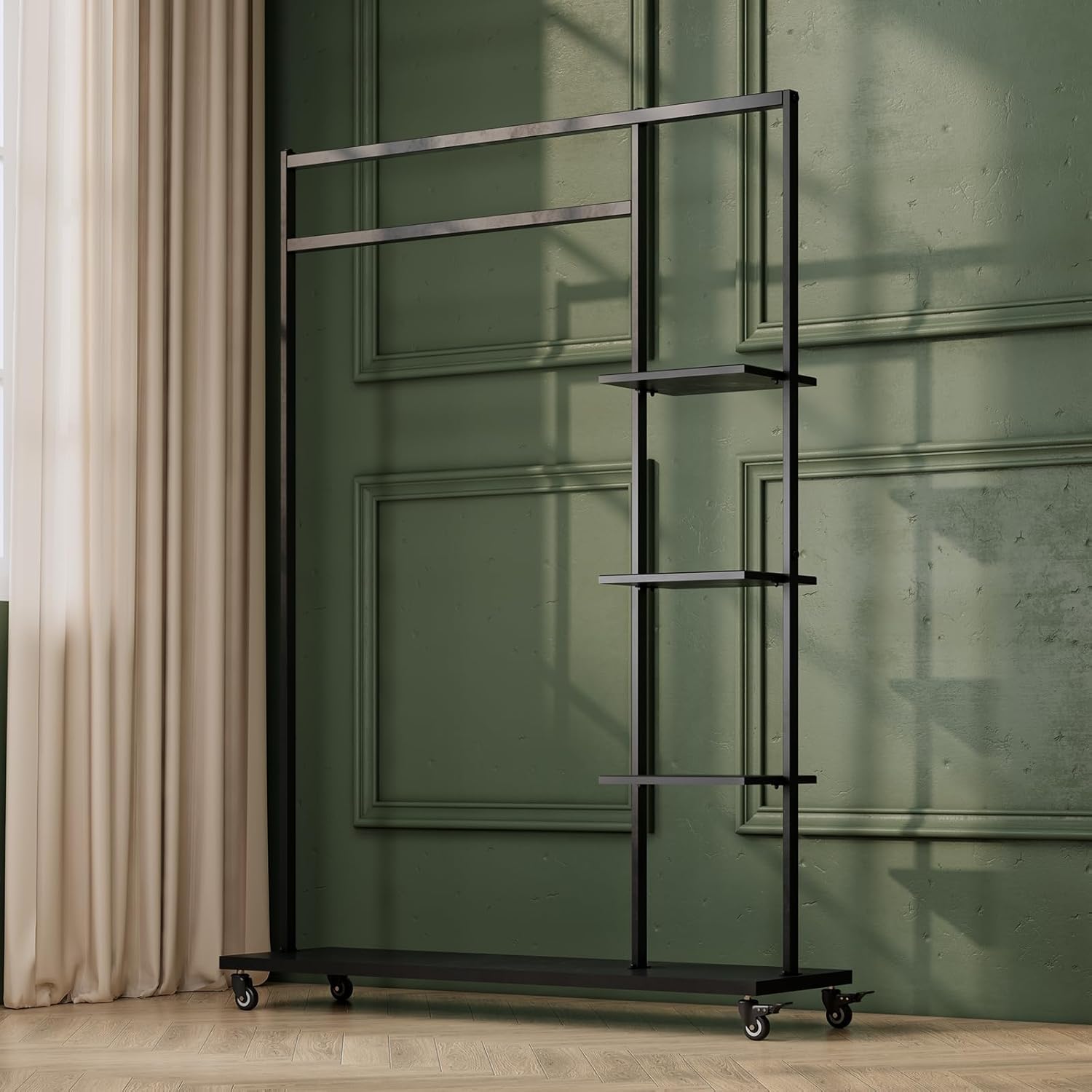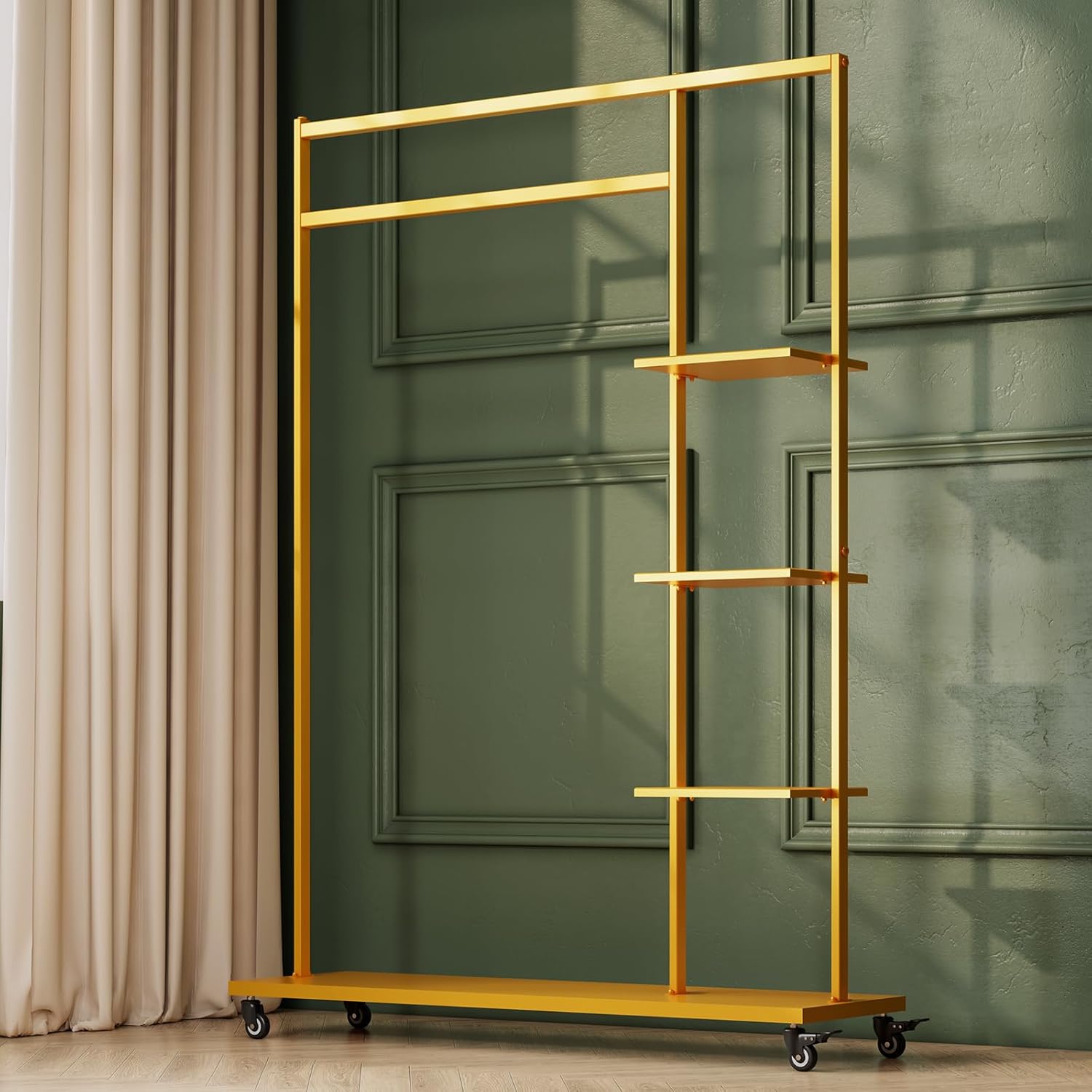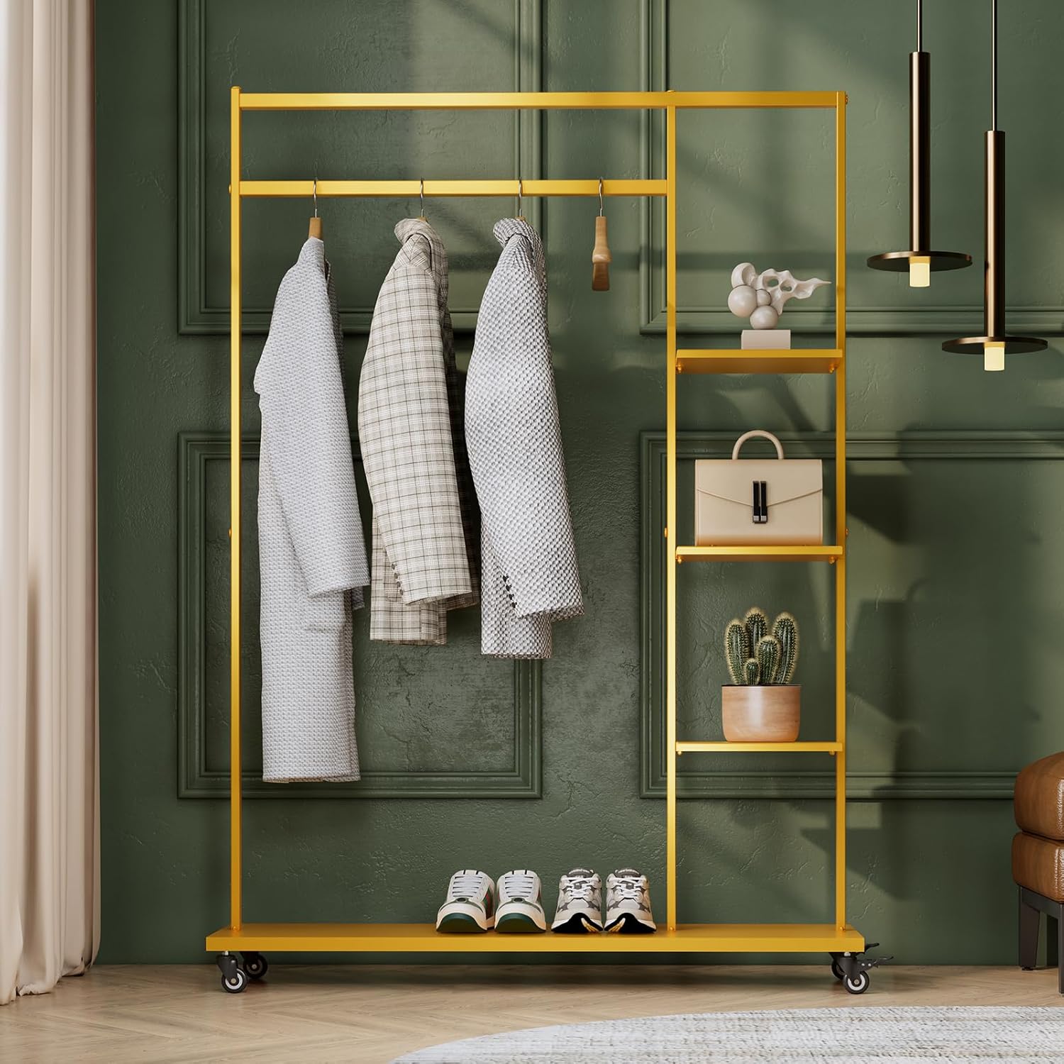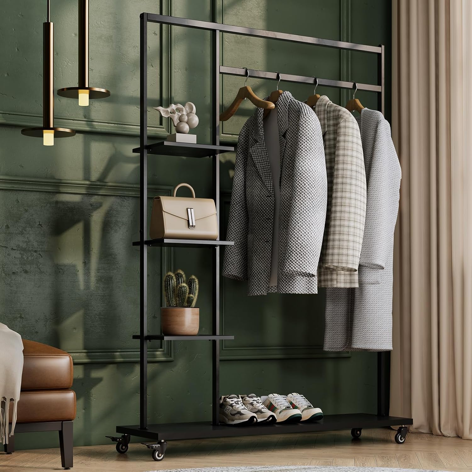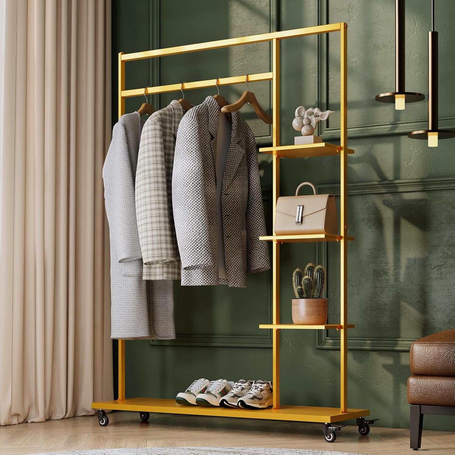 Clothing rack with shelves,Heavy Duty clothes rack with wheels,Rolling Garment Rack for hanging clothes with 4 flank Shelves,Metal Closets wardrobe rack for Bedroom/Boutique/Cloakroom
