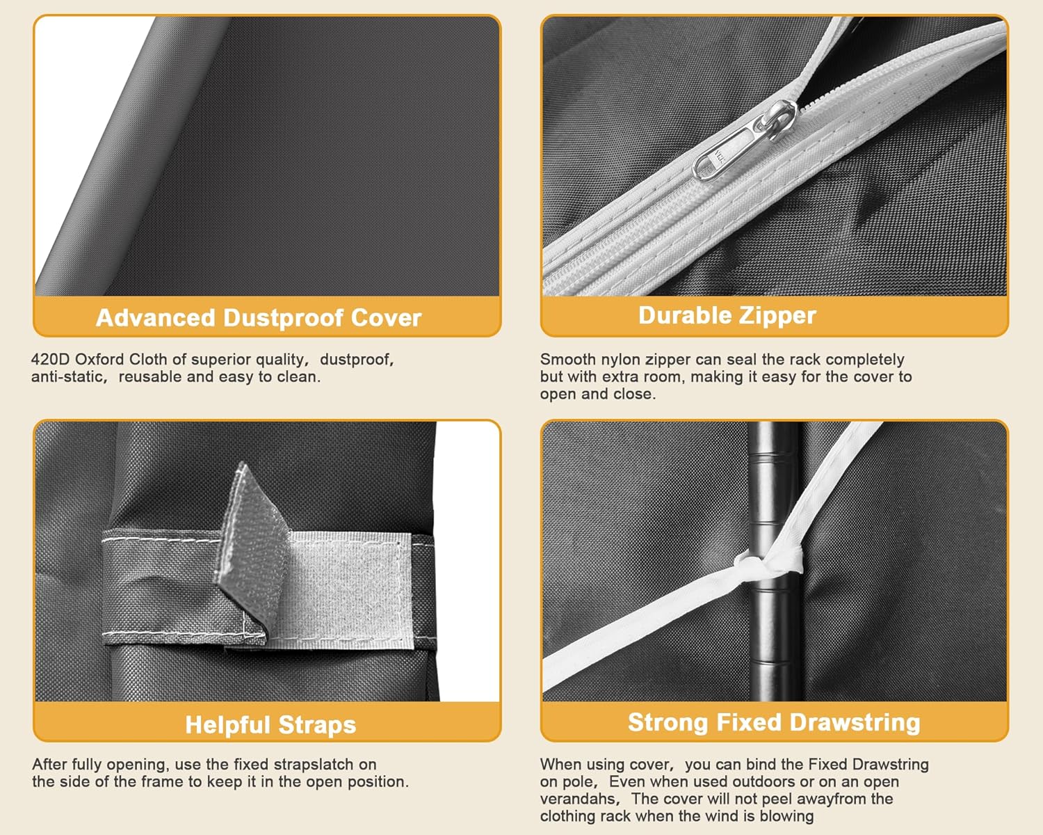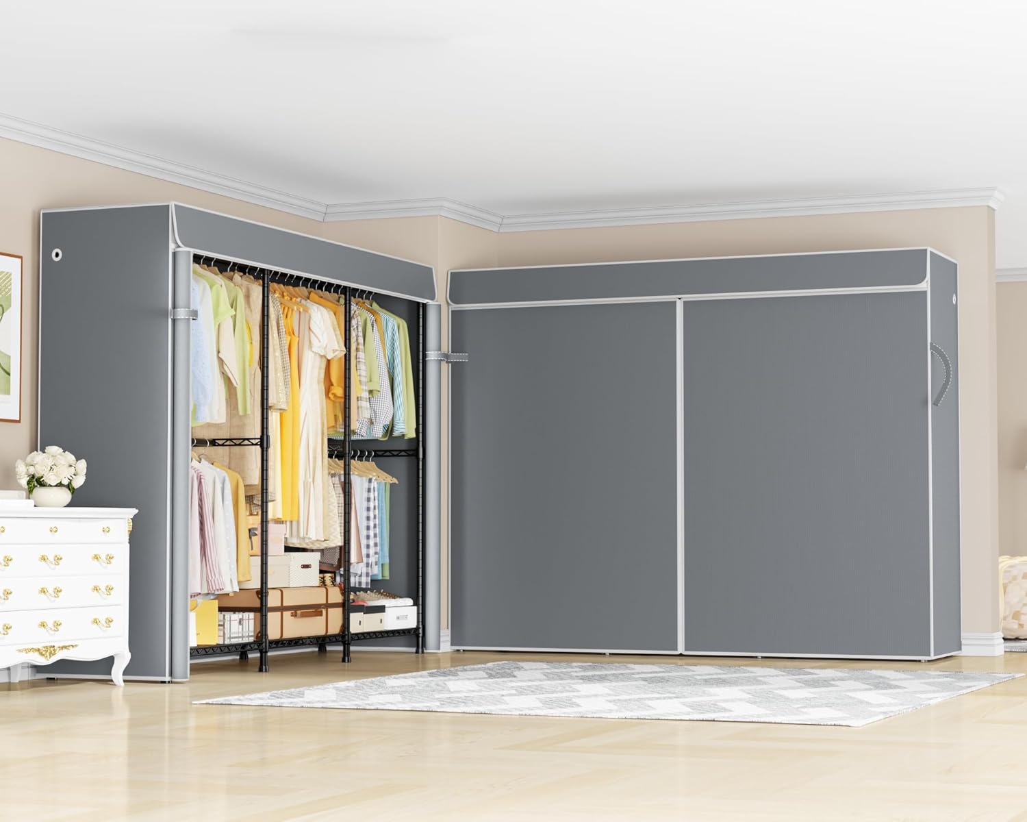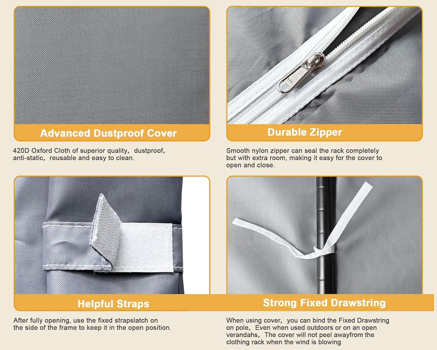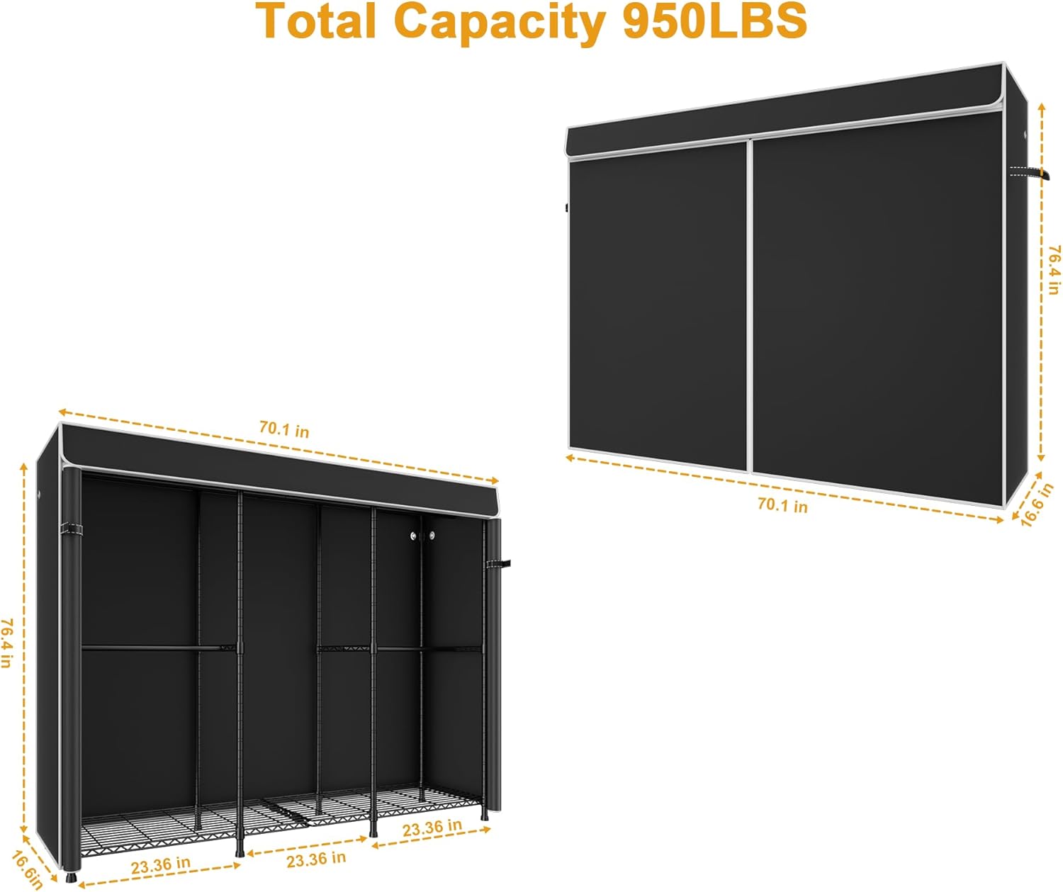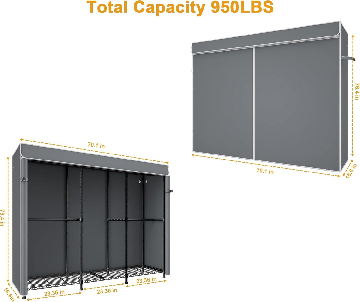 E14C Heavy Duty Closet Organizer System,Freestanding Clothing Racks for Hanging Clothes,Adjustable Garment Rack 70.1" W × 16.6" D × 76.4" H Hold 960 lbs,Black Rack with Grey Dustproof Cover
