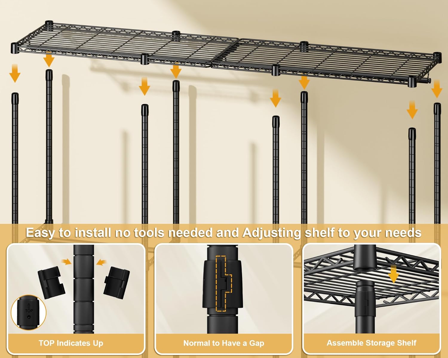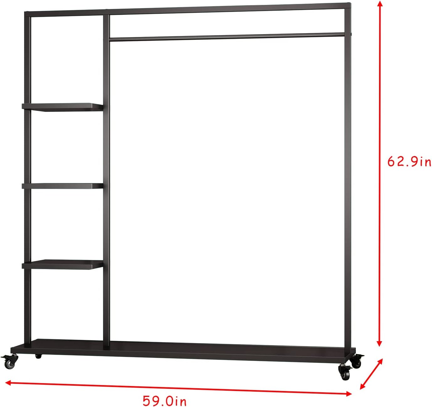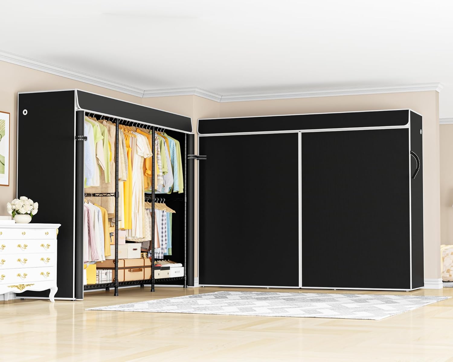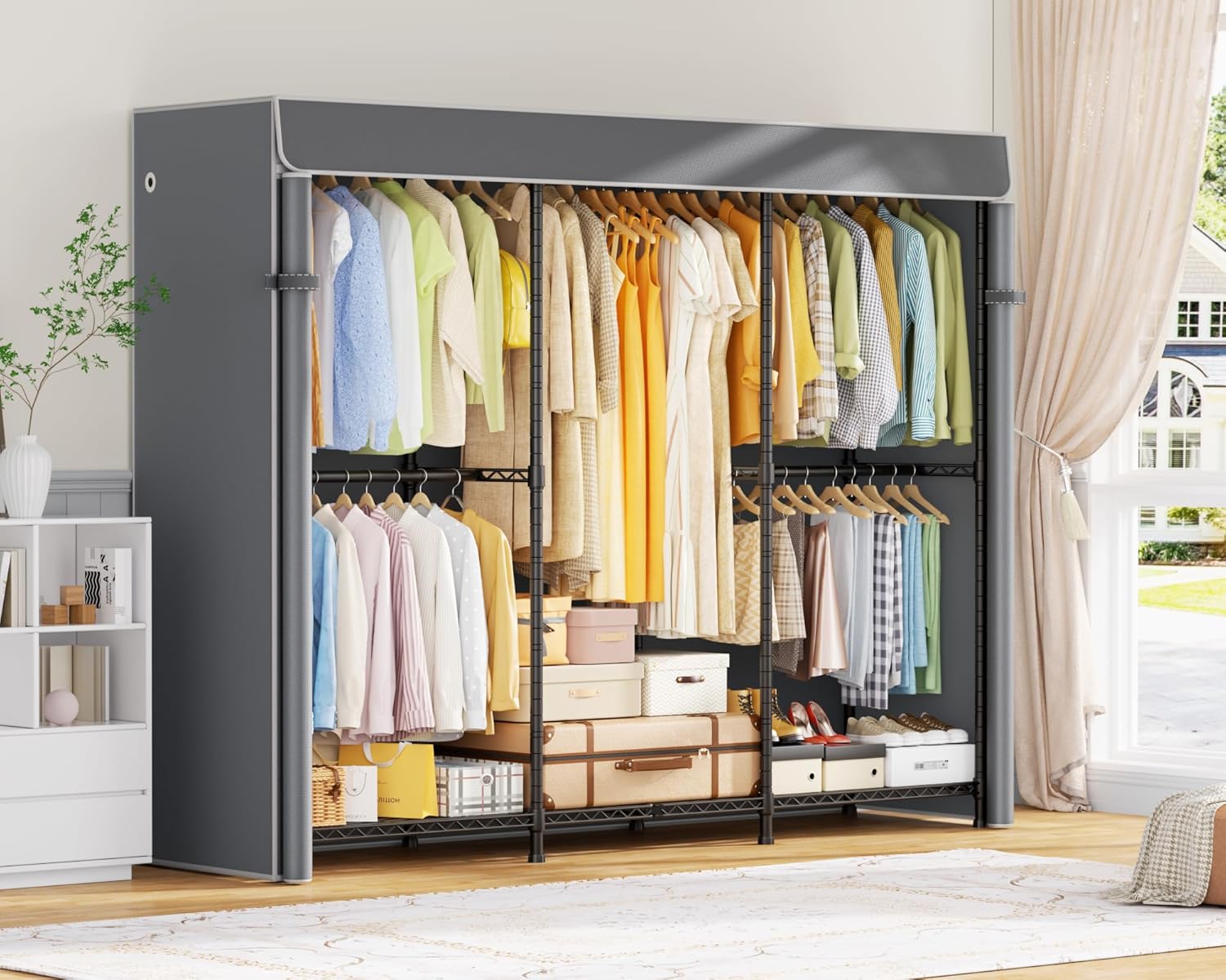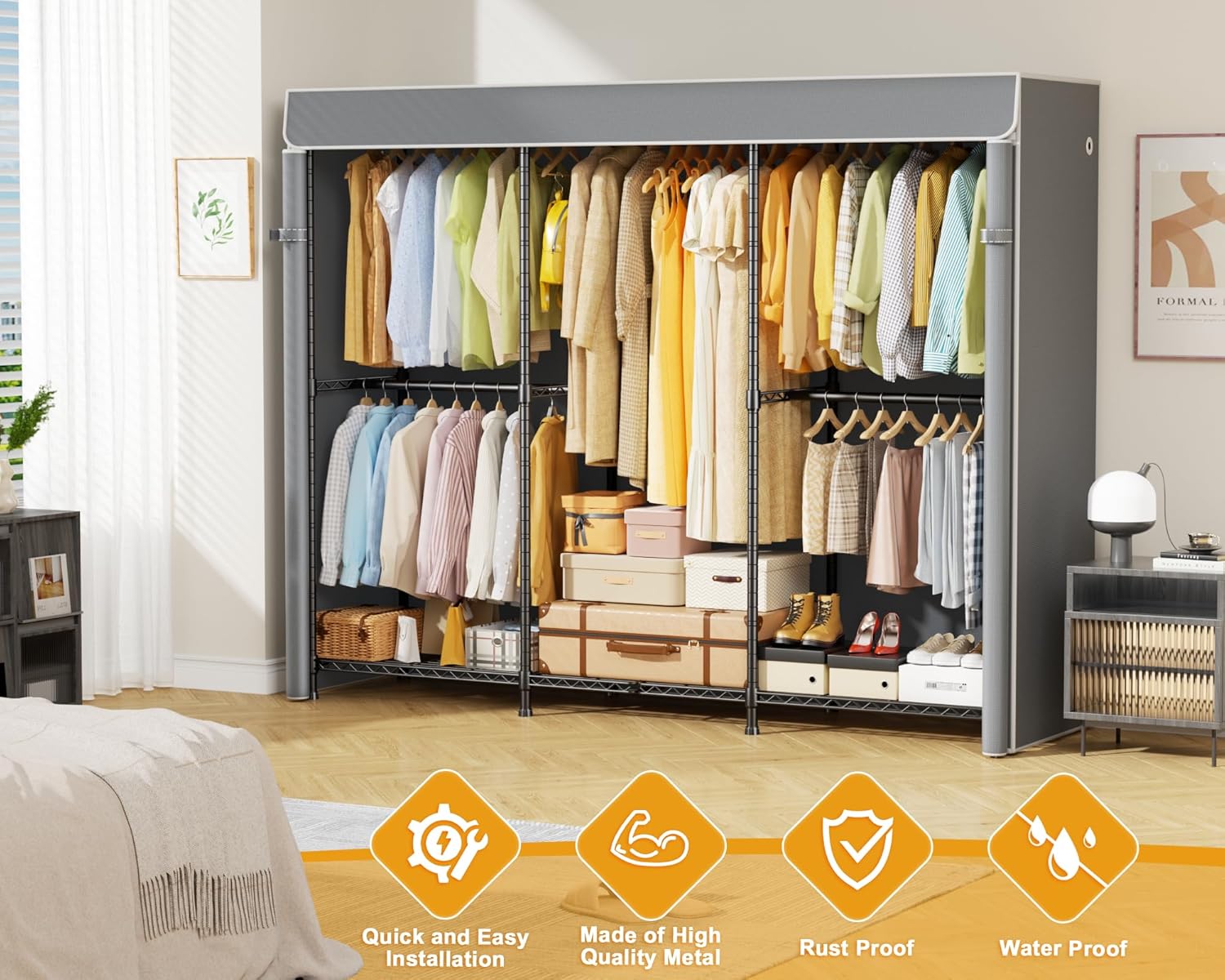 E14C Heavy Duty Closet Organizer System,Freestanding Clothing Racks for Hanging Clothes,Adjustable Garment Rack 70.1" W × 16.6" D × 76.4" H Hold 960 lbs,Black Rack with Grey Dustproof Cover
