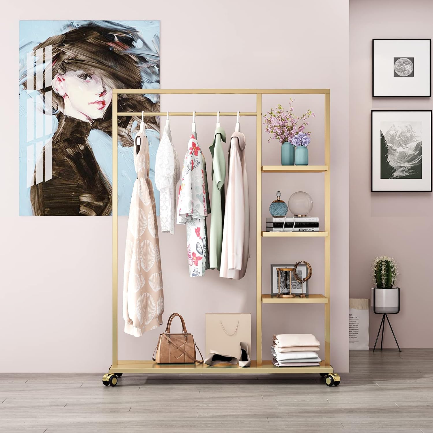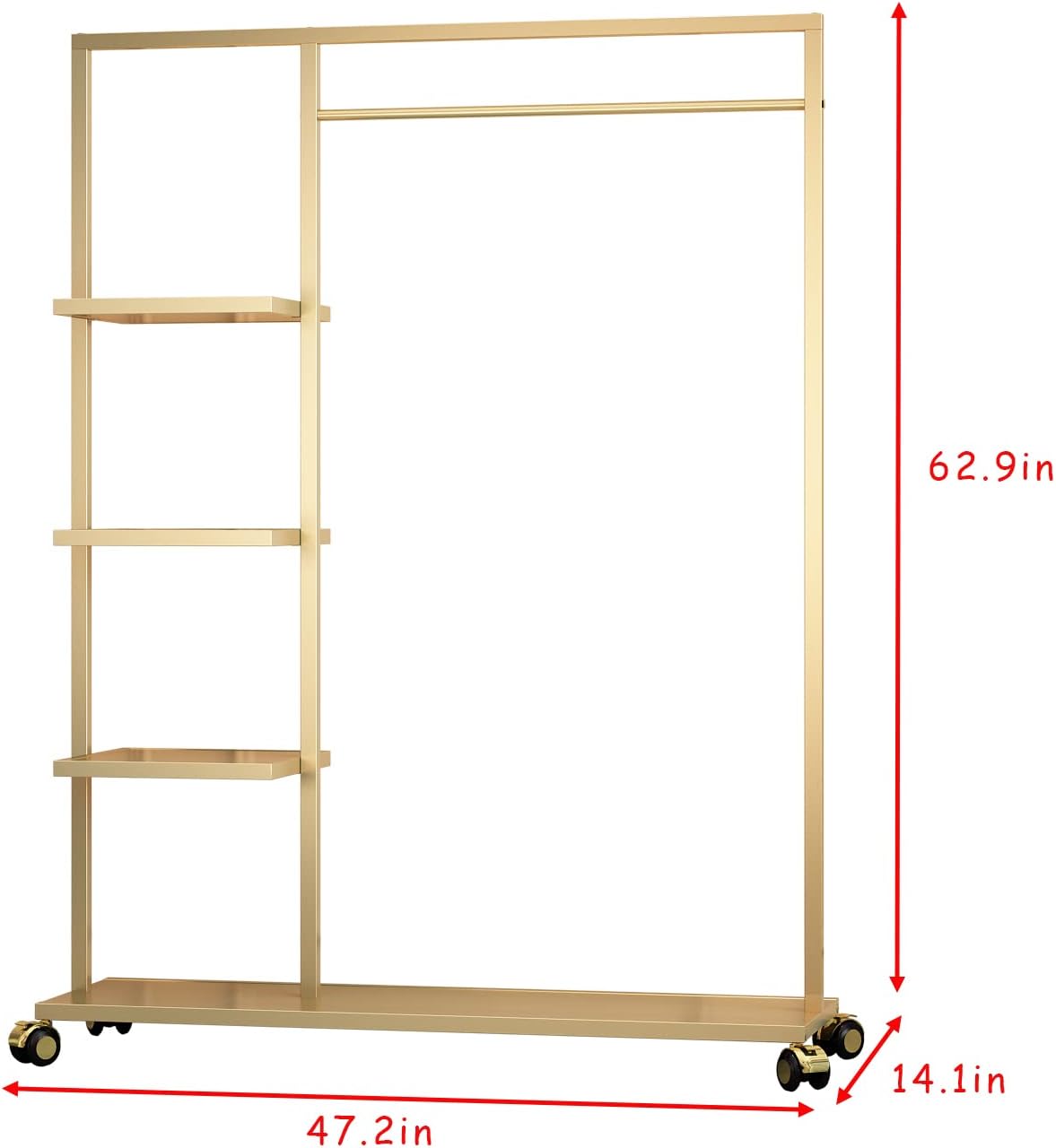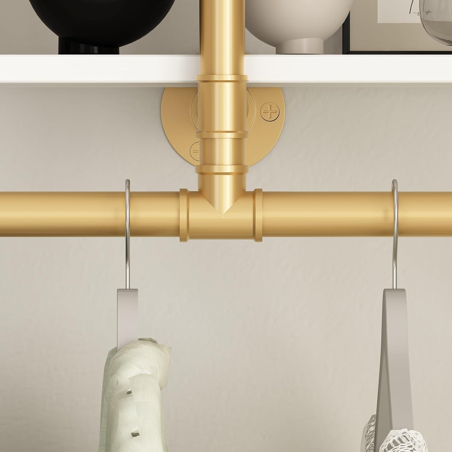 Garment Rack Heavy Duty Clothes Rack for Hanging Clothes, Metal Freestanding Closet Wardrobe Shelf, Gold Industrial Pipe Clothing Racks with Shelves Closet Rods System