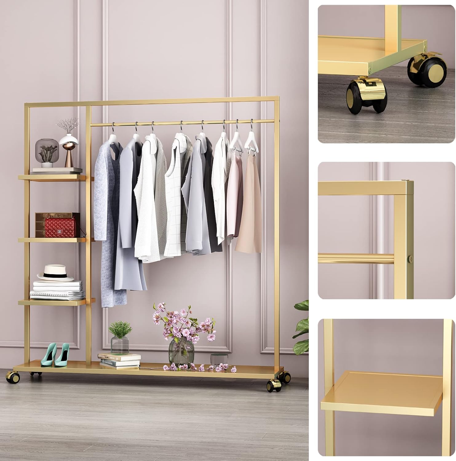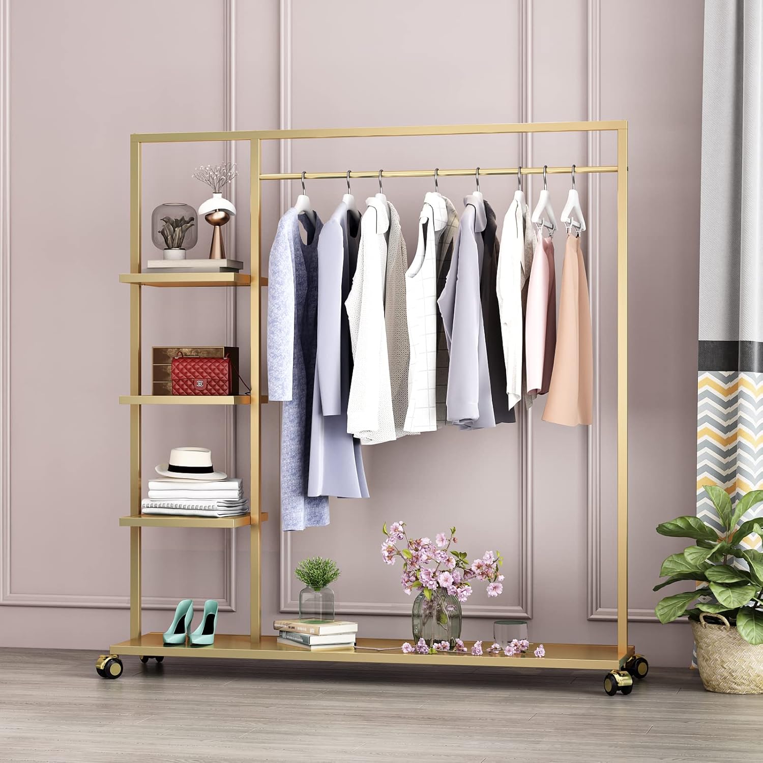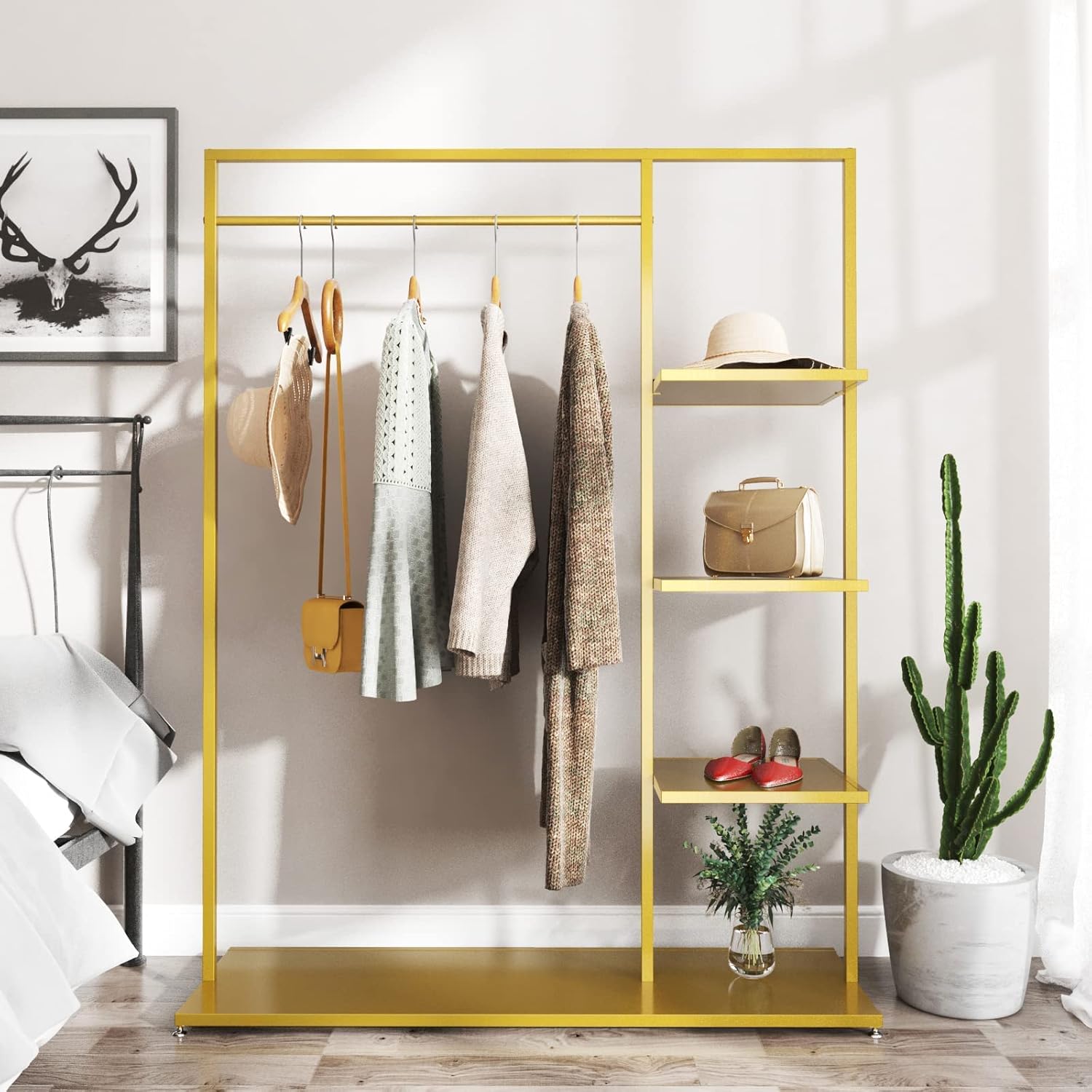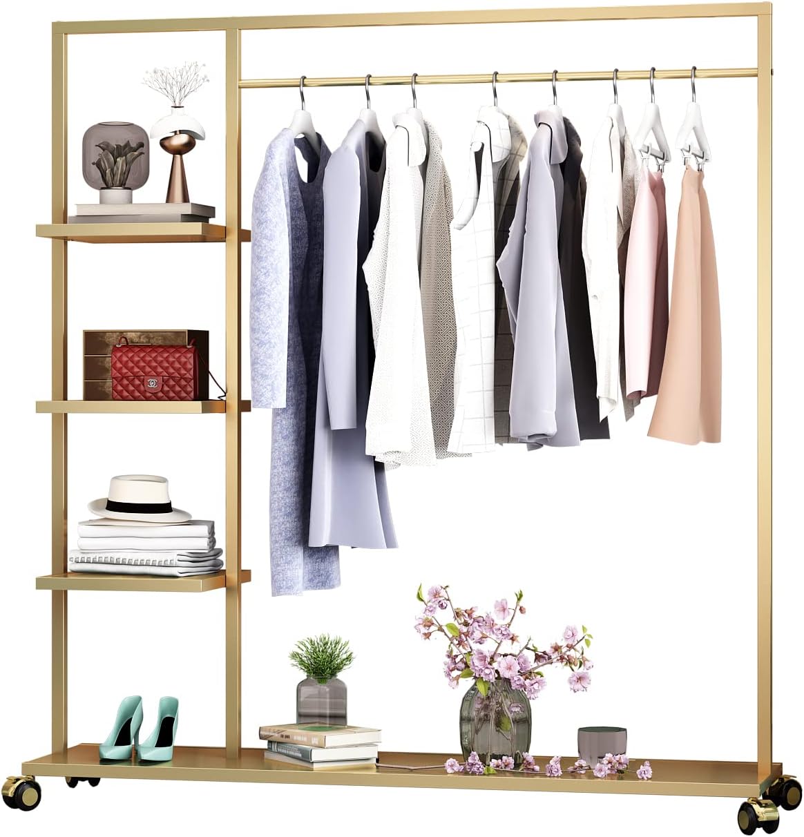 Garment Rack Heavy Duty Clothes Rack for Hanging Clothes, Metal Freestanding Closet Wardrobe Shelf, Gold Industrial Pipe Clothing Racks with Shelves Closet Rods System
