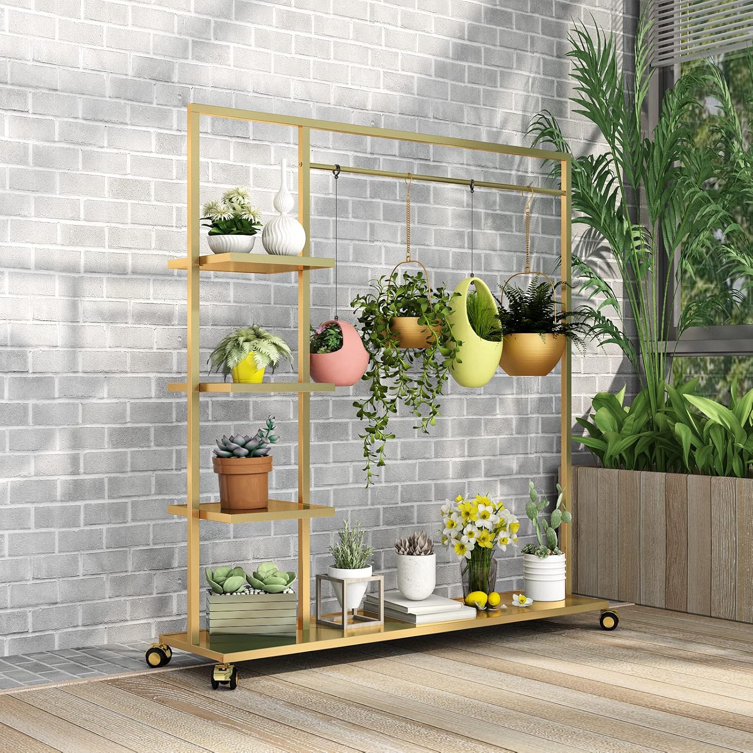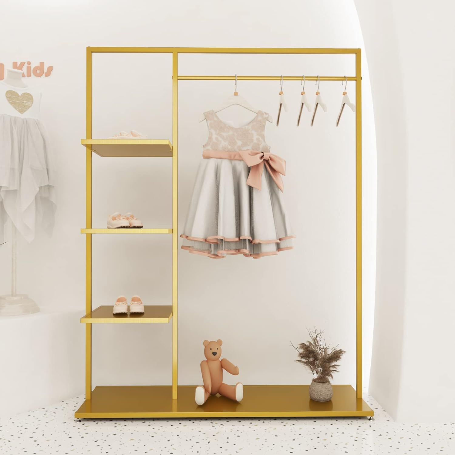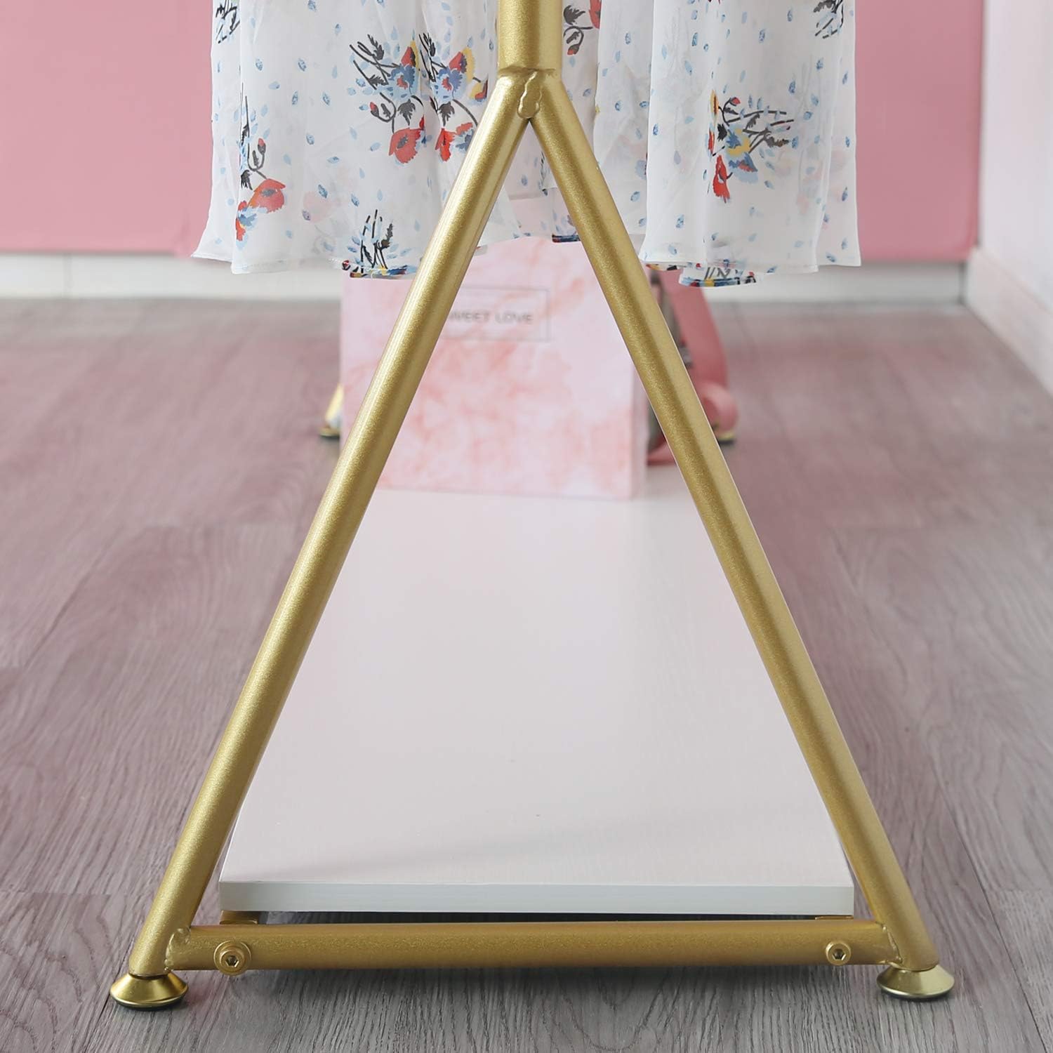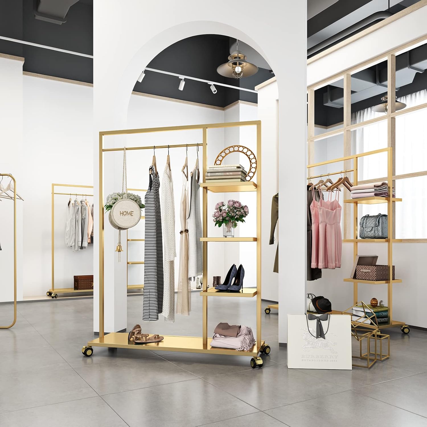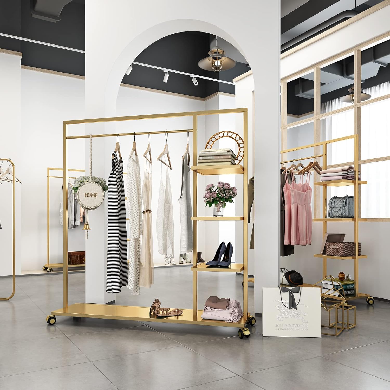 Gold Clothing Racks with Shelf, Boutiques Retail Display Gold Clothes Rack, Multiple Uses Heavy Duty Garment Rack for Hanging Rods for Home and Retail