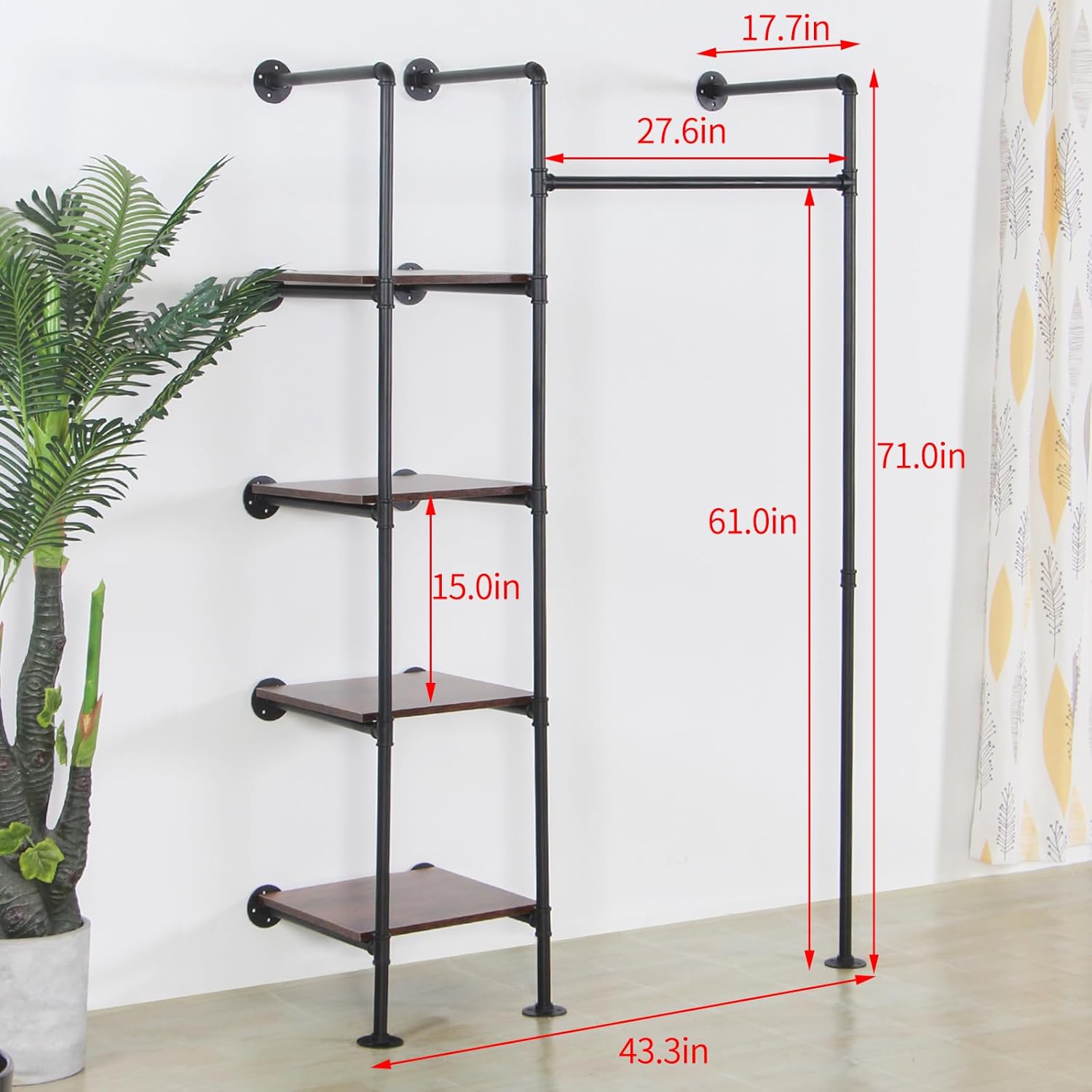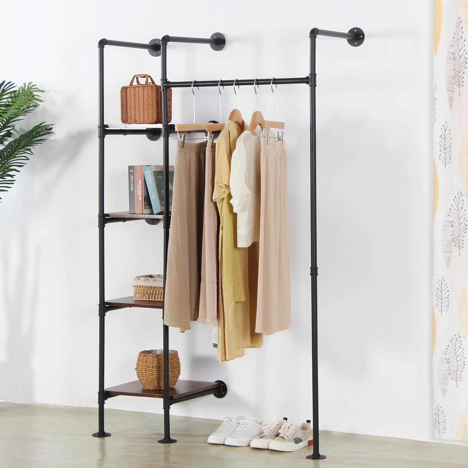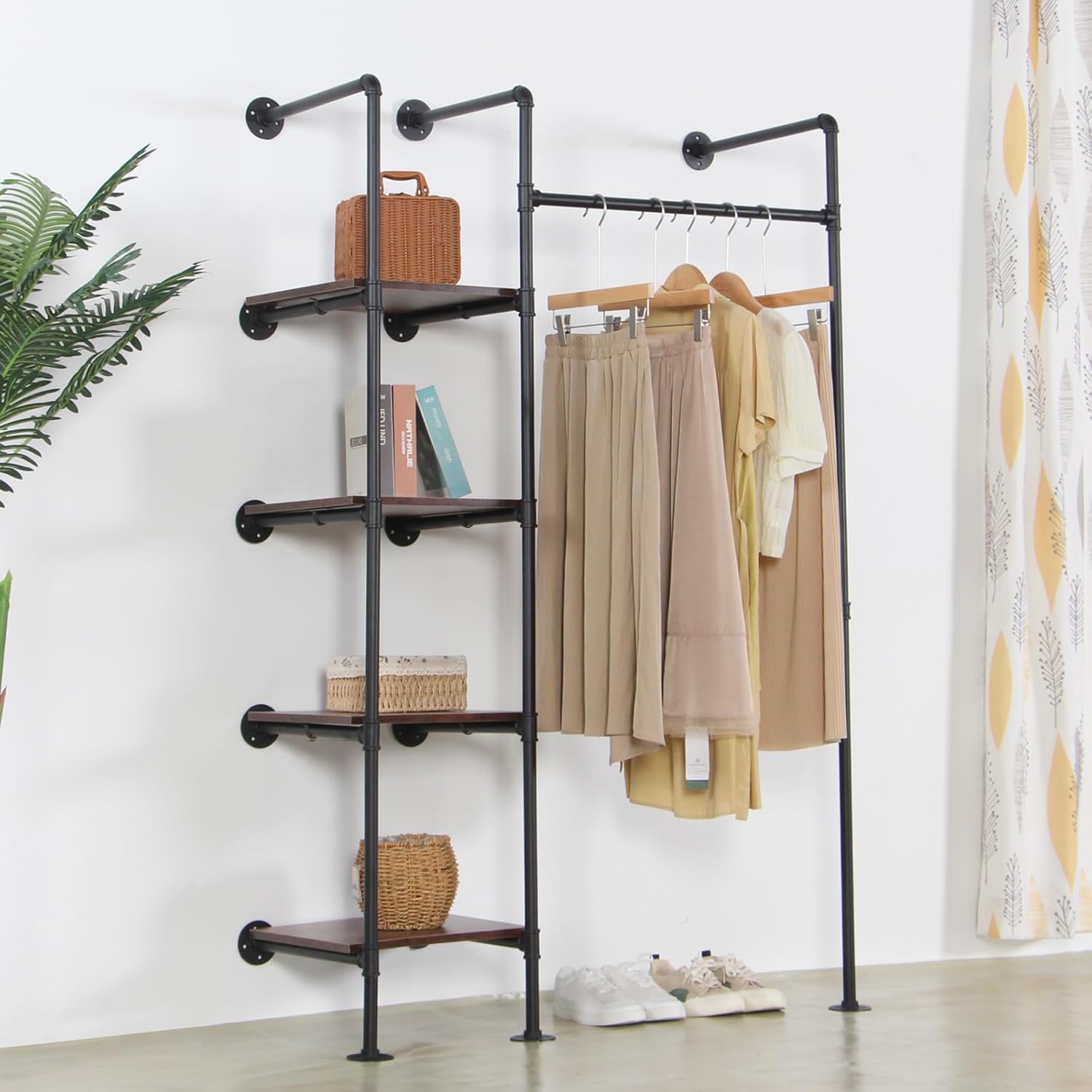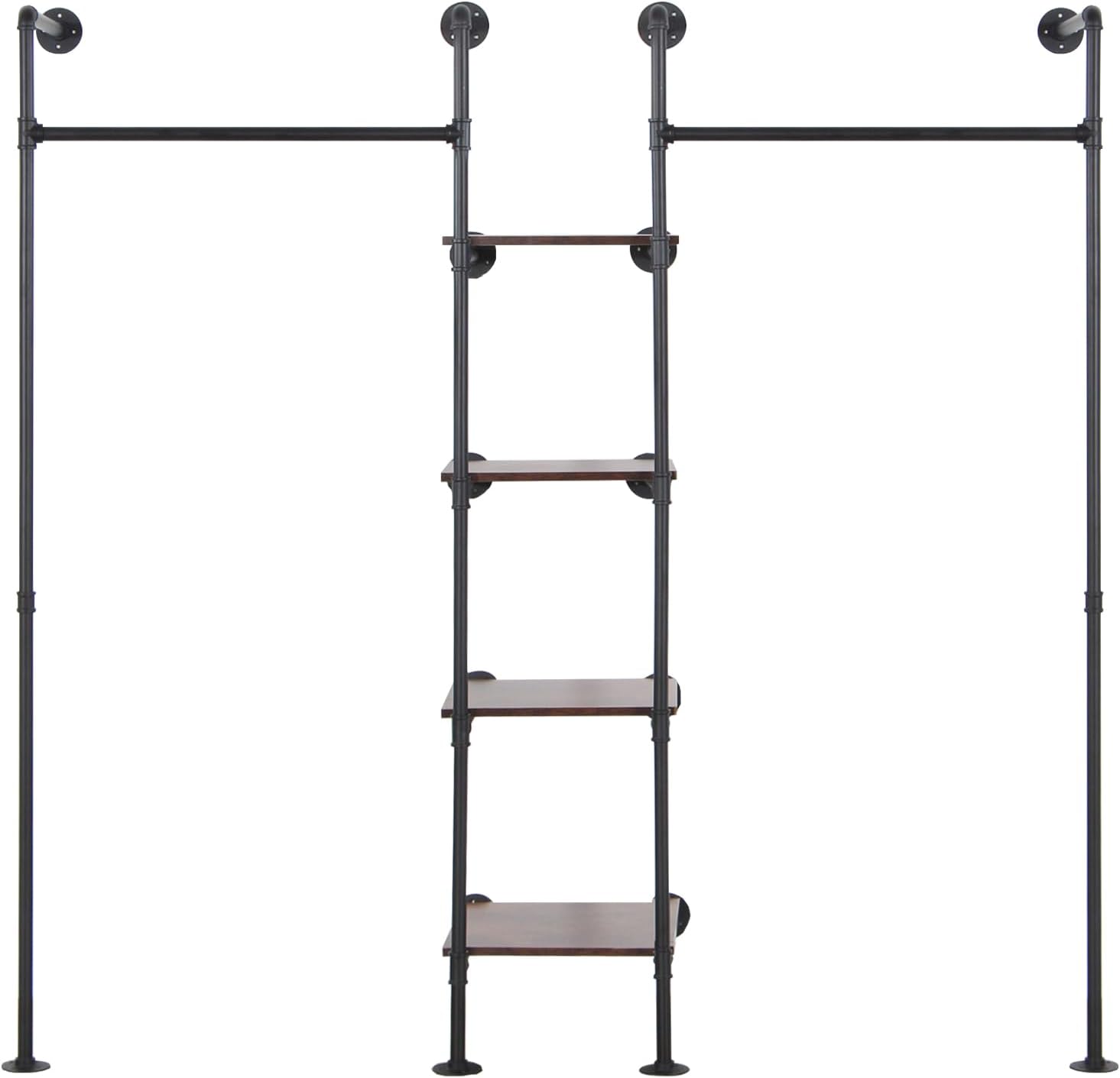 Wall Mounted Industrial Pipe Heavy Duty Clothes Rack, Clothing Rods for Hanging Clothes, Freestanding Clothing Rack with 2 Hang Rods & 4 Shelves, 72.8" W x 17.7" D x 71" H