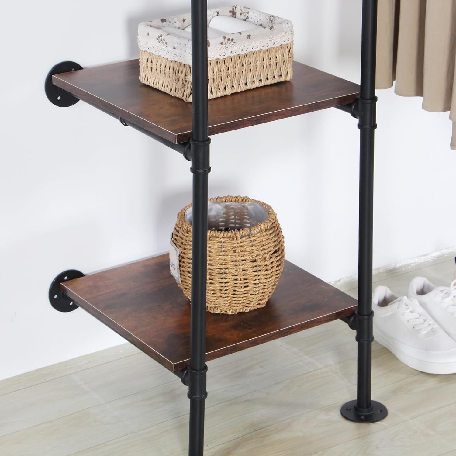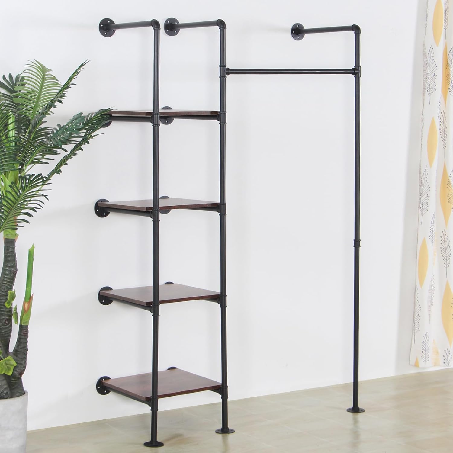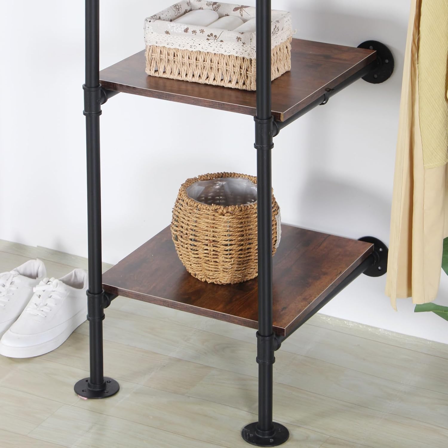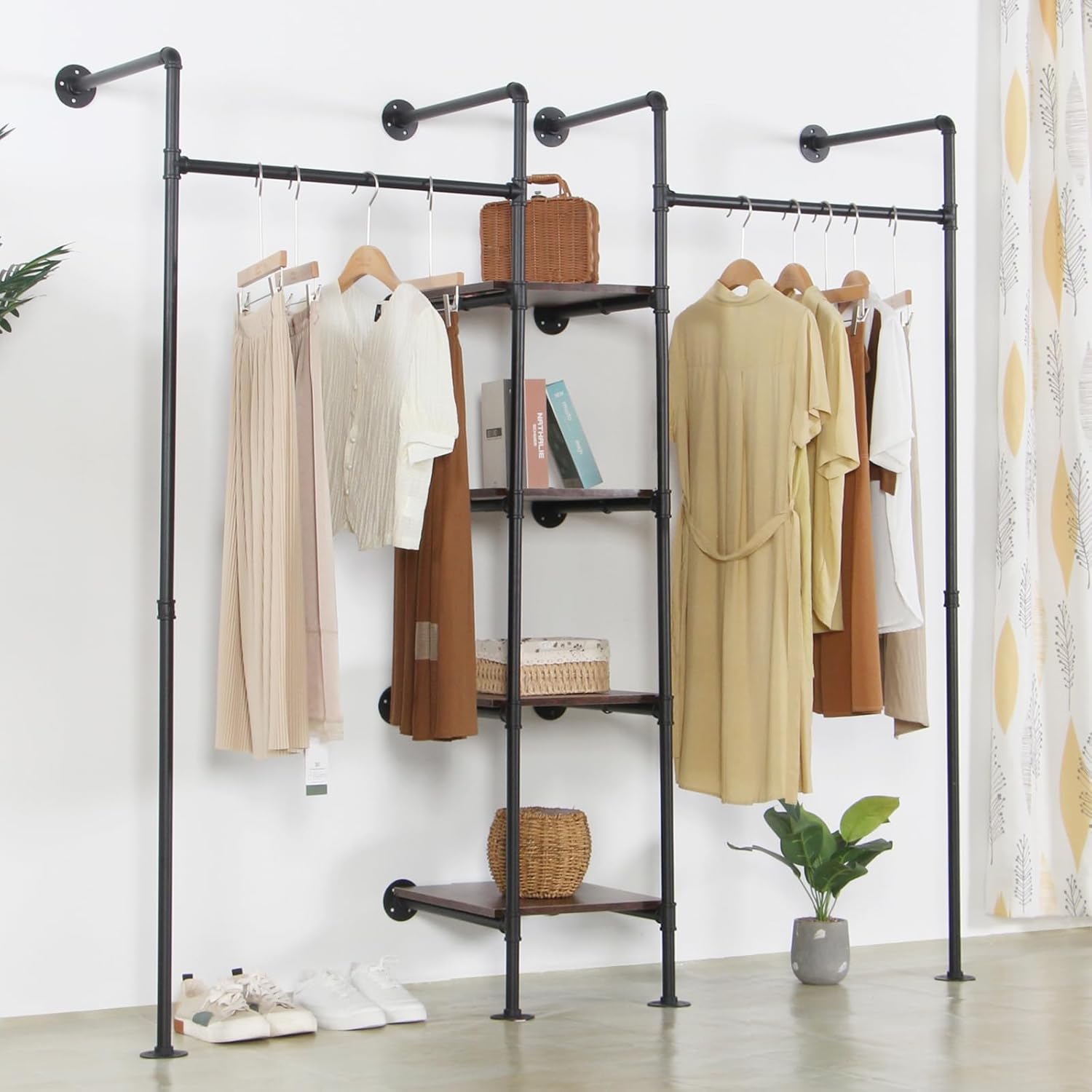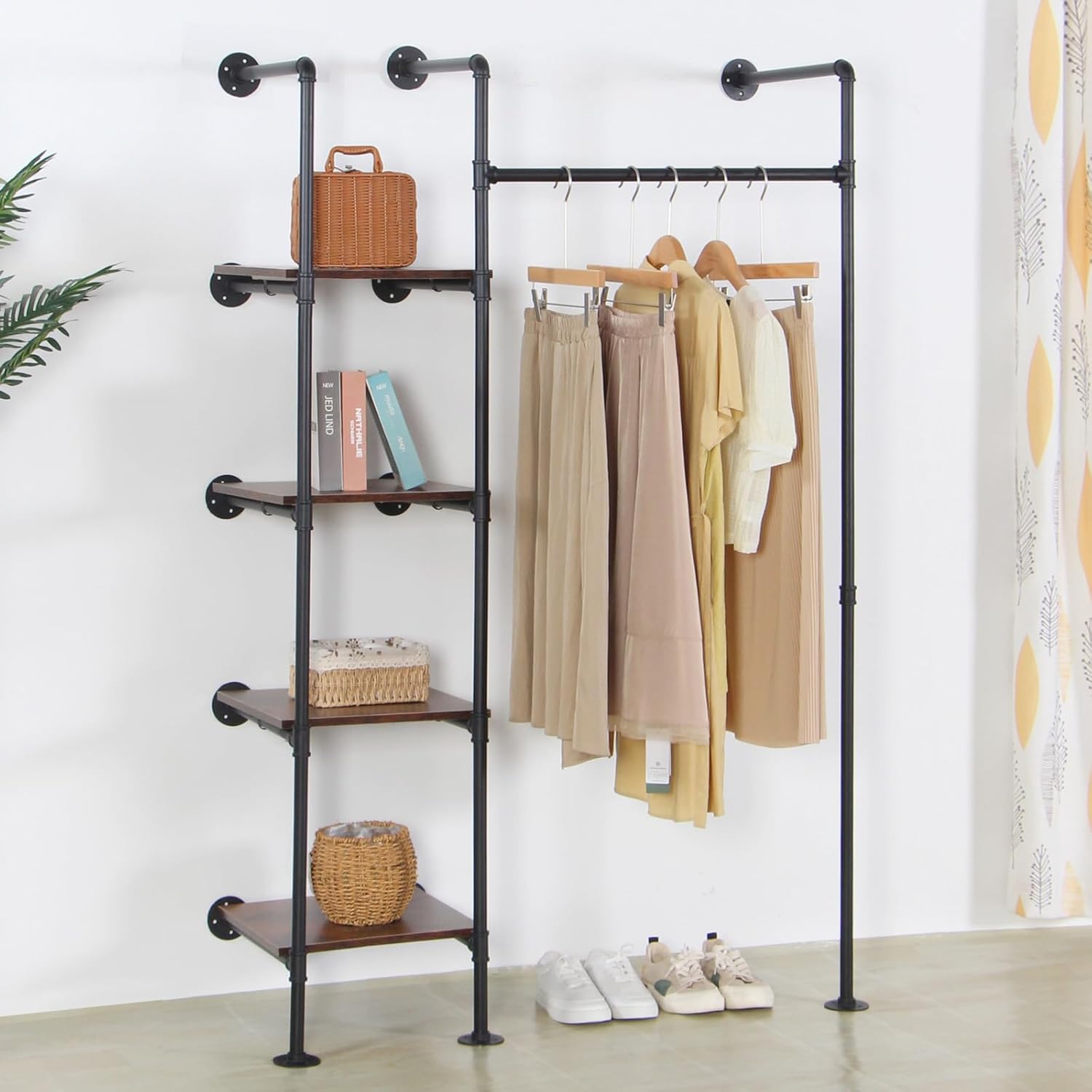 Wall Mounted Industrial Pipe Heavy Duty Clothes Rack, Clothing Rods for Hanging Clothes, Freestanding Clothing Rack with 2 Hang Rods & 4 Shelves, 72.8" W x 17.7" D x 71" H