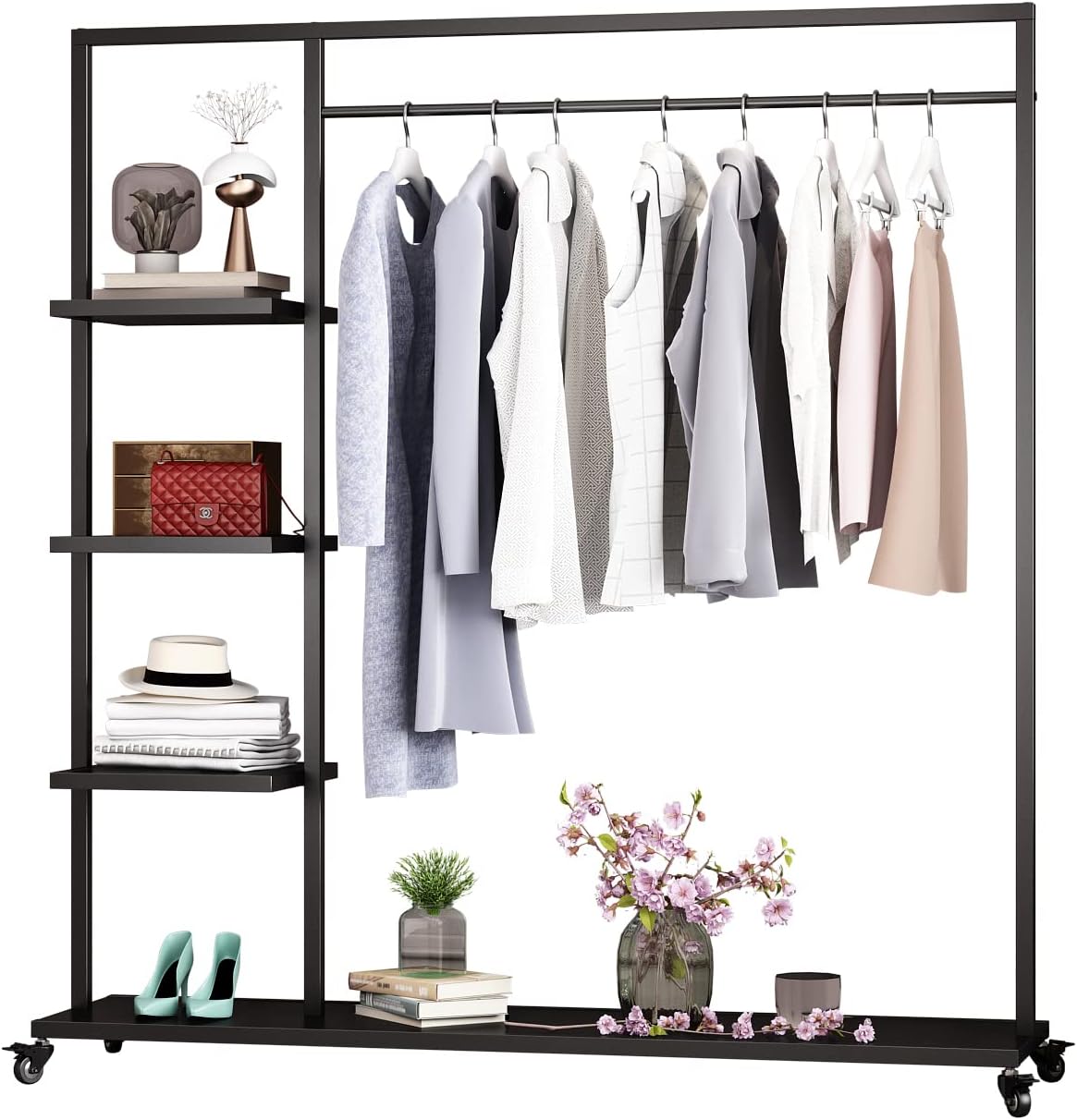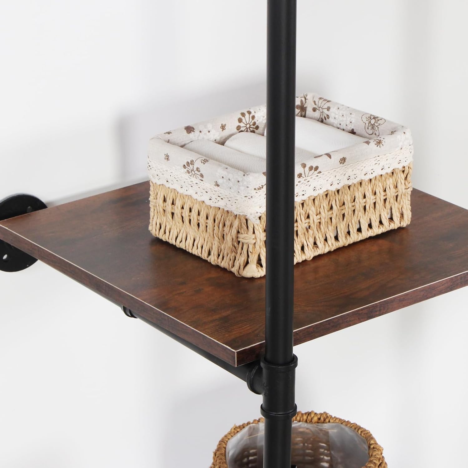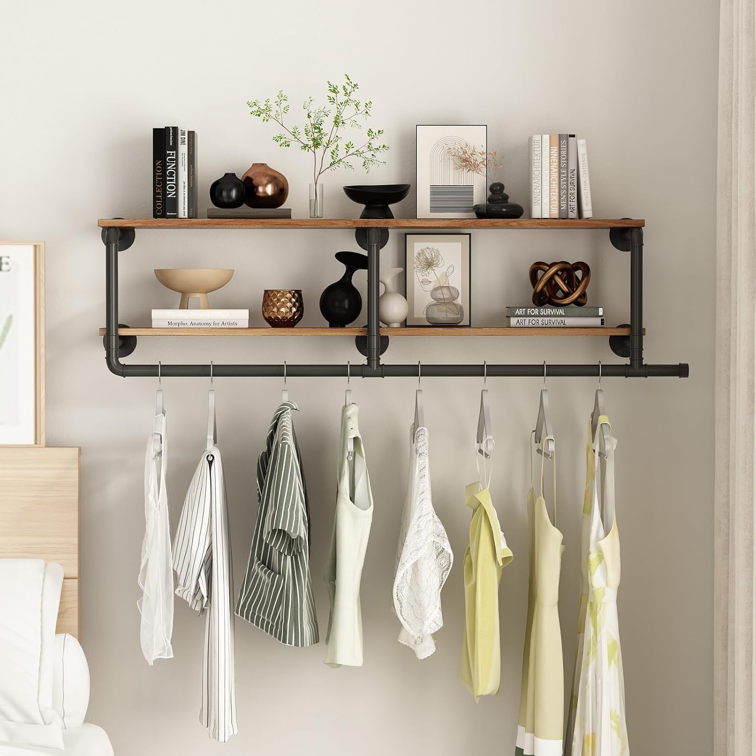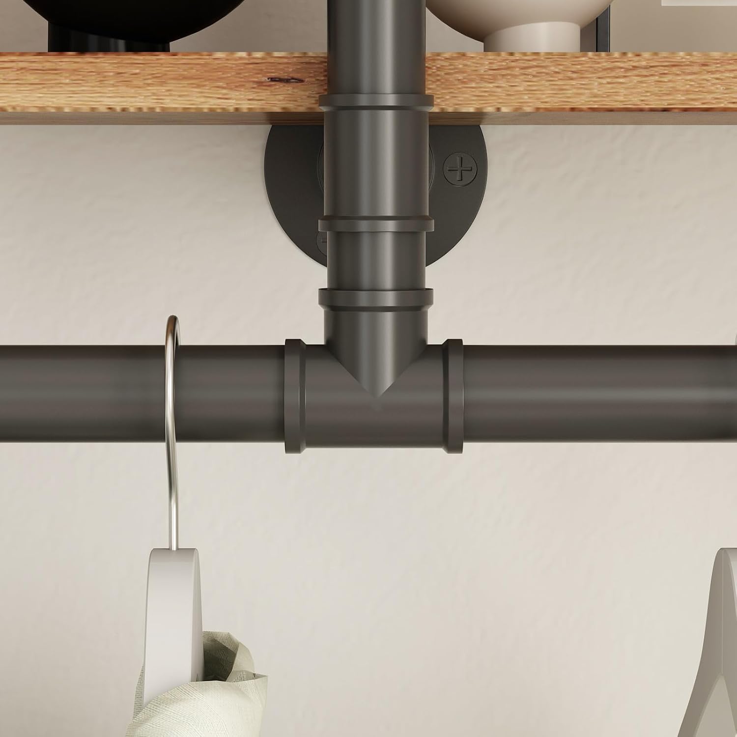 Wall Mounted Industrial Pipe Heavy Duty Clothes Rack, Clothing Rods for Hanging Clothes, Freestanding Clothing Rack with 2 Hang Rods & 4 Shelves, 72.8" W x 17.7" D x 71" H
