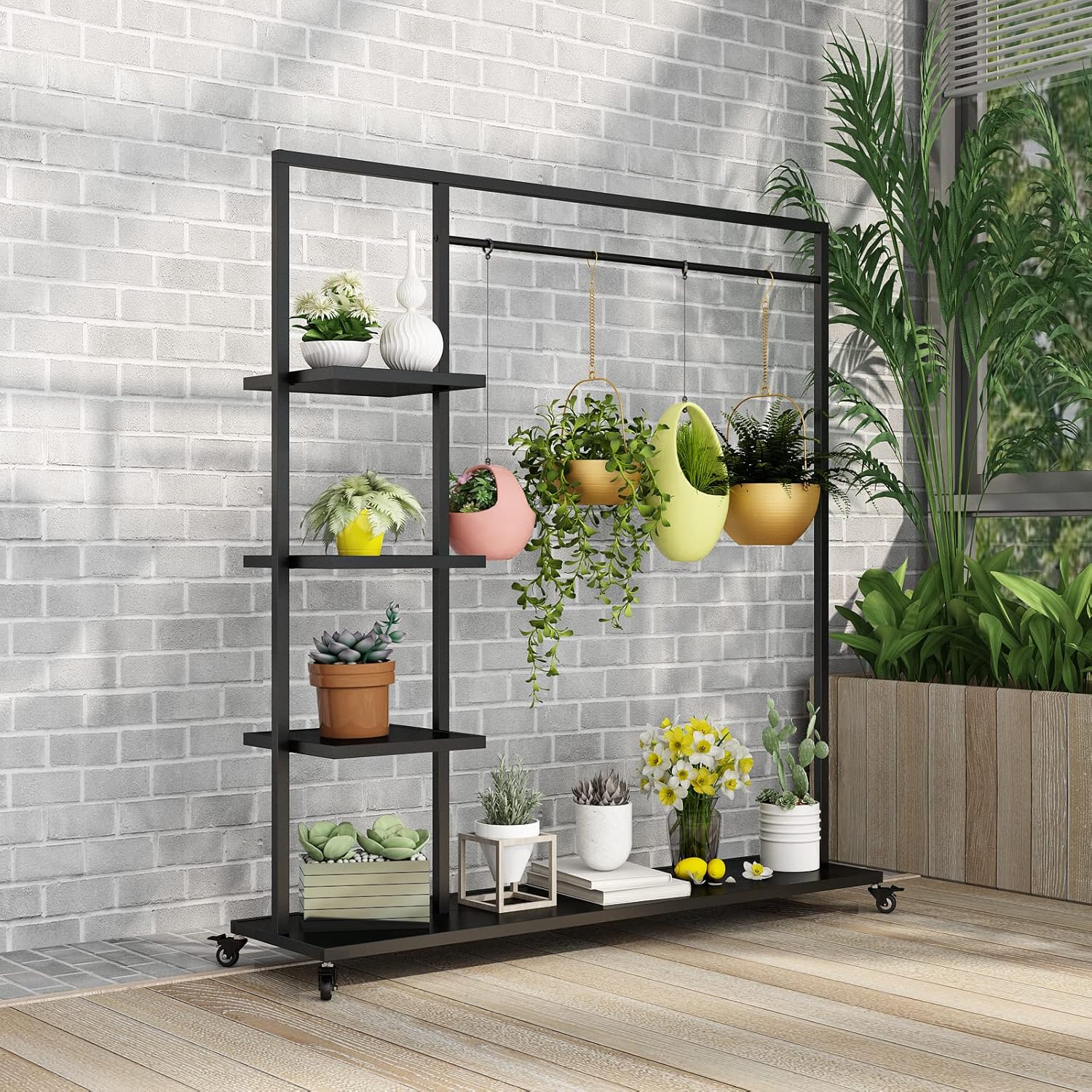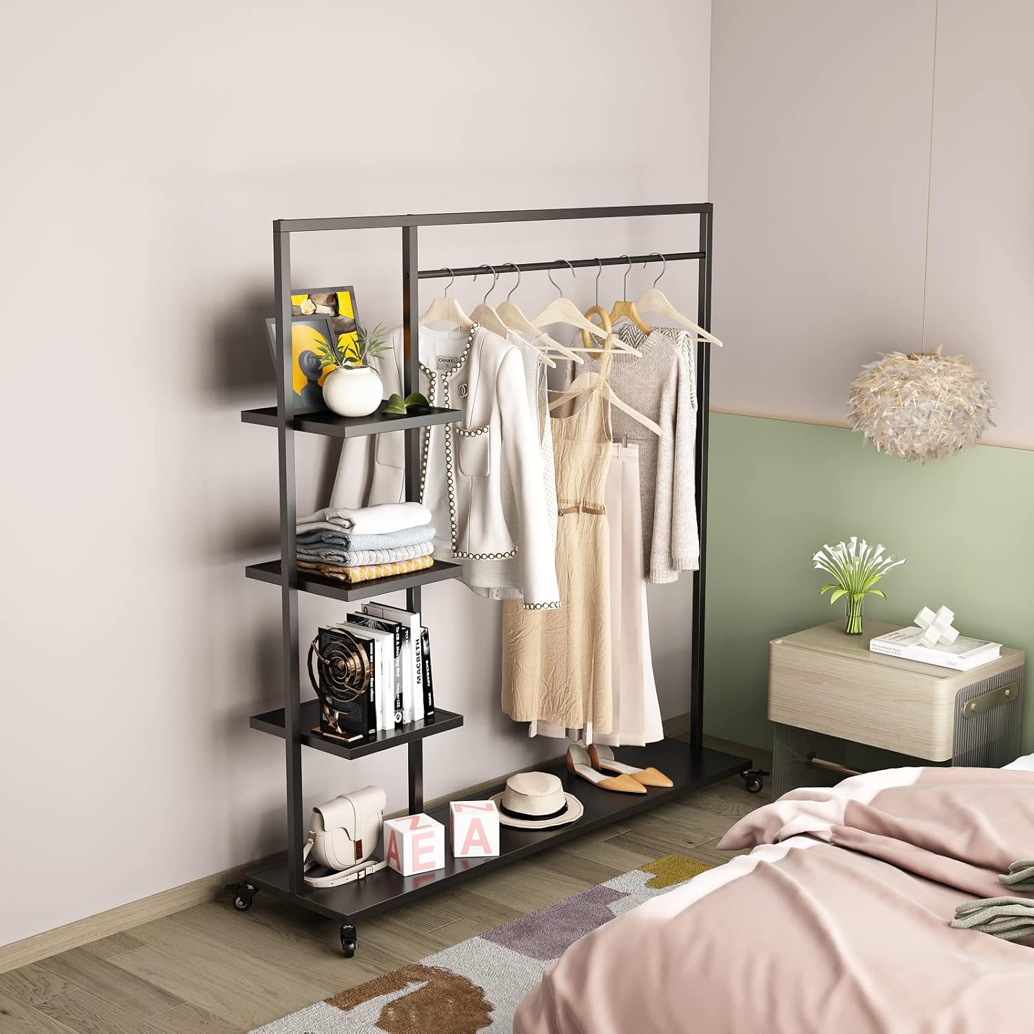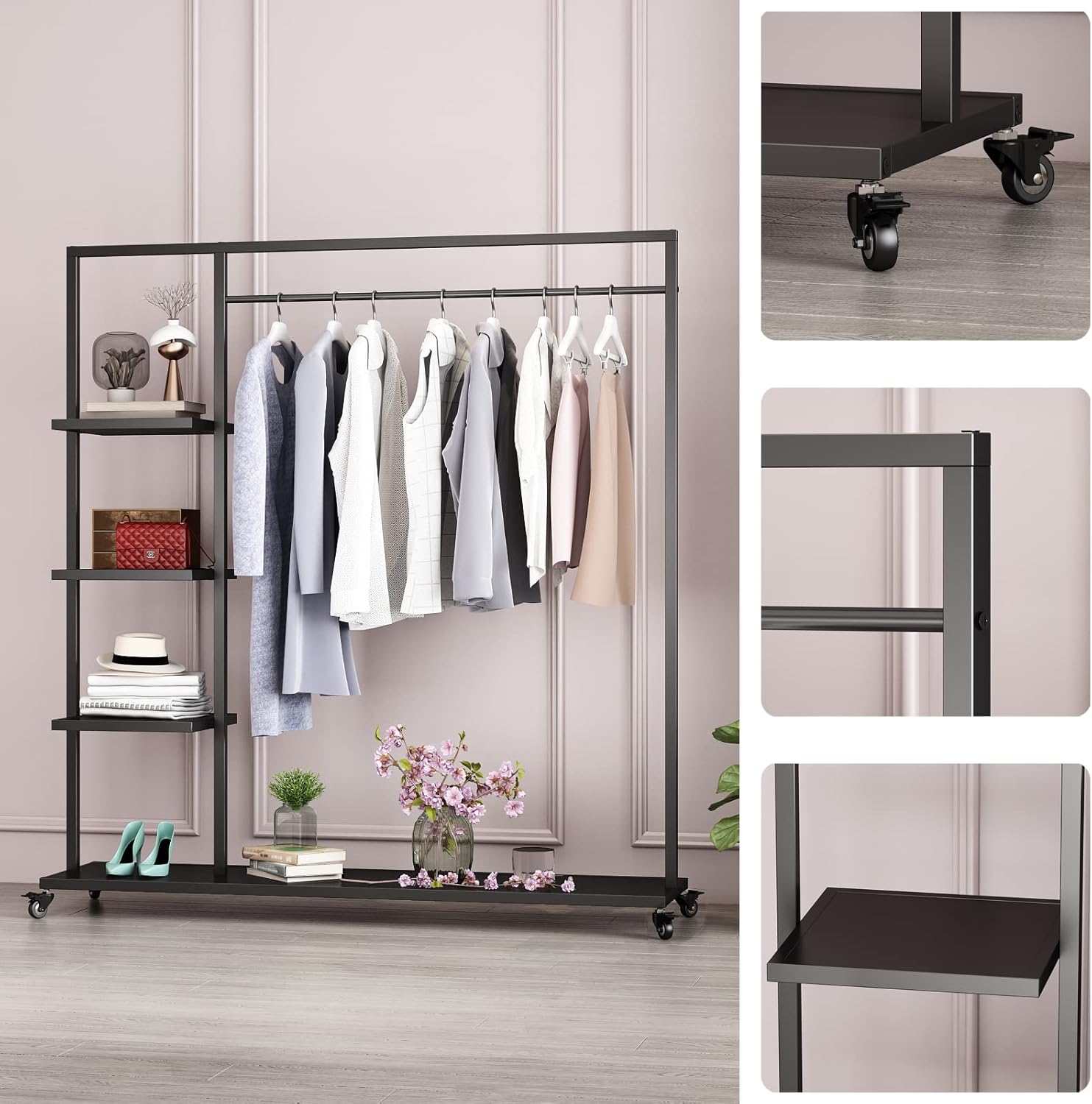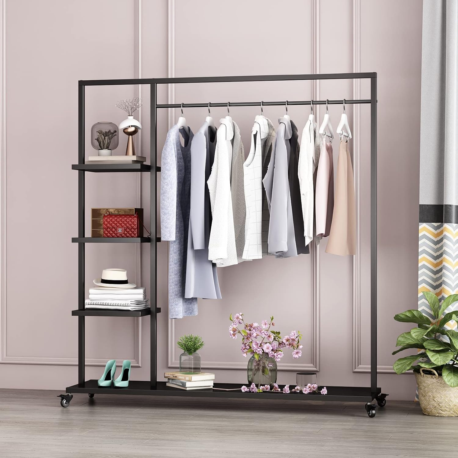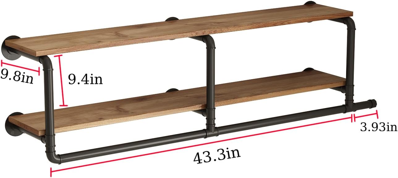 Wall Mounted Industrial Pipe Heavy Duty Clothes Rack, Clothing Rods for Hanging Clothes, Freestanding Clothing Rack with 2 Hang Rods & 4 Shelves, 72.8" W x 17.7" D x 71" H