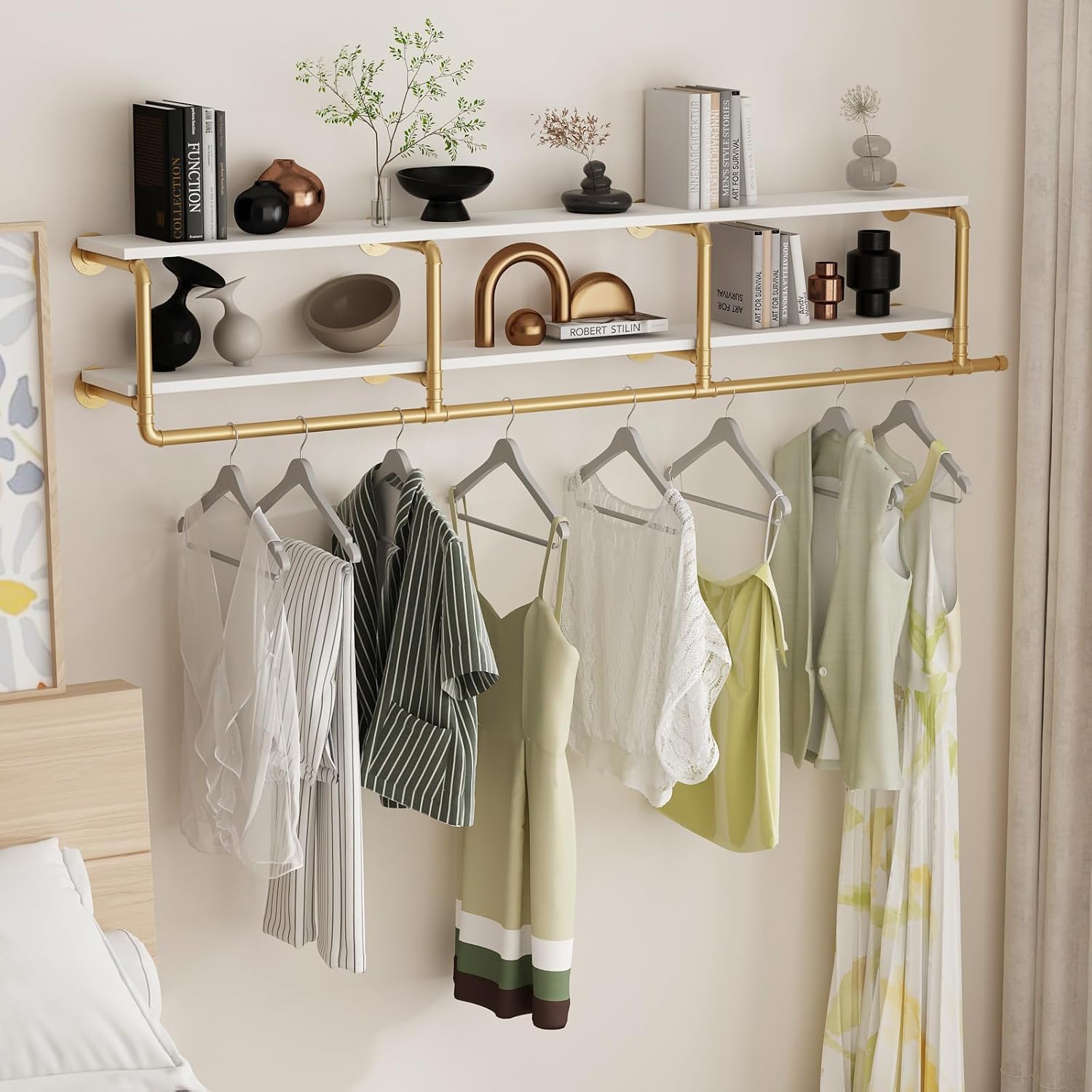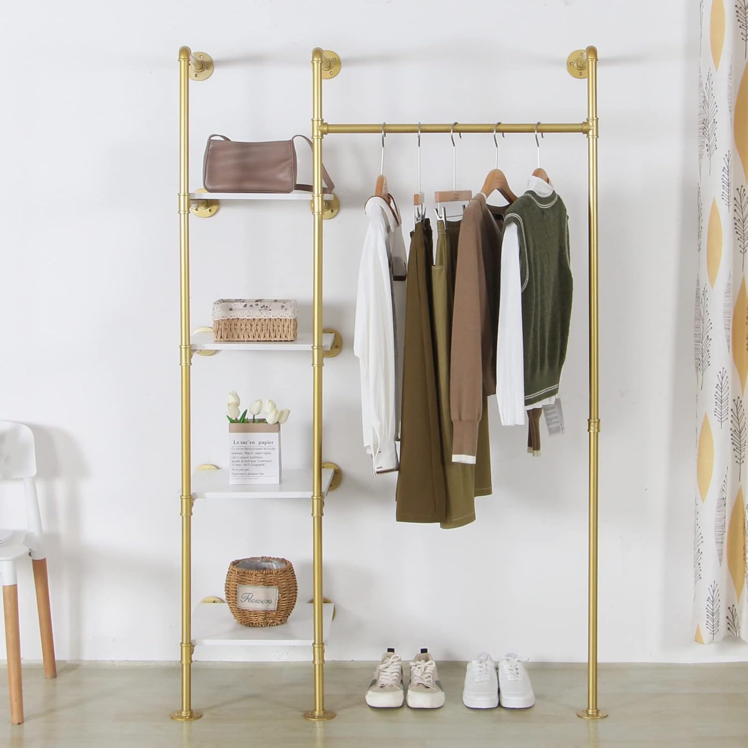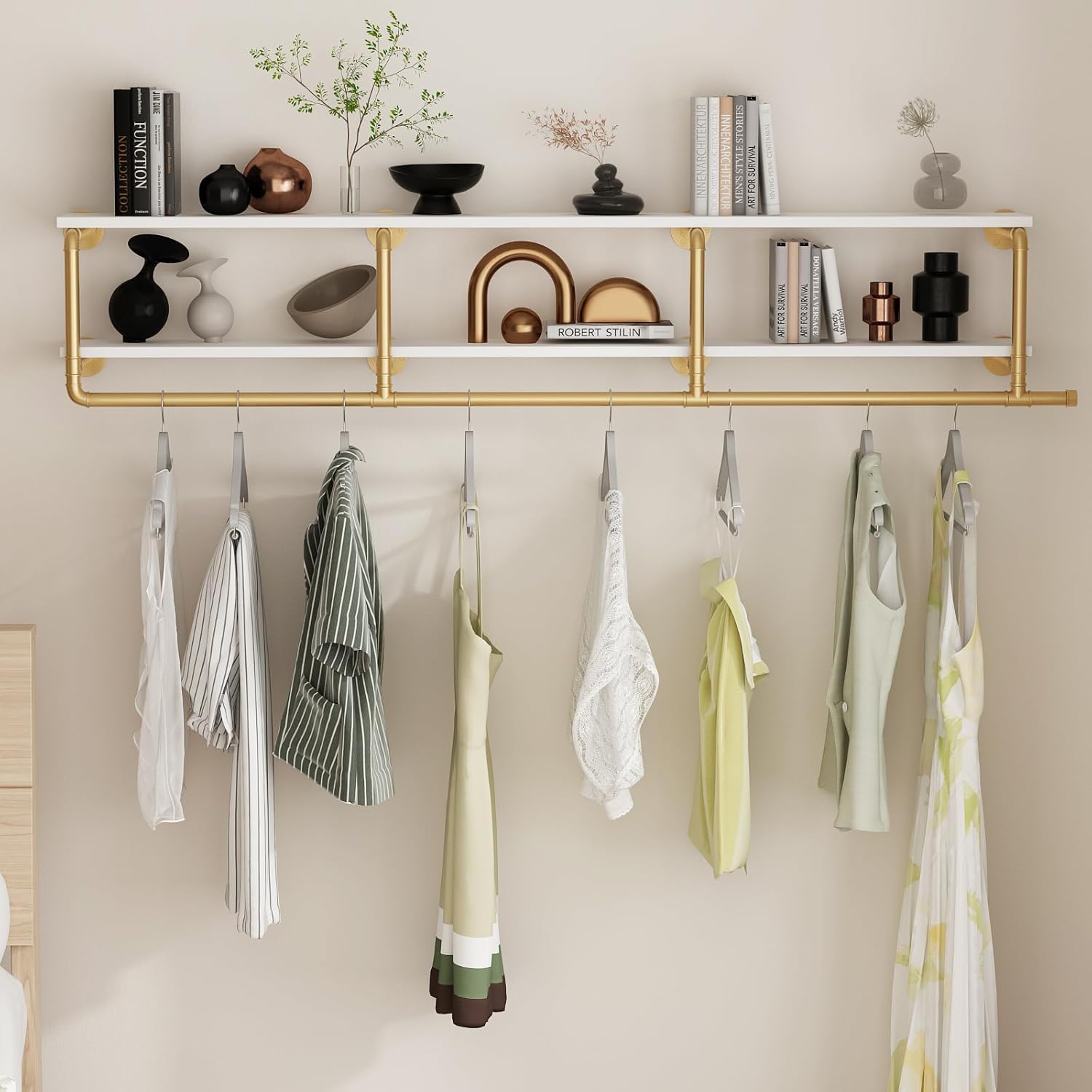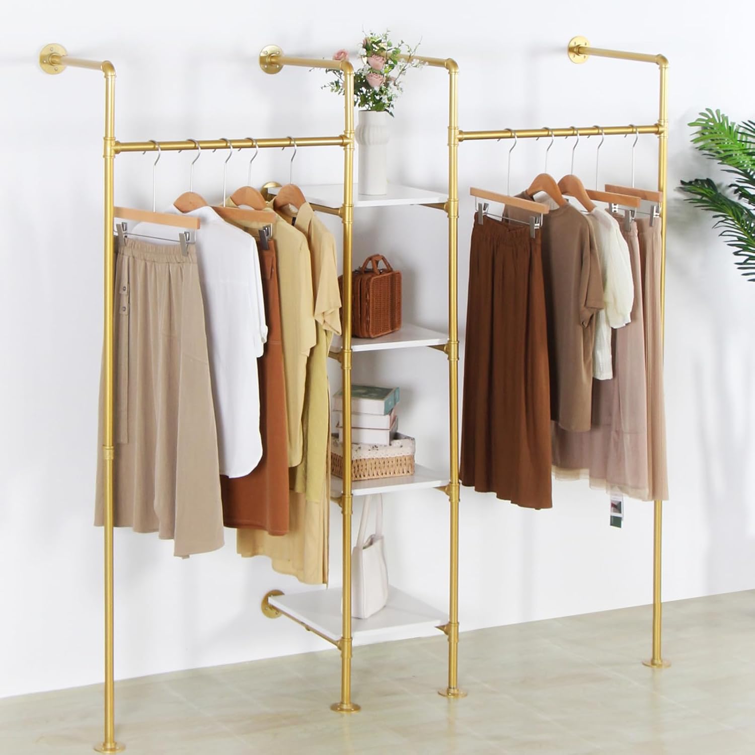 ORSENIGO Industrial Pipe Clothing Rack with Shelves, Gold Wall Mounted Clothes Rack for Home Retail