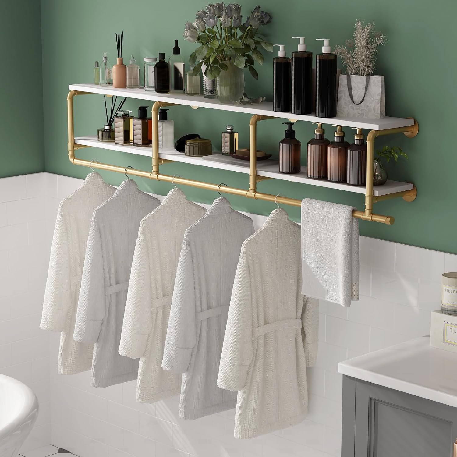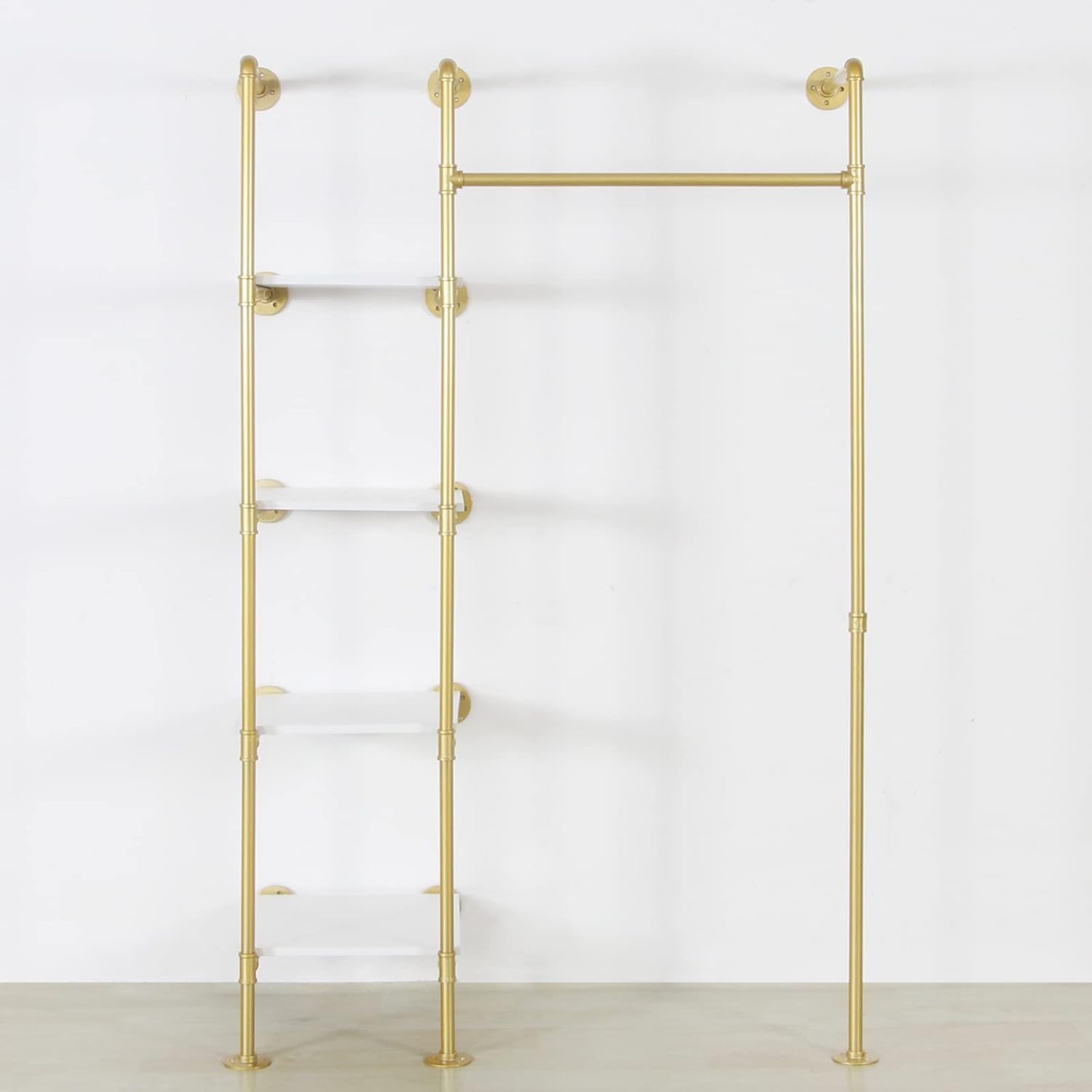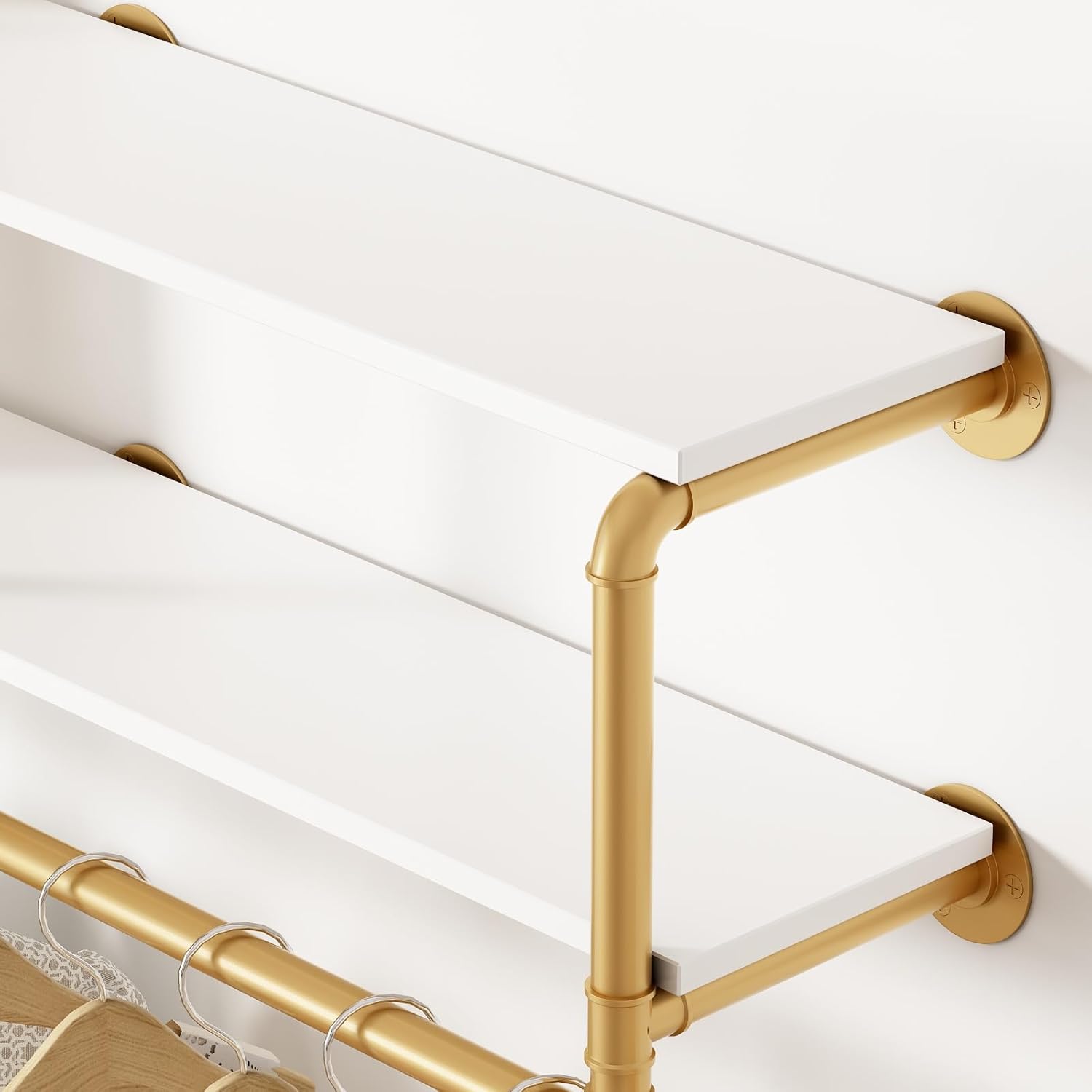 ORSENIGO Industrial Pipe Clothing Rack with Shelves, Gold Wall Mounted Clothes Rack for Home Retail
