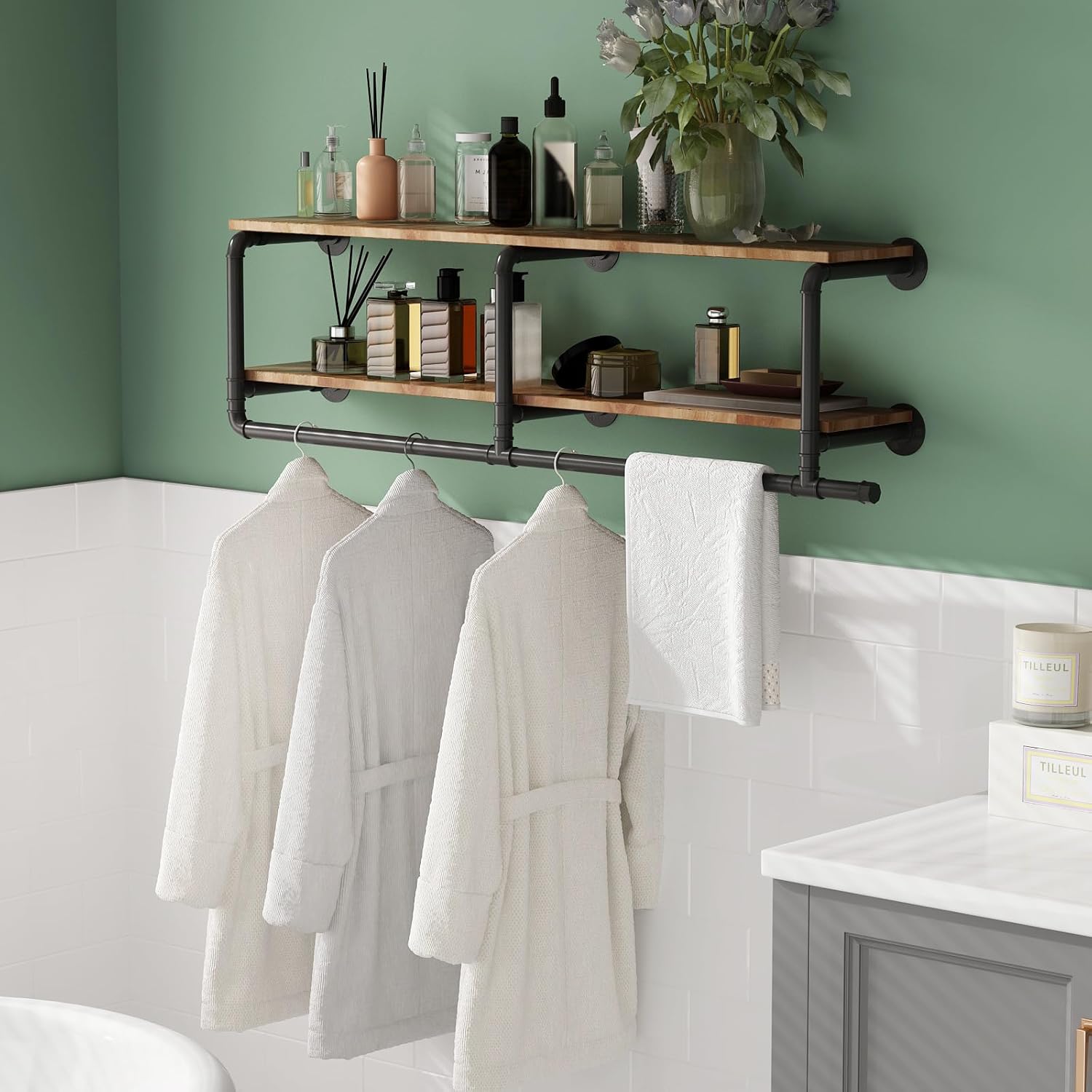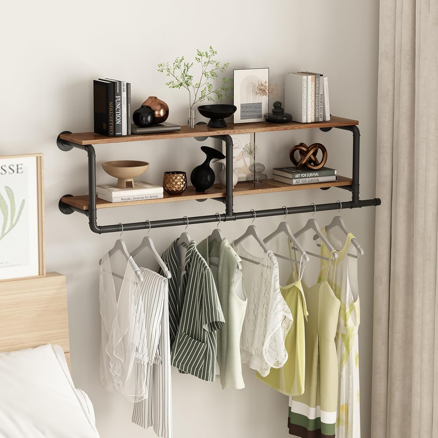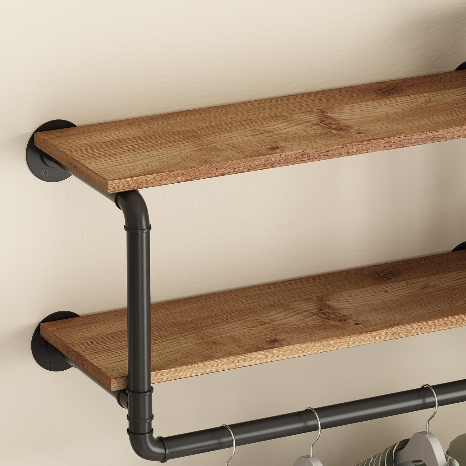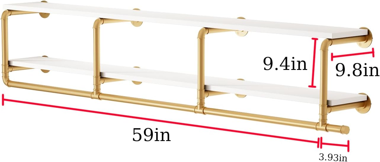ORSENIGO Industrial Pipe Clothing Rack with Shelves, Gold Wall Mounted Clothes Rack for Home Retail