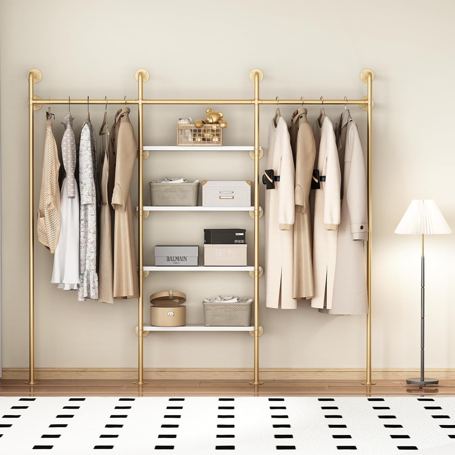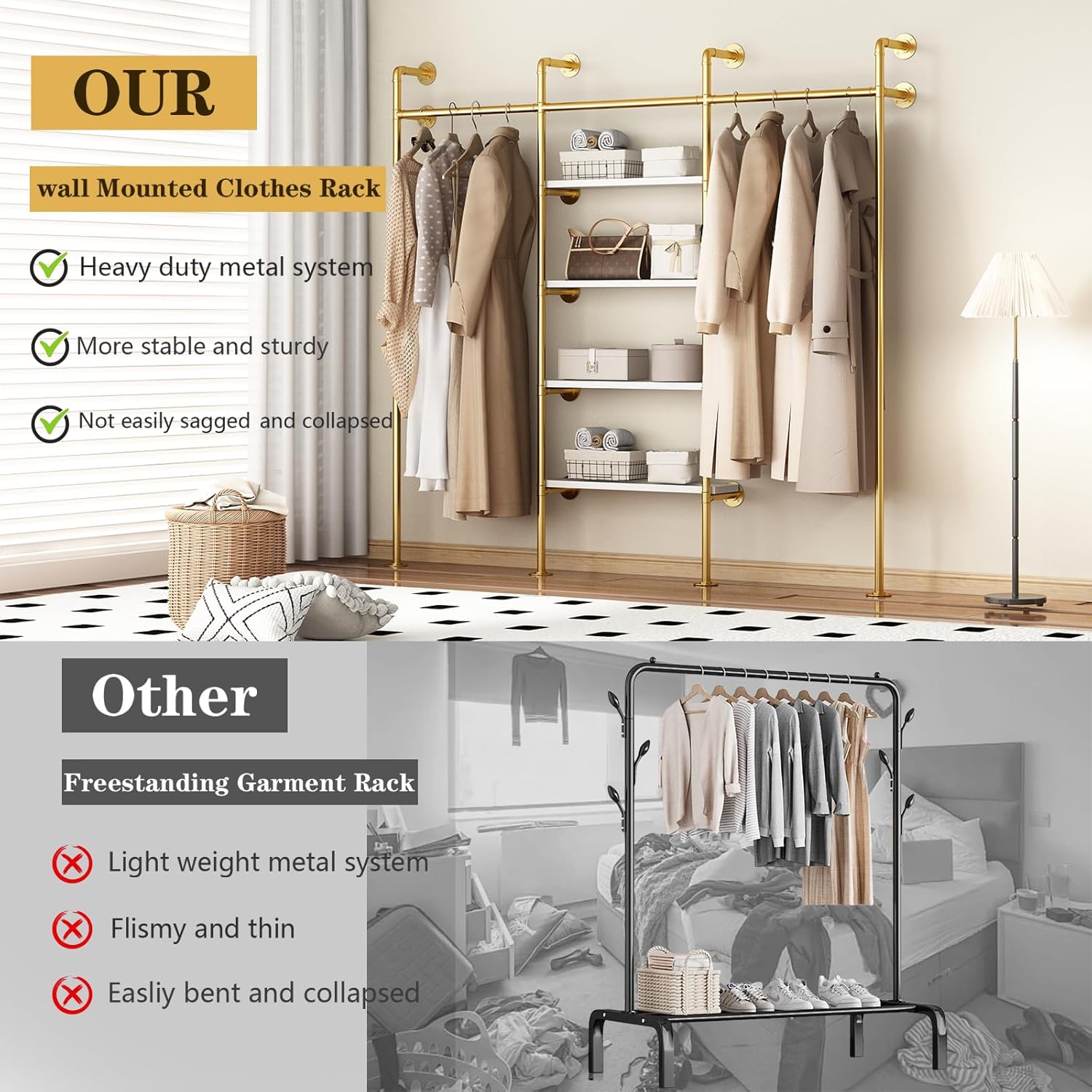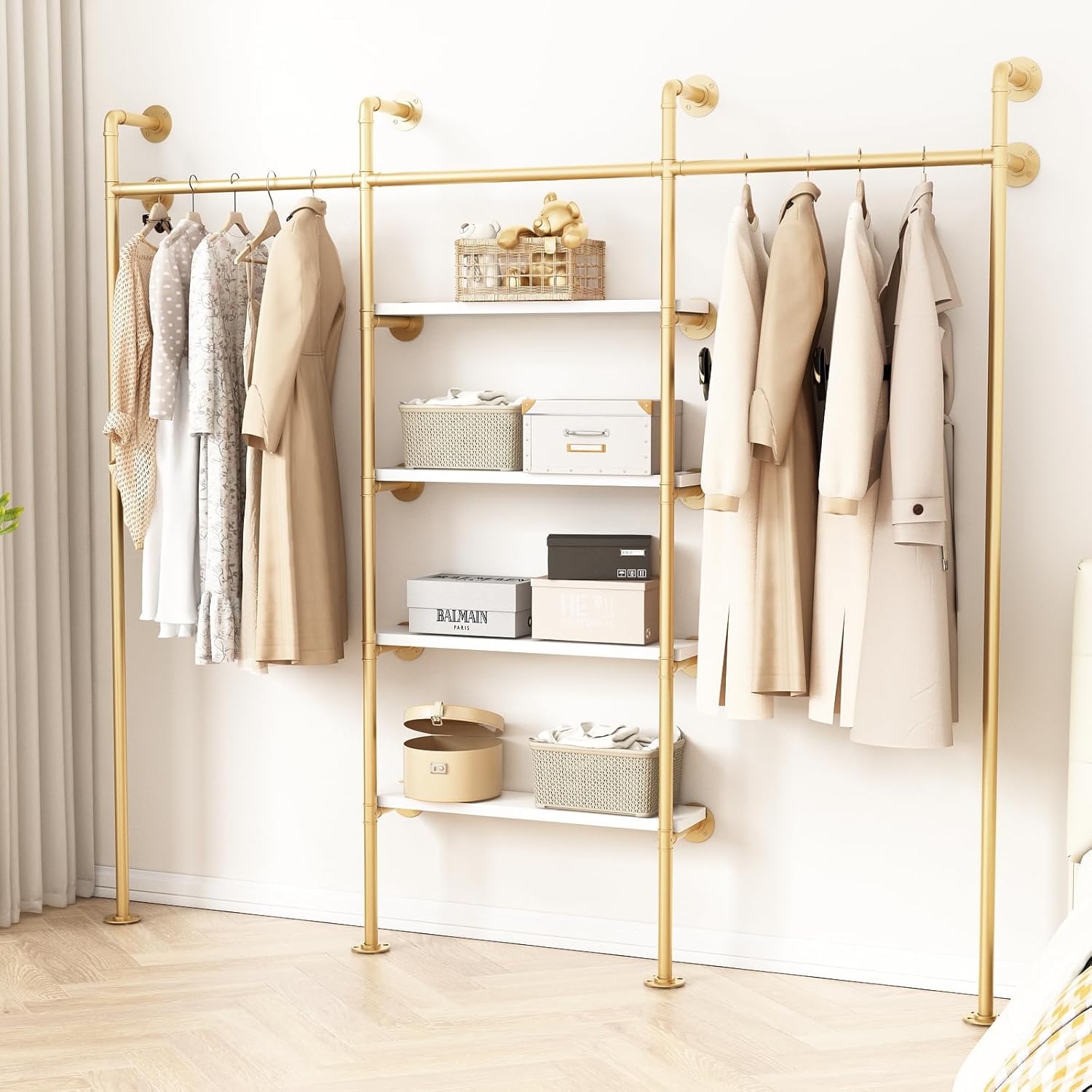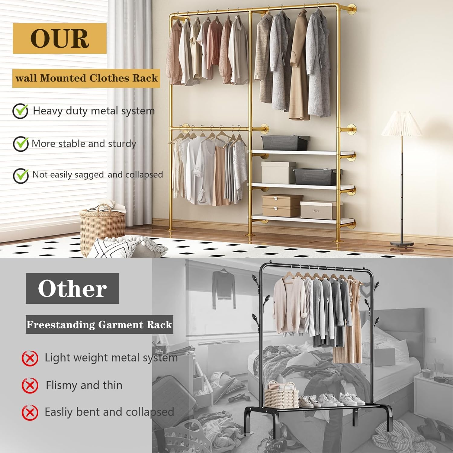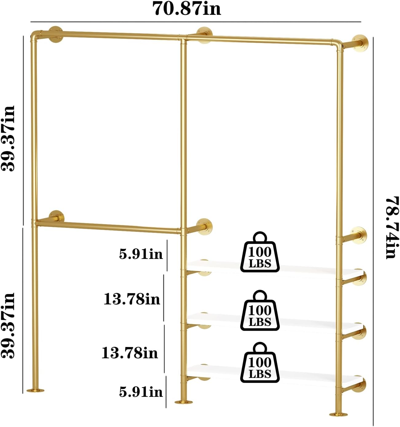 Industrial Pipe Clothing Rack, Gold Clothing Rack with Shelves, Wall Mounted Clothes Rack Heavy Duty Closet Organizers Wardrobe Multi-Purpose Storage Clothes Hanging Shelf - 70.8''L Gold