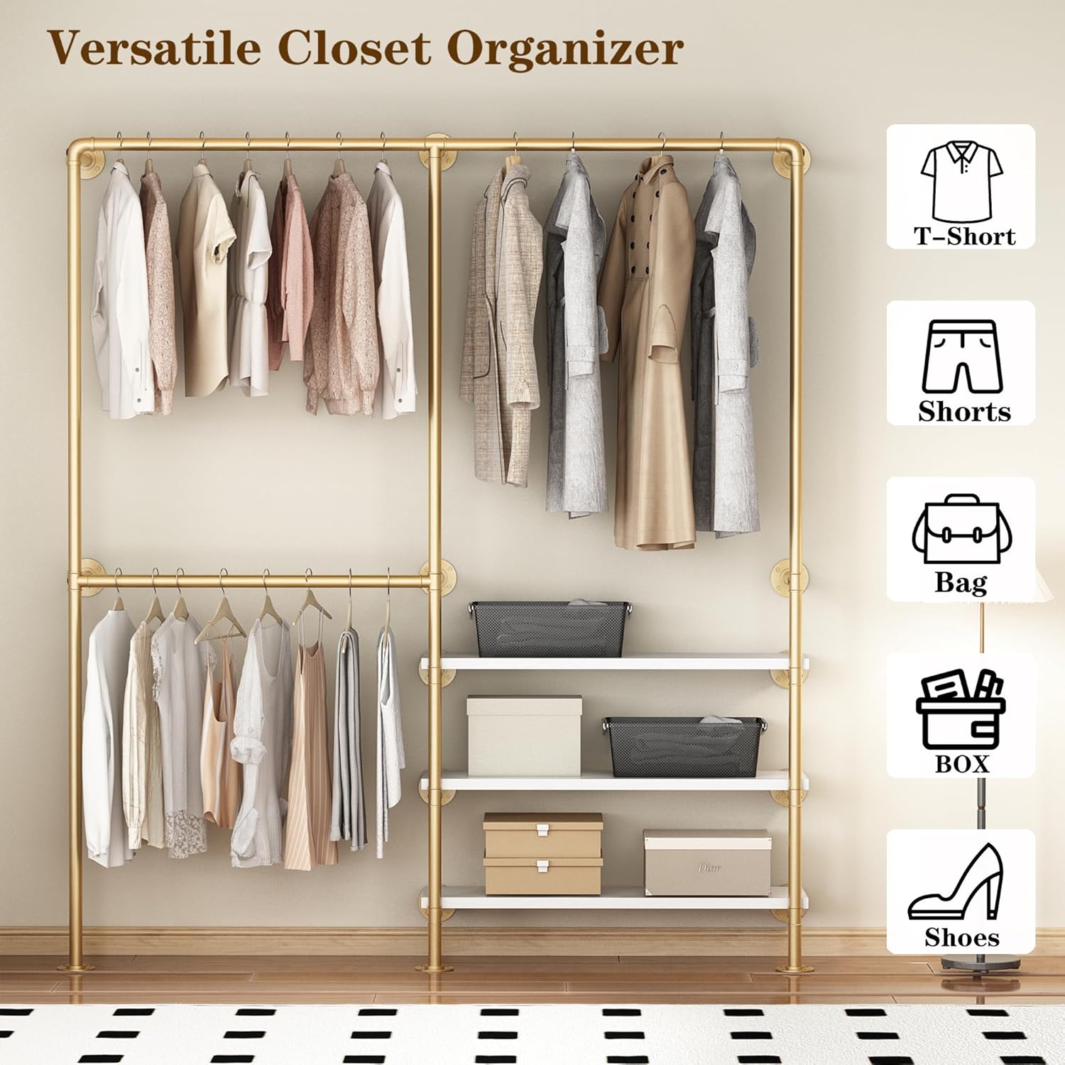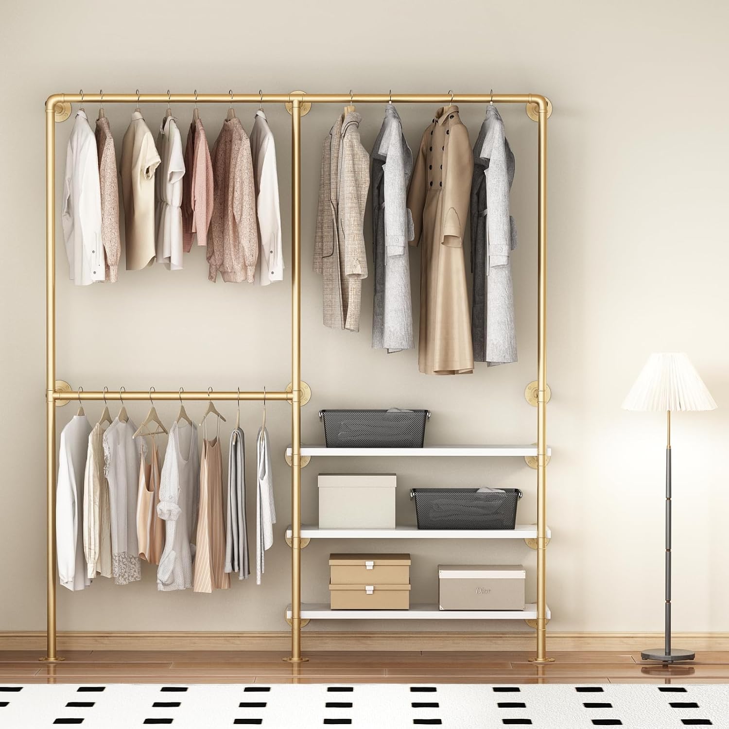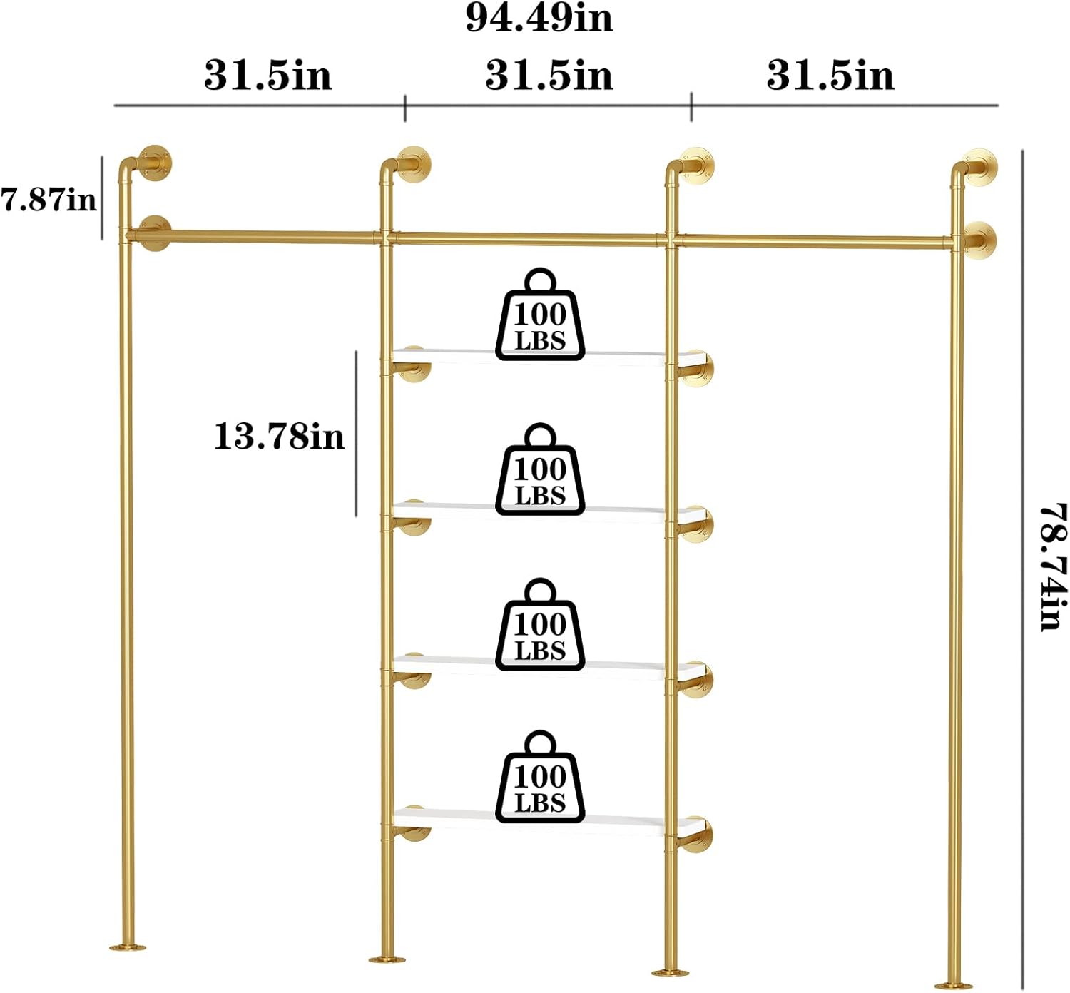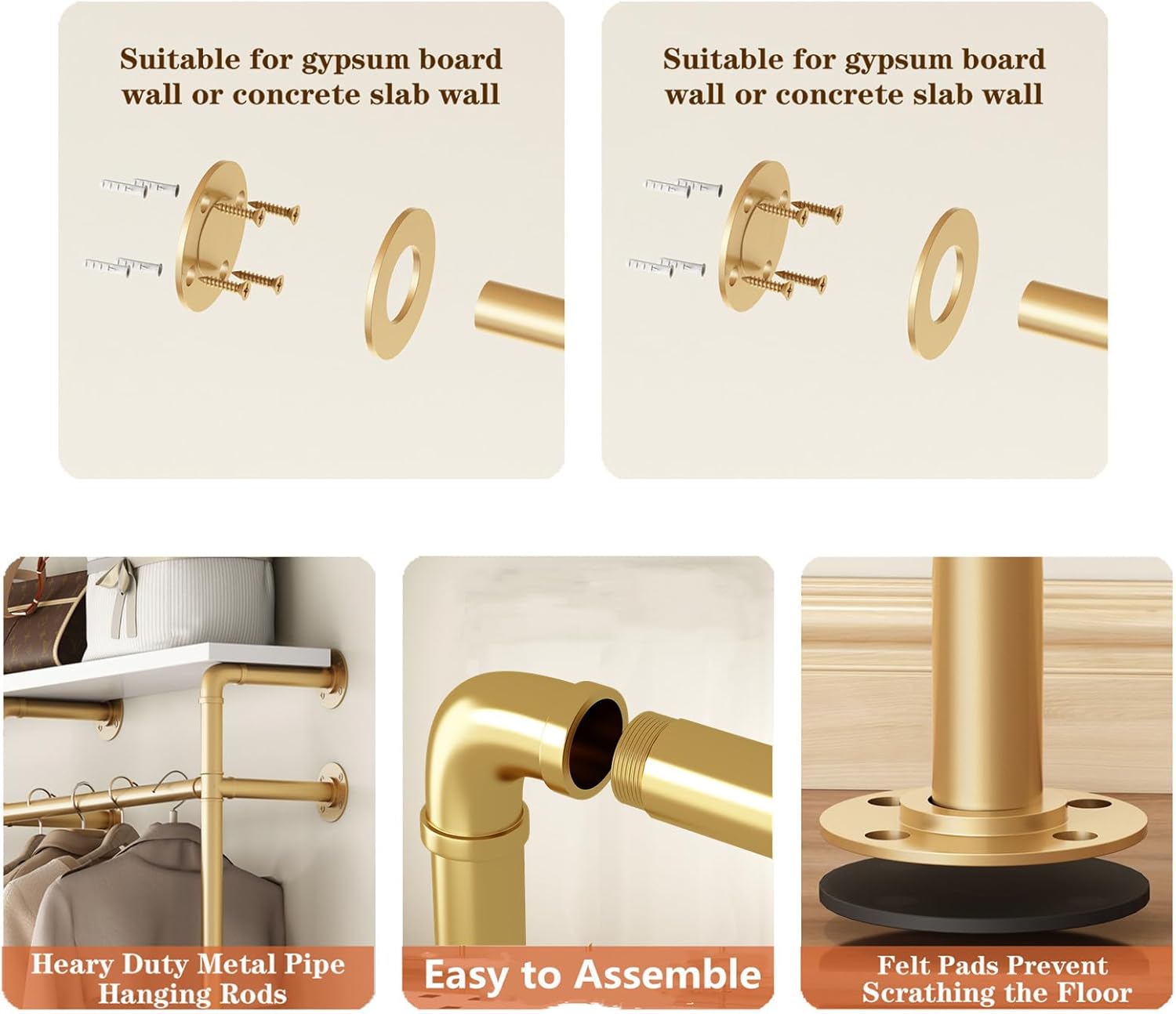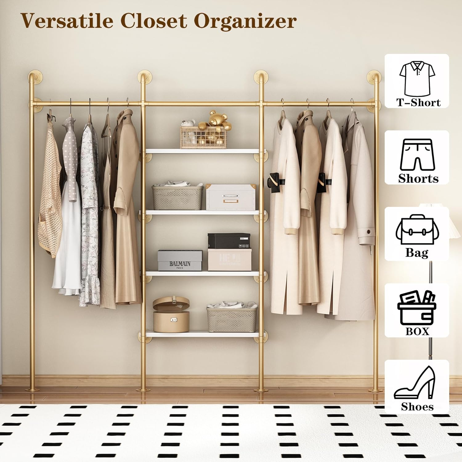 Industrial Pipe Clothing Rack, Gold Clothing Rack with Shelves, Wall Mounted Clothes Rack Heavy Duty Closet Organizers Wardrobe Multi-Purpose Storage Clothes Hanging Shelf - 70.8''L Gold