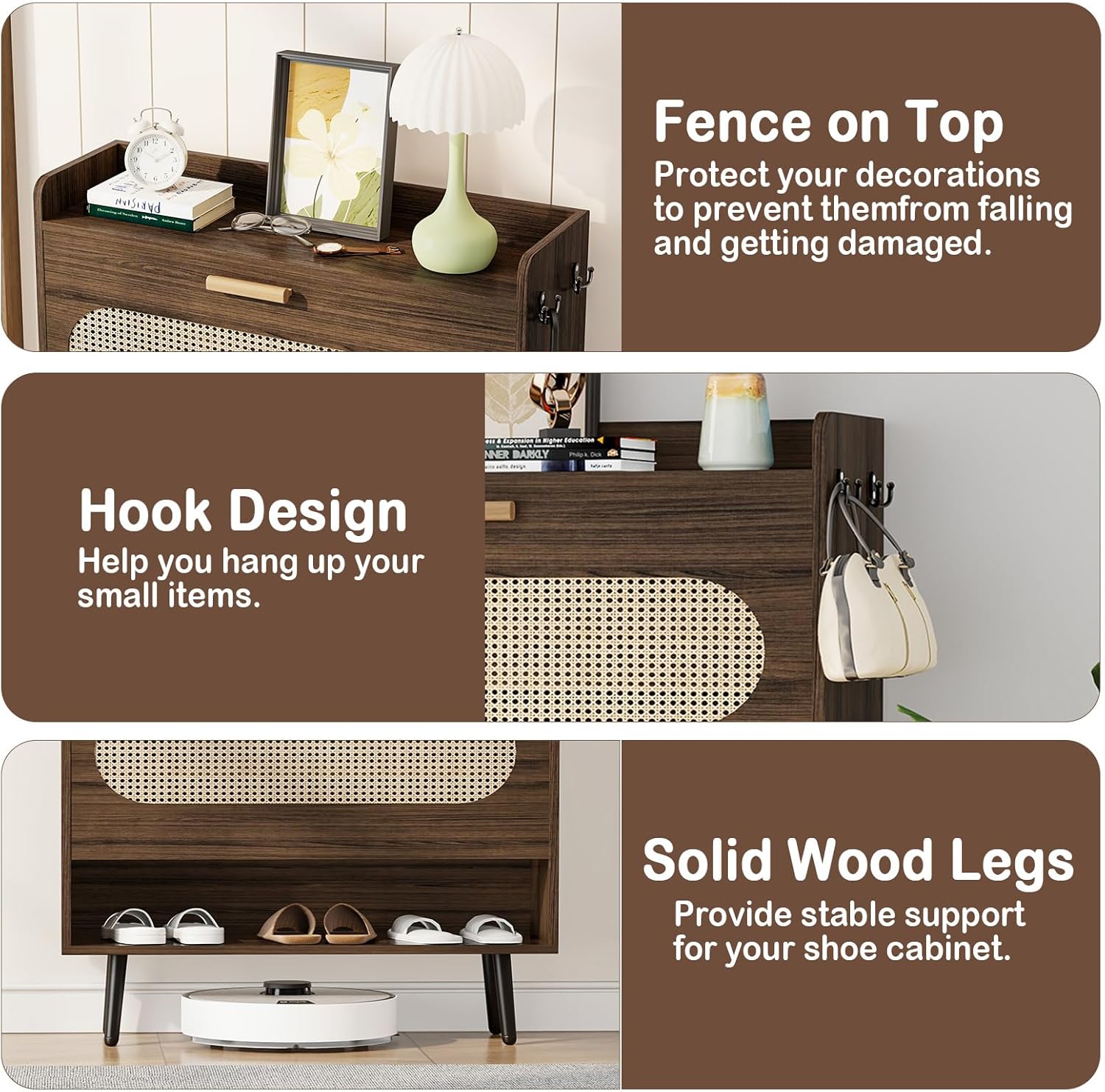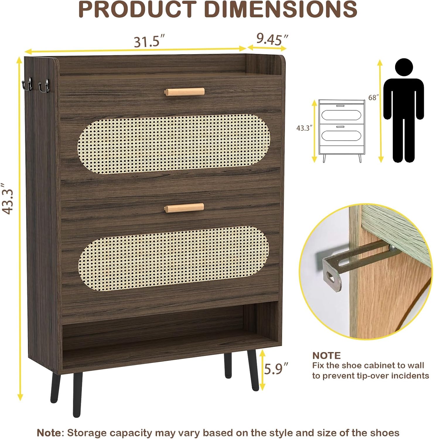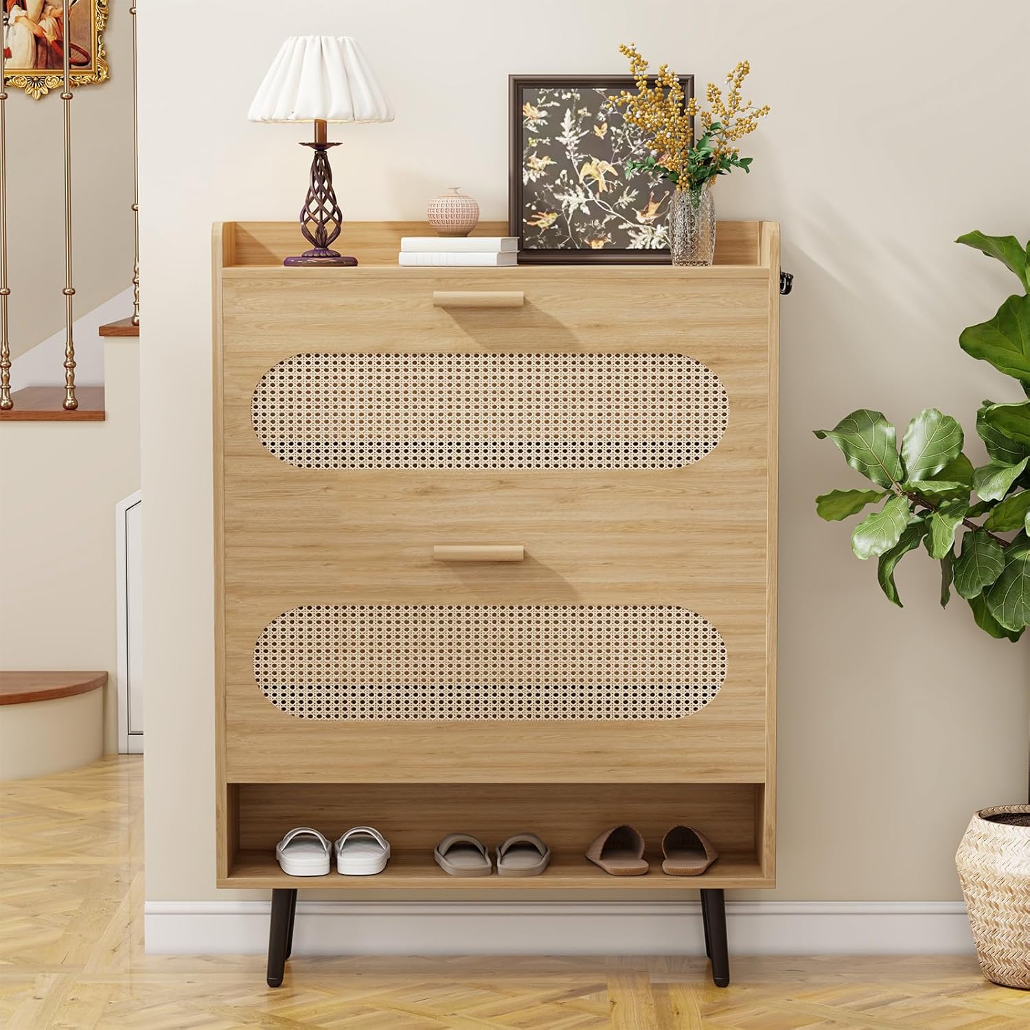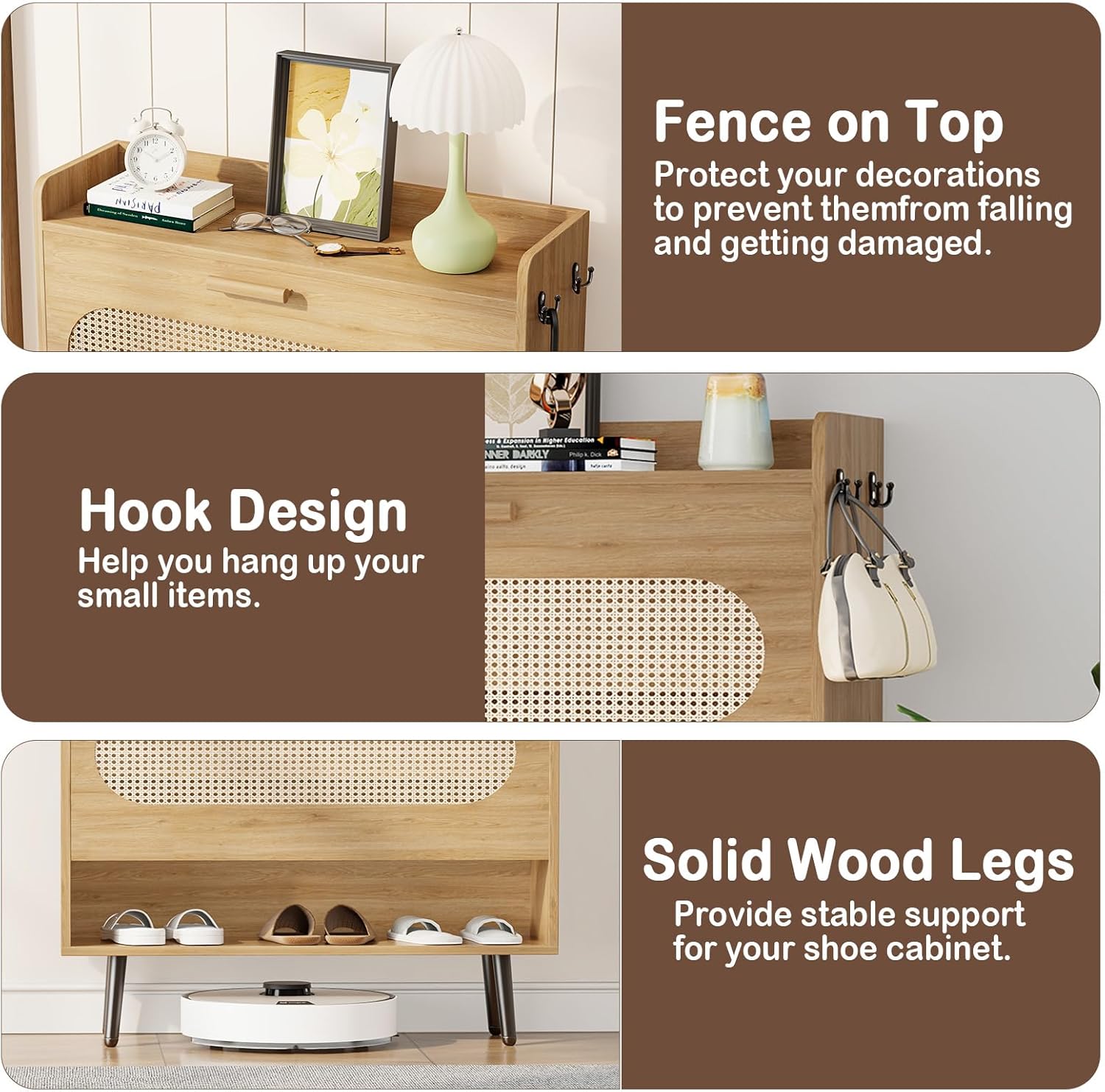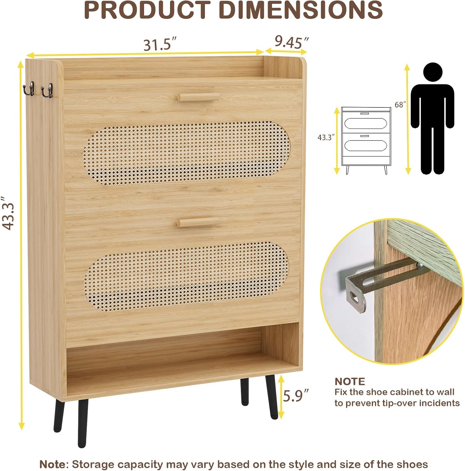 Rattan Shoe Cabinet with 2 Flip Drawers, Shoe Storage Cabinet for Entryway, Narrow Shoe Rack Cabinet, Freestanding Hidden Shoe Organizer for Hallway, Living Room (Oak)